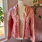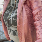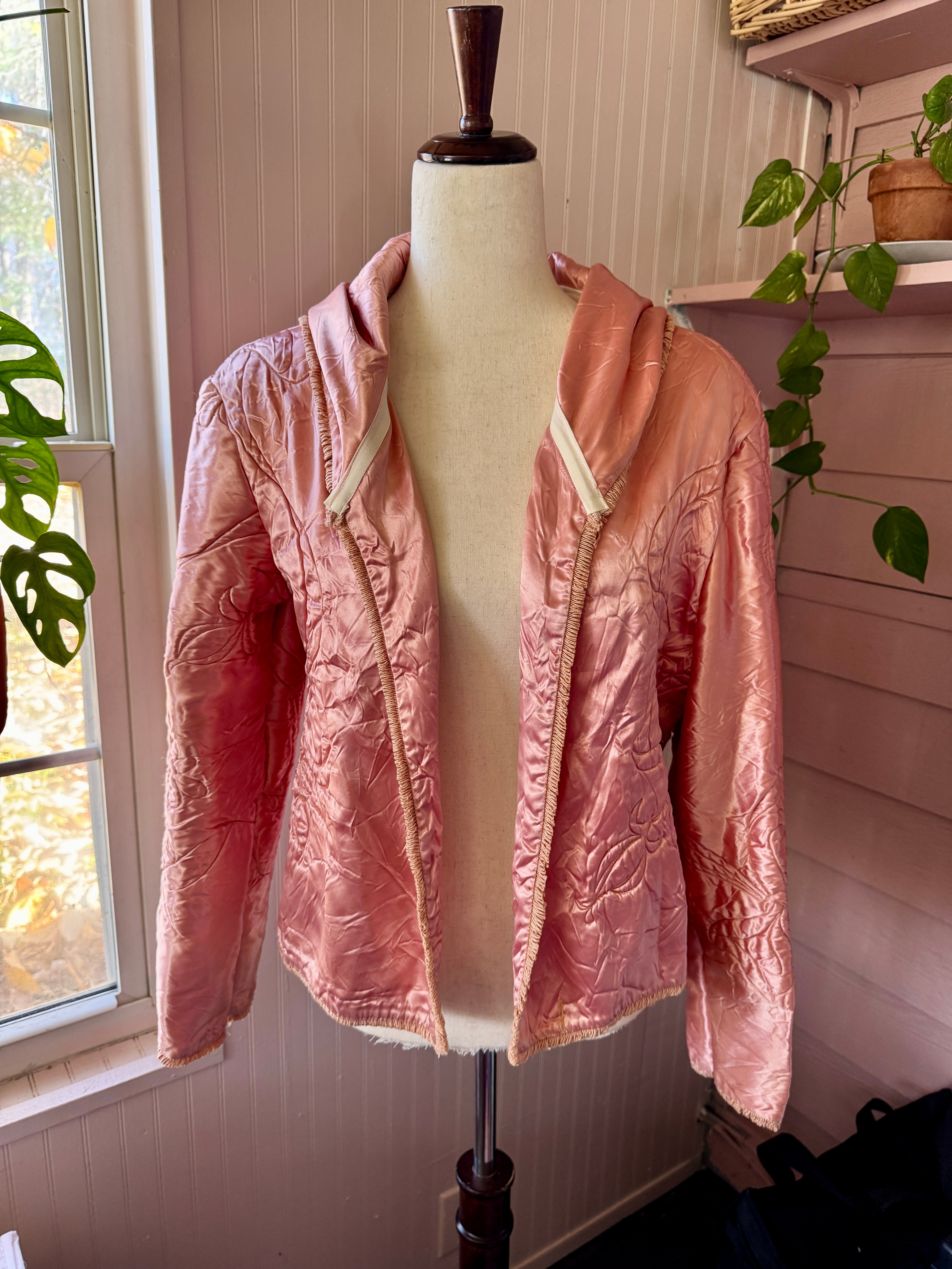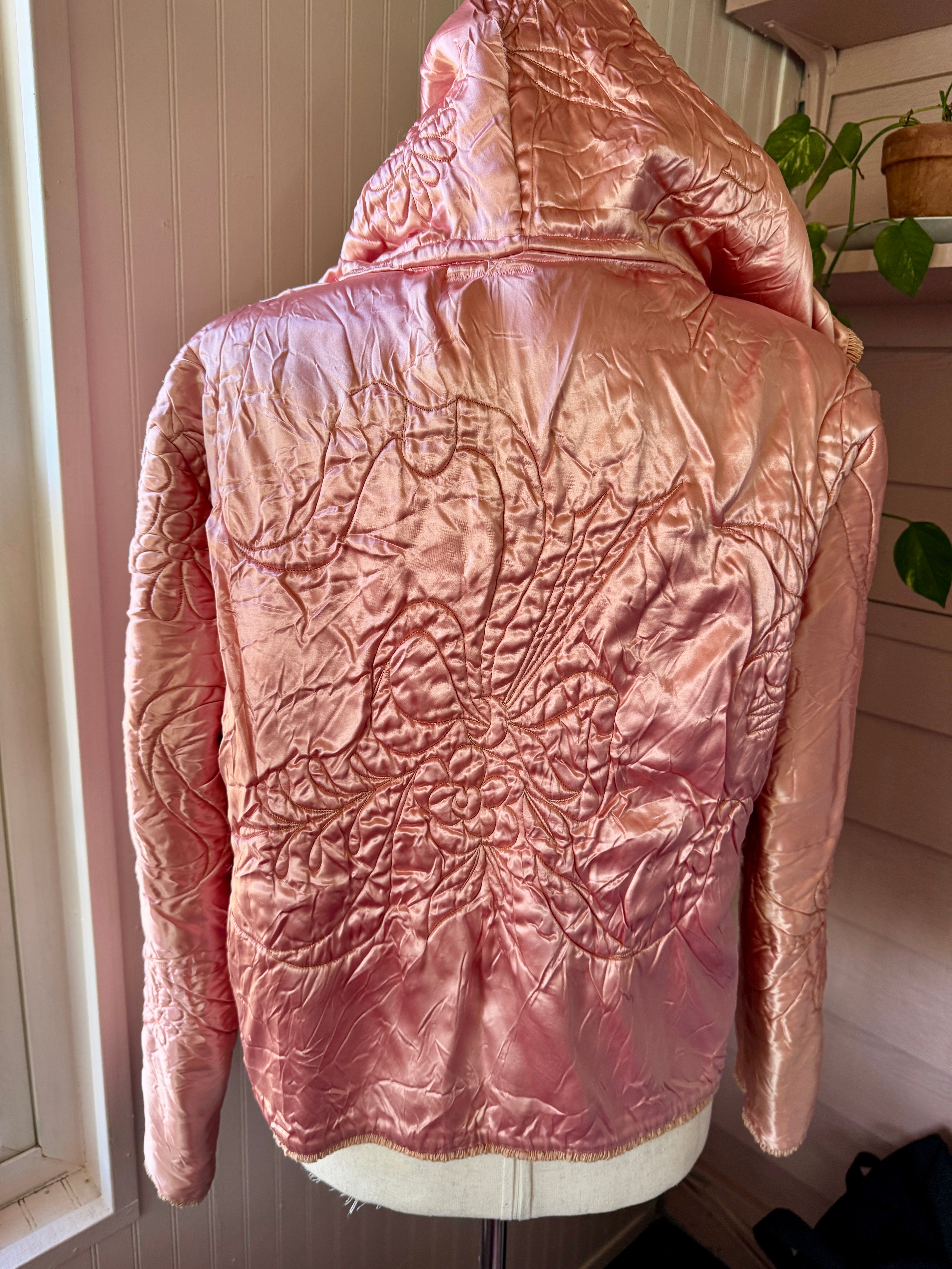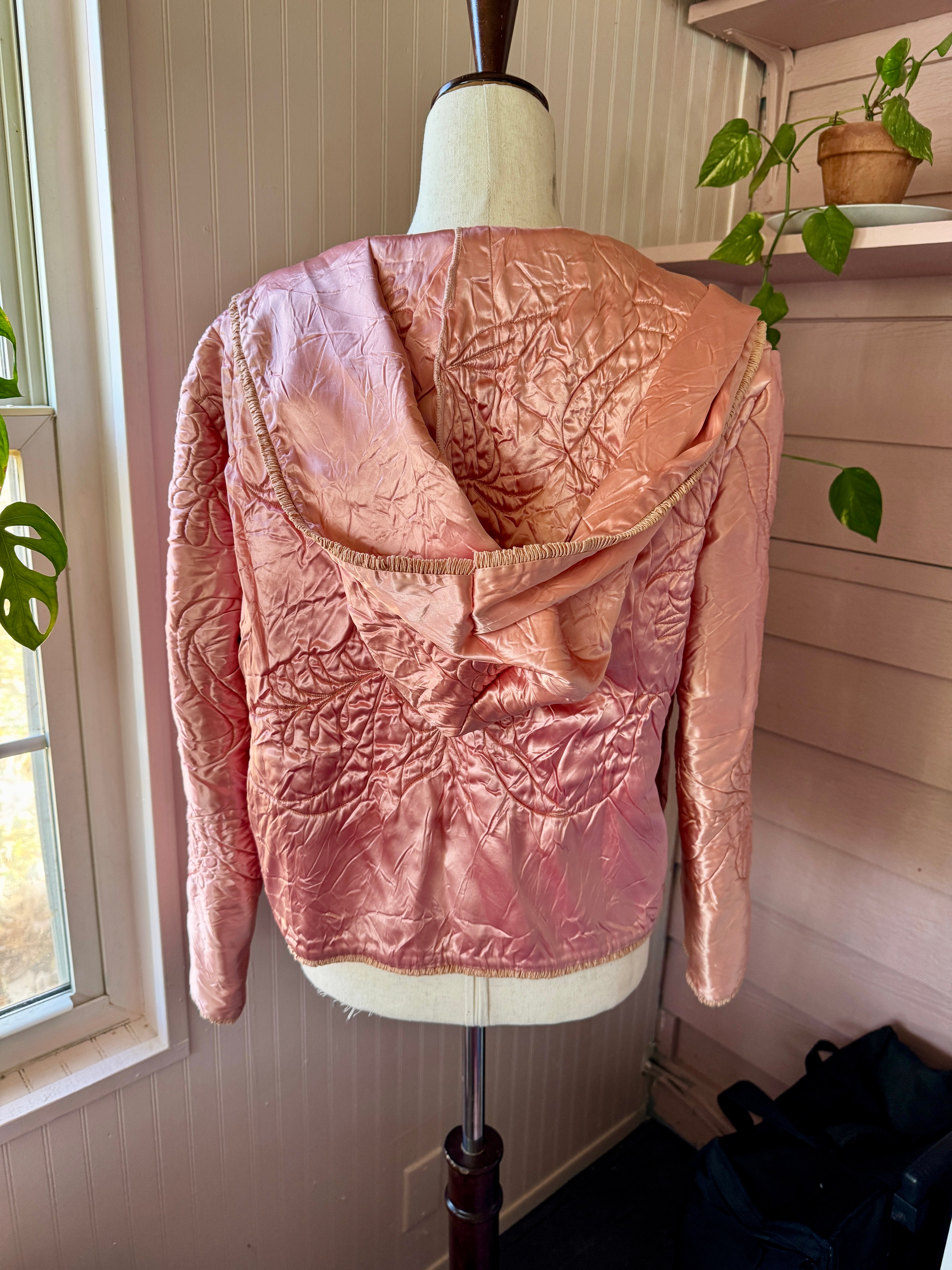 Vintage satin quilted baby blanket is given a new life as a hooded jacket💞 She’s giving Little Red Riding Hood alL grown up! A open front, oversized hood,  all the original French and the sweetest bow floral quilting. One size fits most. Model is size L/XL*. Mannequin is sz 4/6. One size fits most.