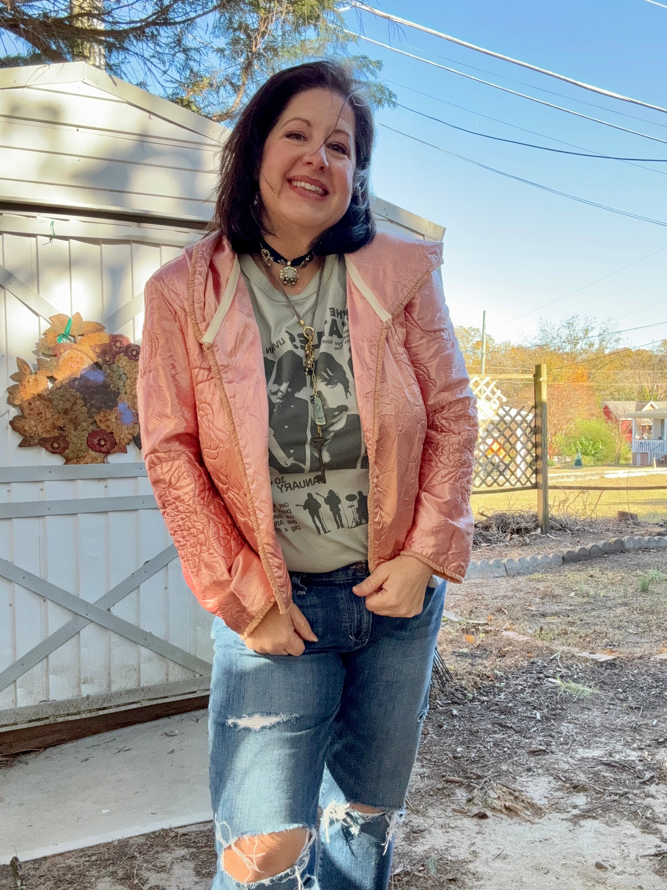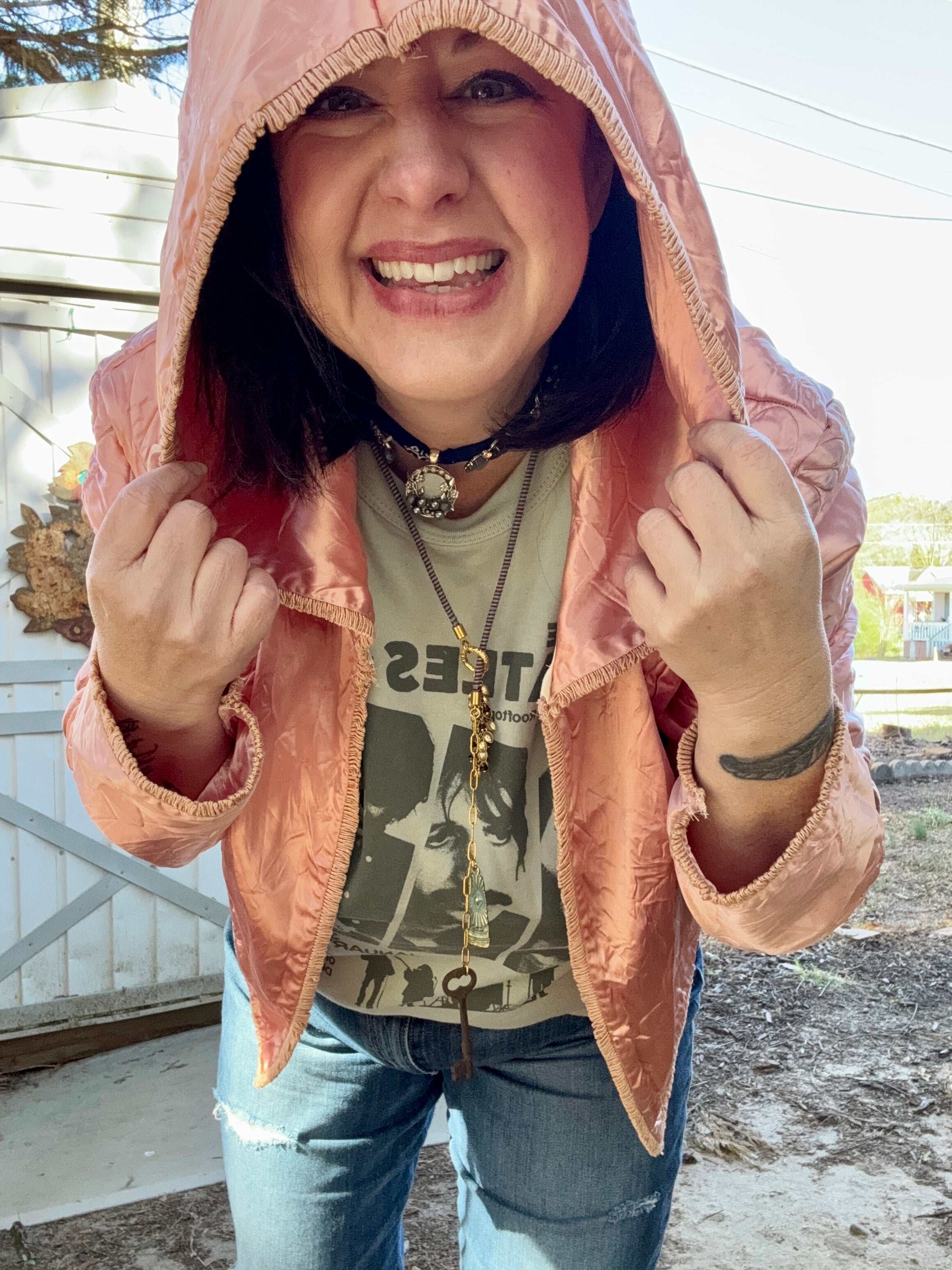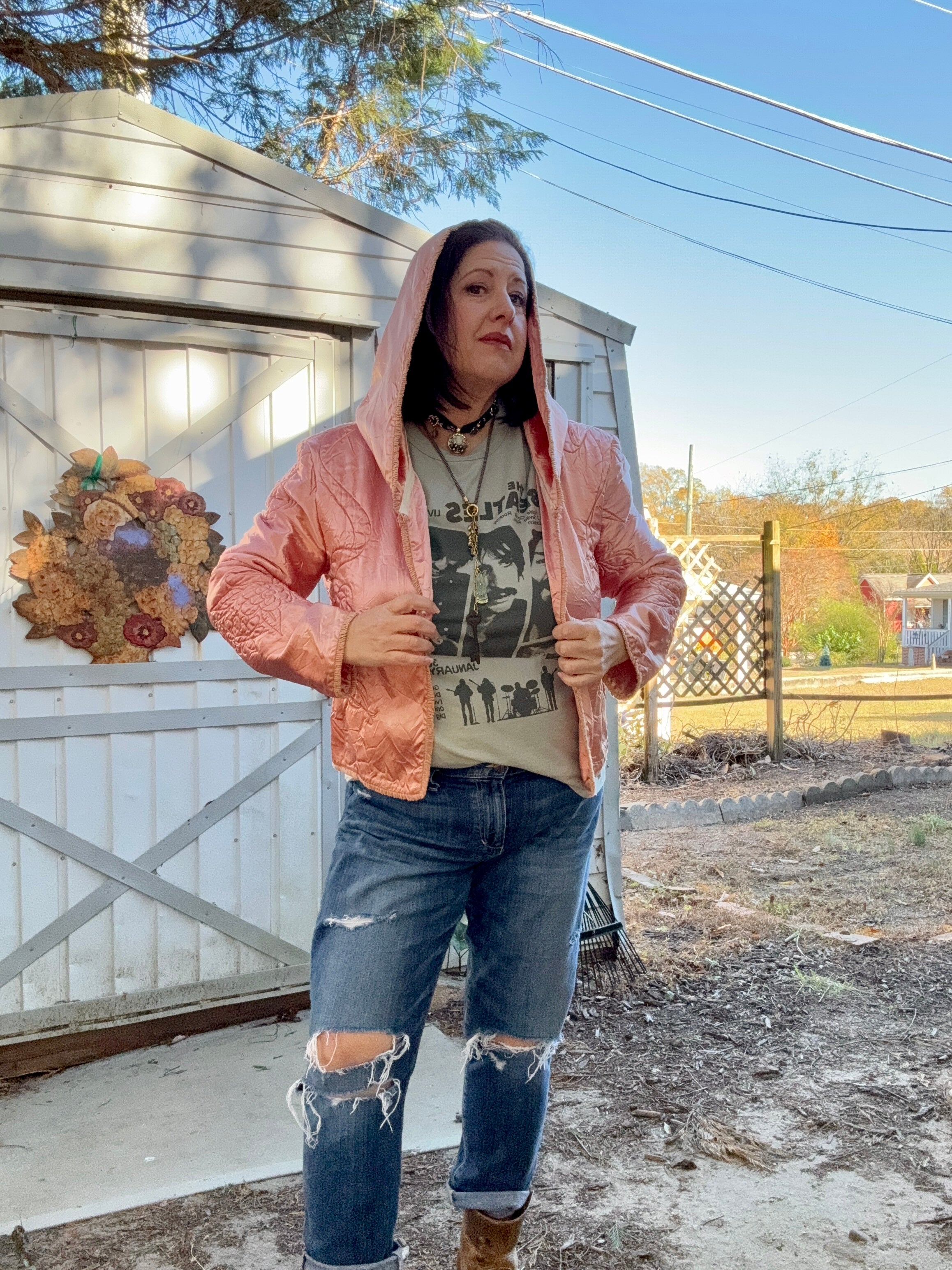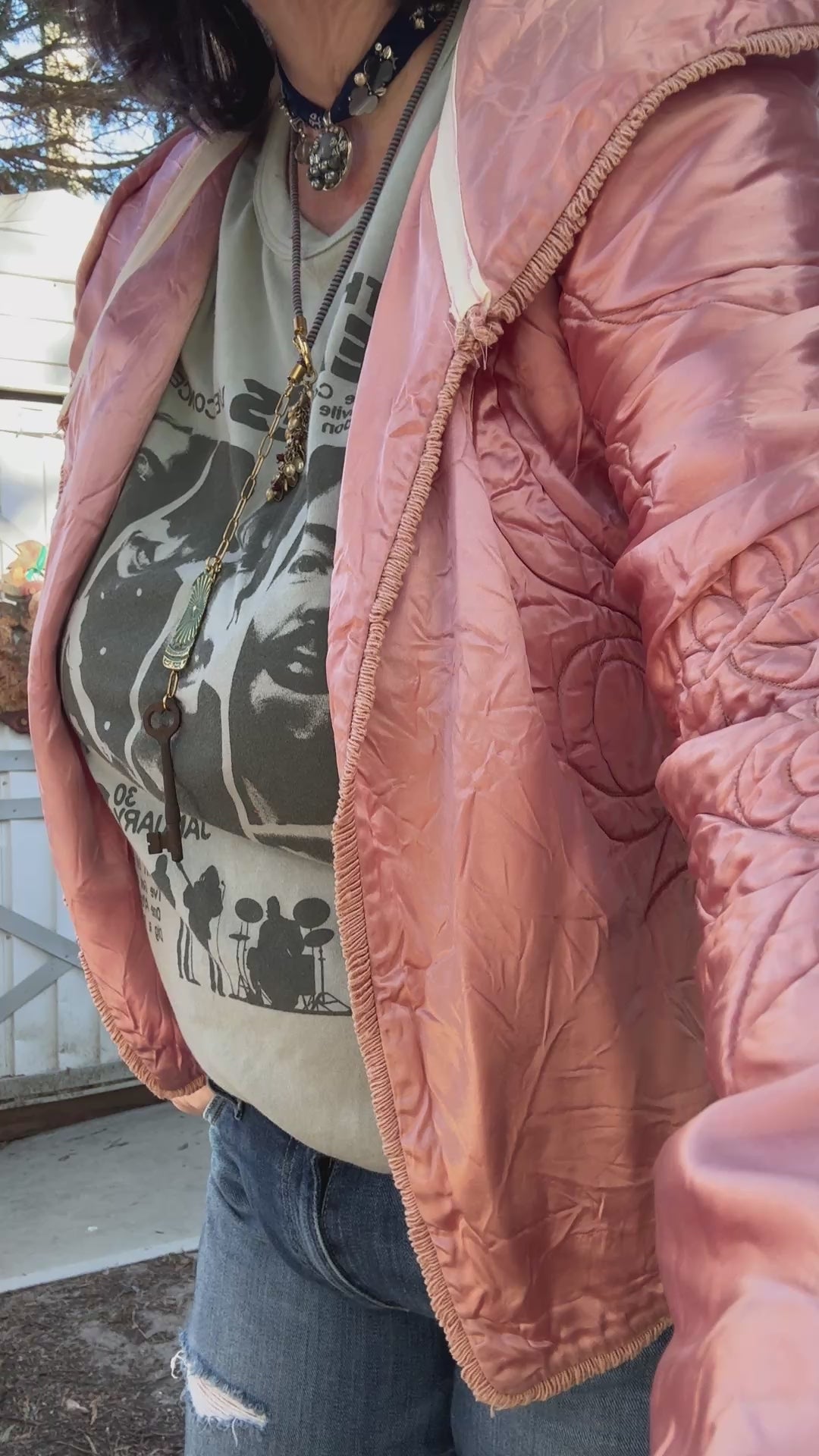 Vintage satin quilted baby blanket is given a new life as a hooded jacket💞 She’s giving Little Red Riding Hood alL grown up! A open front, oversized hood,  all the original French and the sweetest bow floral quilting. One size fits most. Model is size L/XL*. Mannequin is sz 4/6. One size fits most.