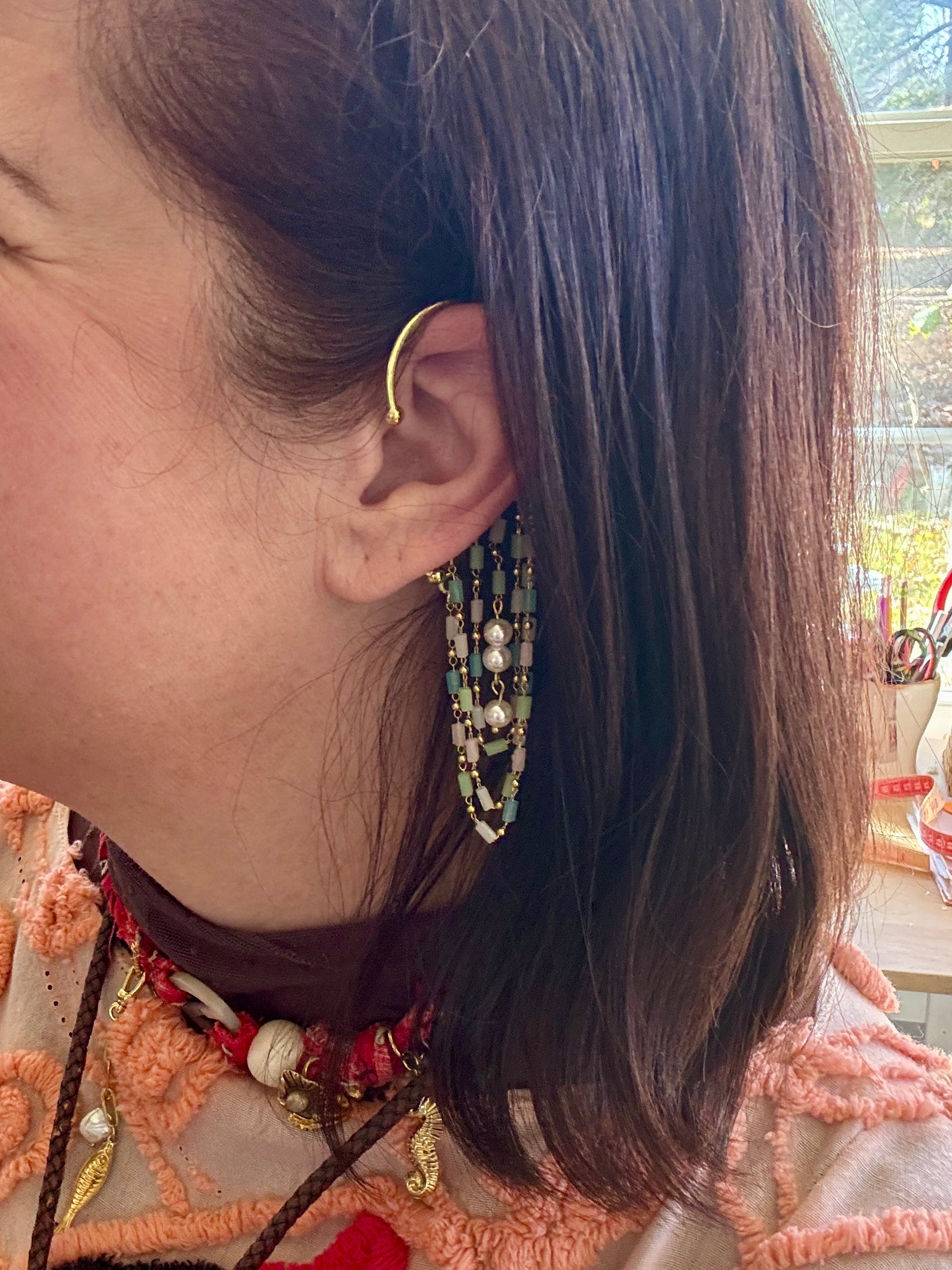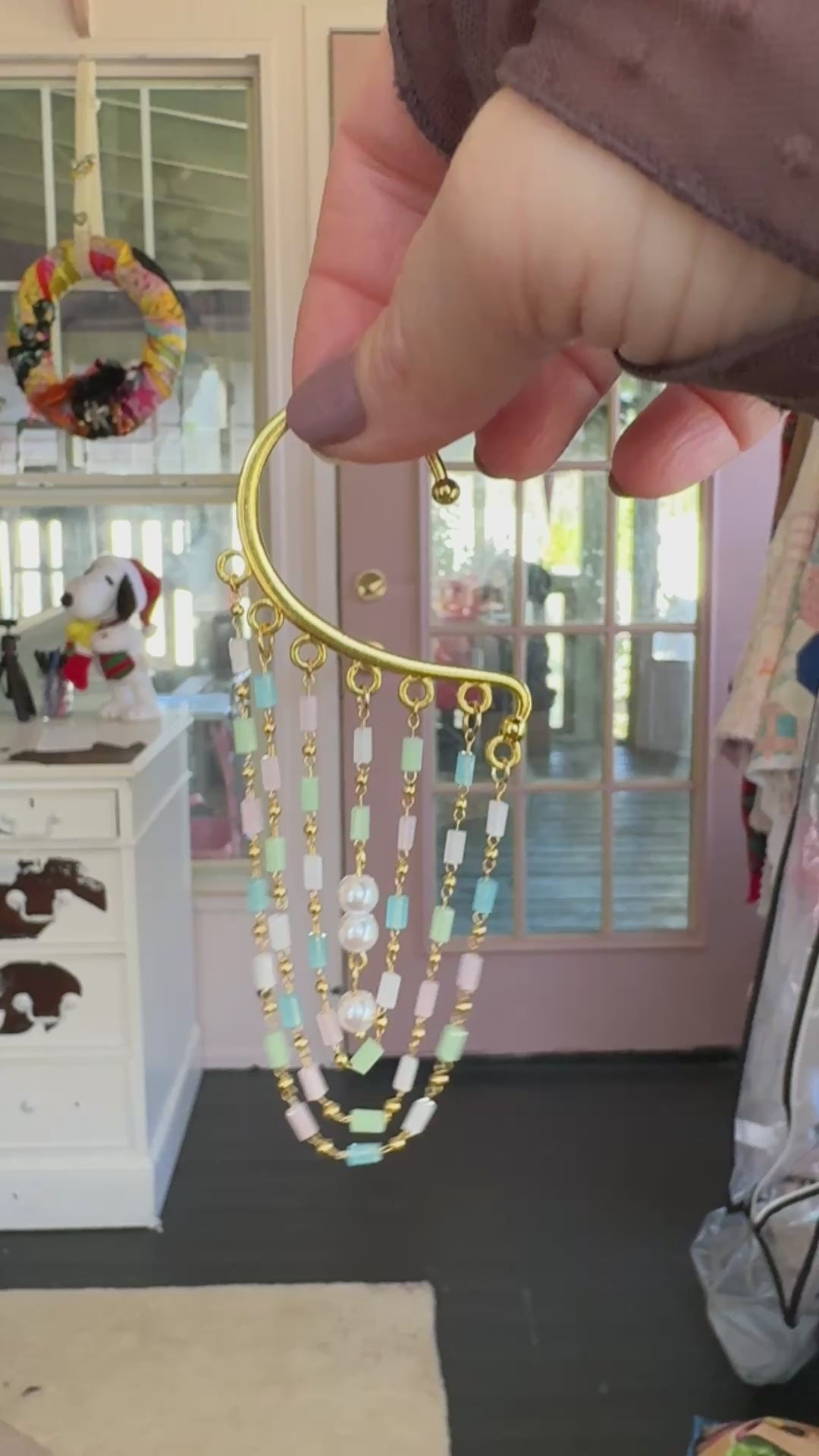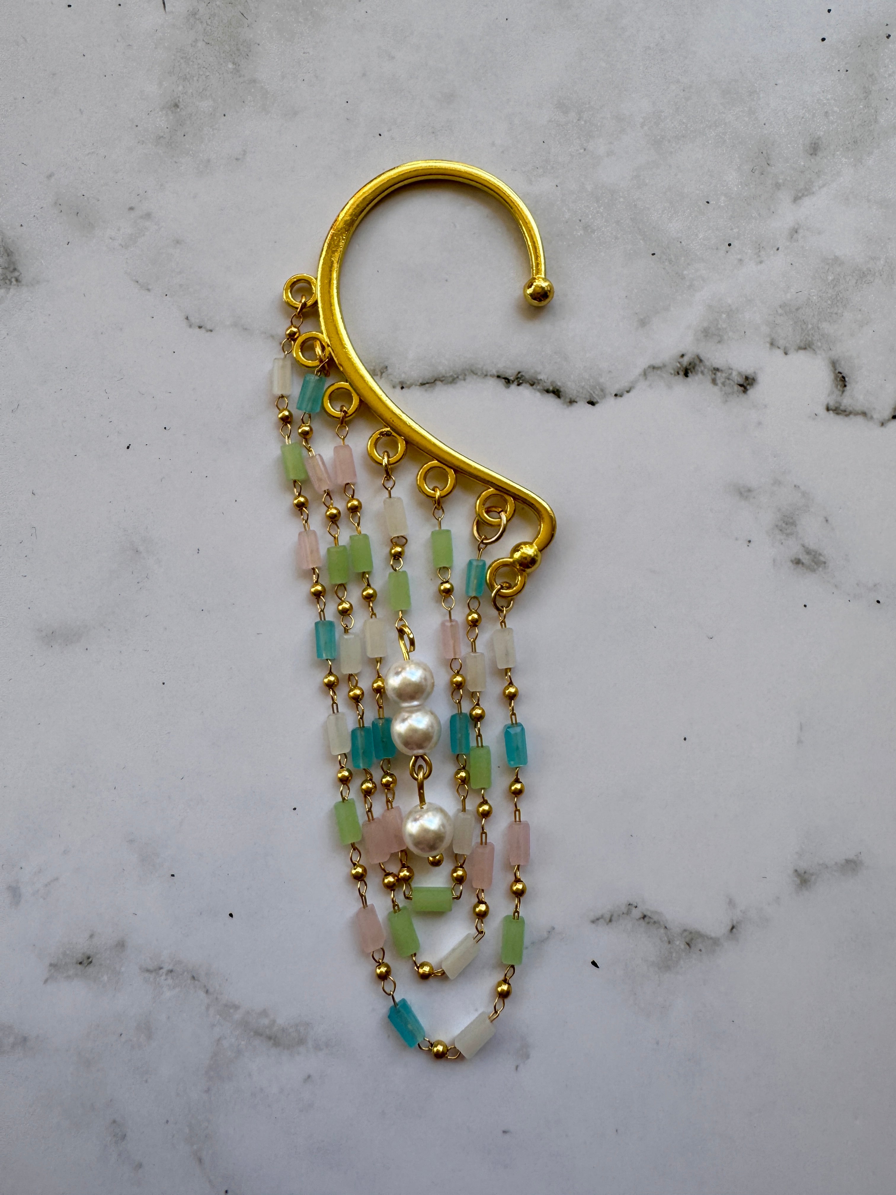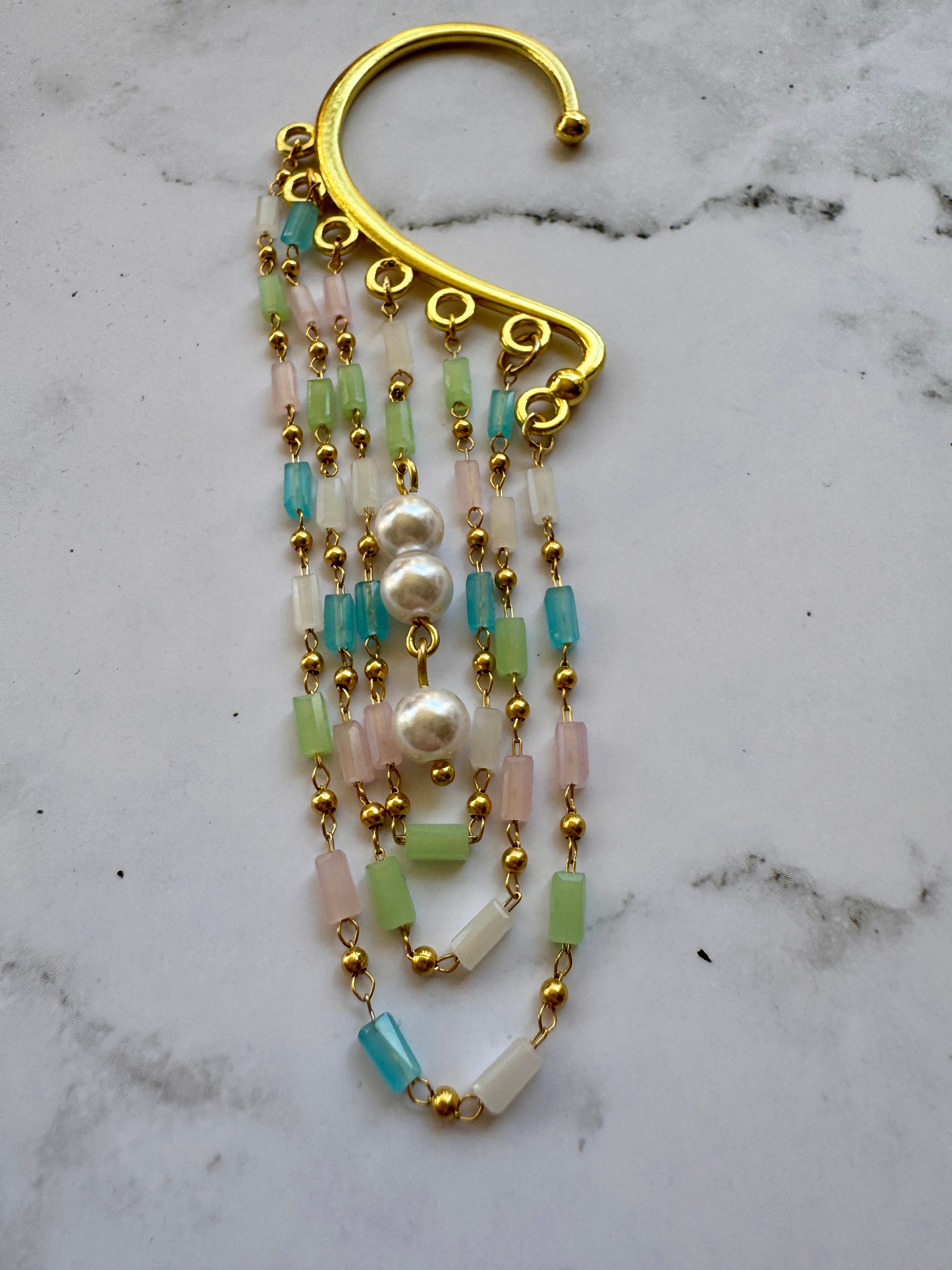 Ingredients: glass pastel beaded chains and costume pearls. Gold plated ear cuff is one size fits all. One of a kind!
