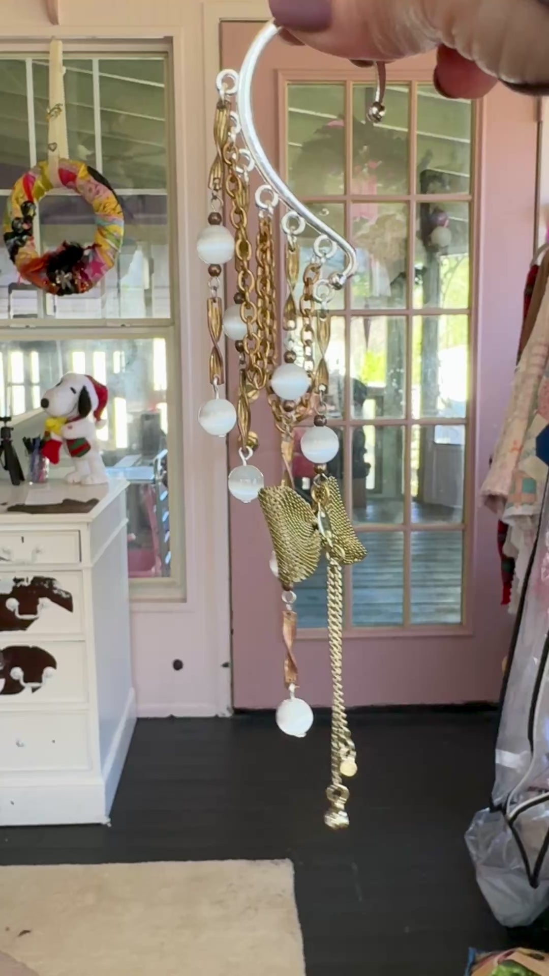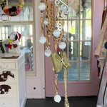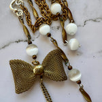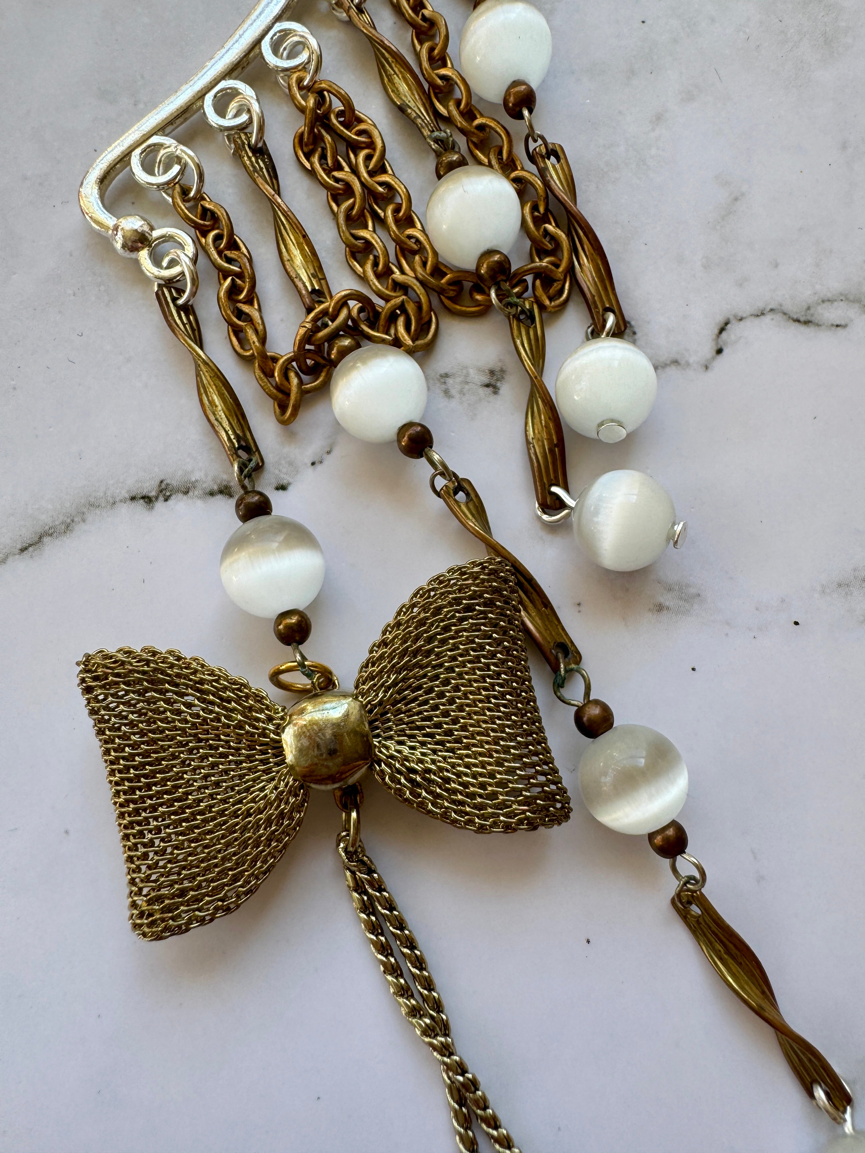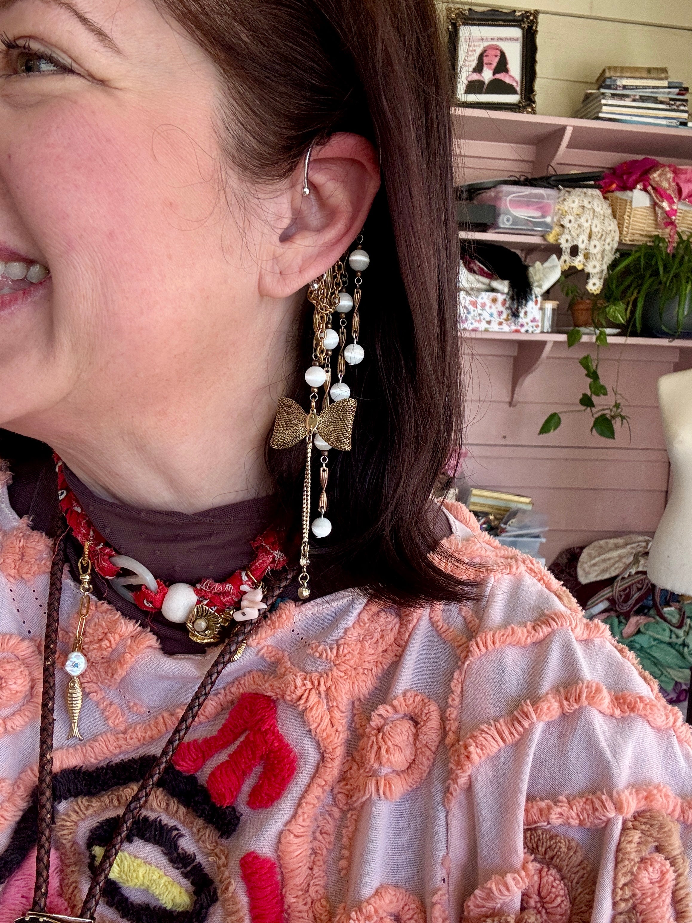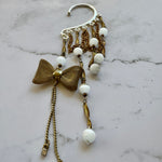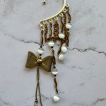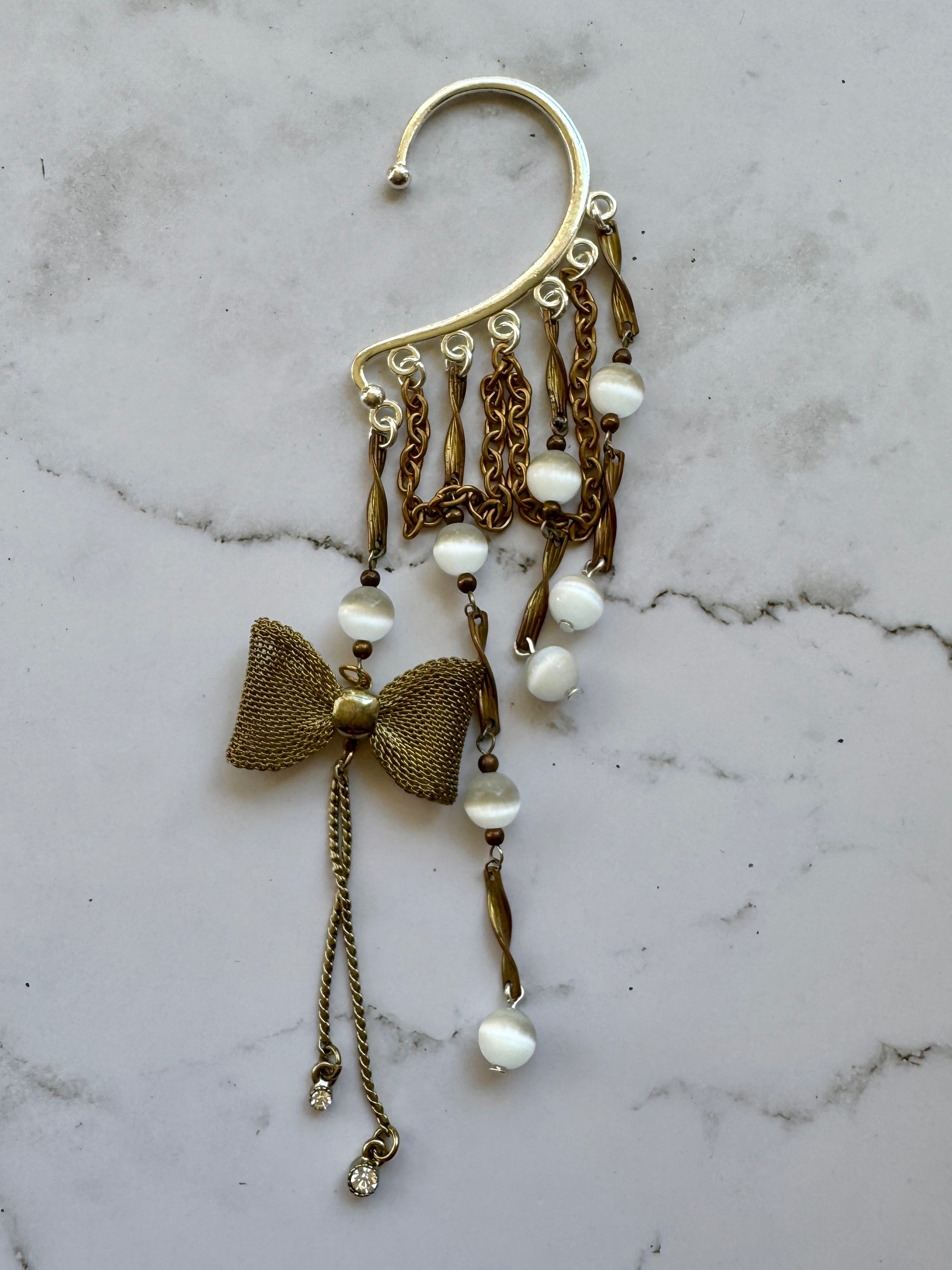 Repurposed vintage Ingredients: vintage brass chain, brass bow, vintage glowing cats eye beads. Silver plated ear cuff is one size fits all. One of a kind!