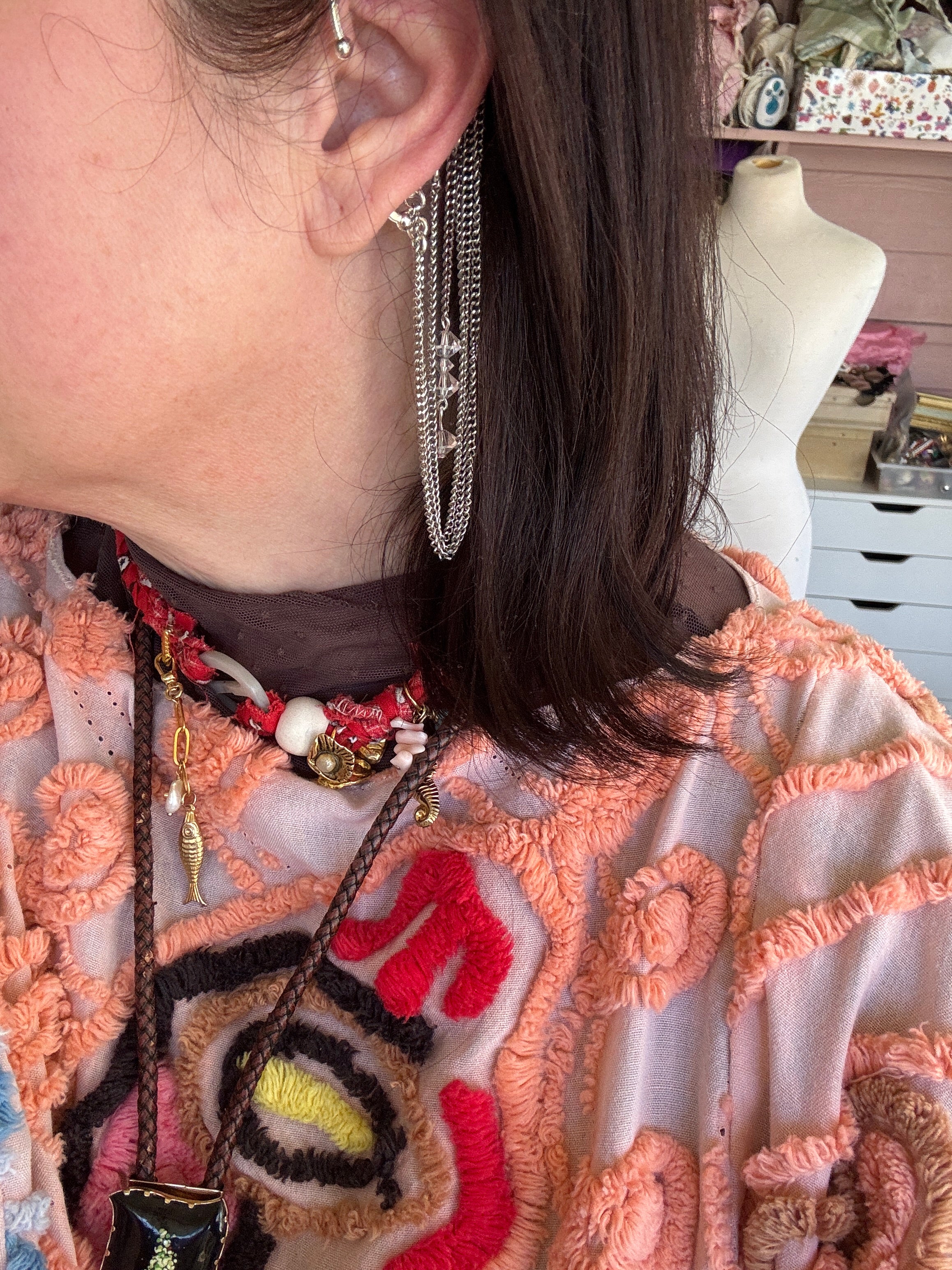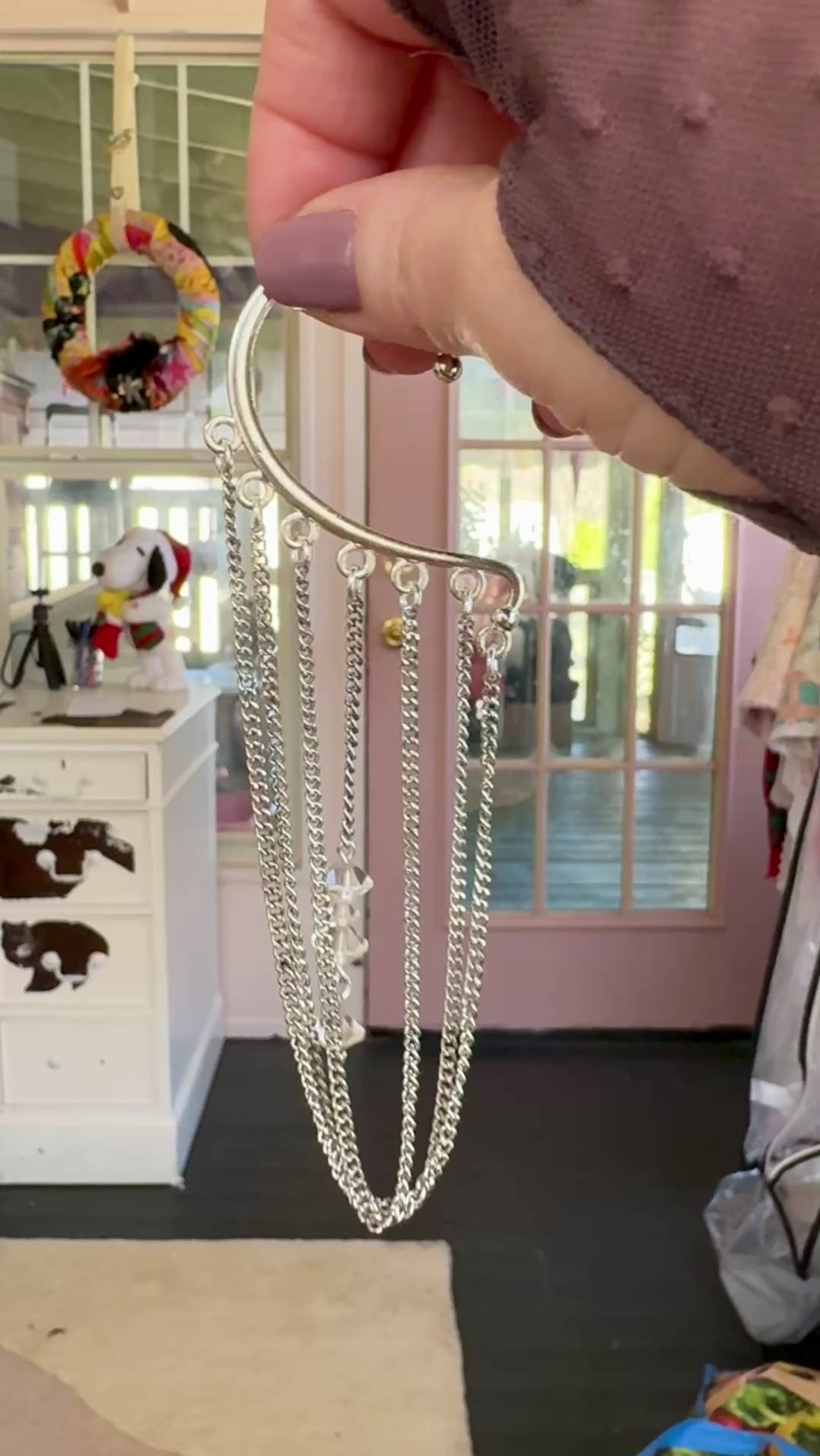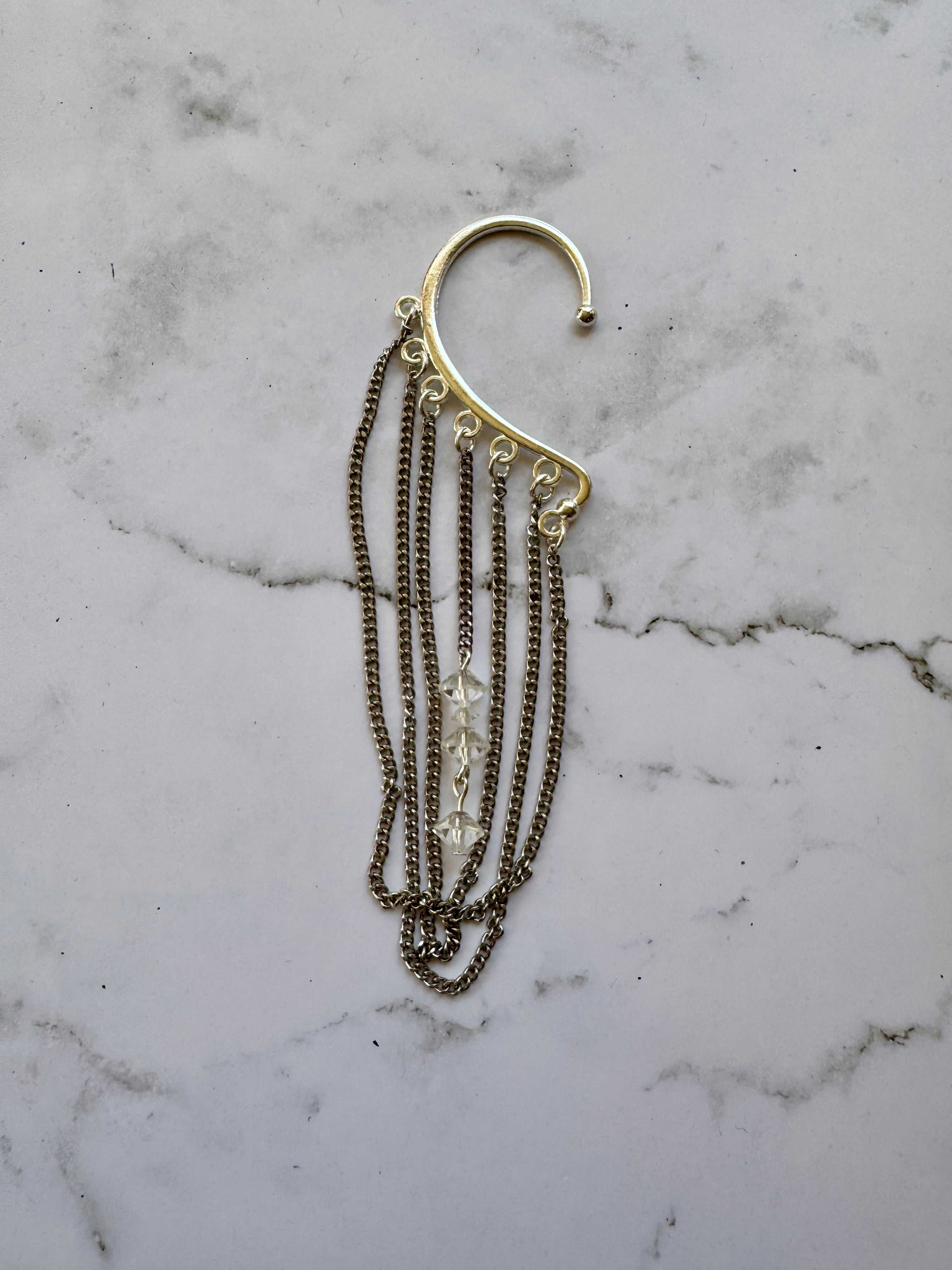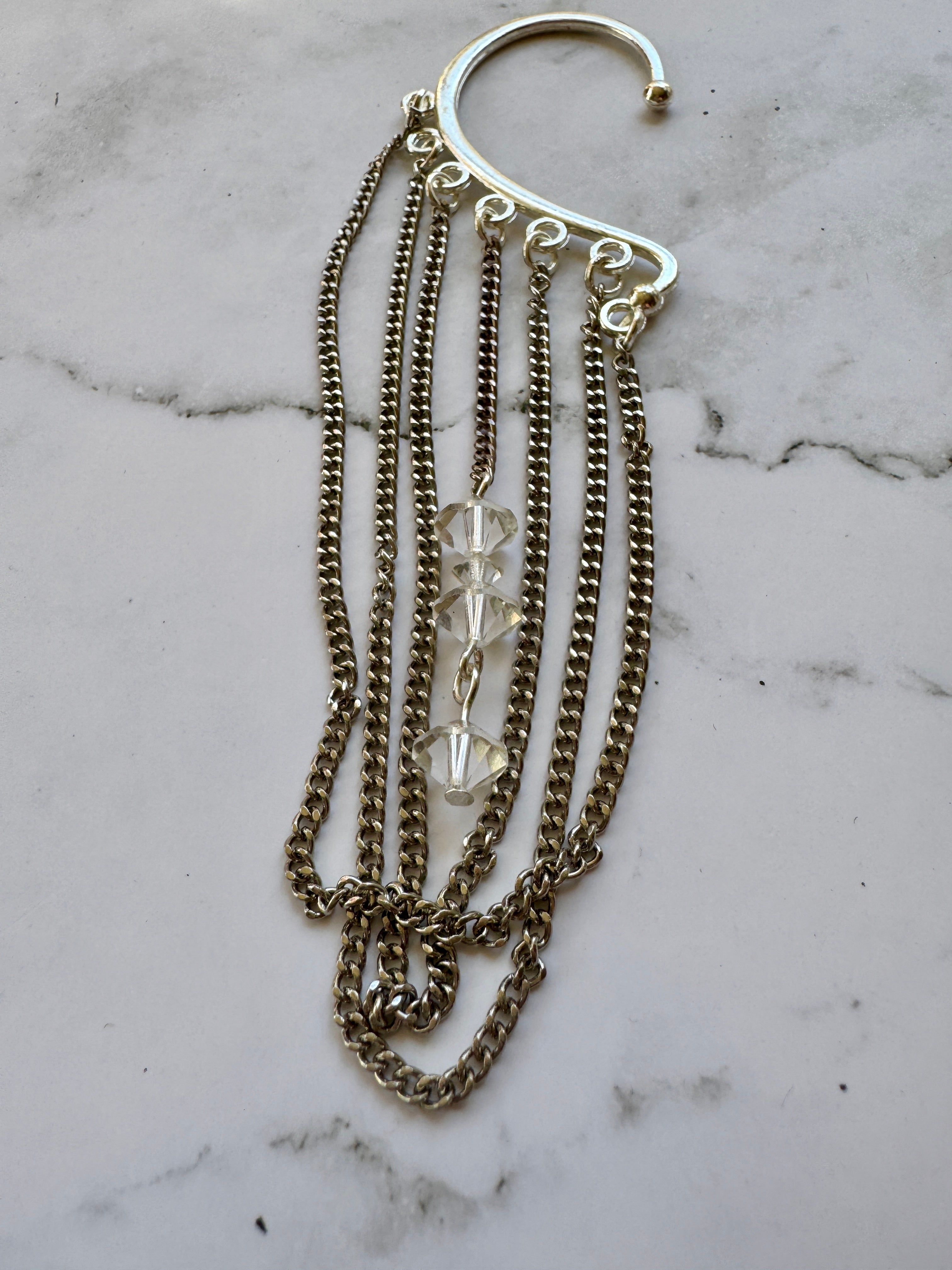 Repurposed vintage Ingredients: vintage silver chains and faceted antique crystal beads. Silver plated ear cuff is one size fits all. One of a kind!
