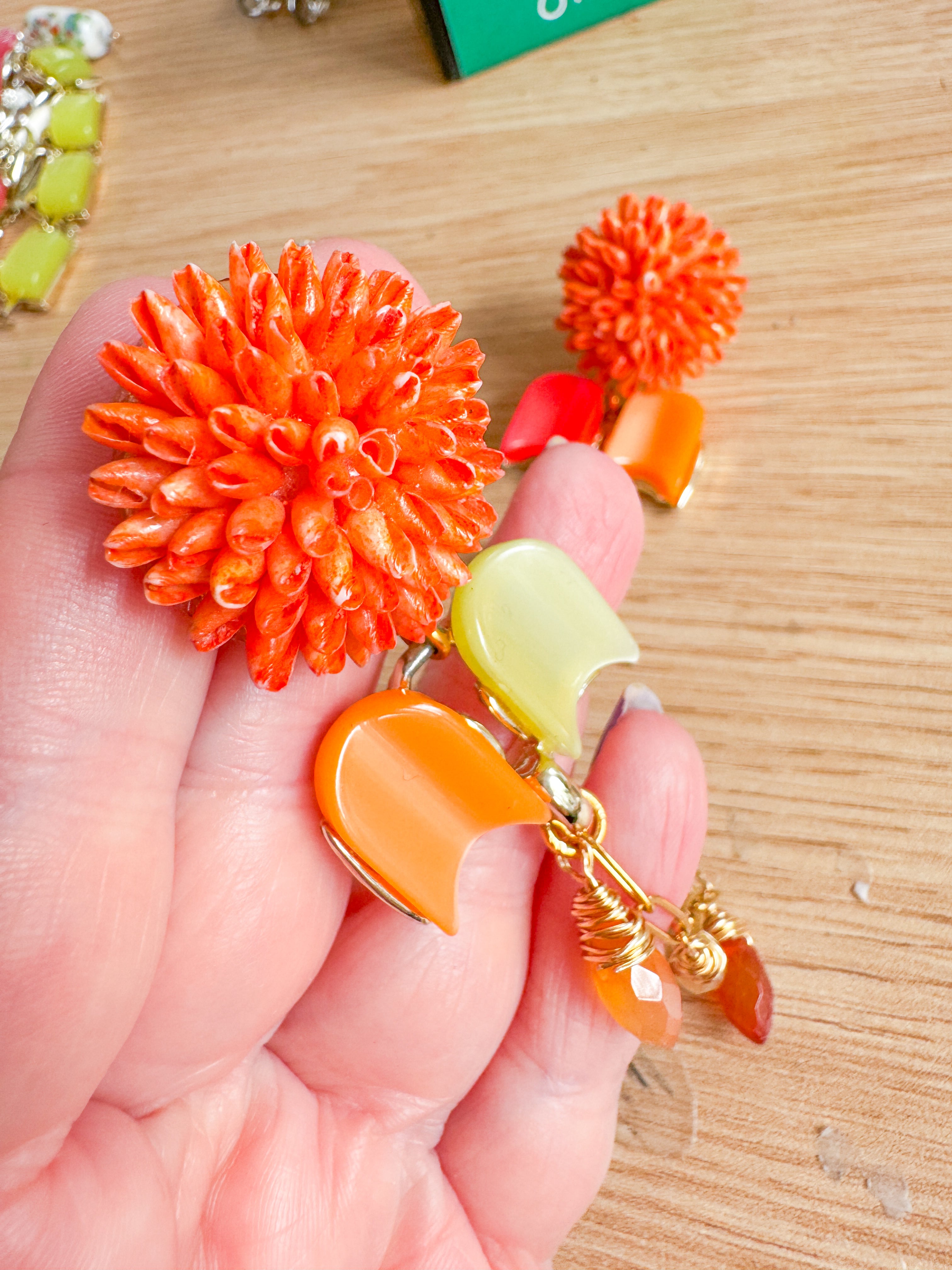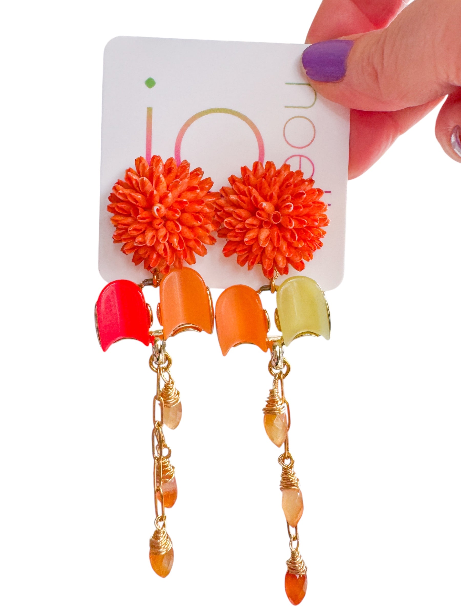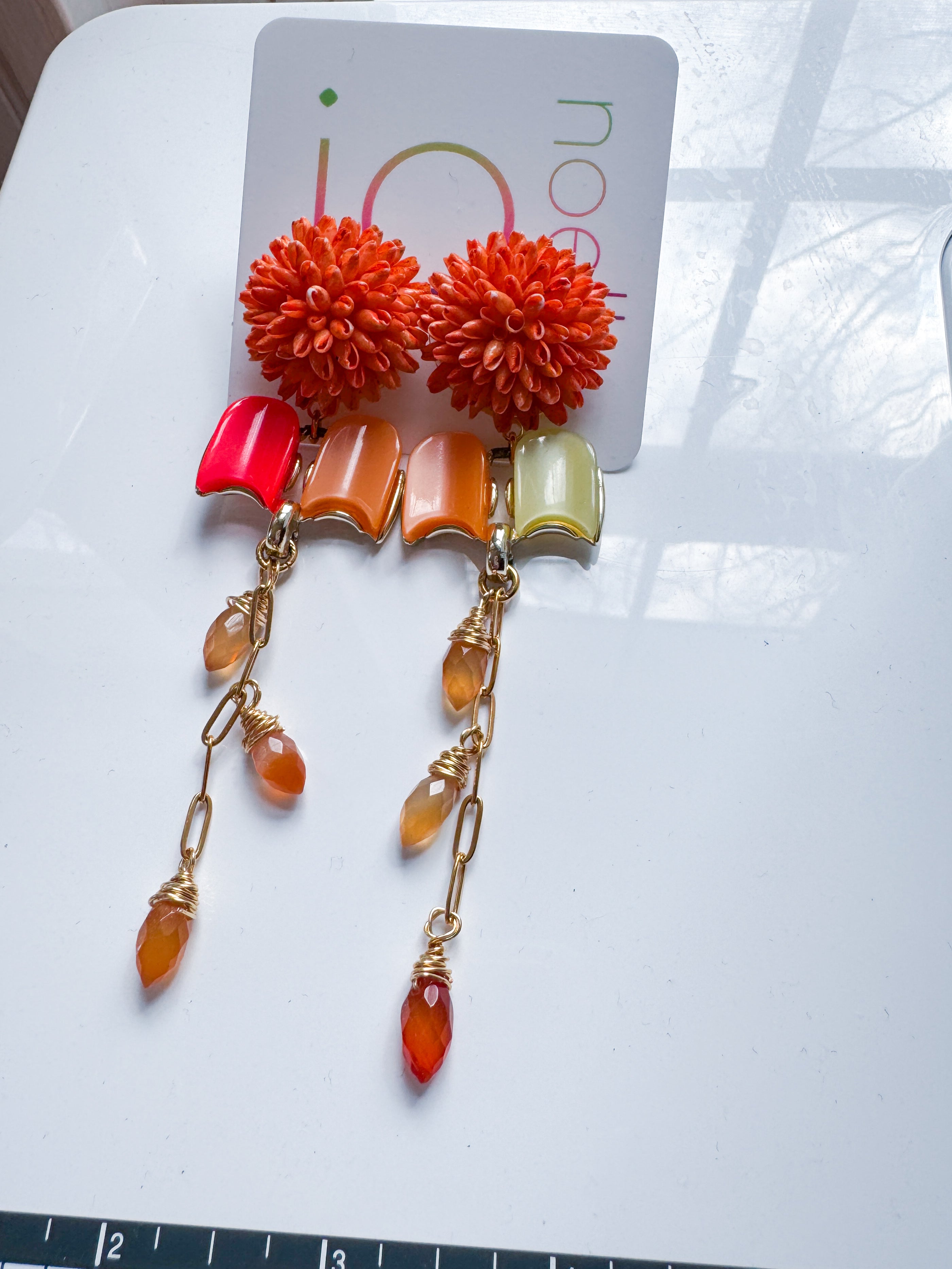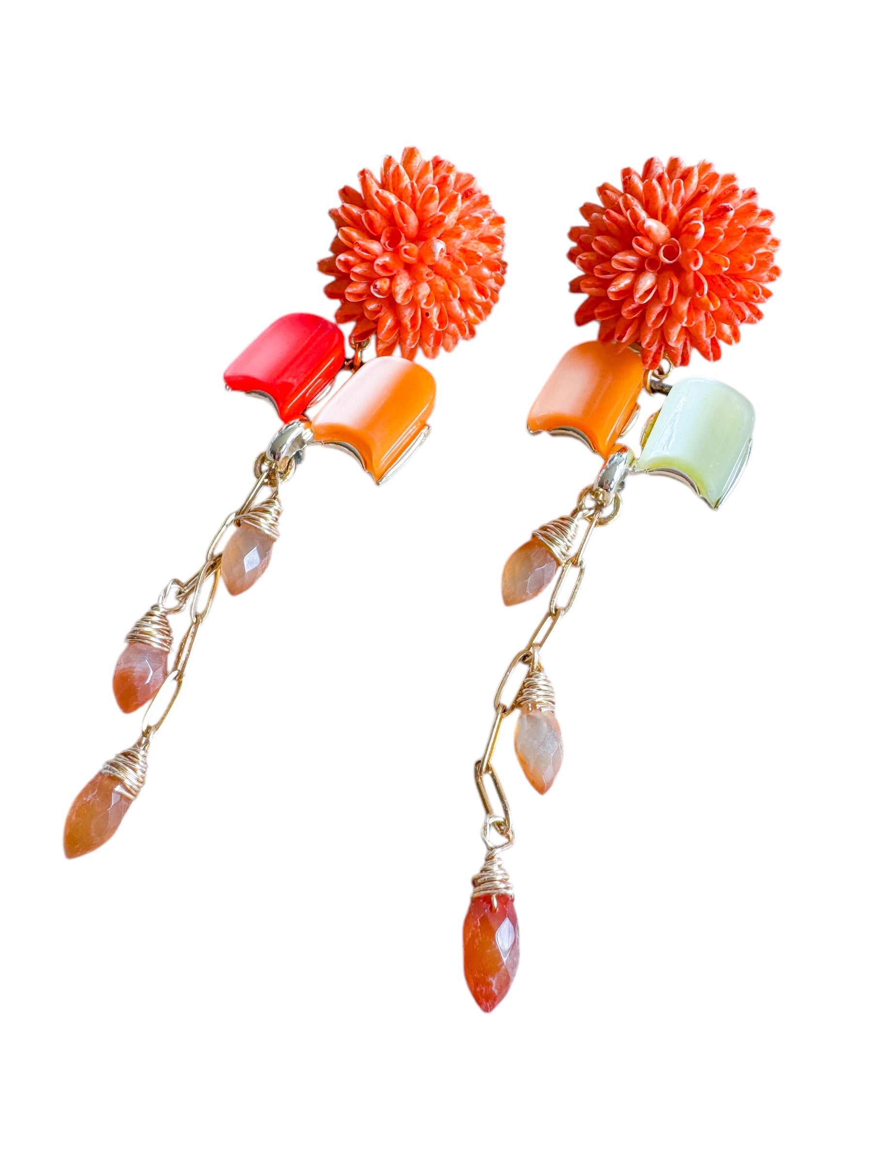 Vintage floral shell clip earrings transformed into posts and paired with MCM thermoset links and a trail of faceted carnelian gemstones. These light weight earrings dangle 3”.