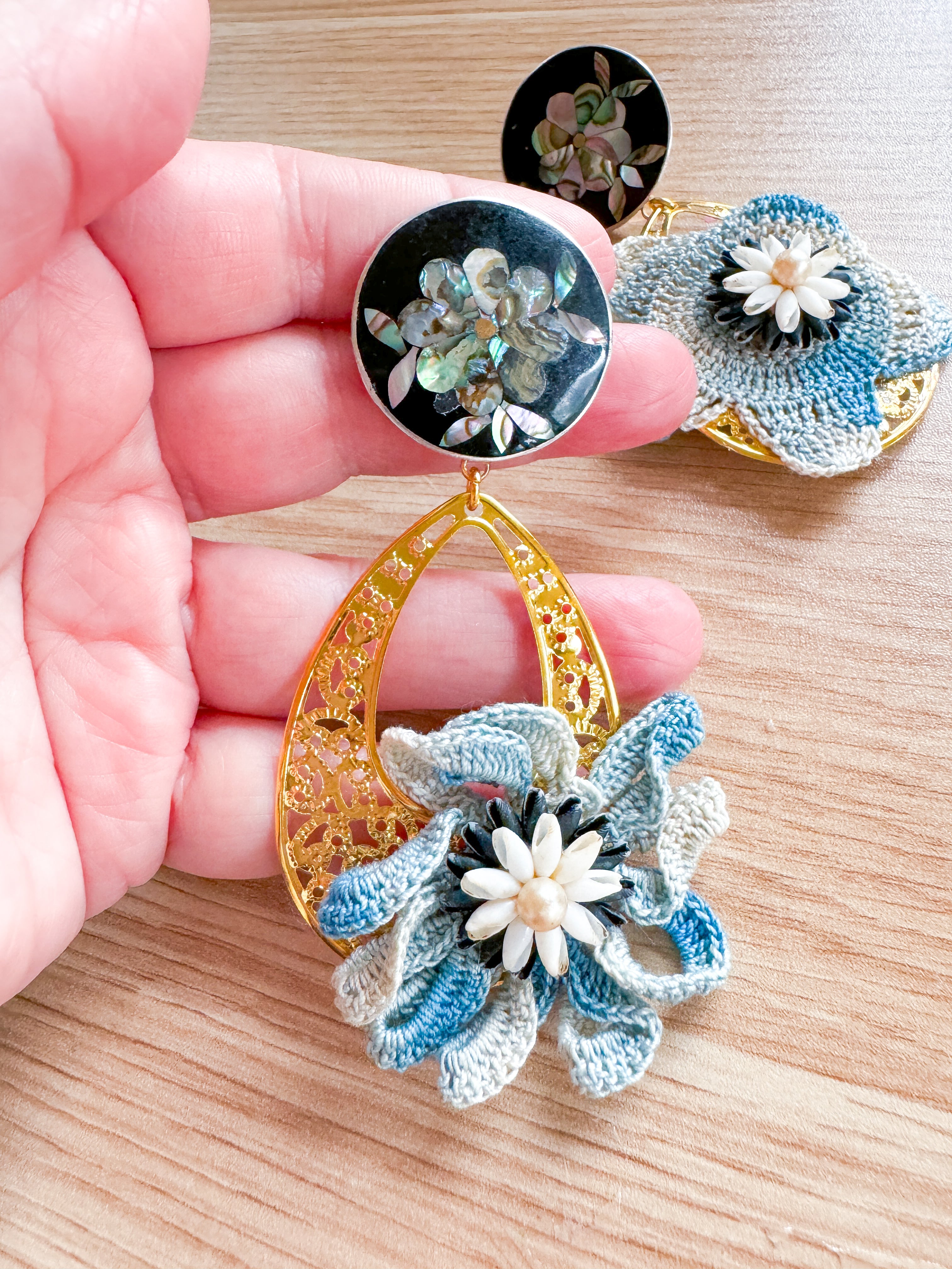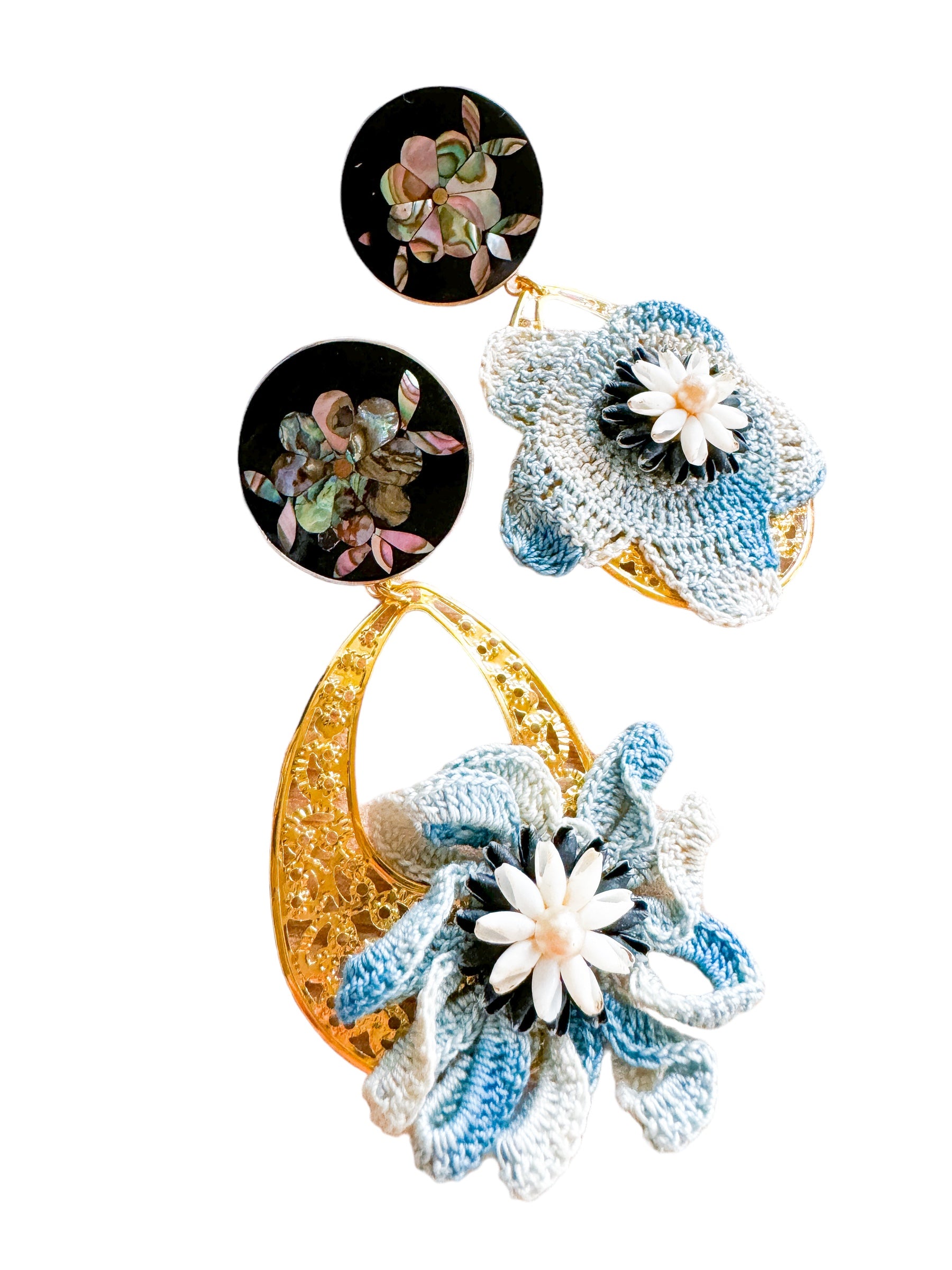 Repurposed vintage ingredients : ‘80’s mosaic shell clip earrings turned into posts, vintage crochet flowers and ‘60’s clip earrings. All combined atop 18kt gf filigree teardrops. Earrings dangle about 2.5”s.