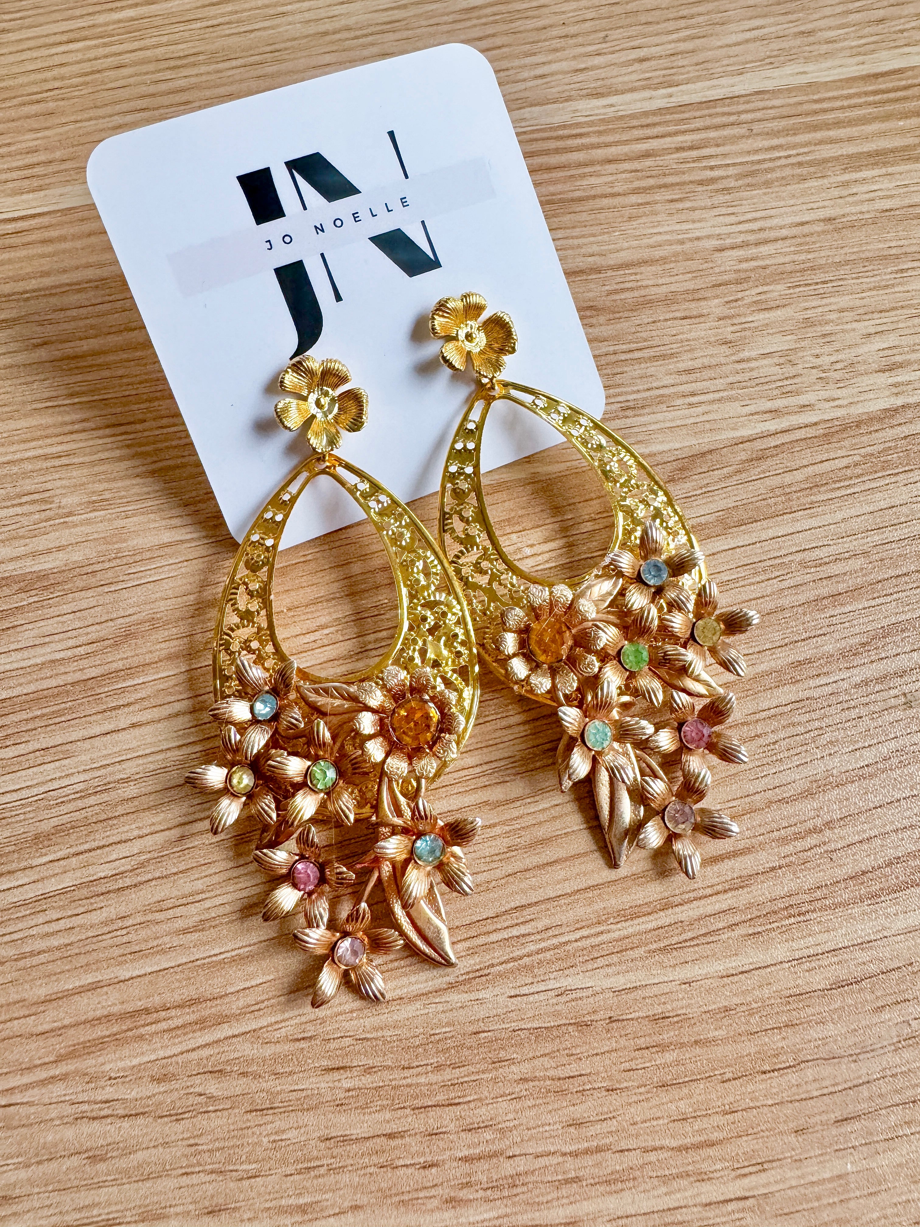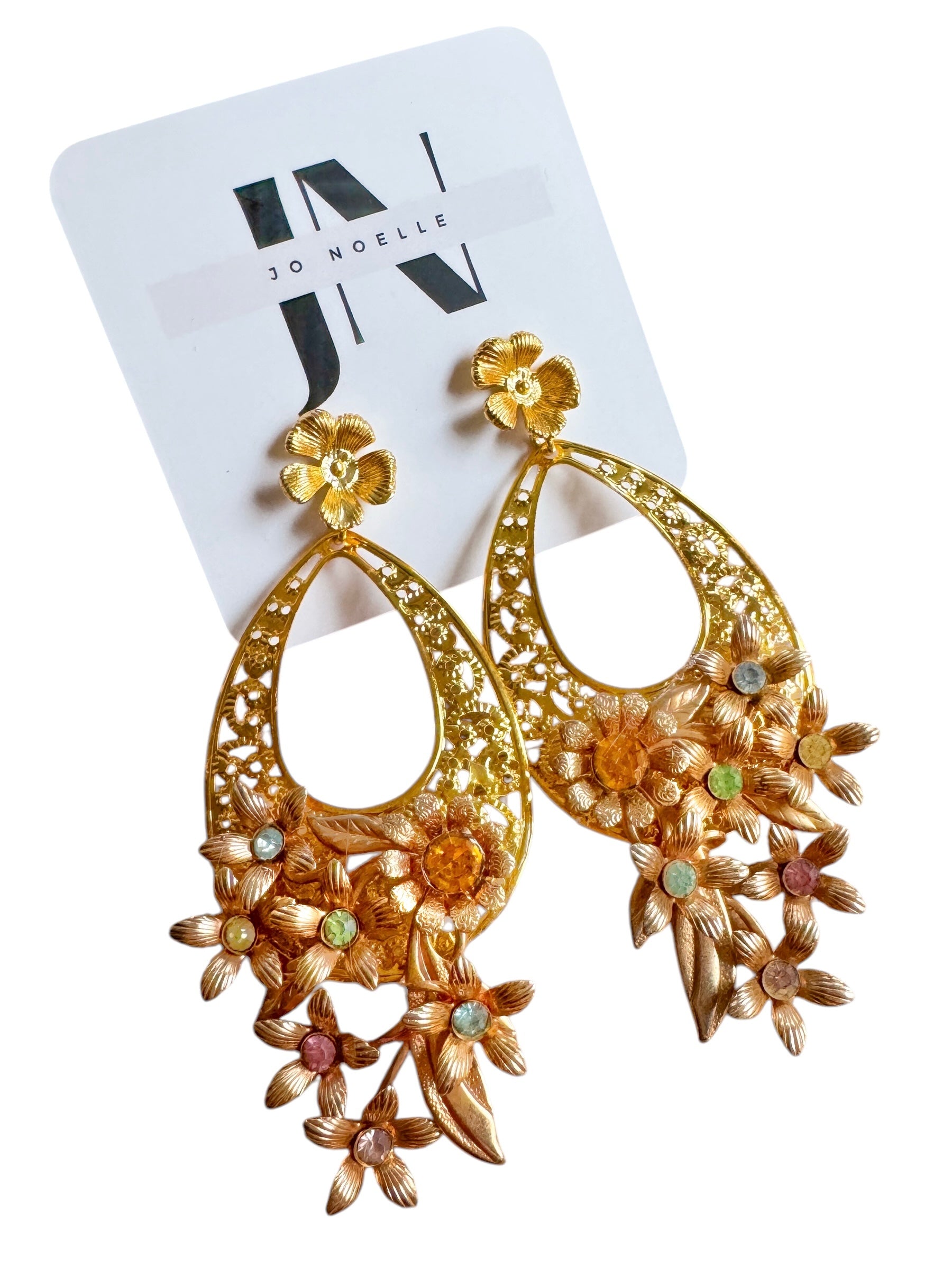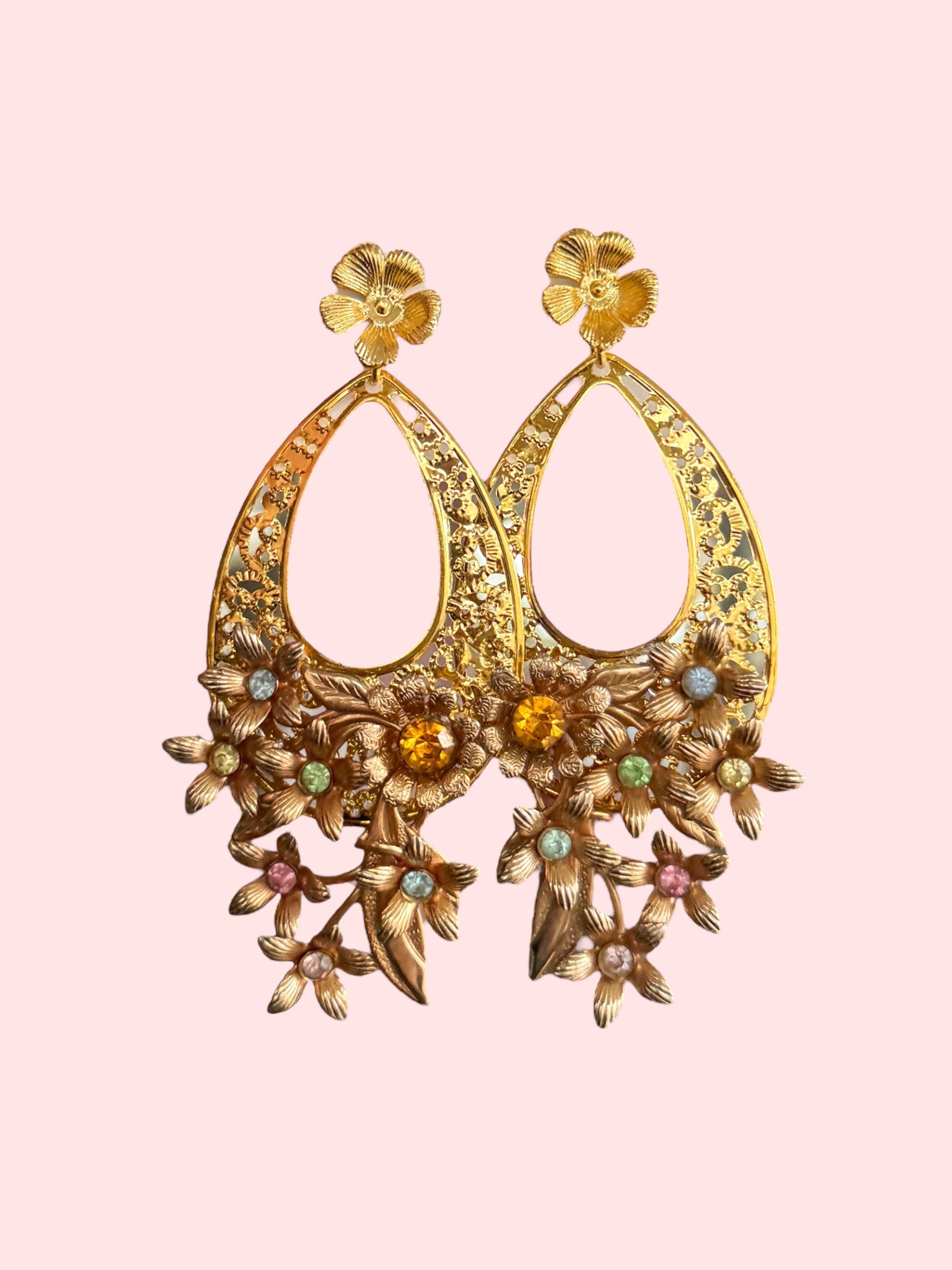 22kt gf flower post earrings, gf filigree teardrop hoops and the most special dimensional 1950’s floral clip earrings. Earrings dangle 2.5”s.