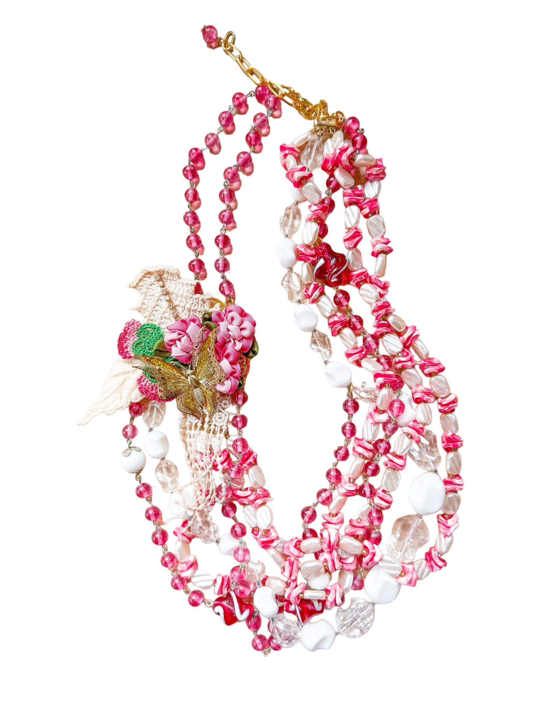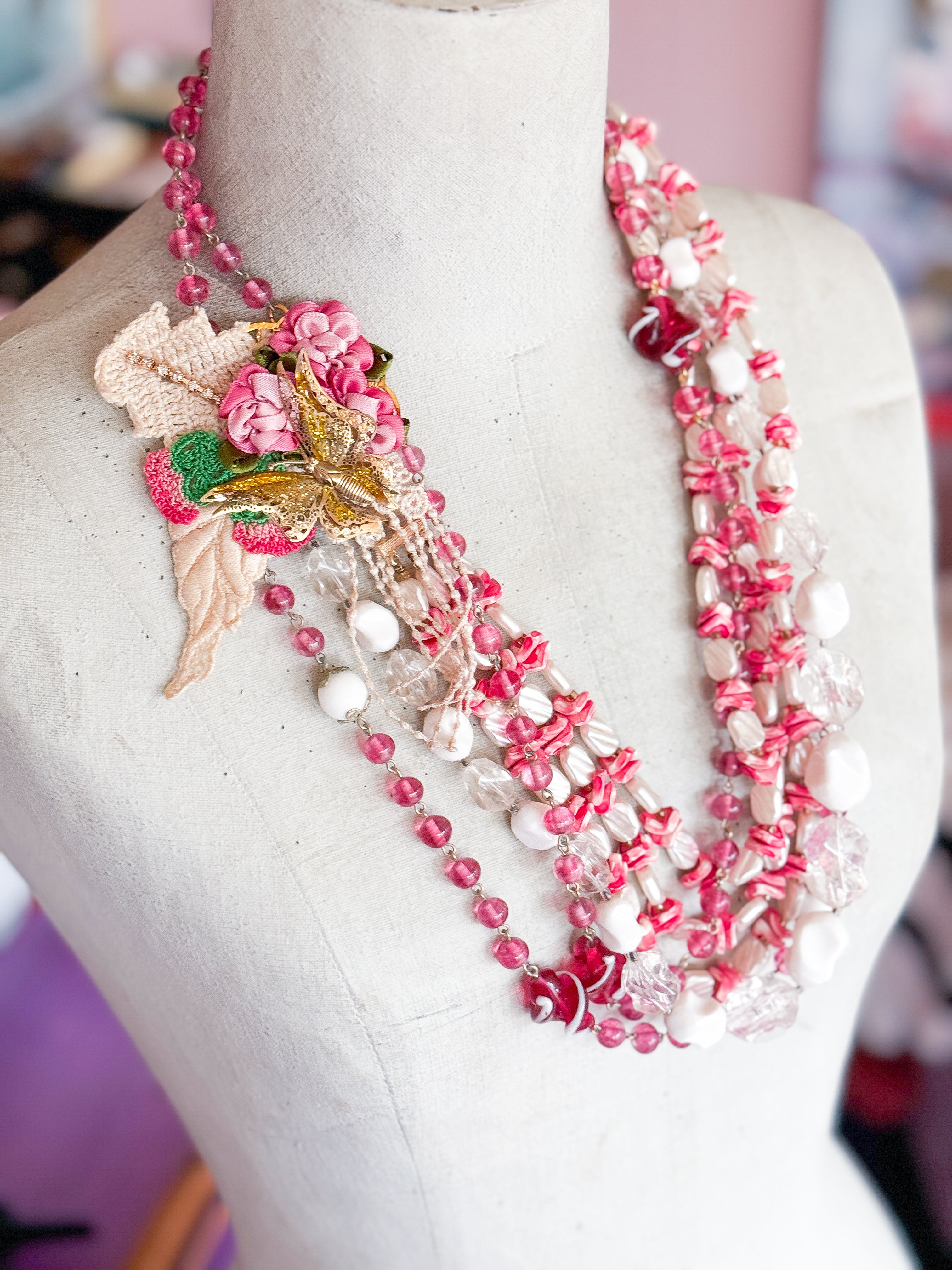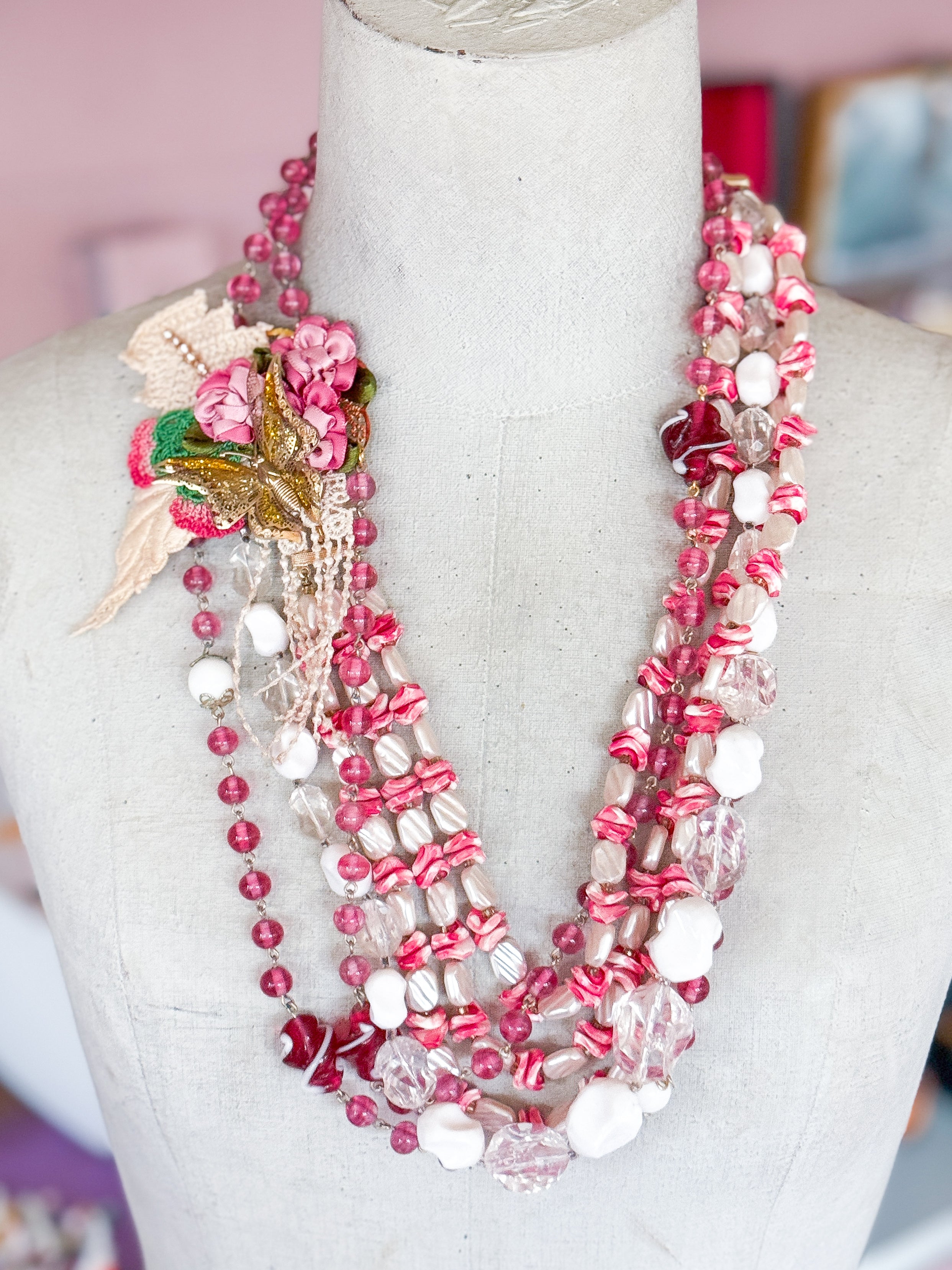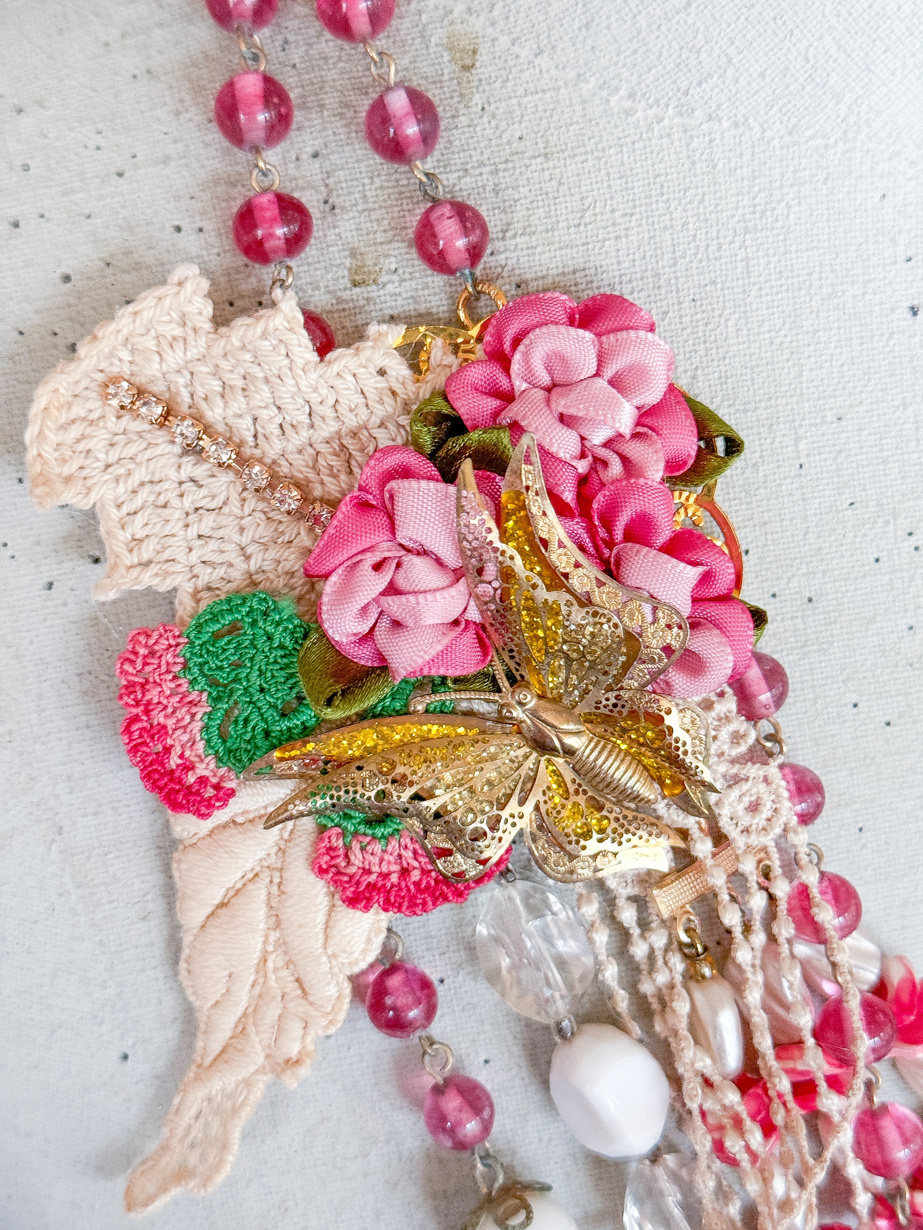Repurposed Vintage ingredients: vintage glass beads, Antique tatted lace, Swarovski crystals, ‘50’s butterfly brooch, vintage fabric roses, gold filled filigree pendant base, ‘80’s MOP necklace, and ‘60’s beaded costume necklaces. Thee best neckmess!!