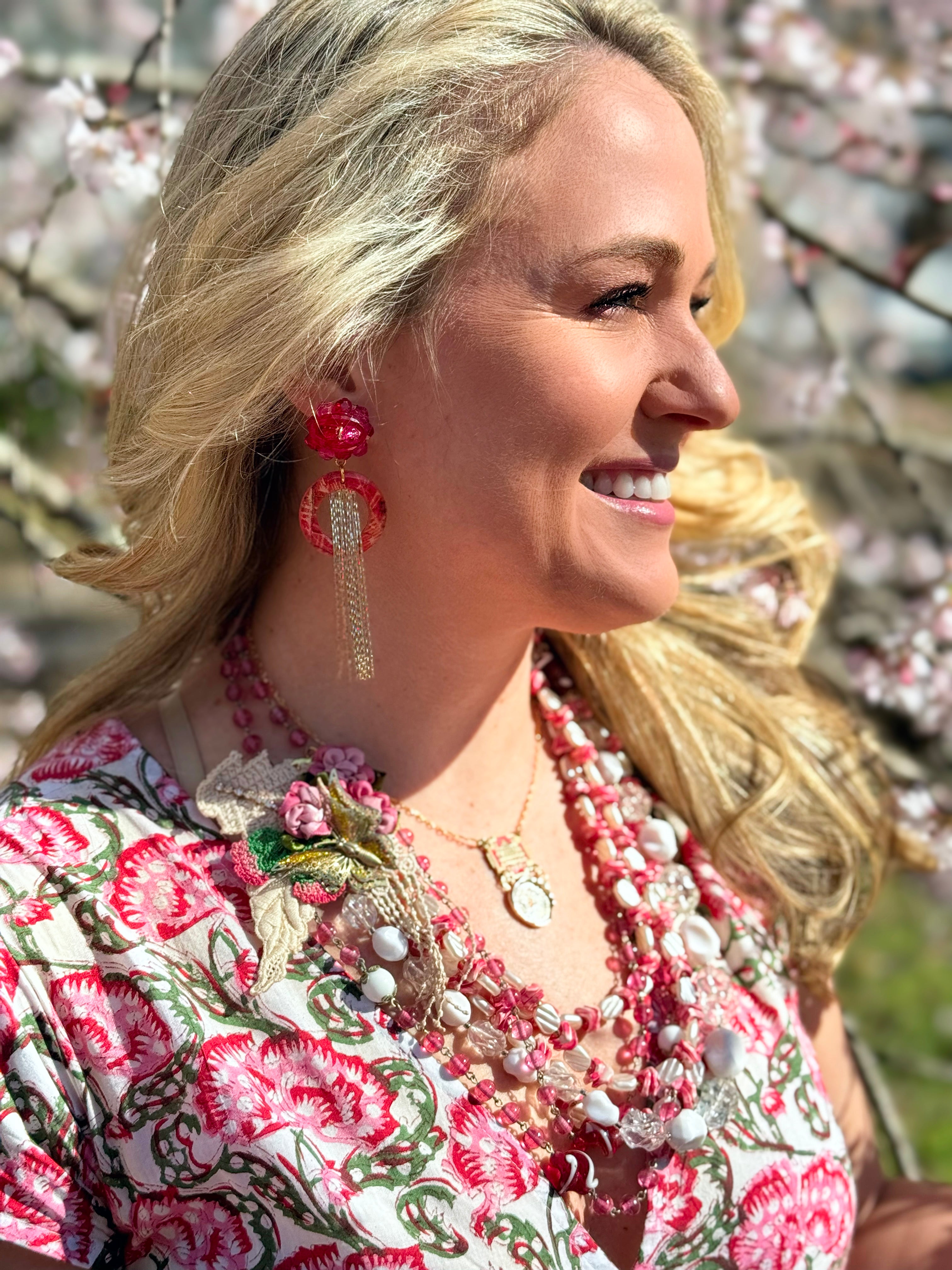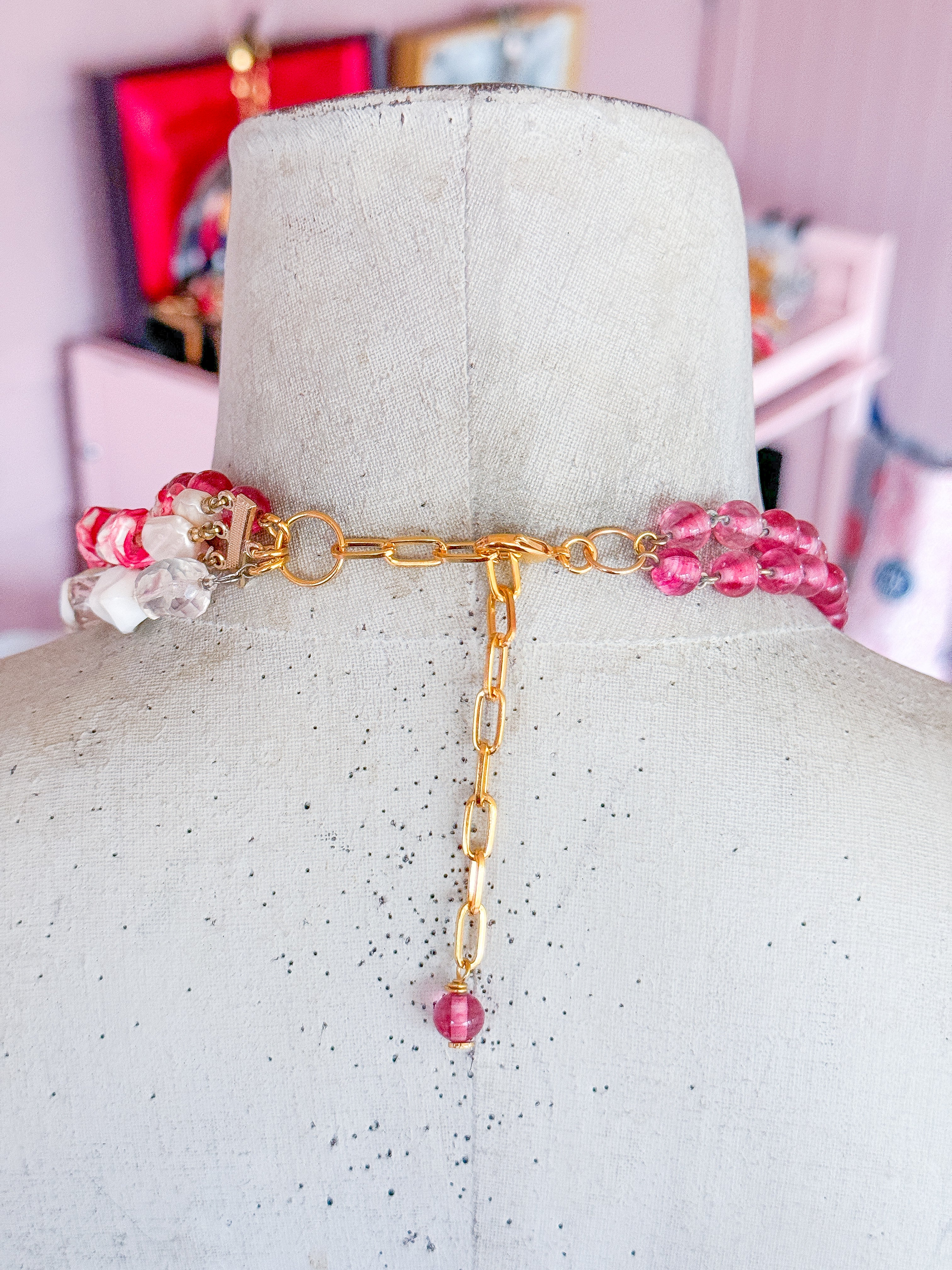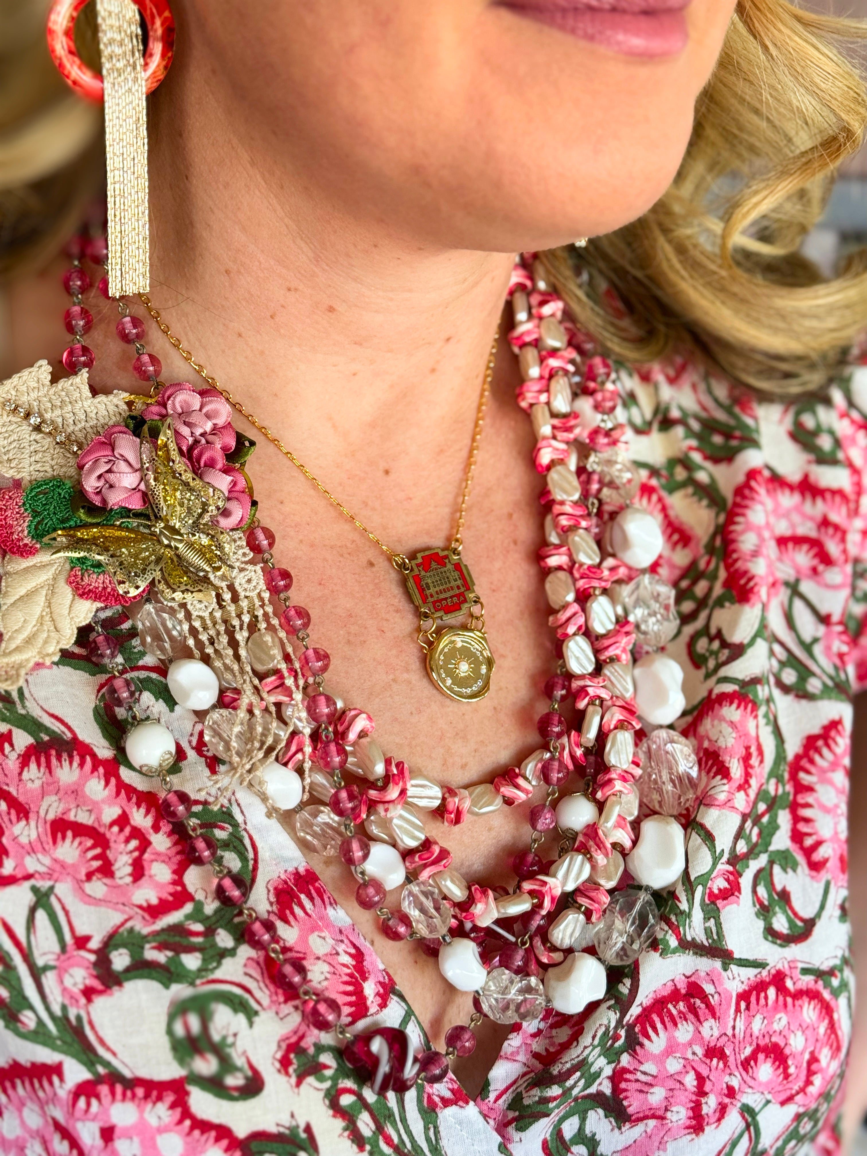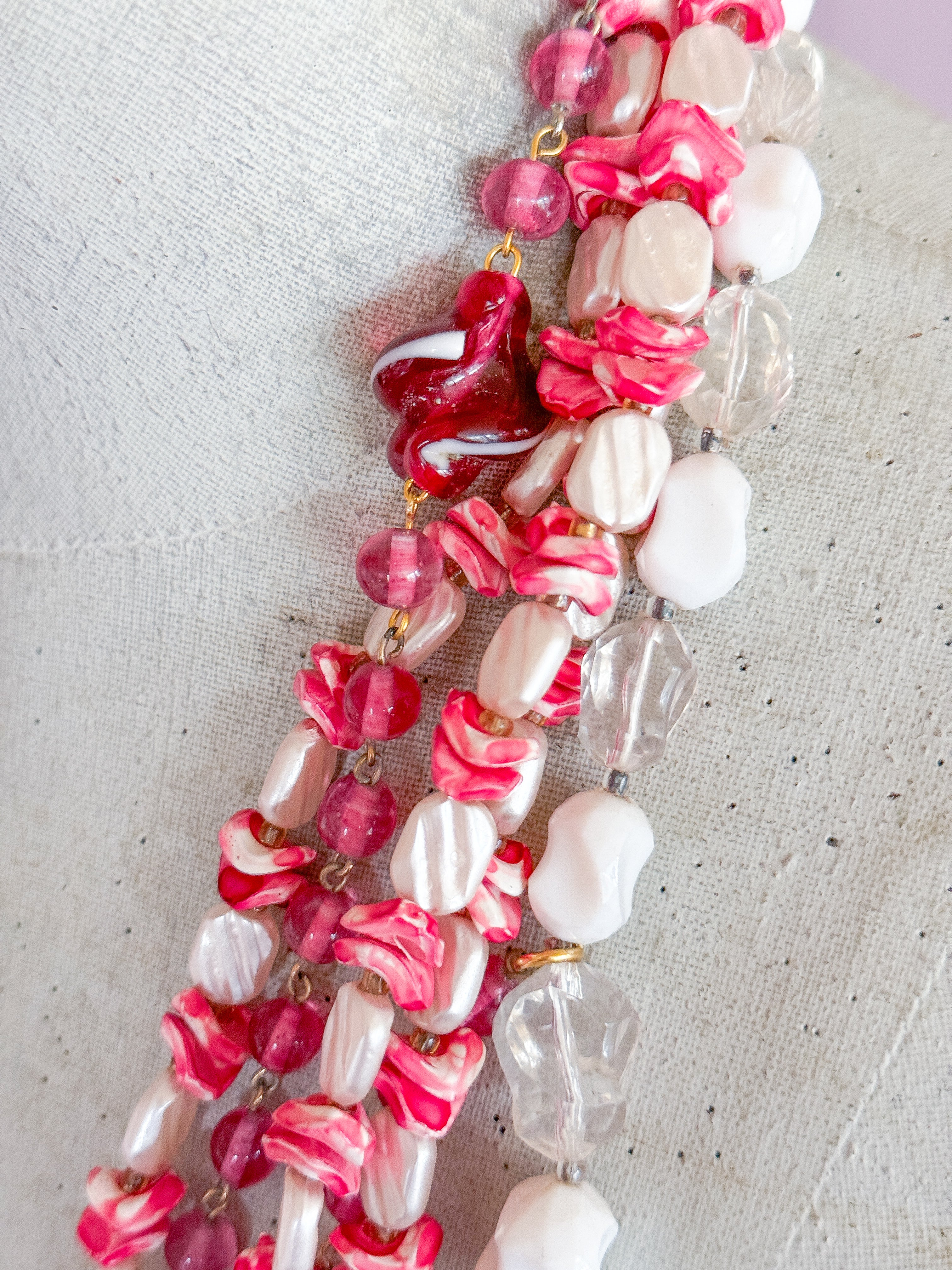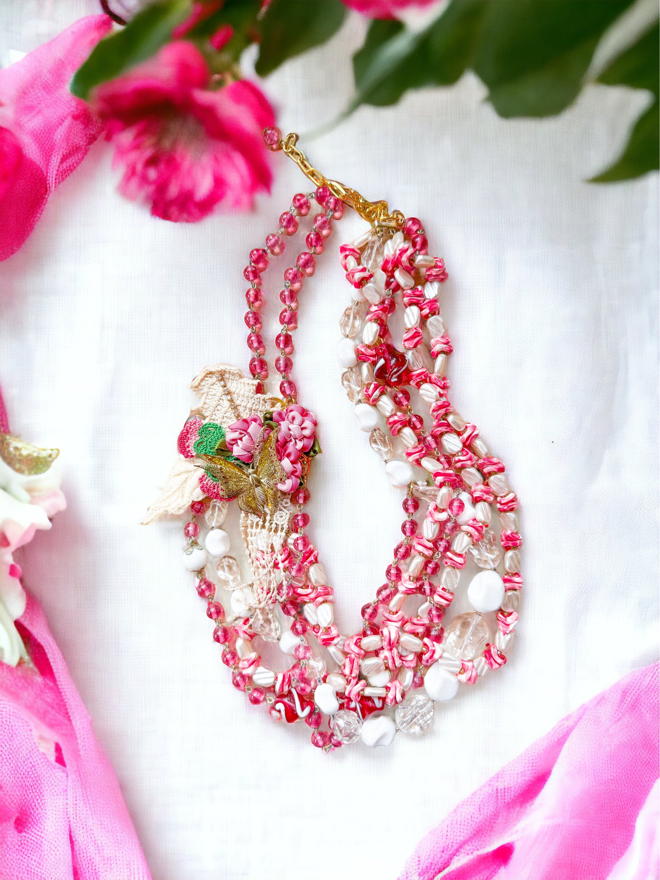 Repurposed Vintage ingredients: vintage glass beads, Antique tatted lace, Swarovski crystals, ‘50’s butterfly brooch, vintage fabric roses, gold filled filigree pendant base, ‘80’s MOP necklace, and ‘60’s beaded costume necklaces. Thee best neckmess!!