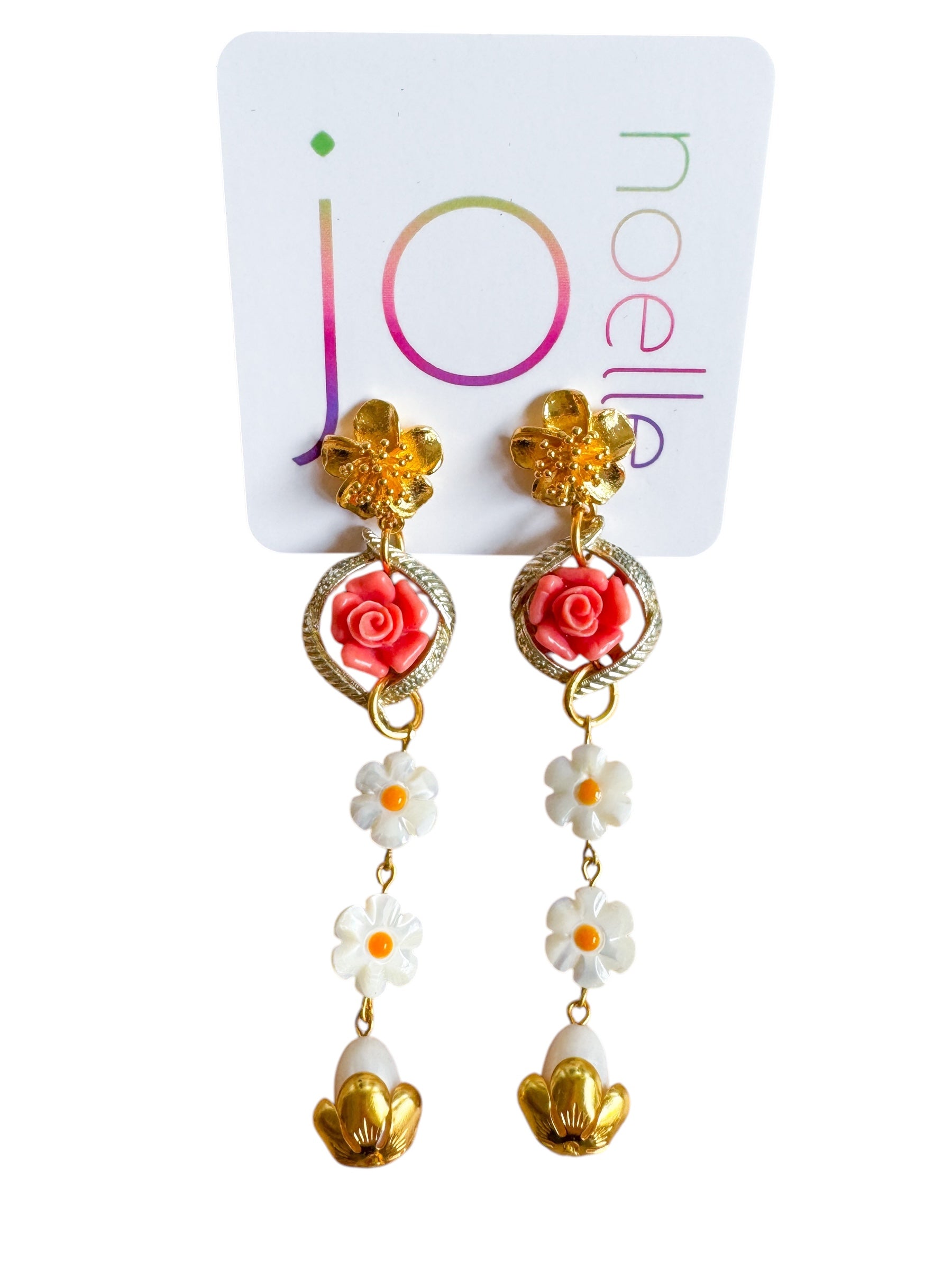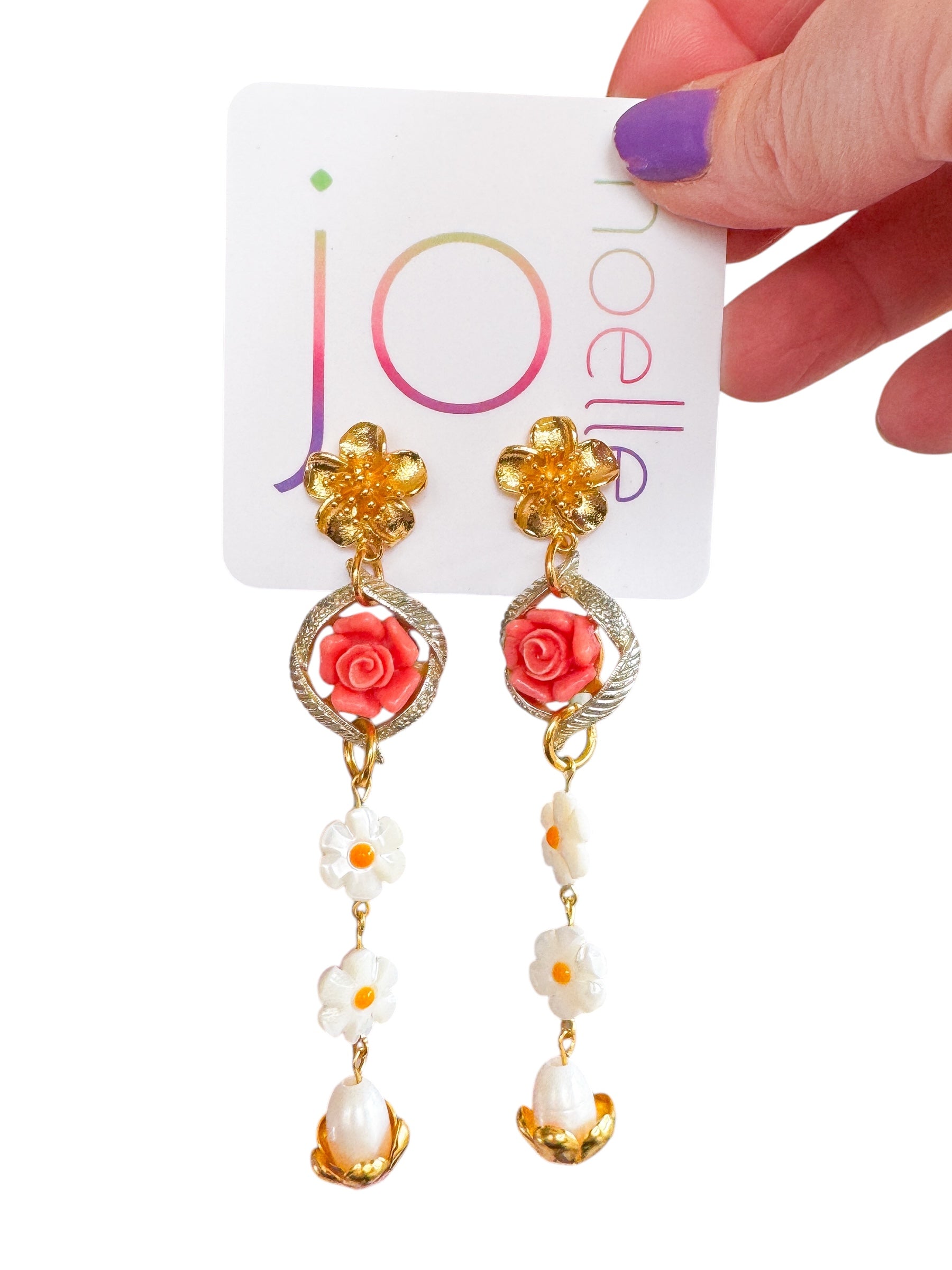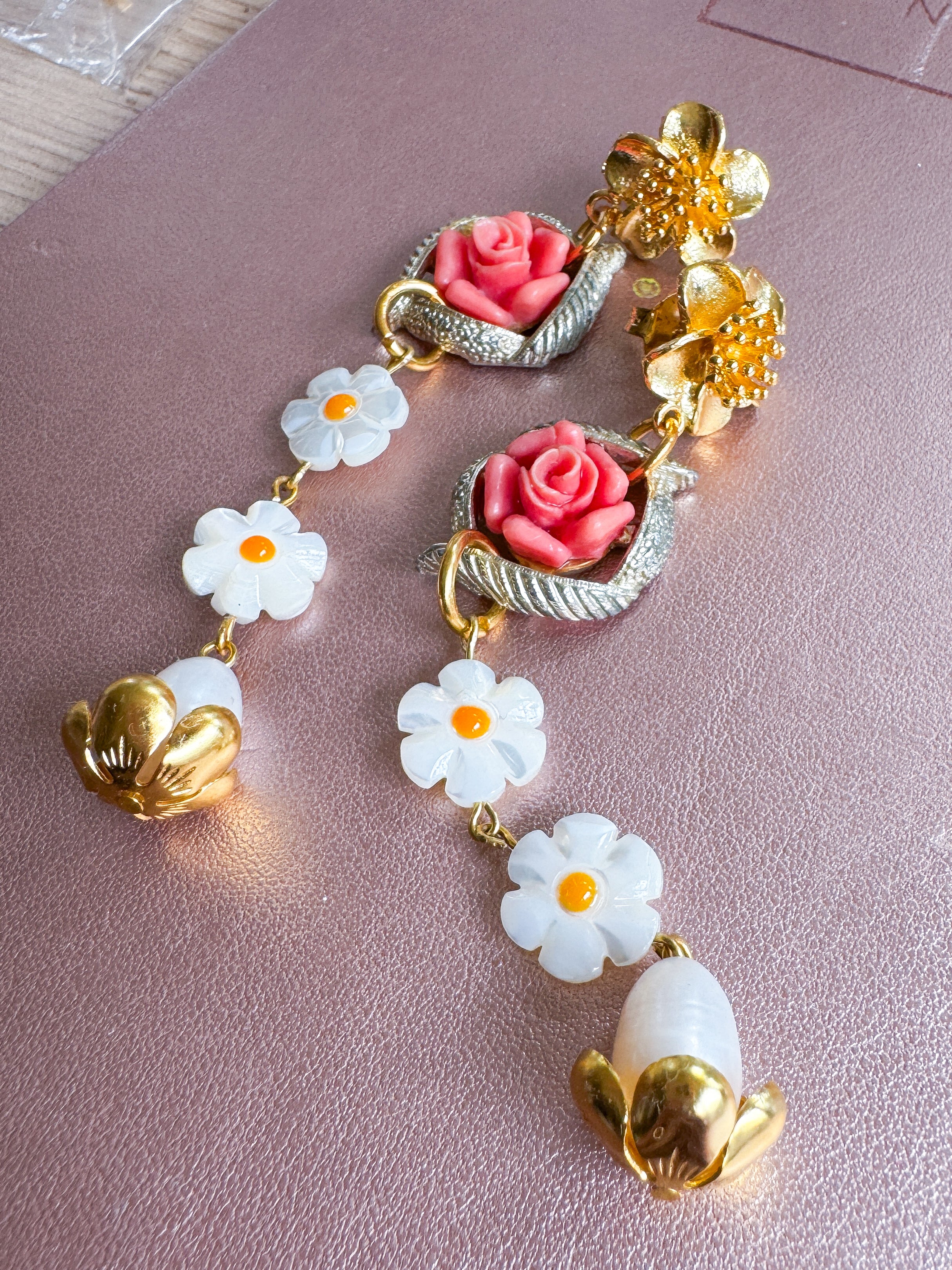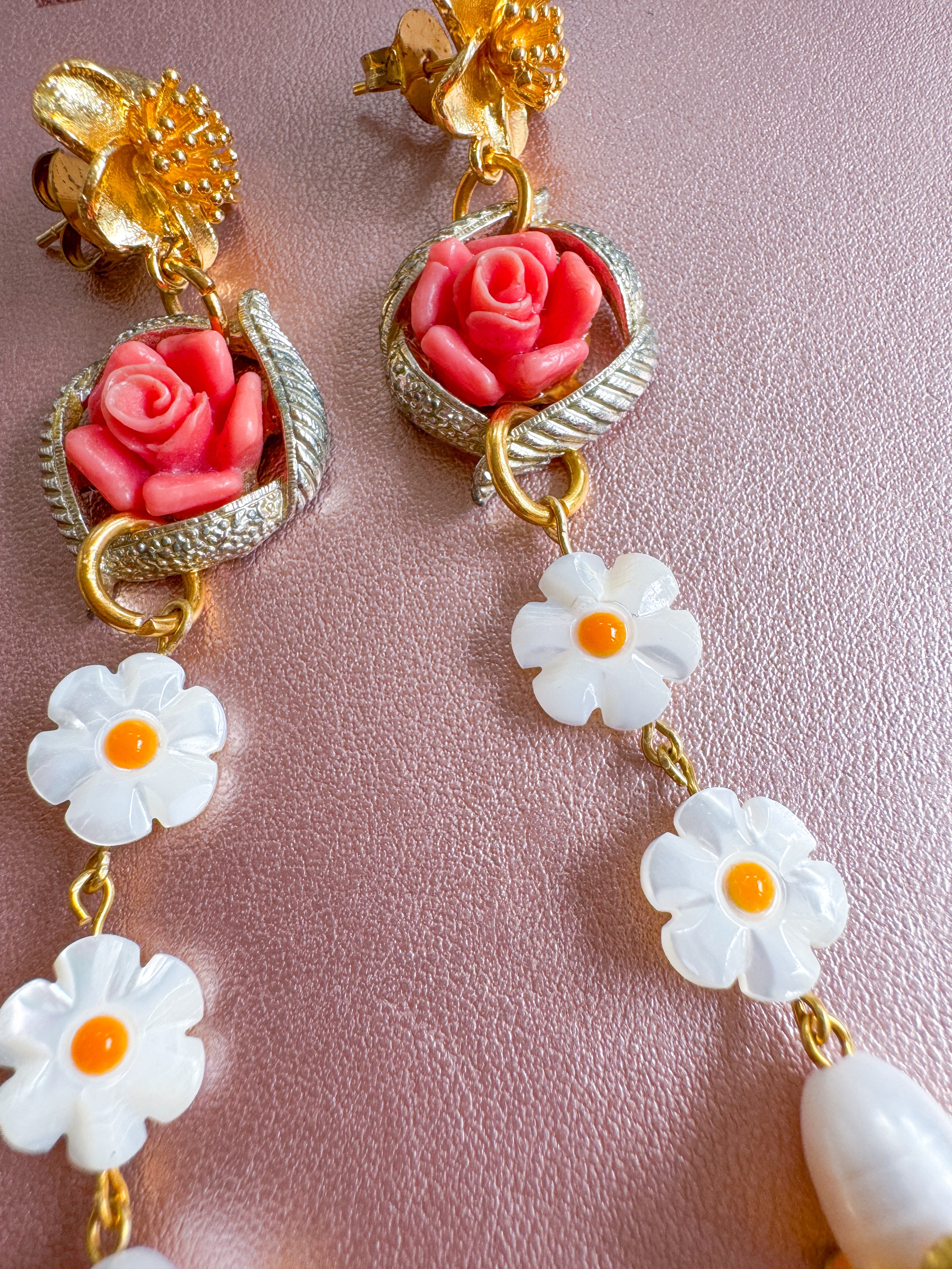22kt gf flower posts paired with vintage coral rose links, pearl daisy beads and fresh water pearls. These light weight earrings dangle 3”.