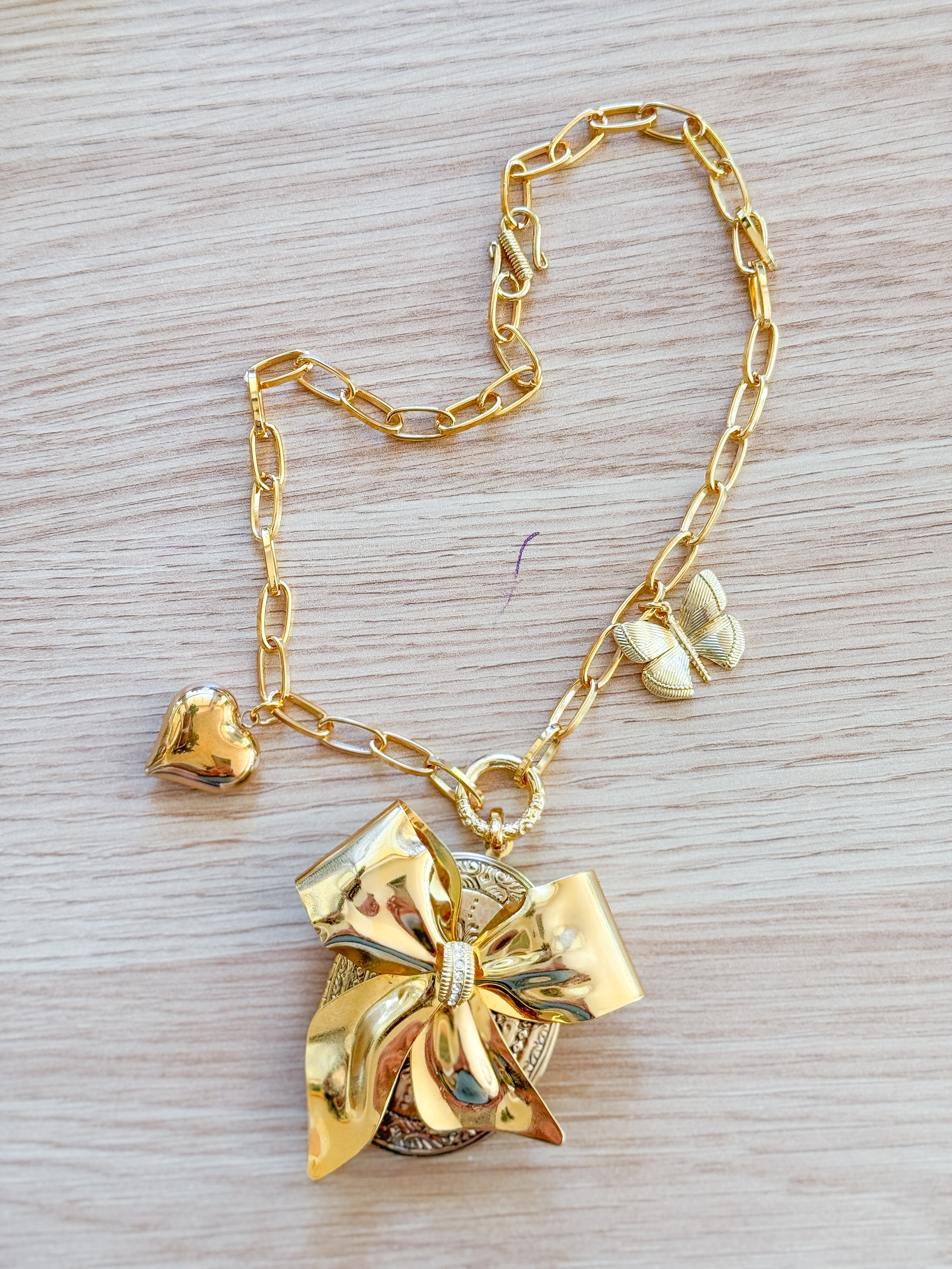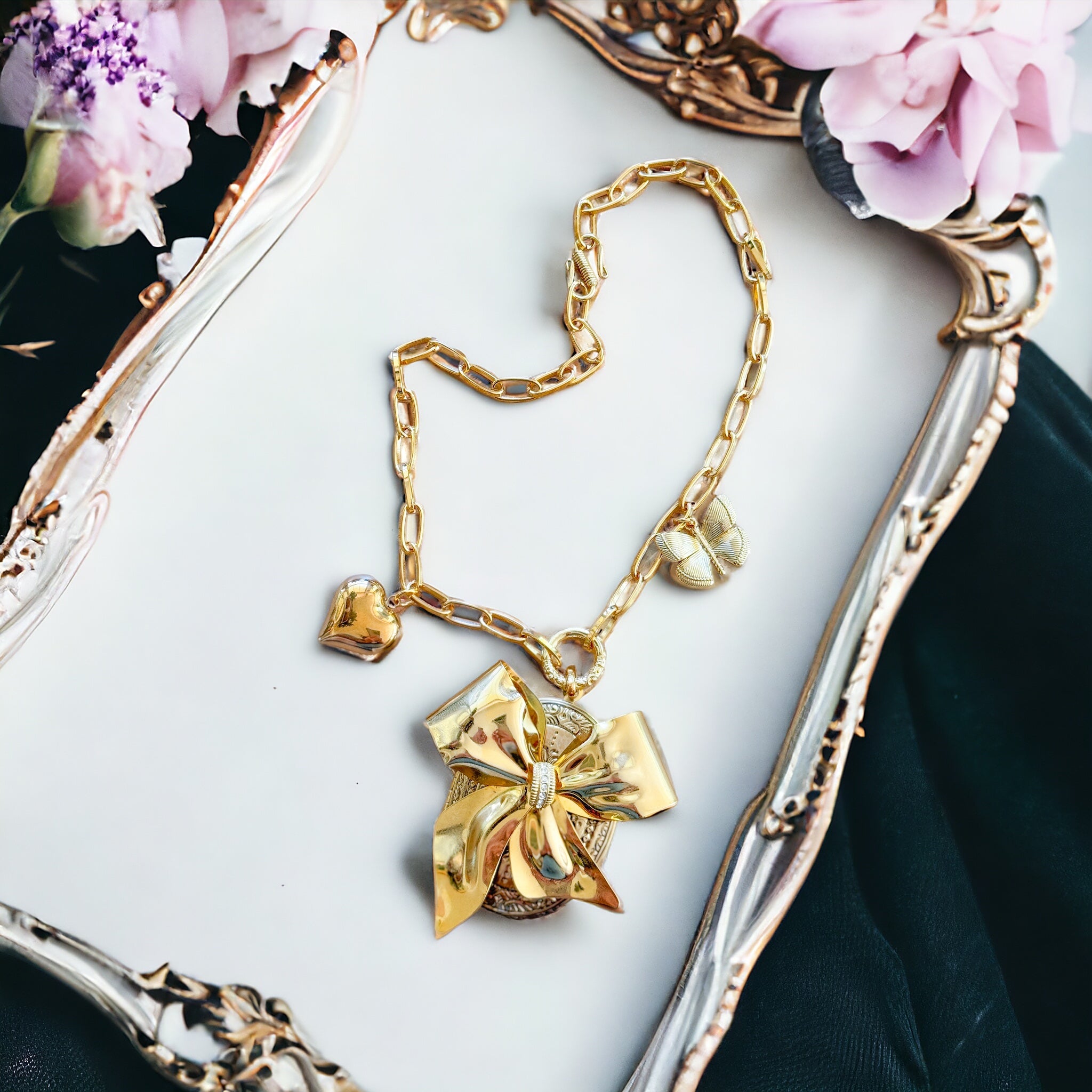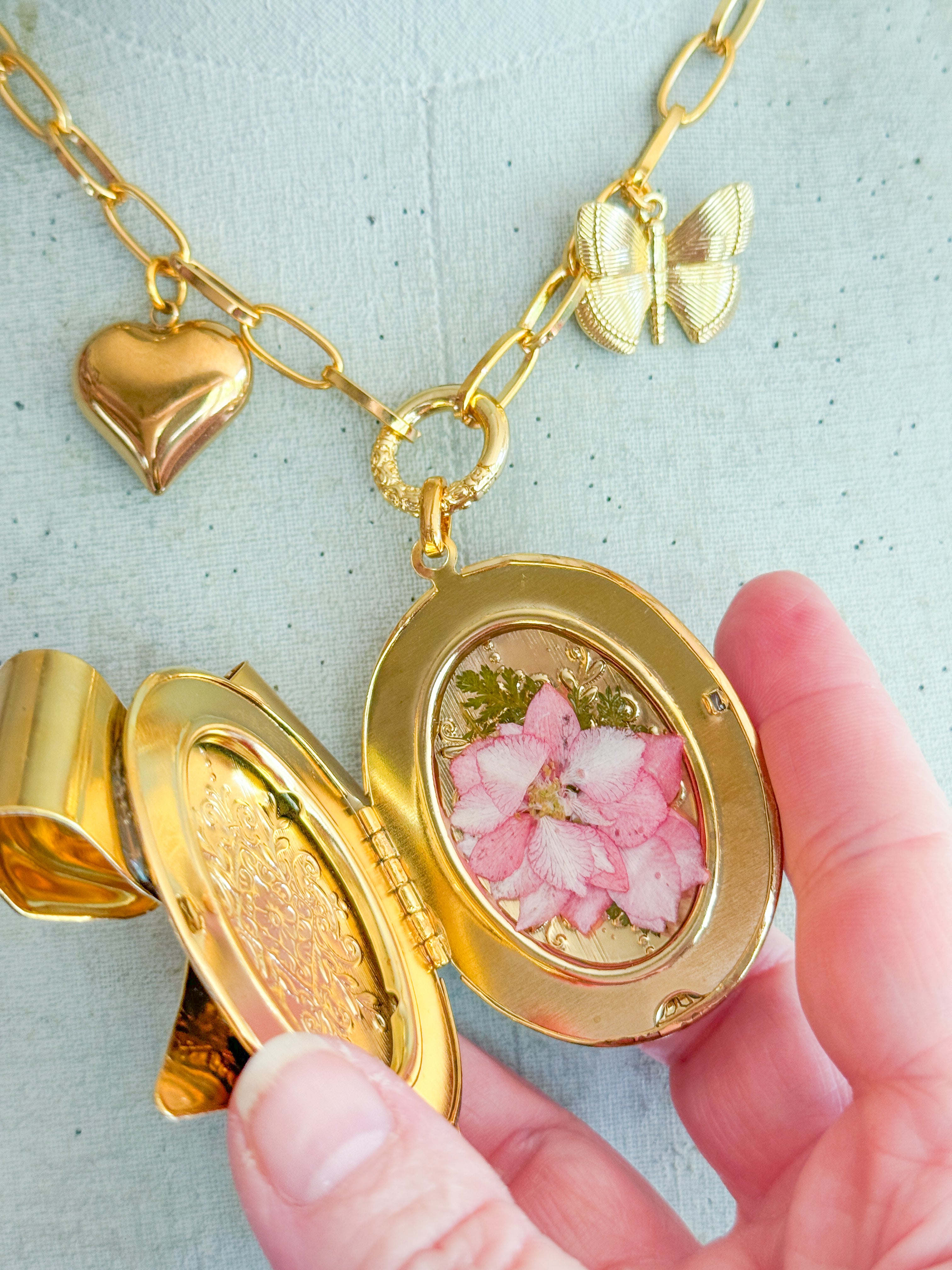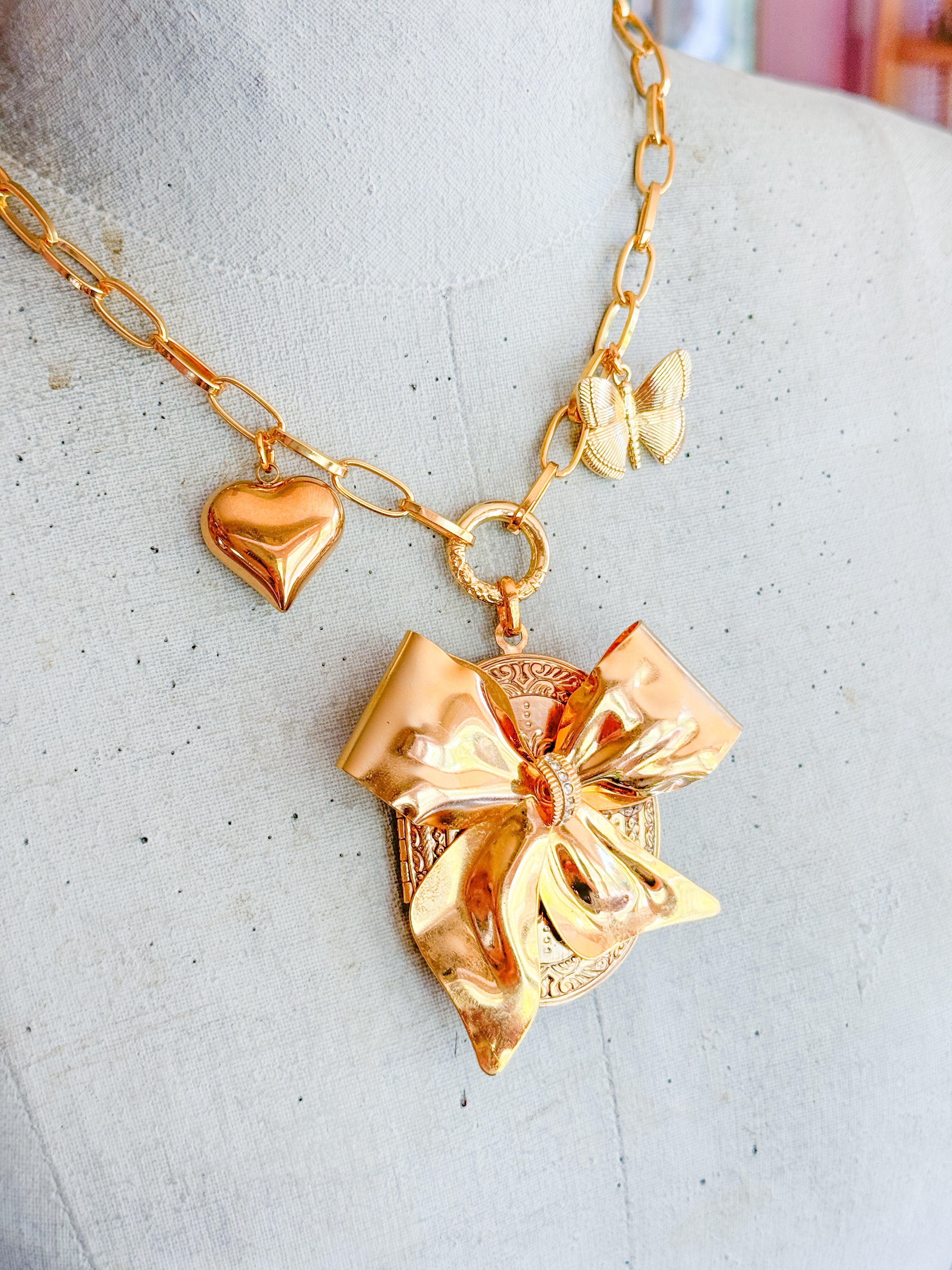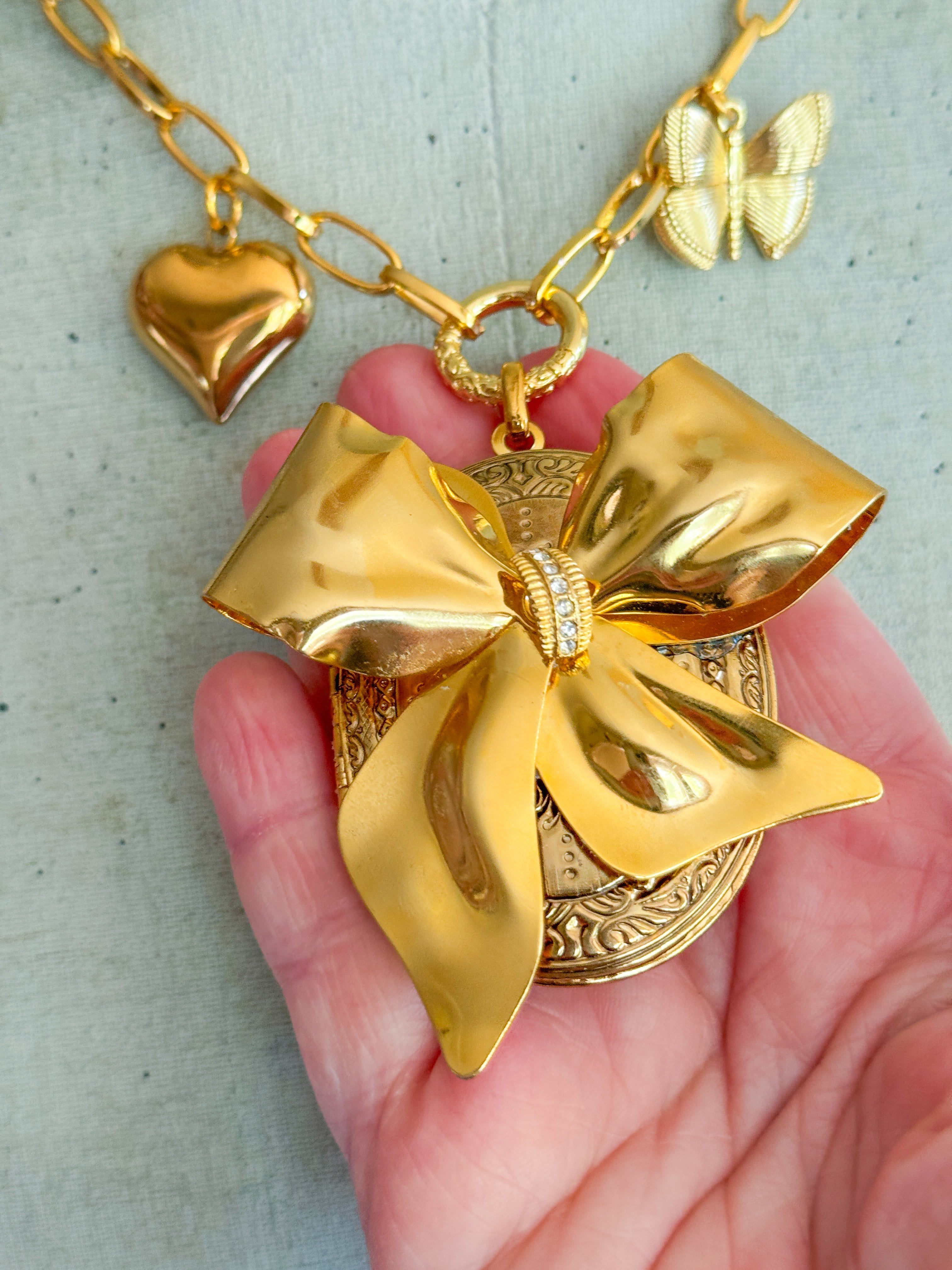 A vintage gold locket has been embellishes with an ‘antique bow brooch that has been thoughtfully filled with dainty pressed flowers and preserved forever with resin. Gold filled heart and butterfly charms add to the romance of the necklace. The charms dangle from 22kt gf chain. Necklace is 17”s.