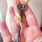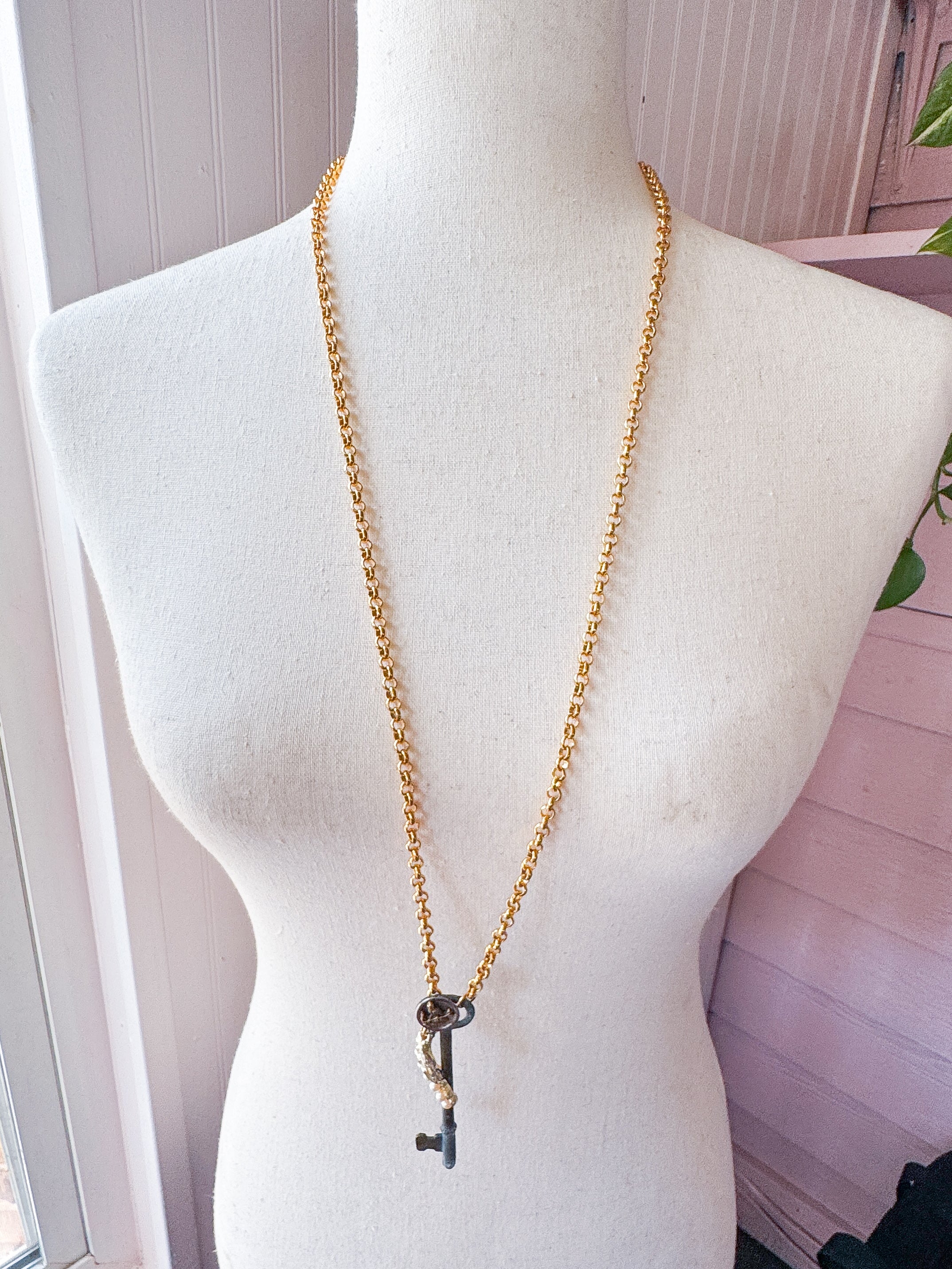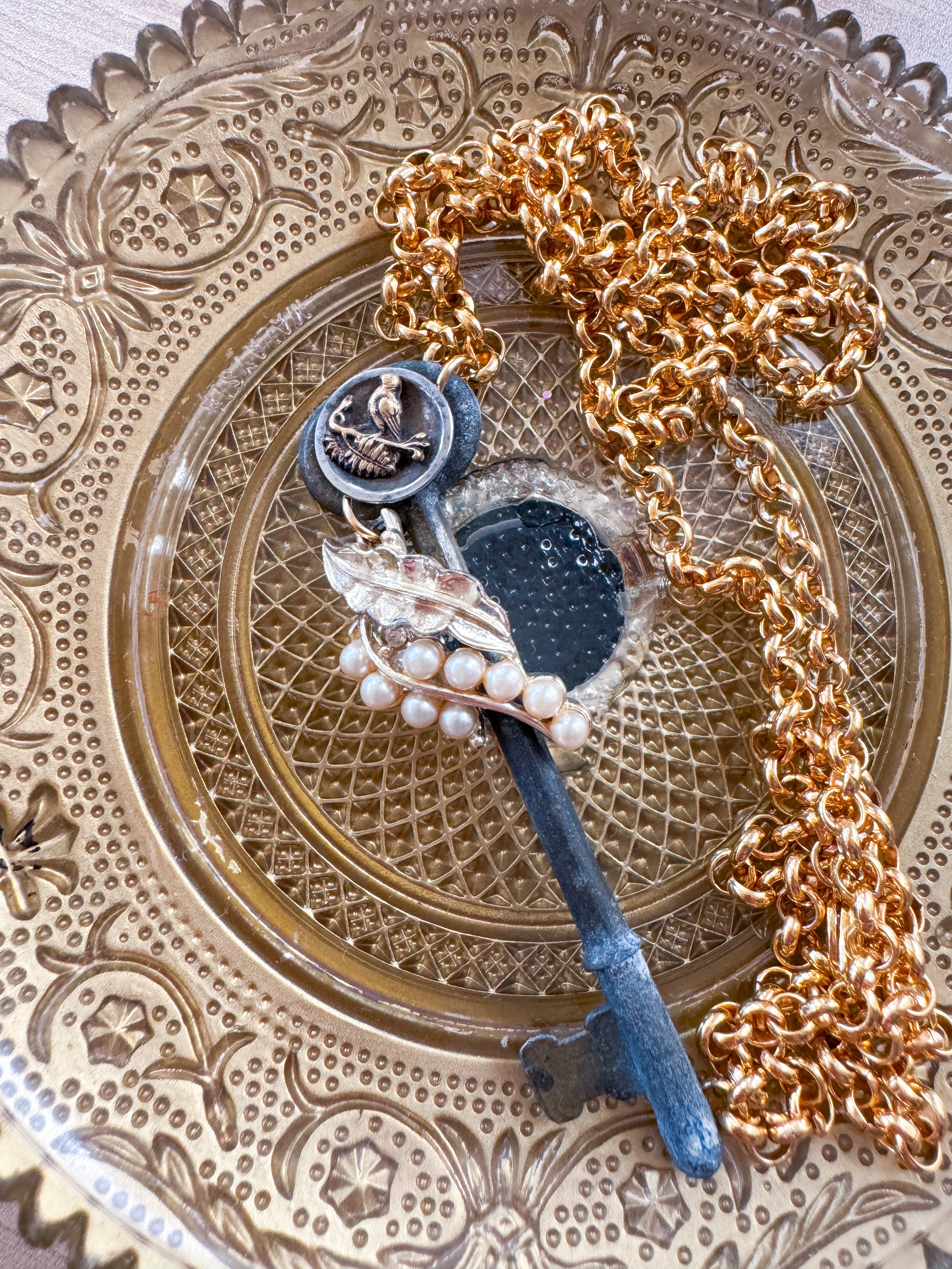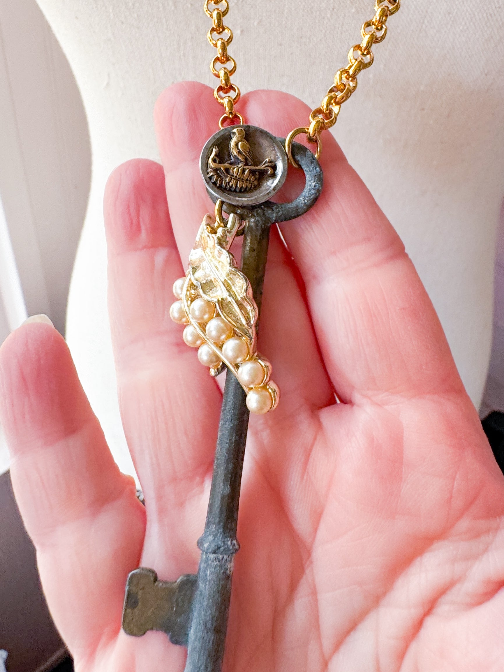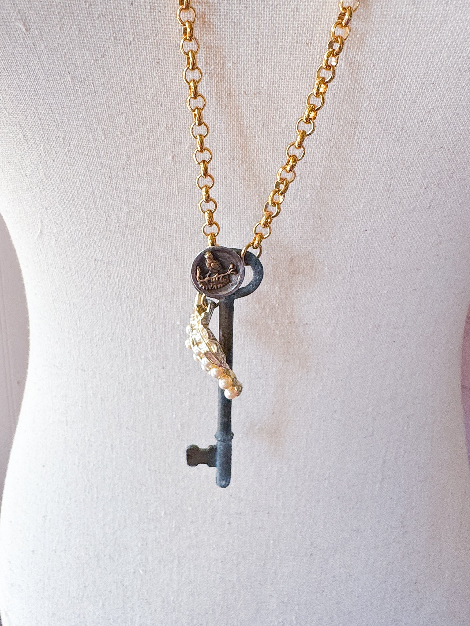 Repurposed vintage ingredients : vintage skeleton key, mid 1900’s costume pearl necklace link, antique Songbird button and 22kt gf dainty rolo chain. Key dangles 3.5”s and end to end the necklace is 32”s.
