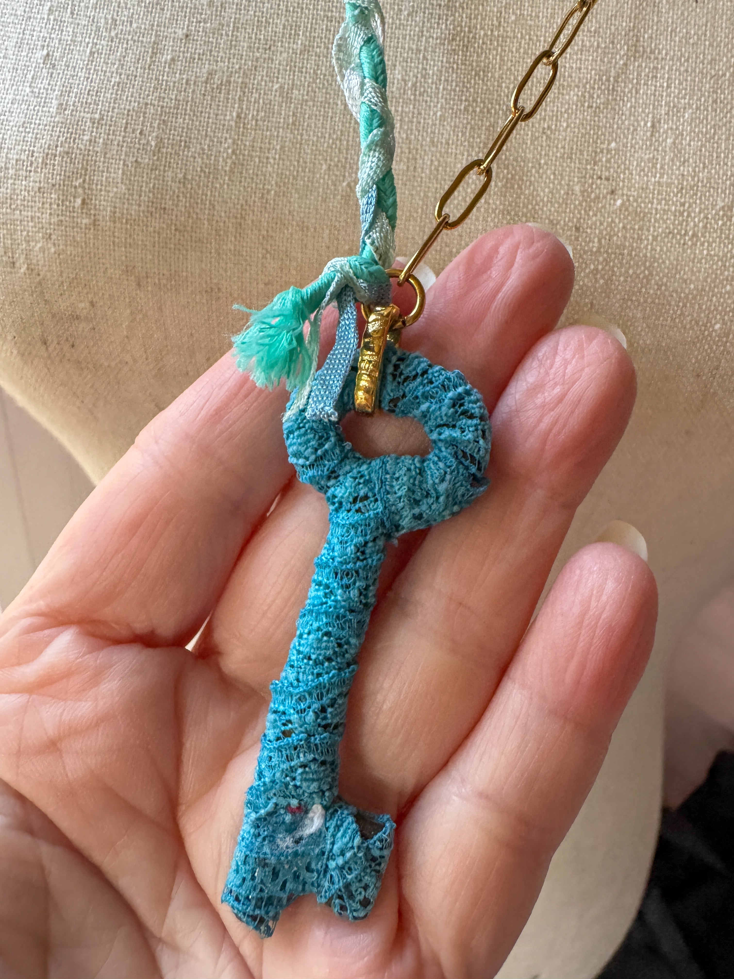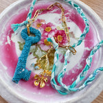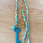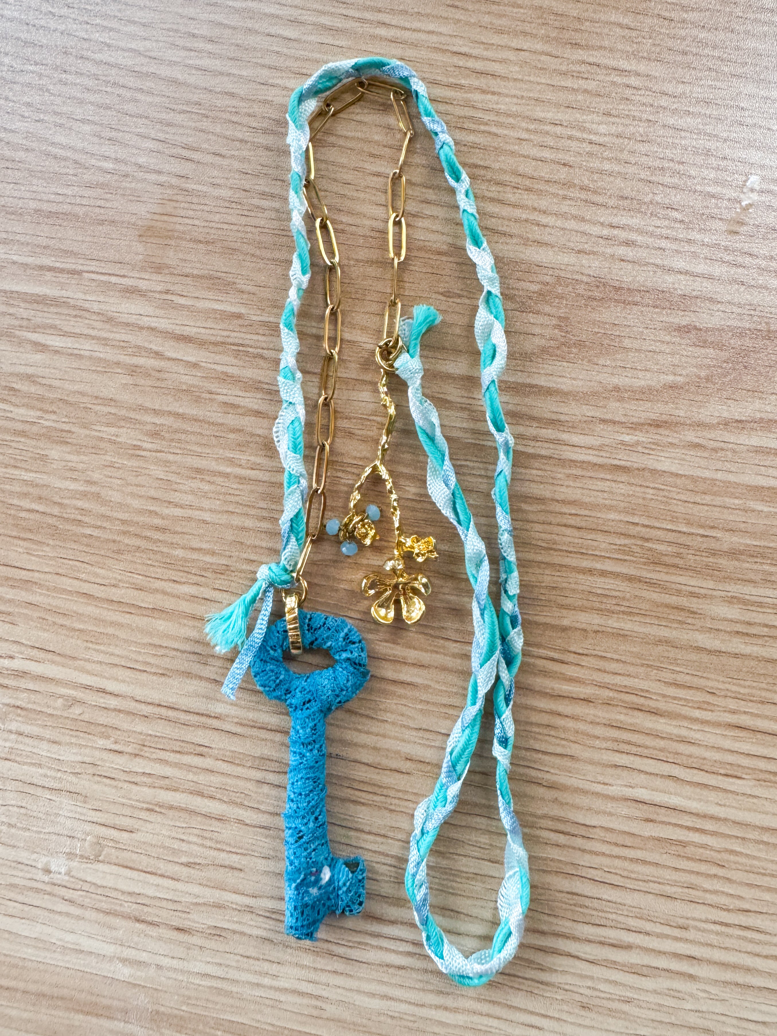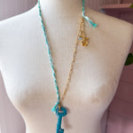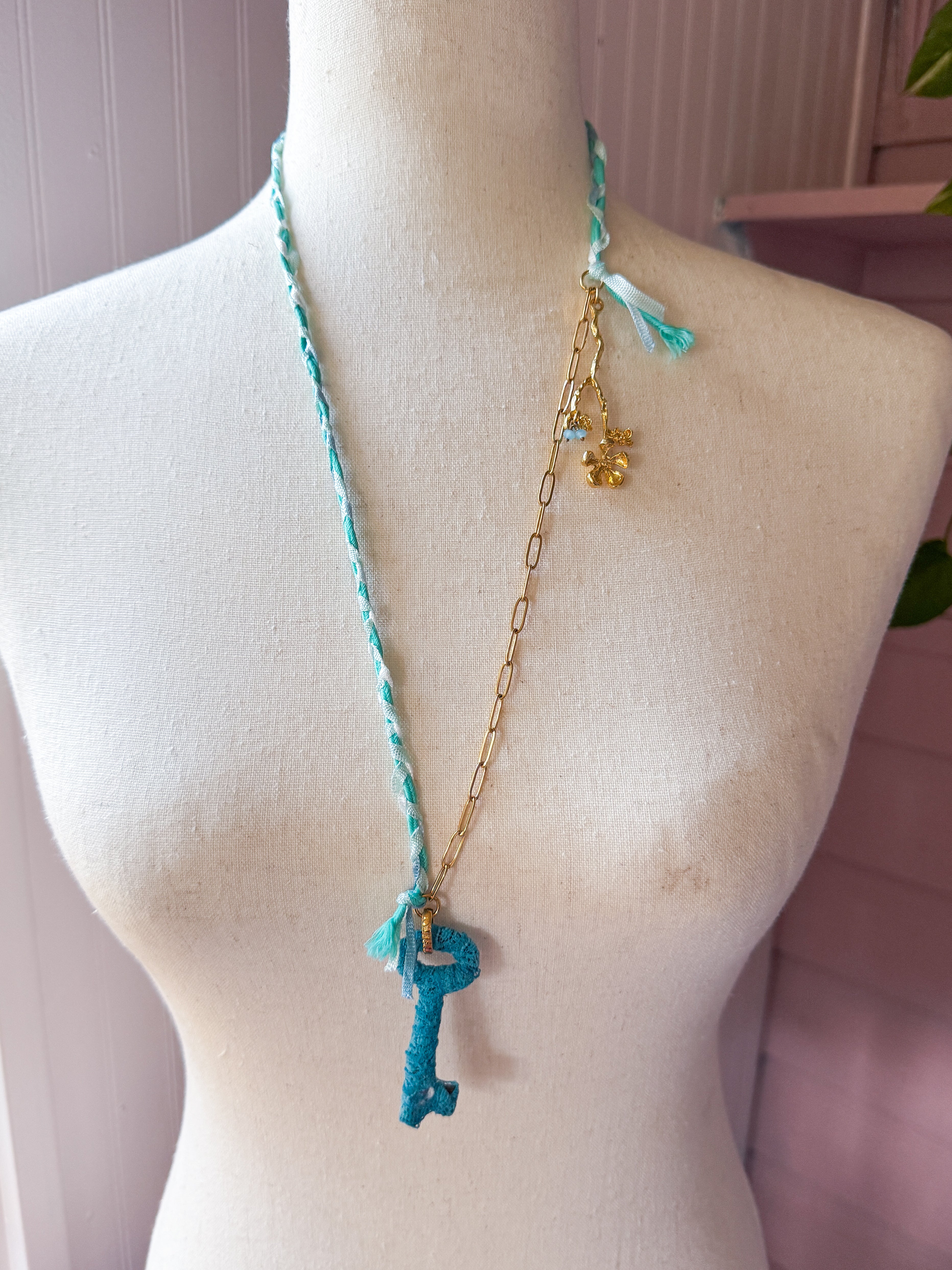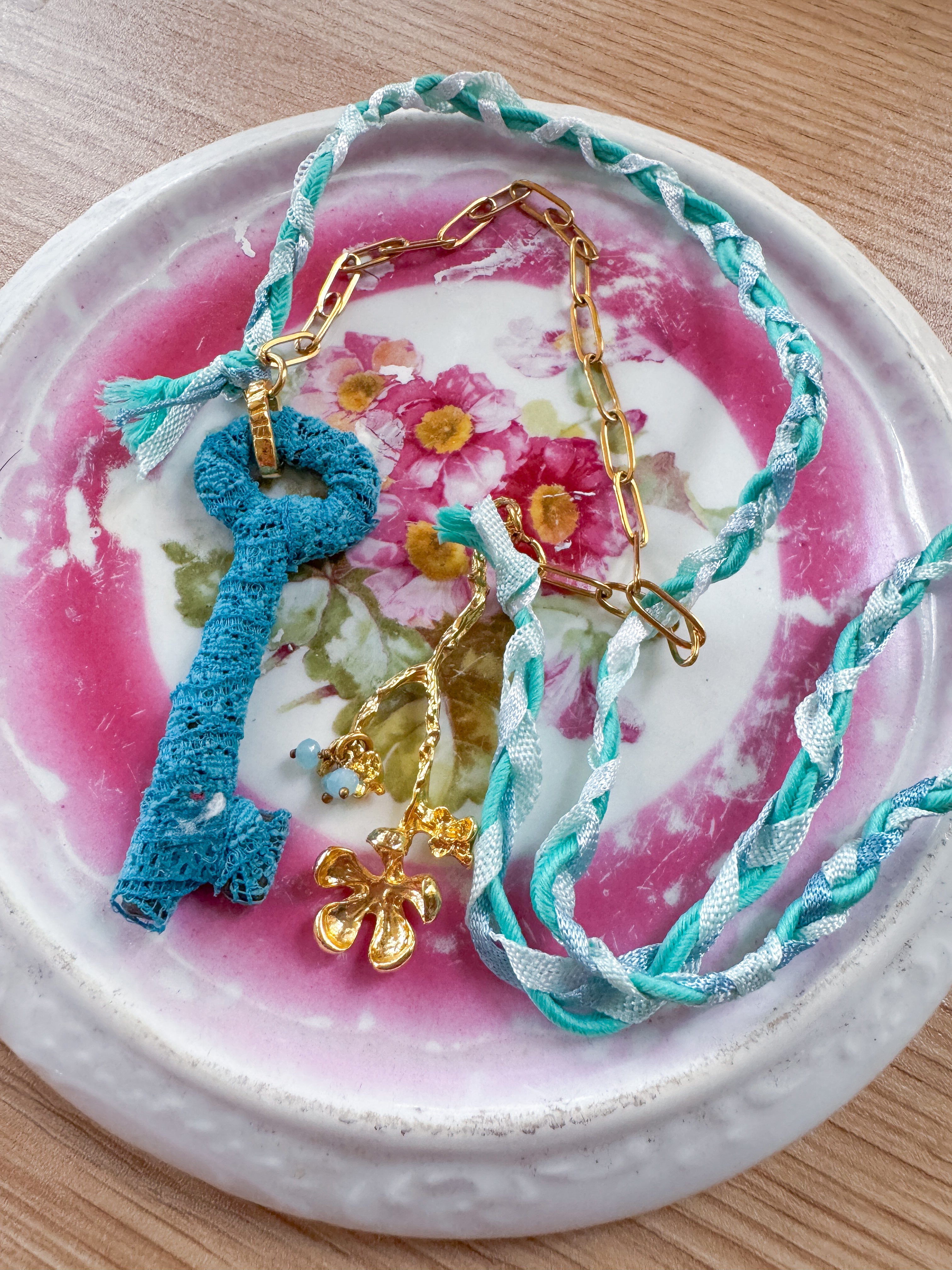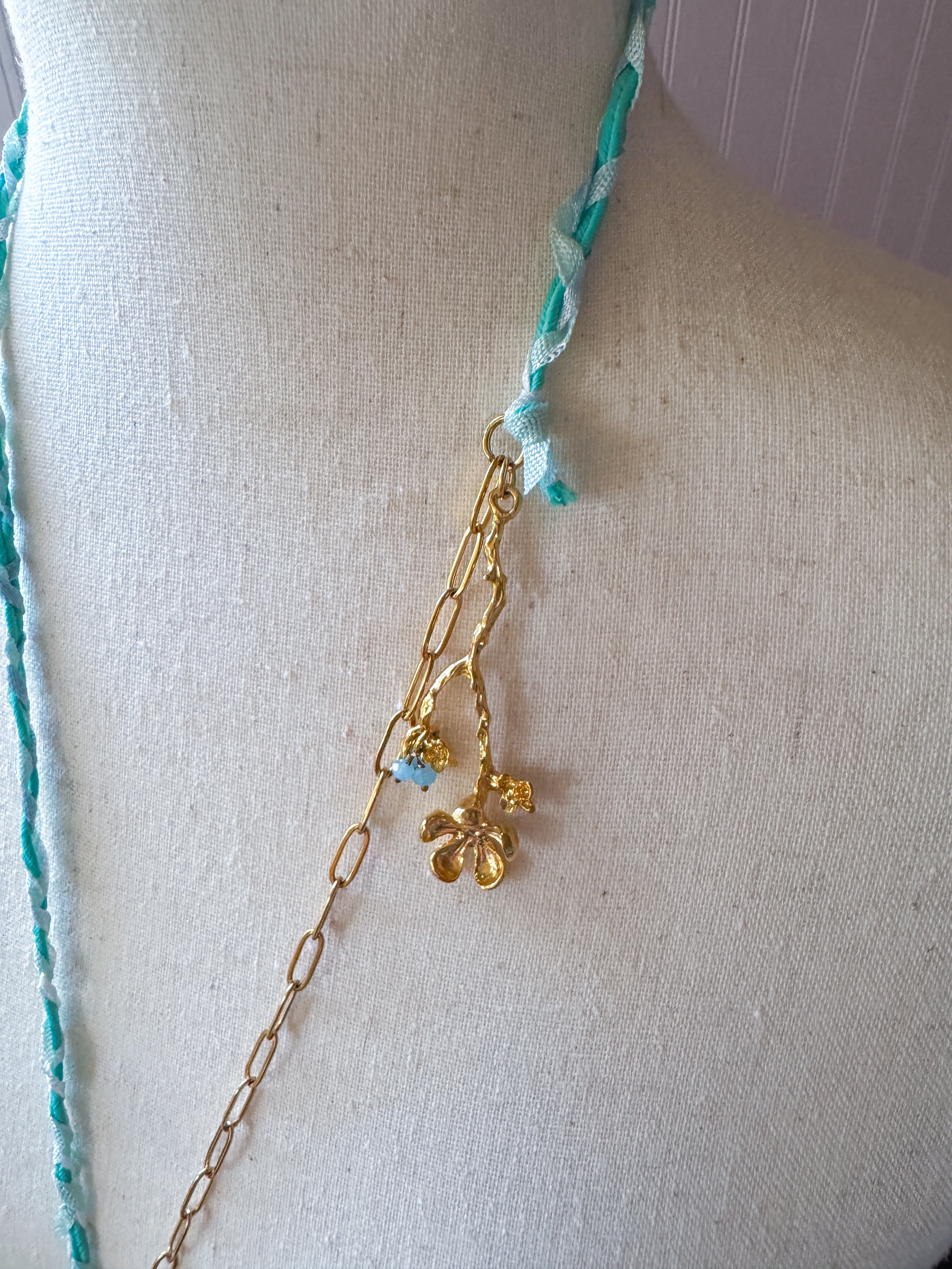 Repurposed vintage ingredients : vintage skeleton key wrapped in lace, gold filled slower stem charm, aquamarine gemstones, braided ribbon cording and 18kt gf paperclip chain. Key dangles 2.5”s and end to end the necklace is 26”s.