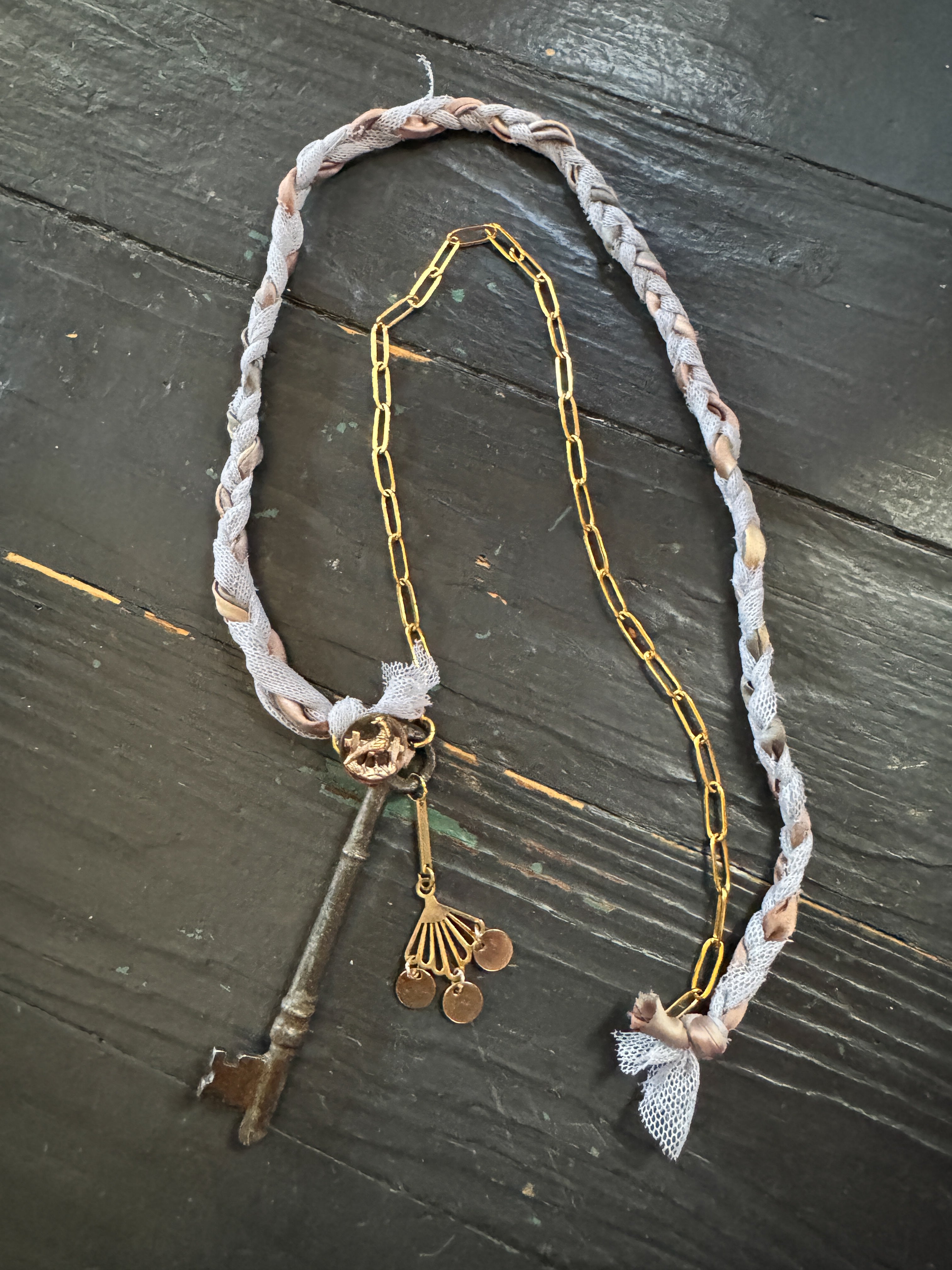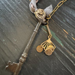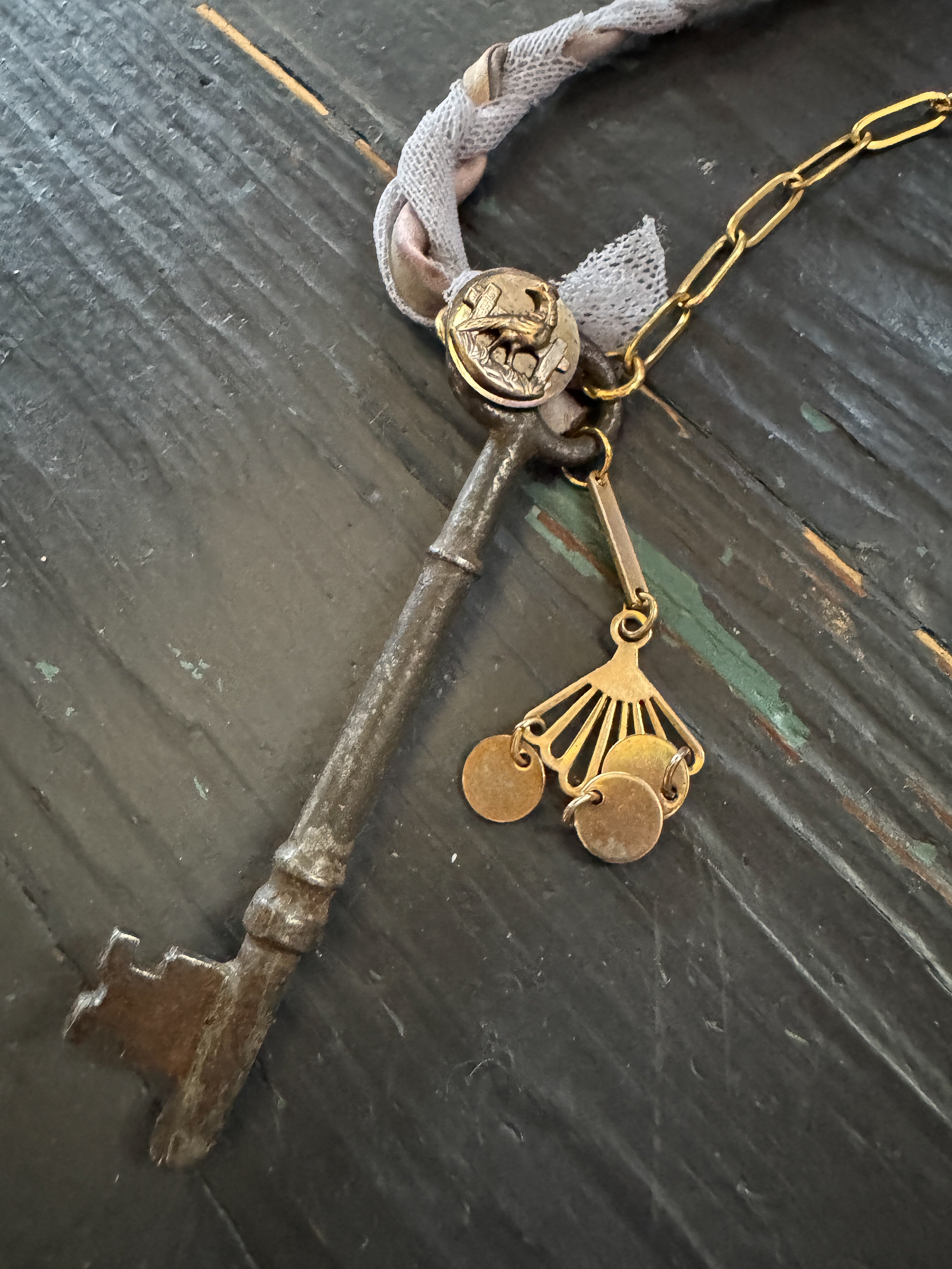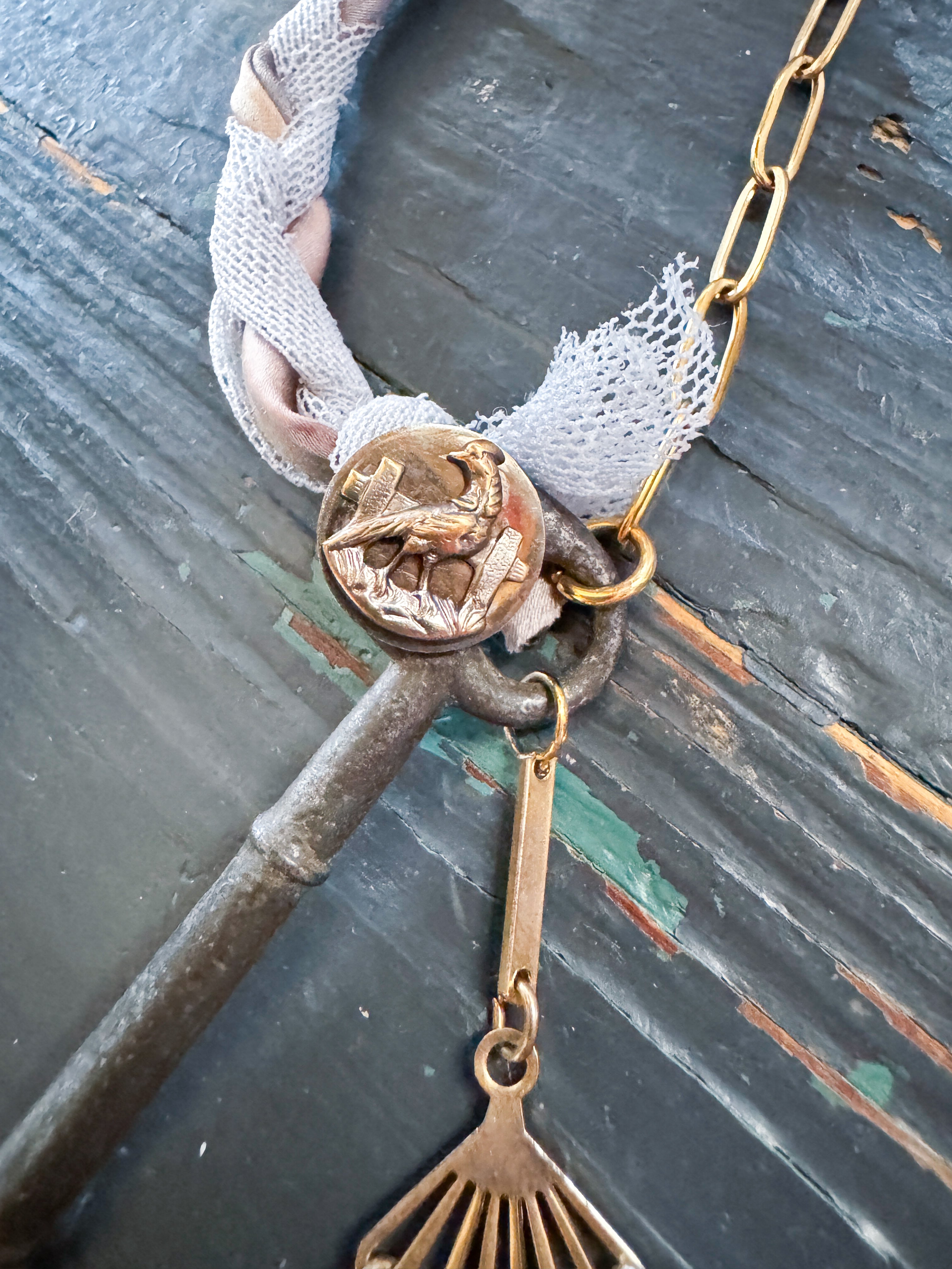 Repurposed vintage ingredients : vintage skeleton key, mid 1900’s brass charm, antique rooster bird button, braided ribbon cording and 18kt gf paperclip chain. Key dangles 3.5”s and end to end the necklace is 32”s.