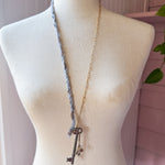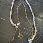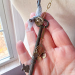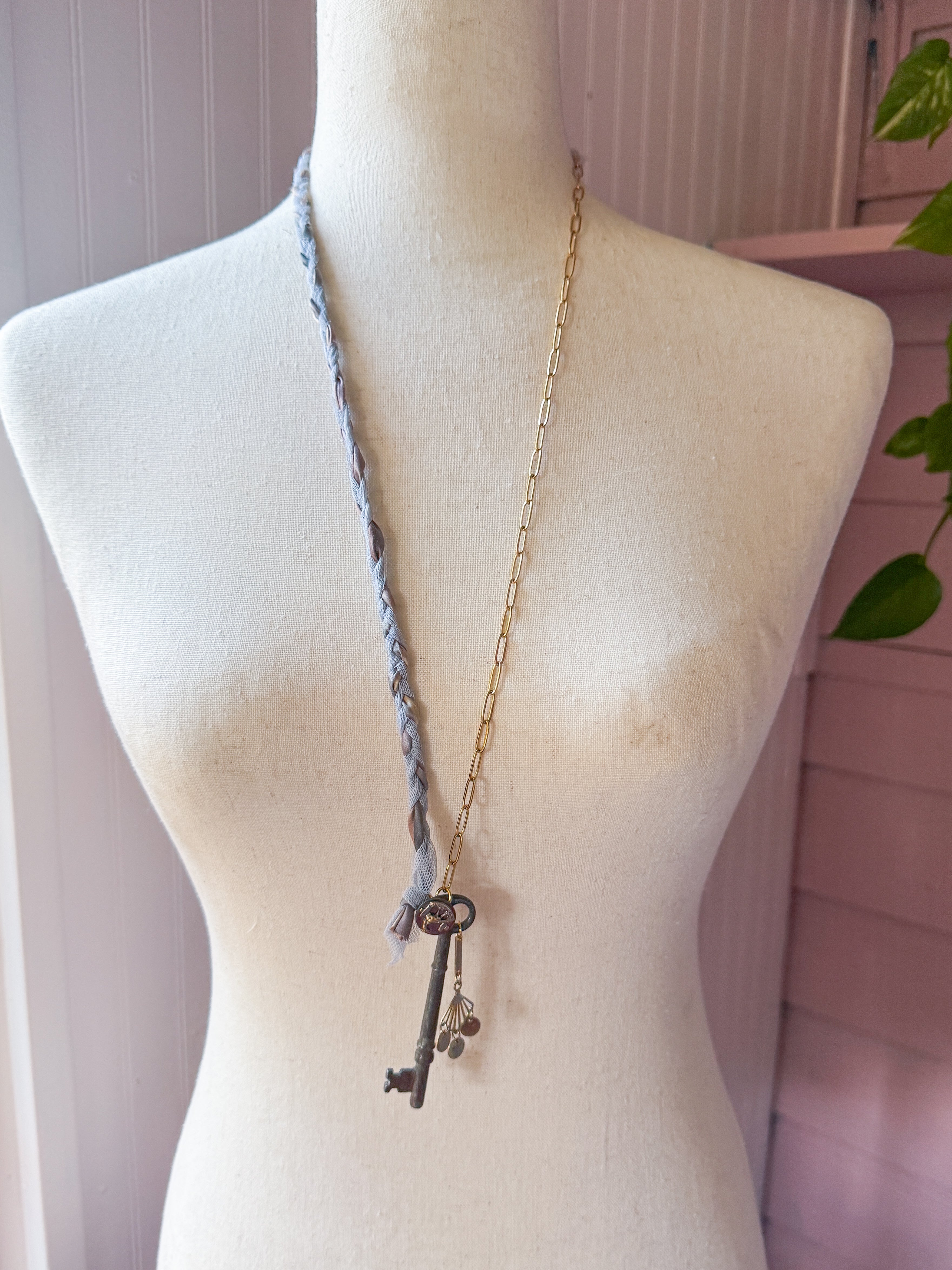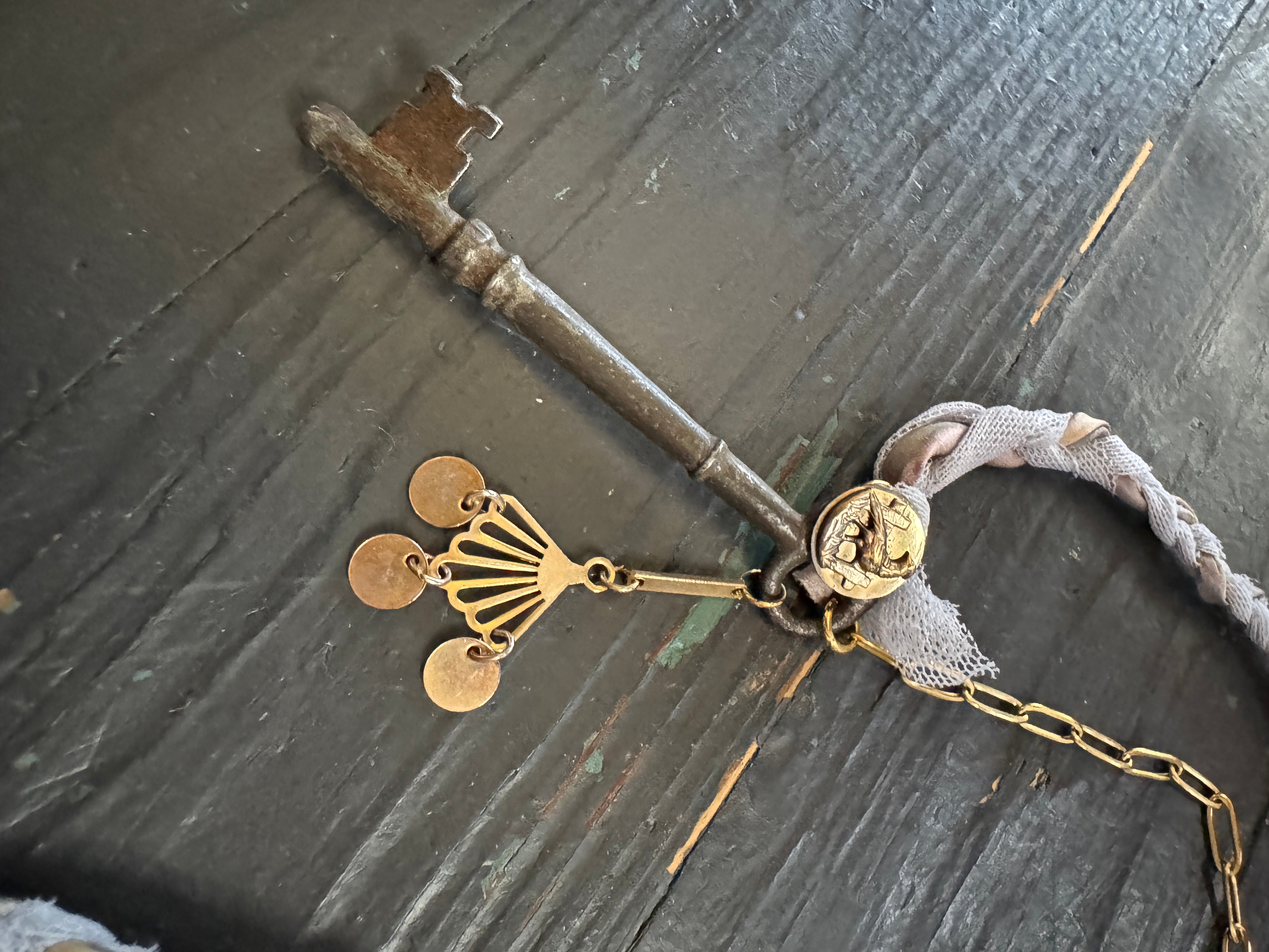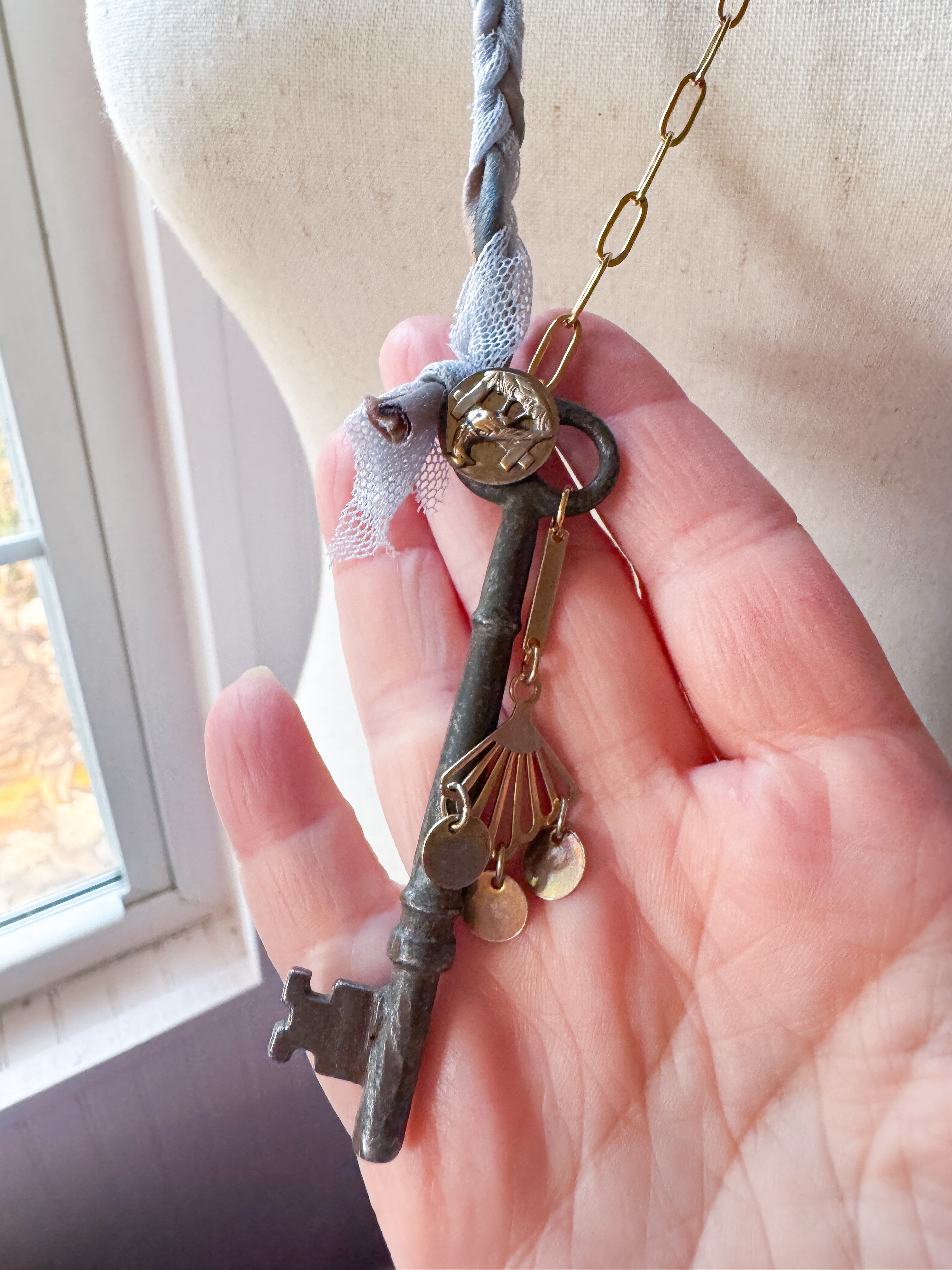 Repurposed vintage ingredients : vintage skeleton key, mid 1900’s brass charm, antique rooster bird button, braided ribbon cording and 18kt gf paperclip chain. Key dangles 3.5”s and end to end the necklace is 32”s.