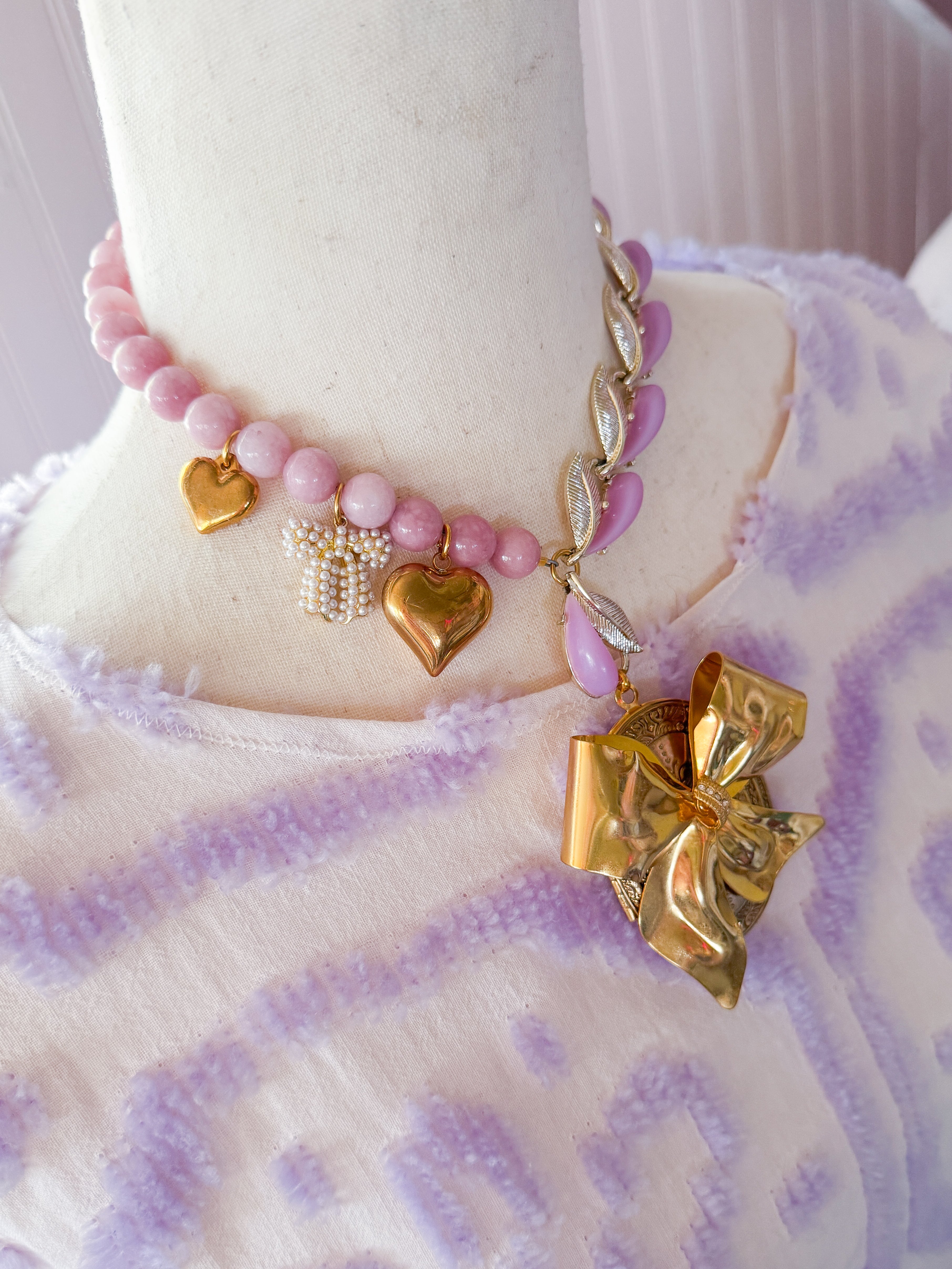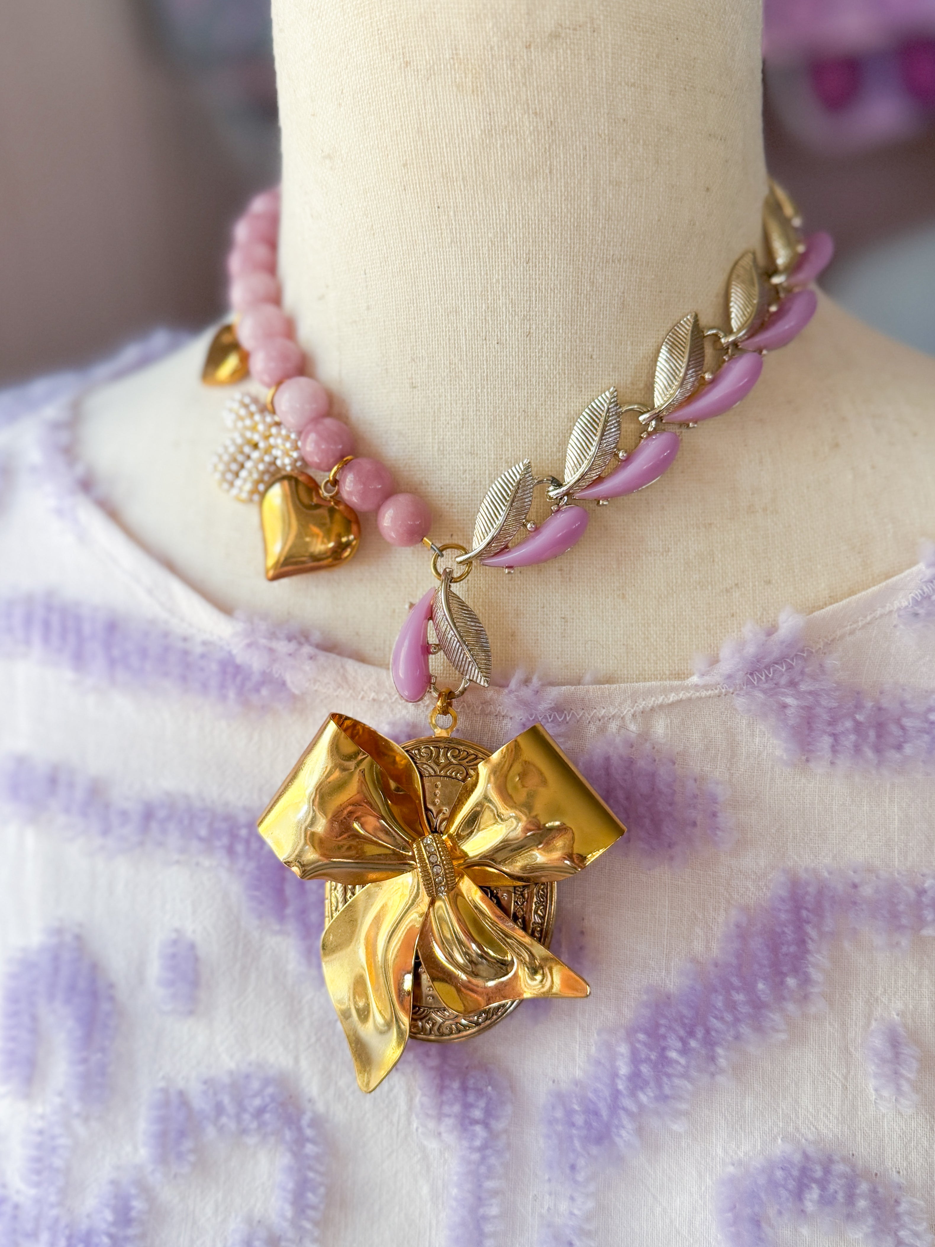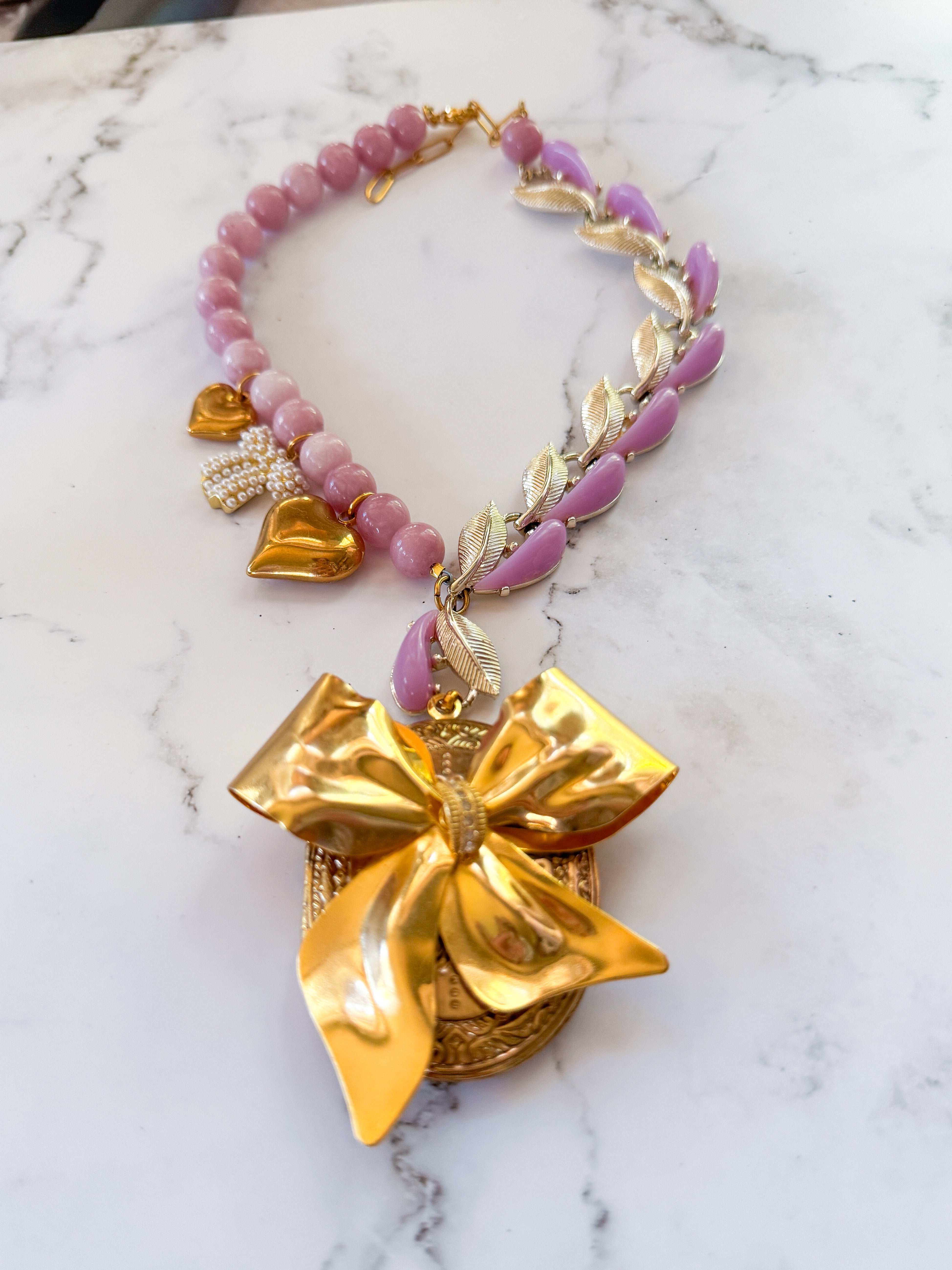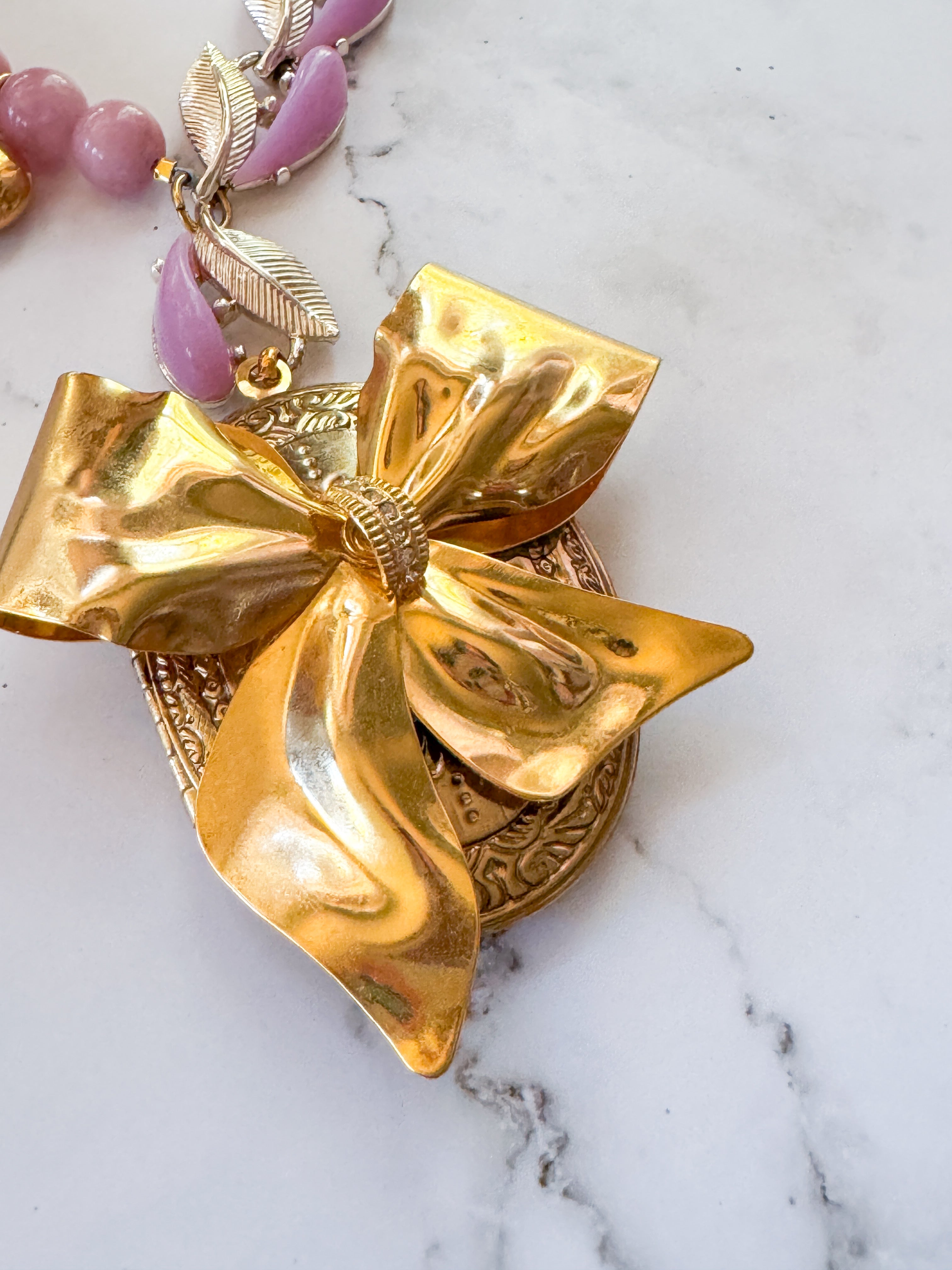 Repurposed vintage ingredients : pendant created from a vintagegold bow brooch. The brooch is nestled on a Vintage locket that opens to reveal pressed flowers preserved forever. Juicy rose quartz gemstones, 1940’s thermoset petal necklace links, 18kt gf heart charms and a costume pearl bow charm finish her off. Necklace is 17”s.