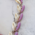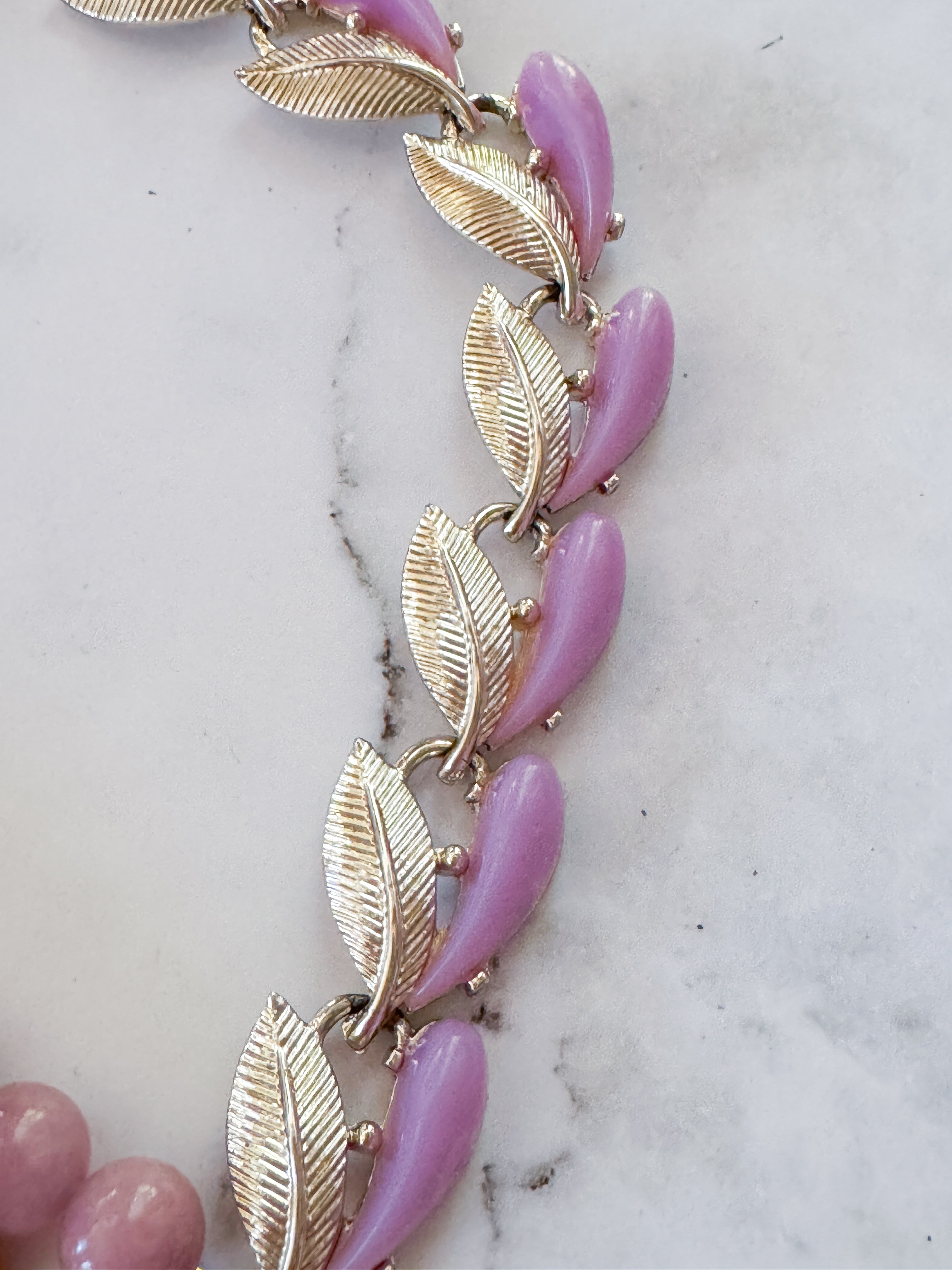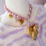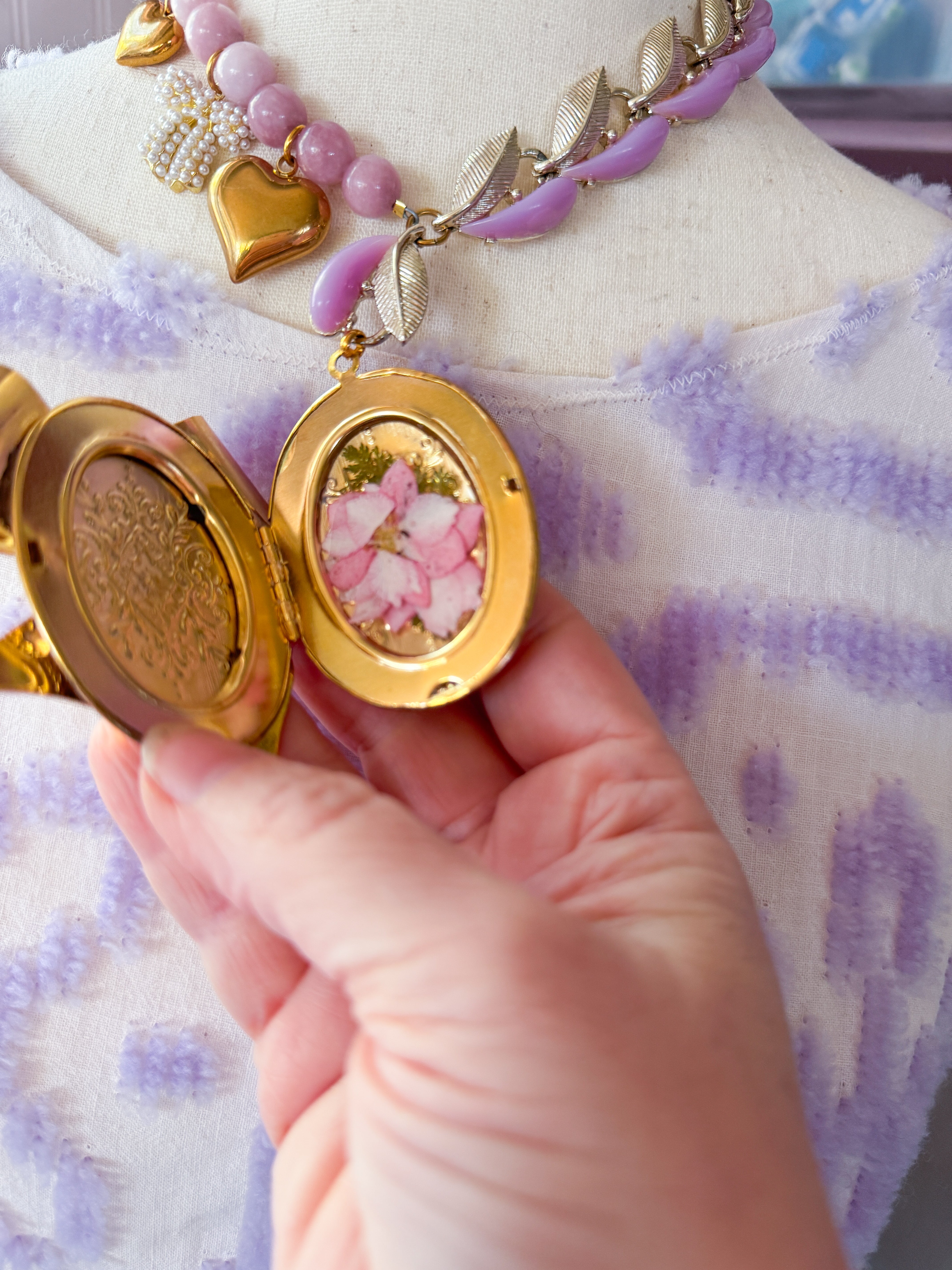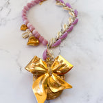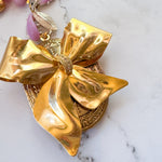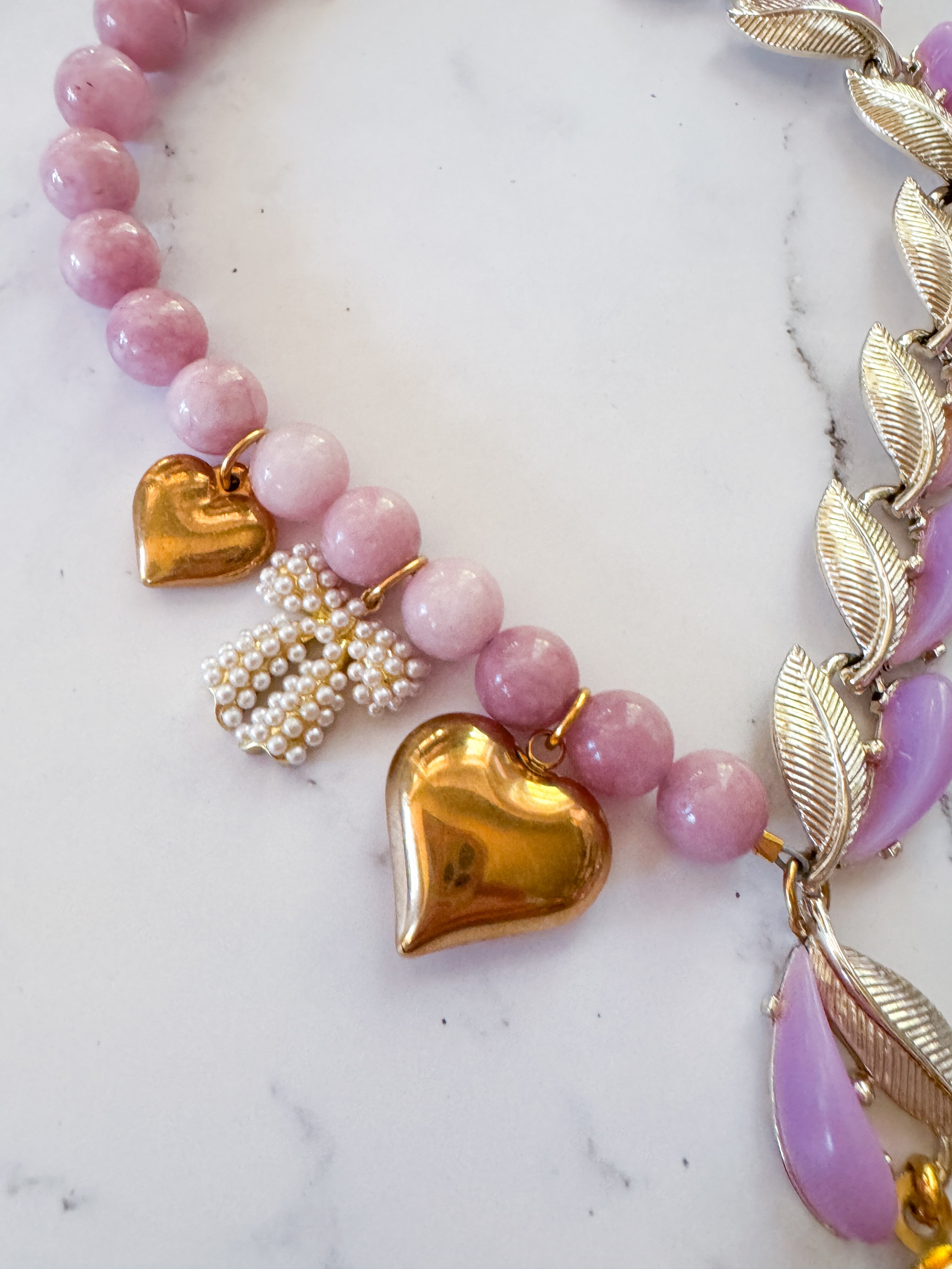 Repurposed vintage ingredients : pendant created from a vintagegold bow brooch. The brooch is nestled on a Vintage locket that opens to reveal pressed flowers preserved forever. Juicy rose quartz gemstones, 1940’s thermoset petal necklace links, 18kt gf heart charms and a costume pearl bow charm finish her off. Necklace is 17”s.