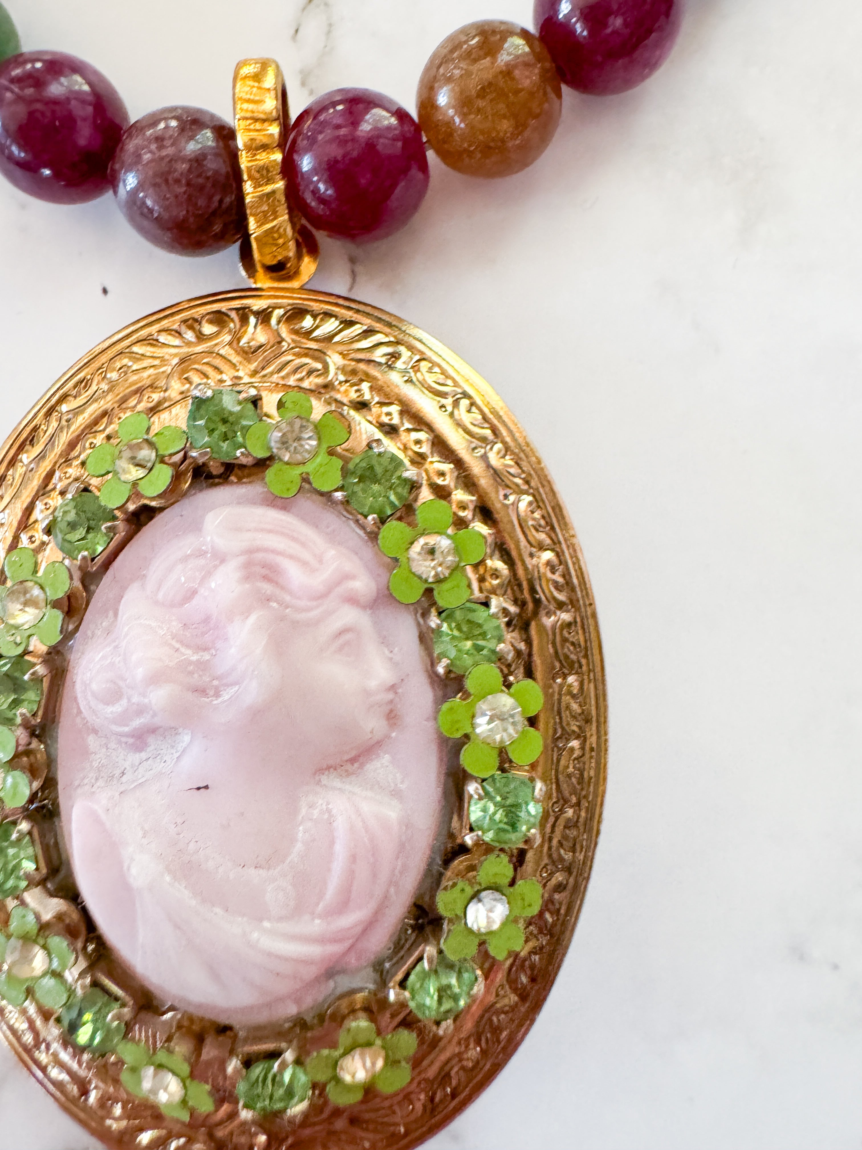 Repurposed vintage ingredients : pendant created from a vintage carved cameo embellished with 1960’s enameled  rhinestone flower chain. She’s nestled atop a vintage gold tone locket with pressed flowers preservers forever inside. Juicy natural watermelon tourmaline gemstones and 18kt gf paperclip cabin finish her off. Necklace measures 17”s.
