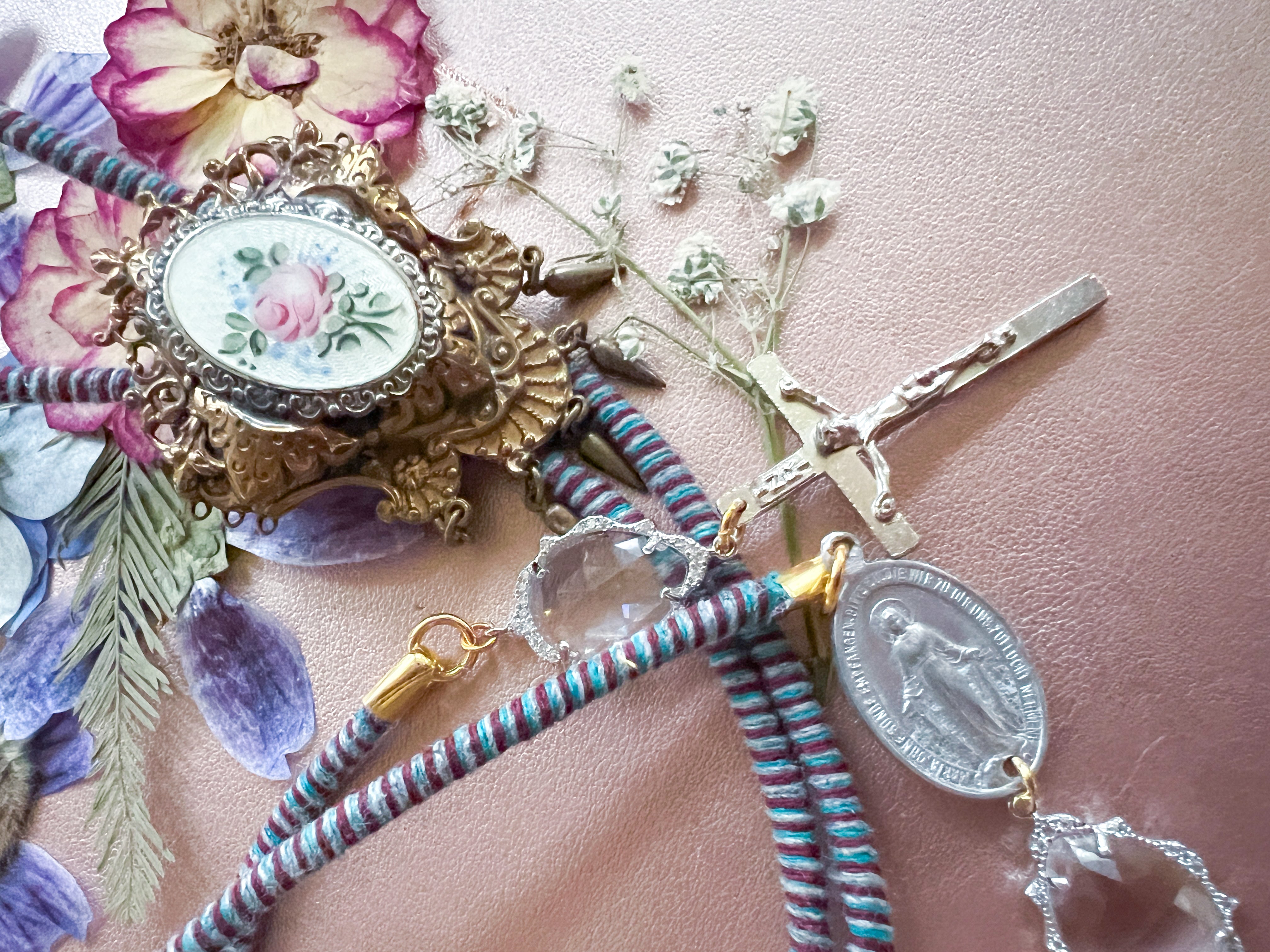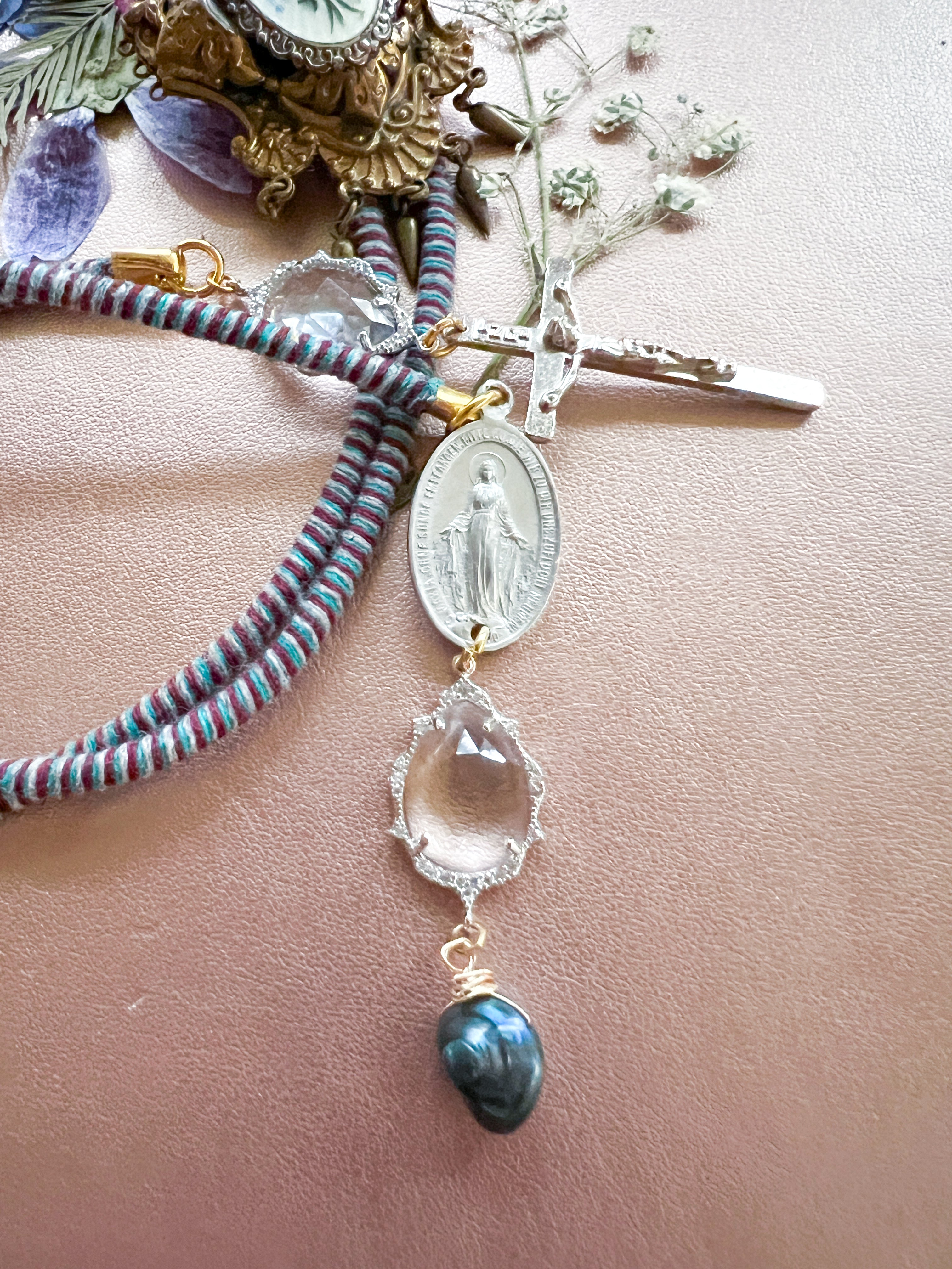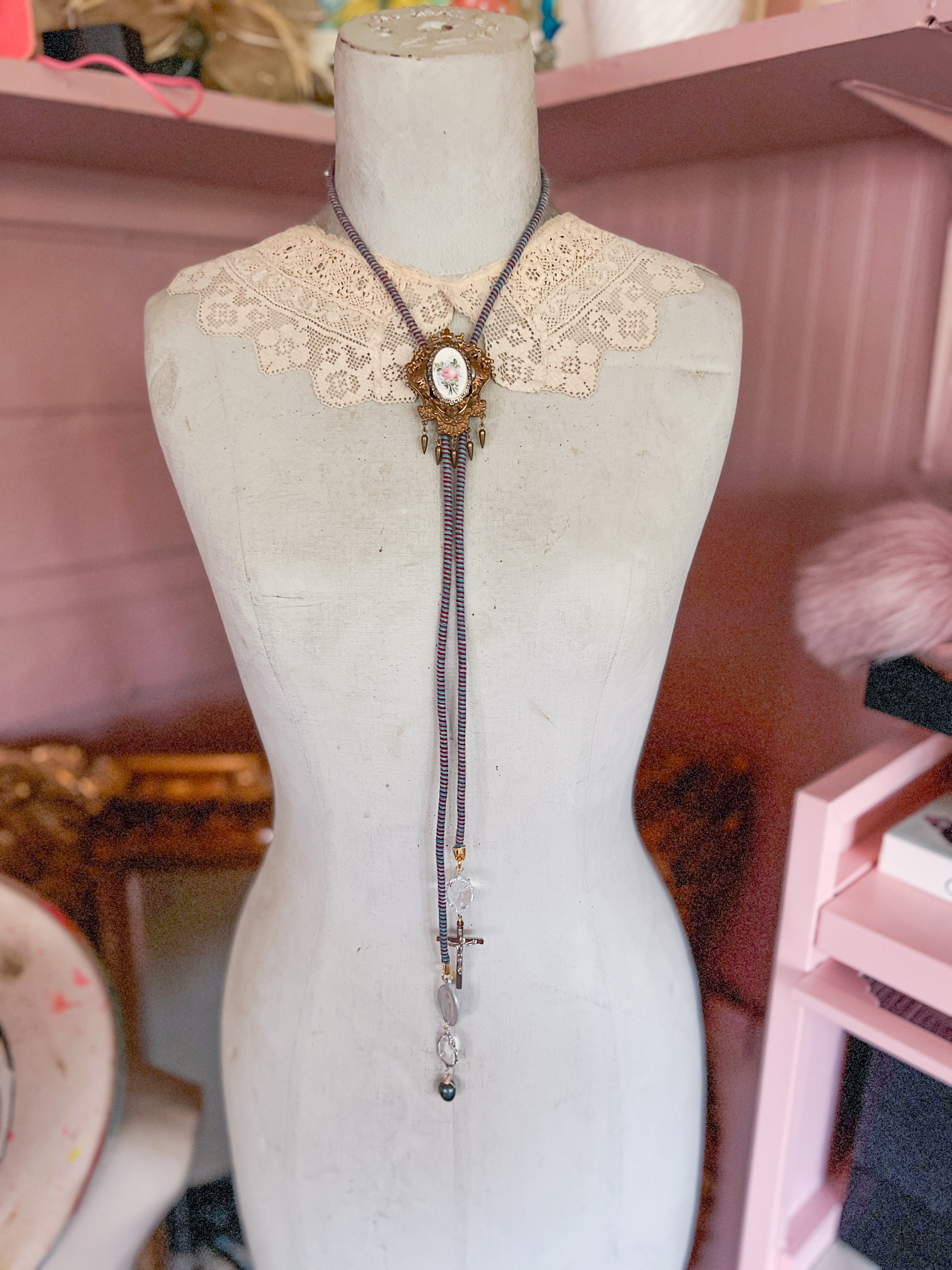 Vintage ingredients: antique a Victorian repoussé necklace pendant repurposed as the focal point for a bolo tie/slide lariat necklace. Paired with the pendant are matching crystal charms, a catholic cross, religious relic and pearl. Necklace is thee softest cotton cording and measures 40”s end to end. Easily adjustable to style as you like!