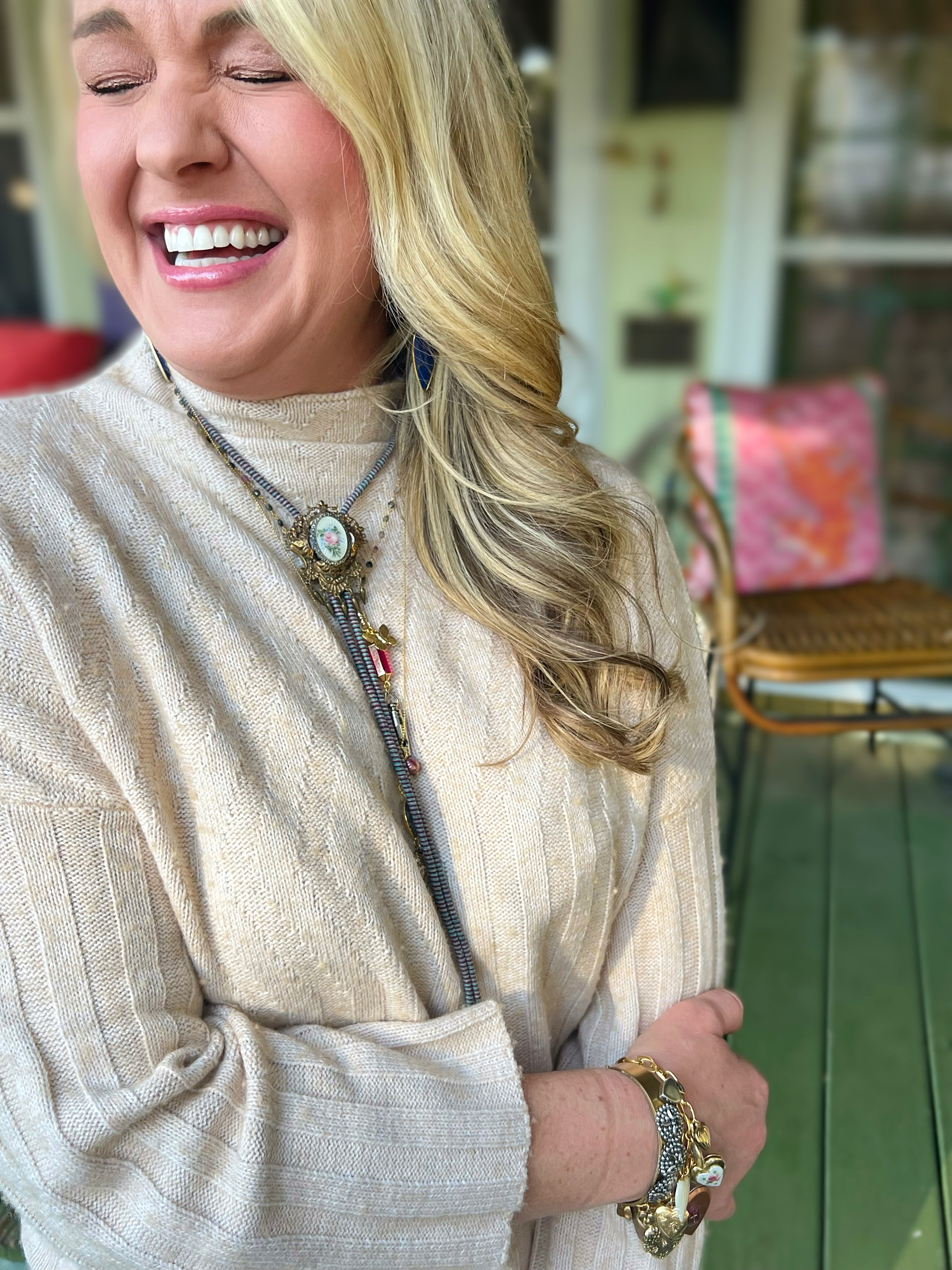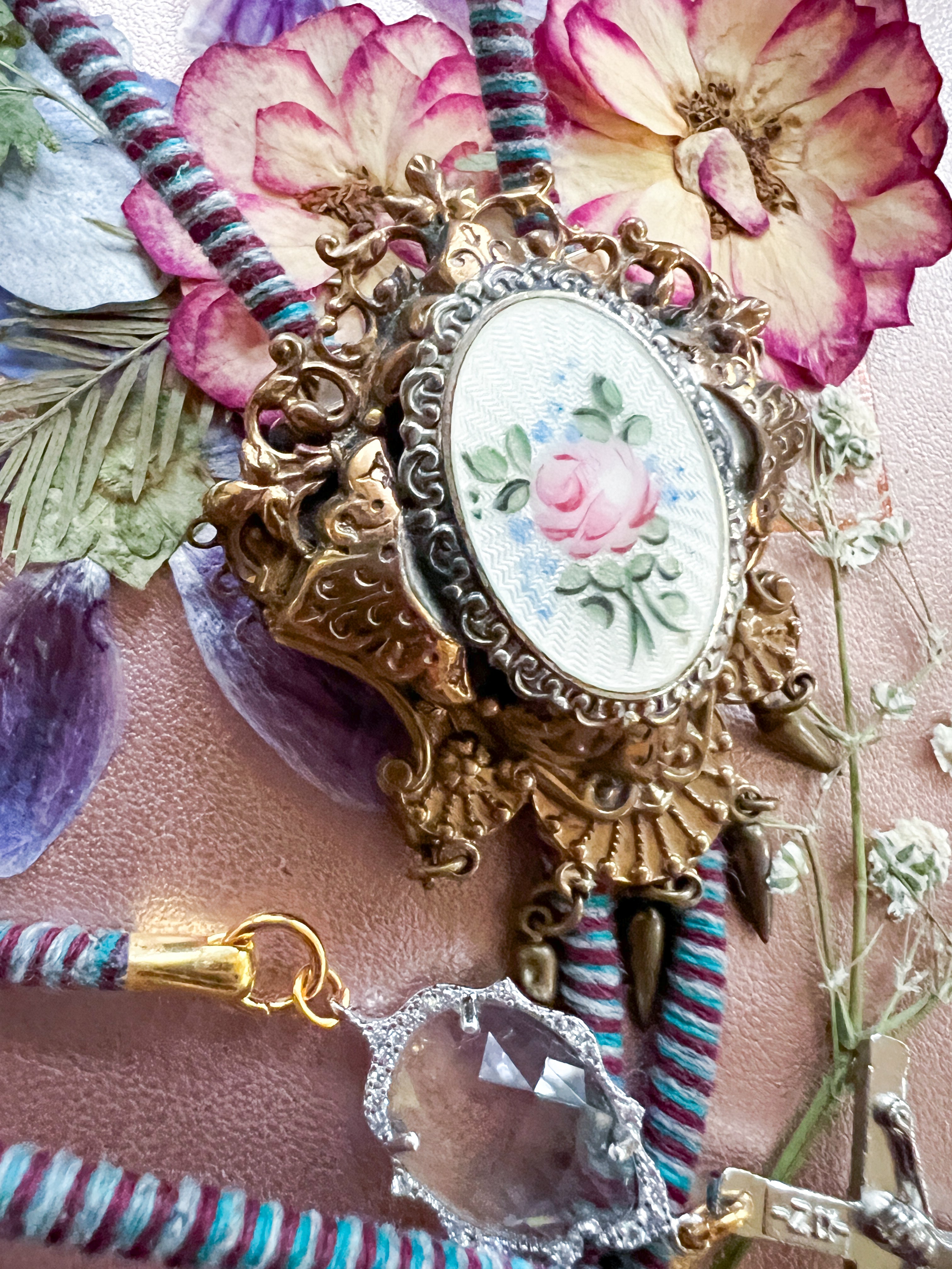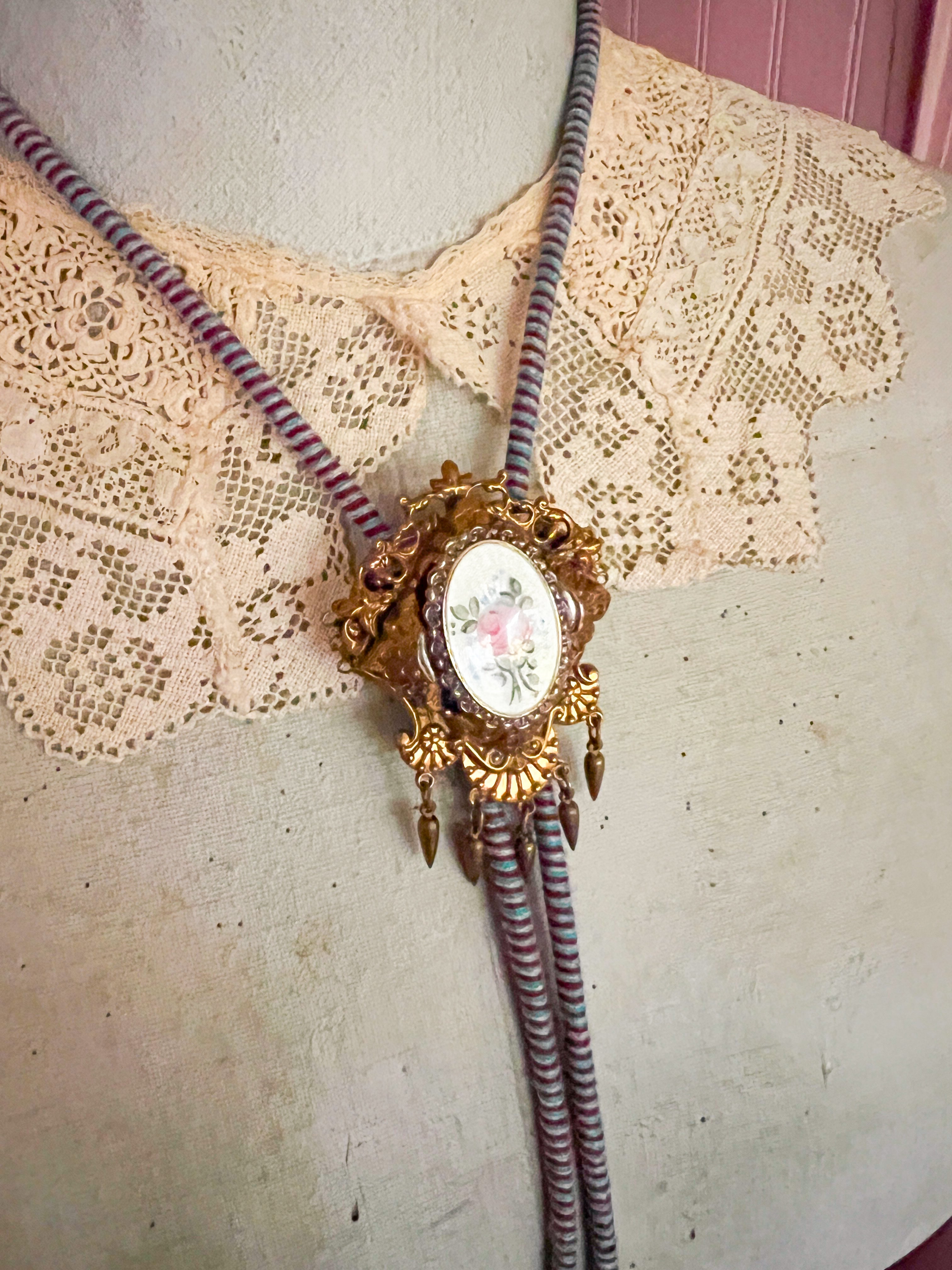 Vintage ingredients: antique a Victorian repoussé necklace pendant repurposed as the focal point for a bolo tie/slide lariat necklace. Paired with the pendant are matching crystal charms, a catholic cross, religious relic and pearl. Necklace is thee softest cotton cording and measures 40”s end to end. Easily adjustable to style as you like!