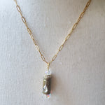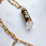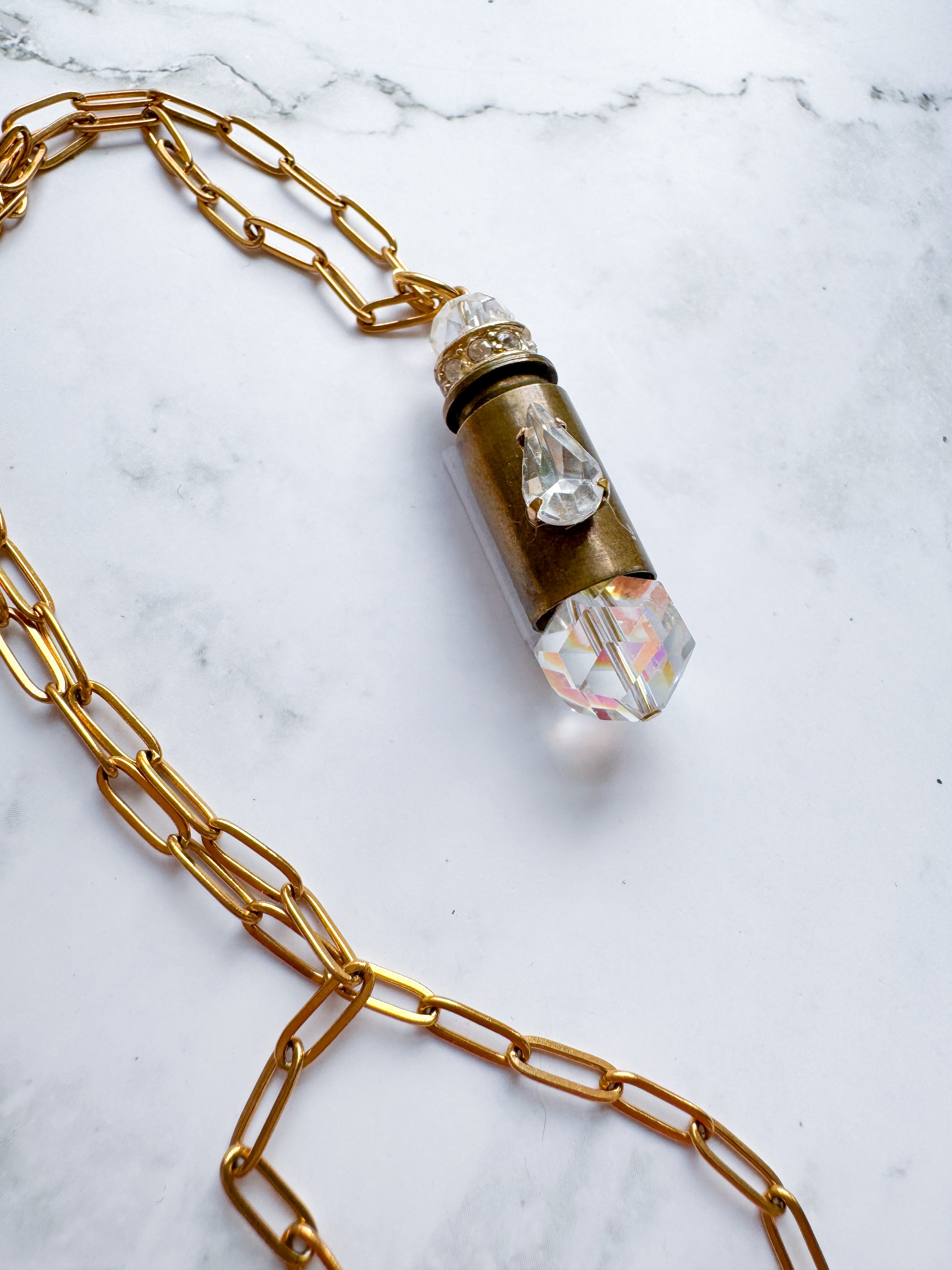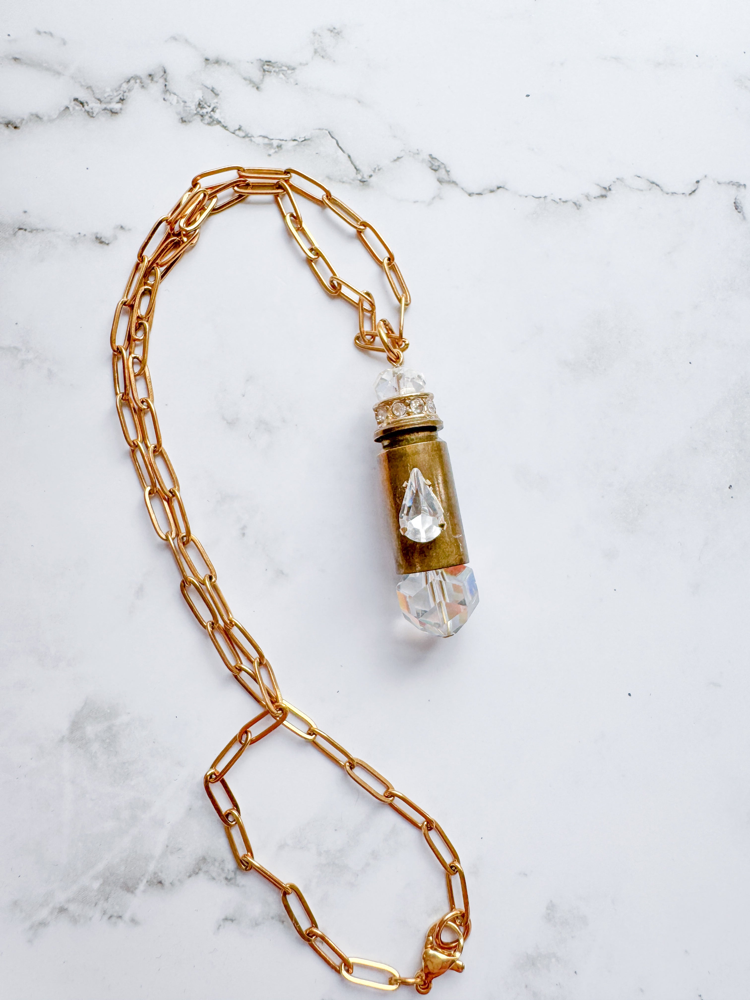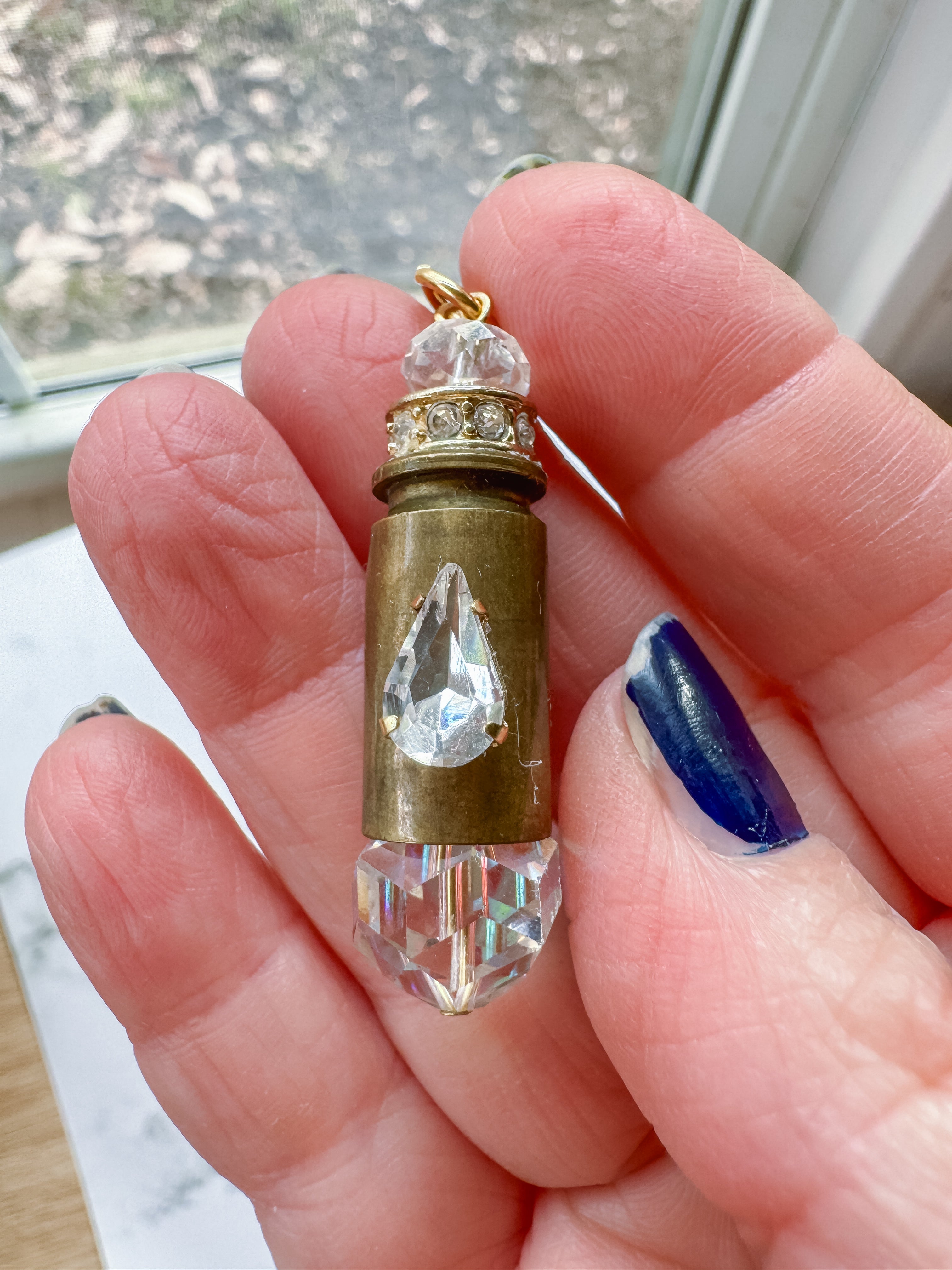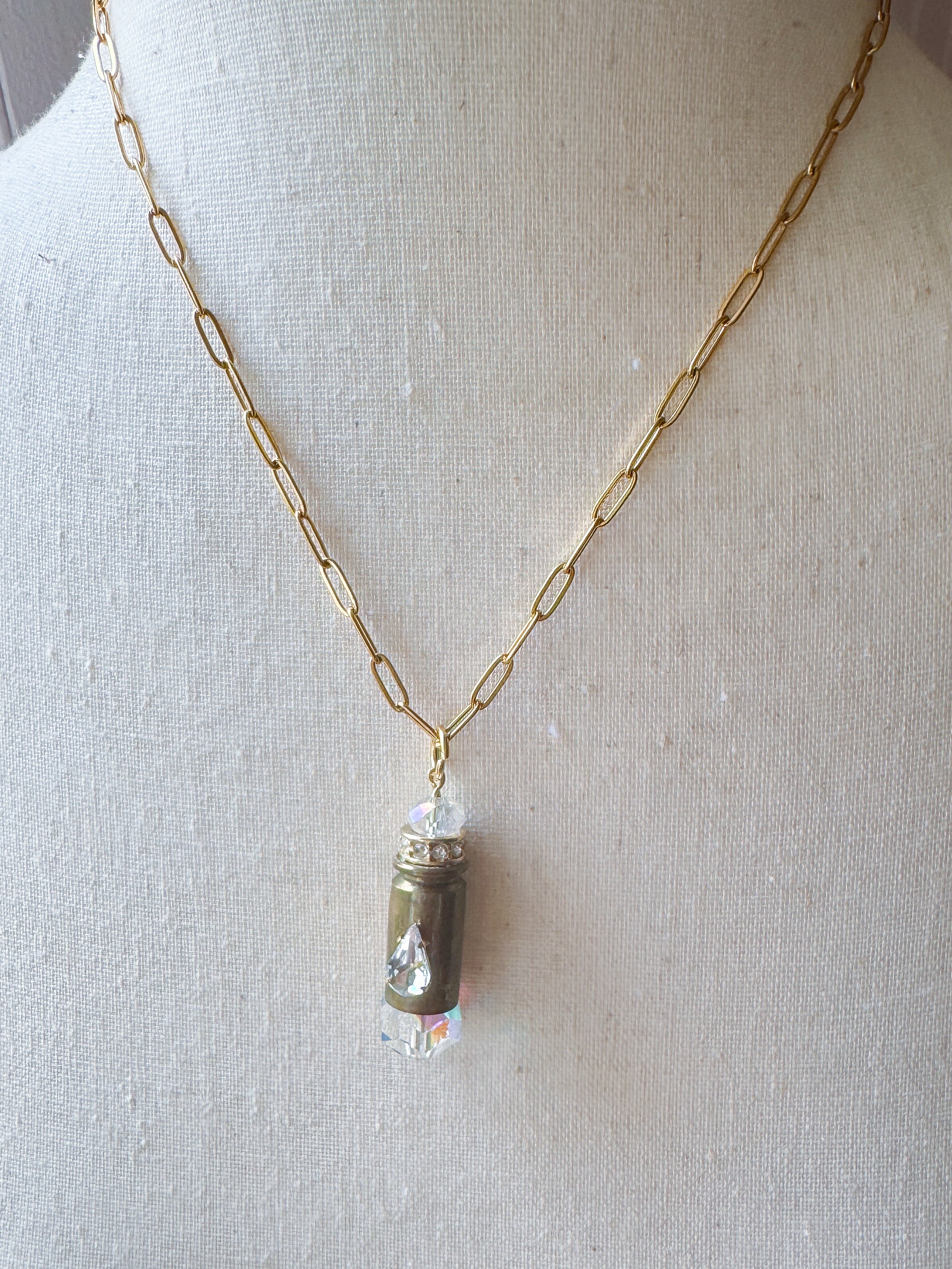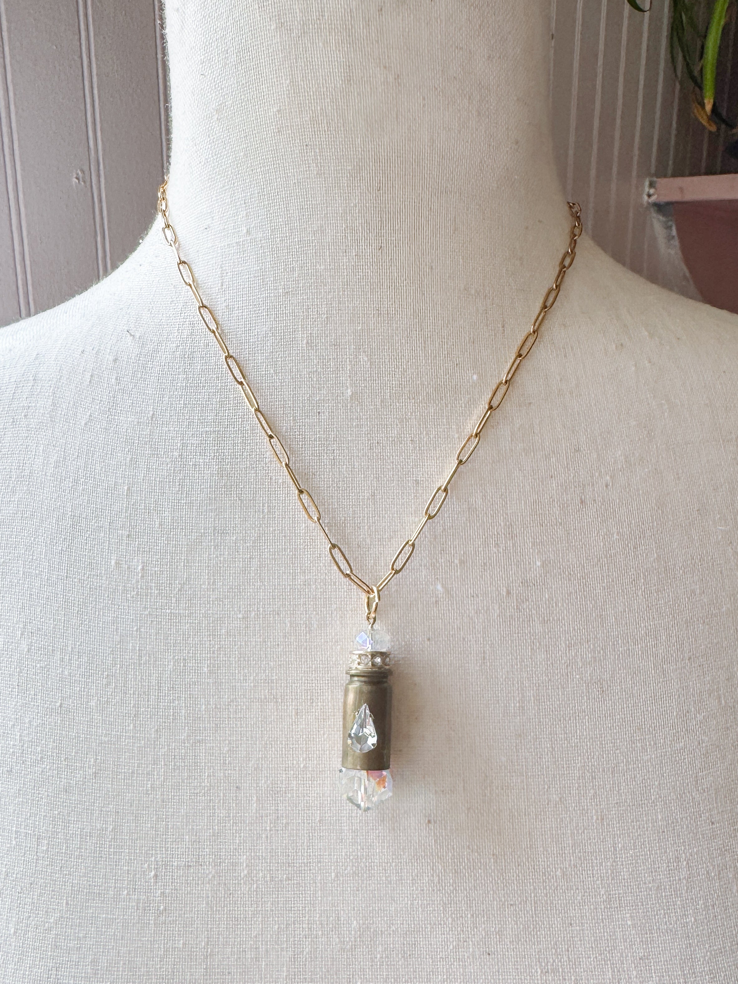 Repurposed Vintage ingredients: spent brass bullet casing embellished with a rhinestone teardrop. A vintage faceted crystal nestles in the end of the bullet and the top. Pendant dangles 1.5” from adjustable 17”s 18kt gf waterproof chain.
