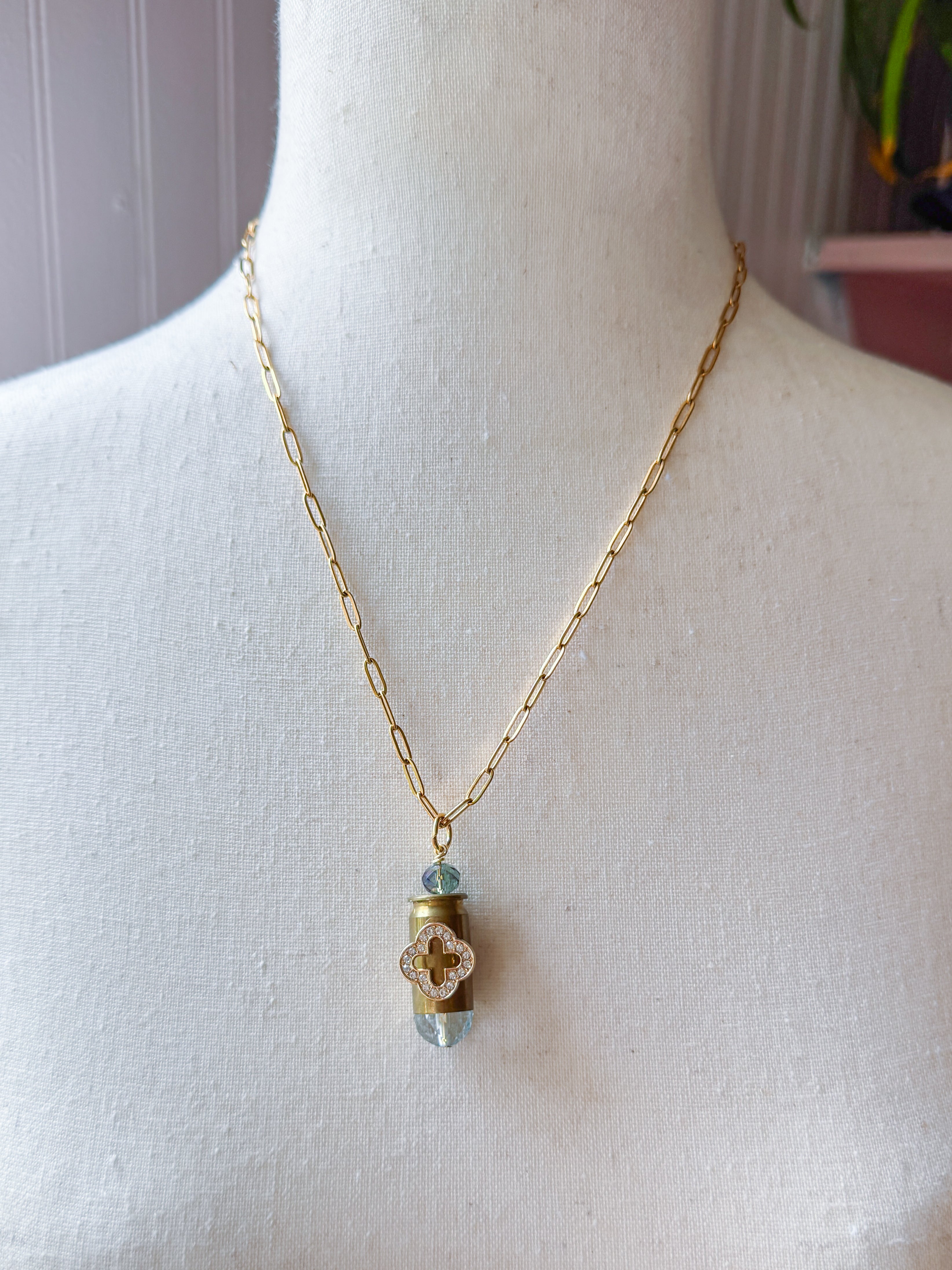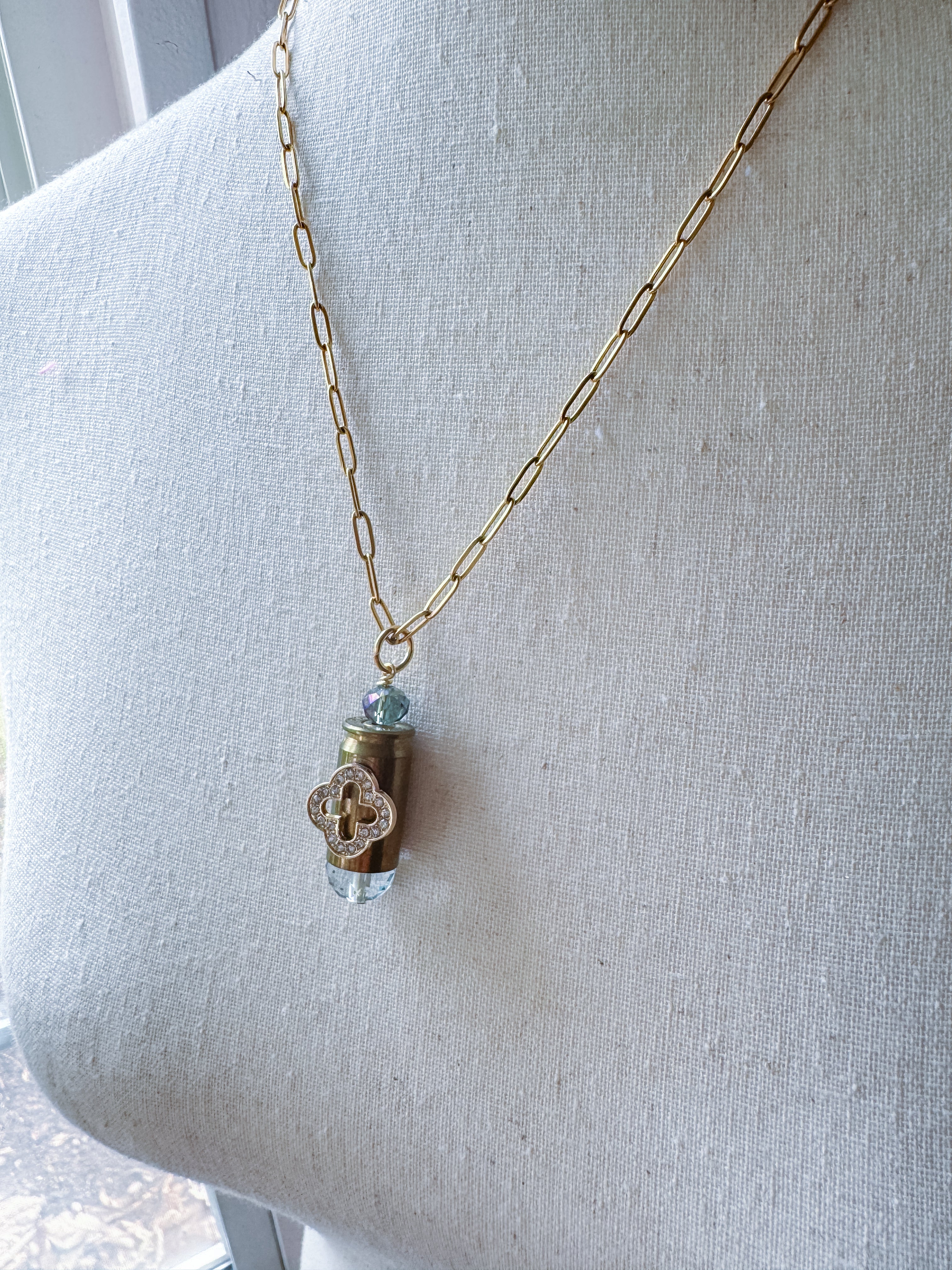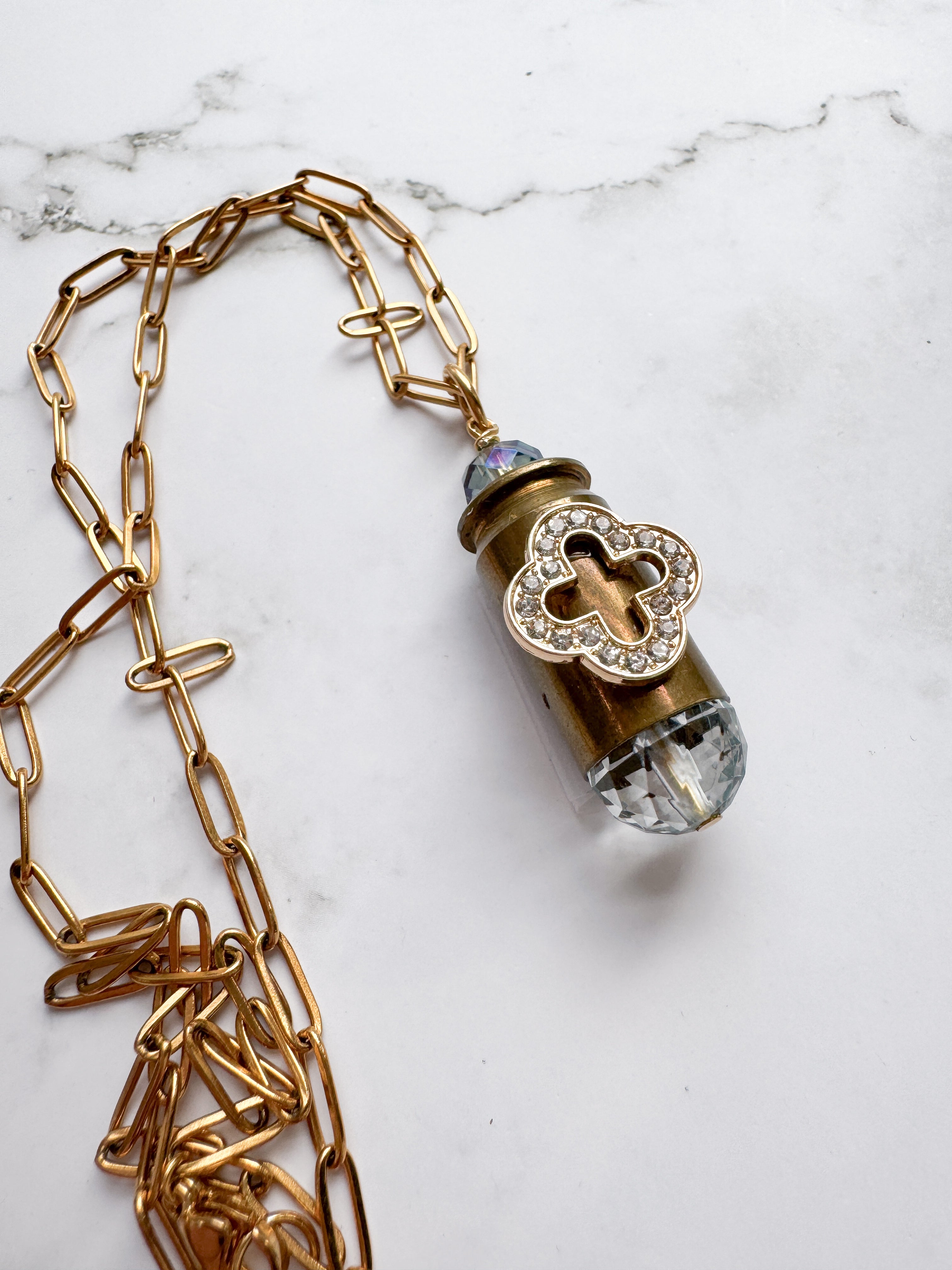 Repurposed Vintage ingredients: spent brass bullet casing embellished with a CZ clover. A vintage faceted crystal nestles in the end of the bullet and the top. Pendant dangles 1.5” from adjustable 19”s 18kt gf waterproof chain.