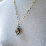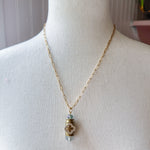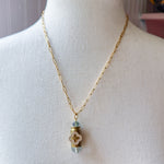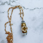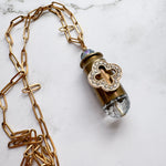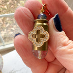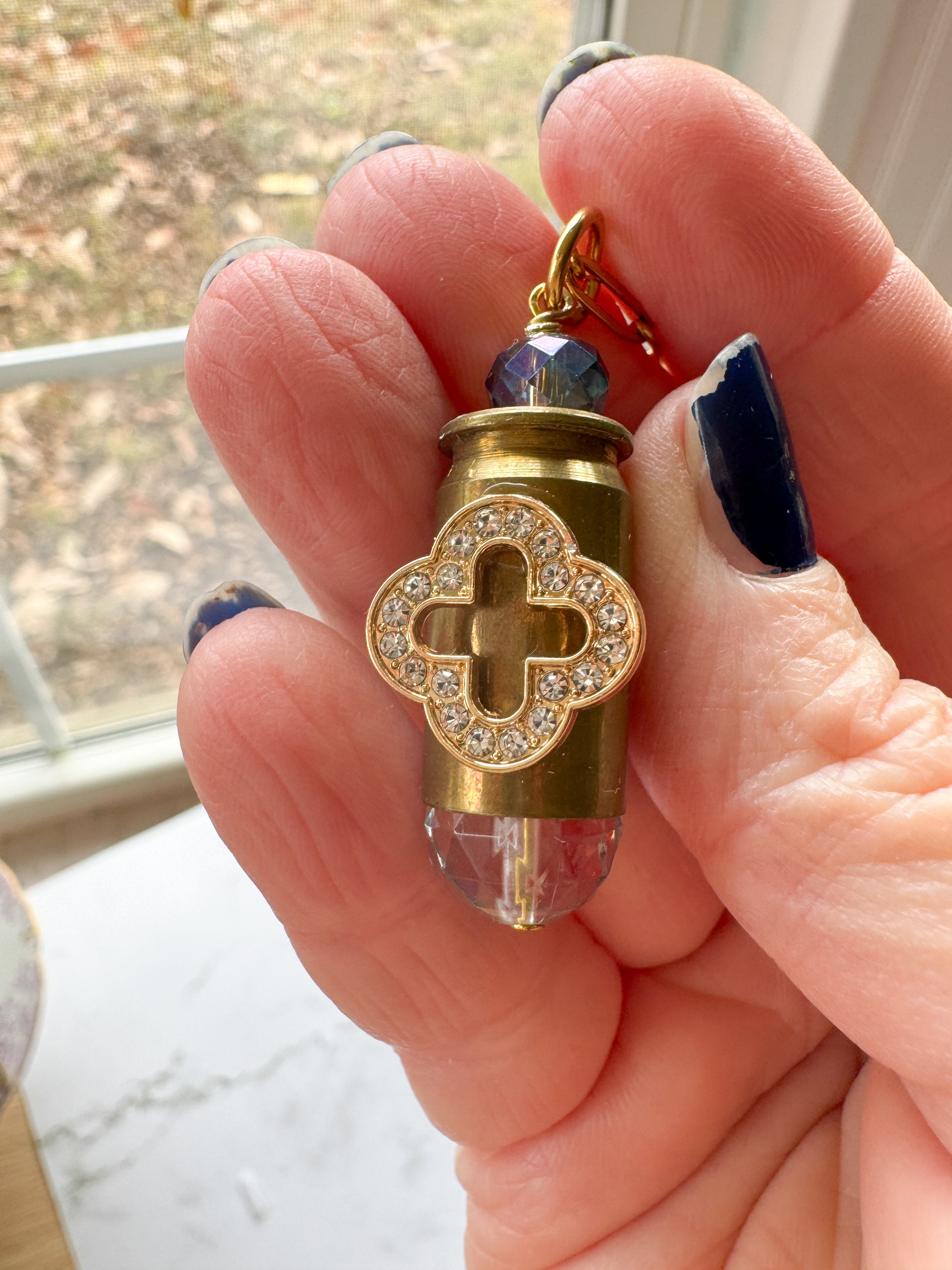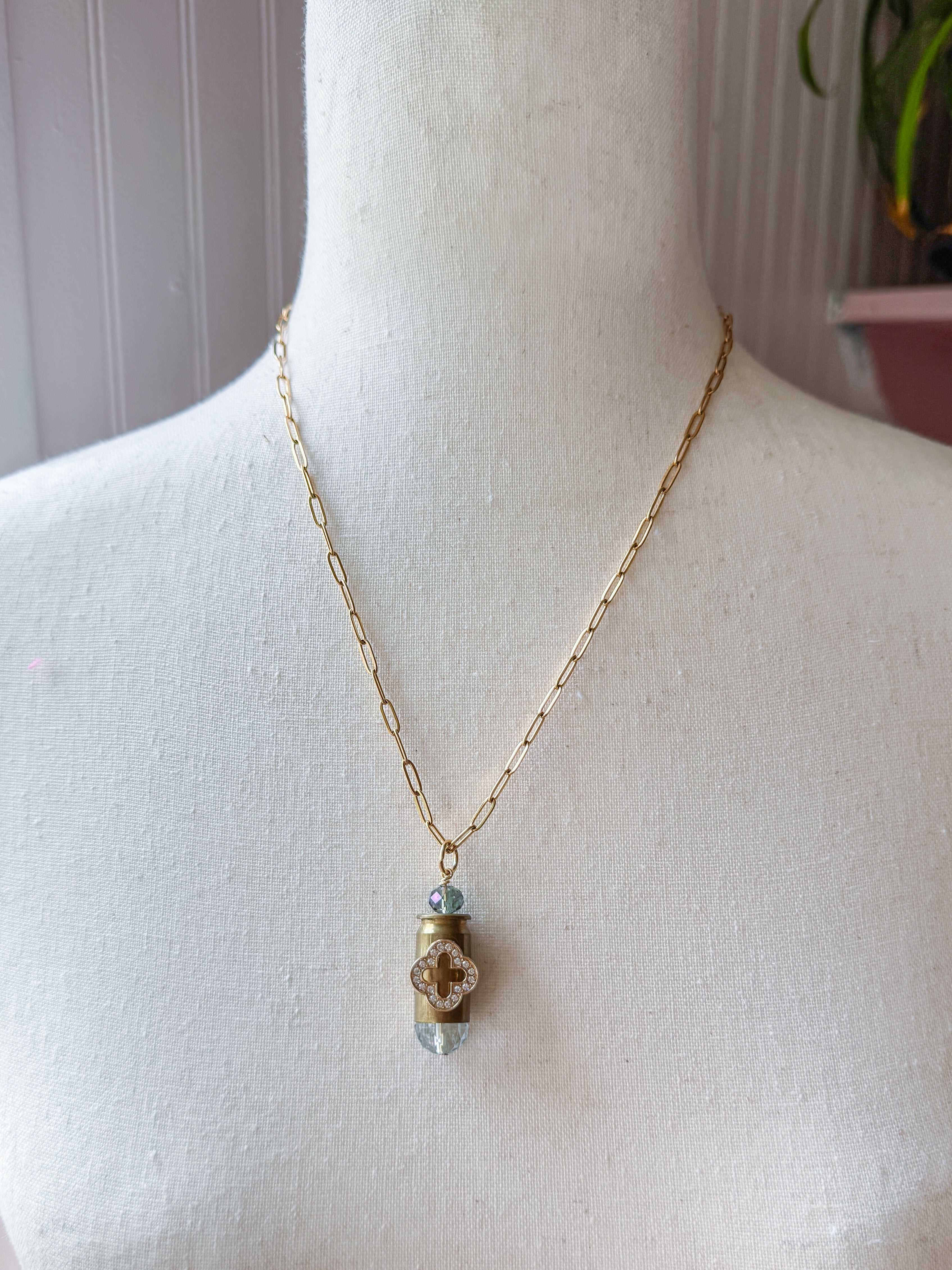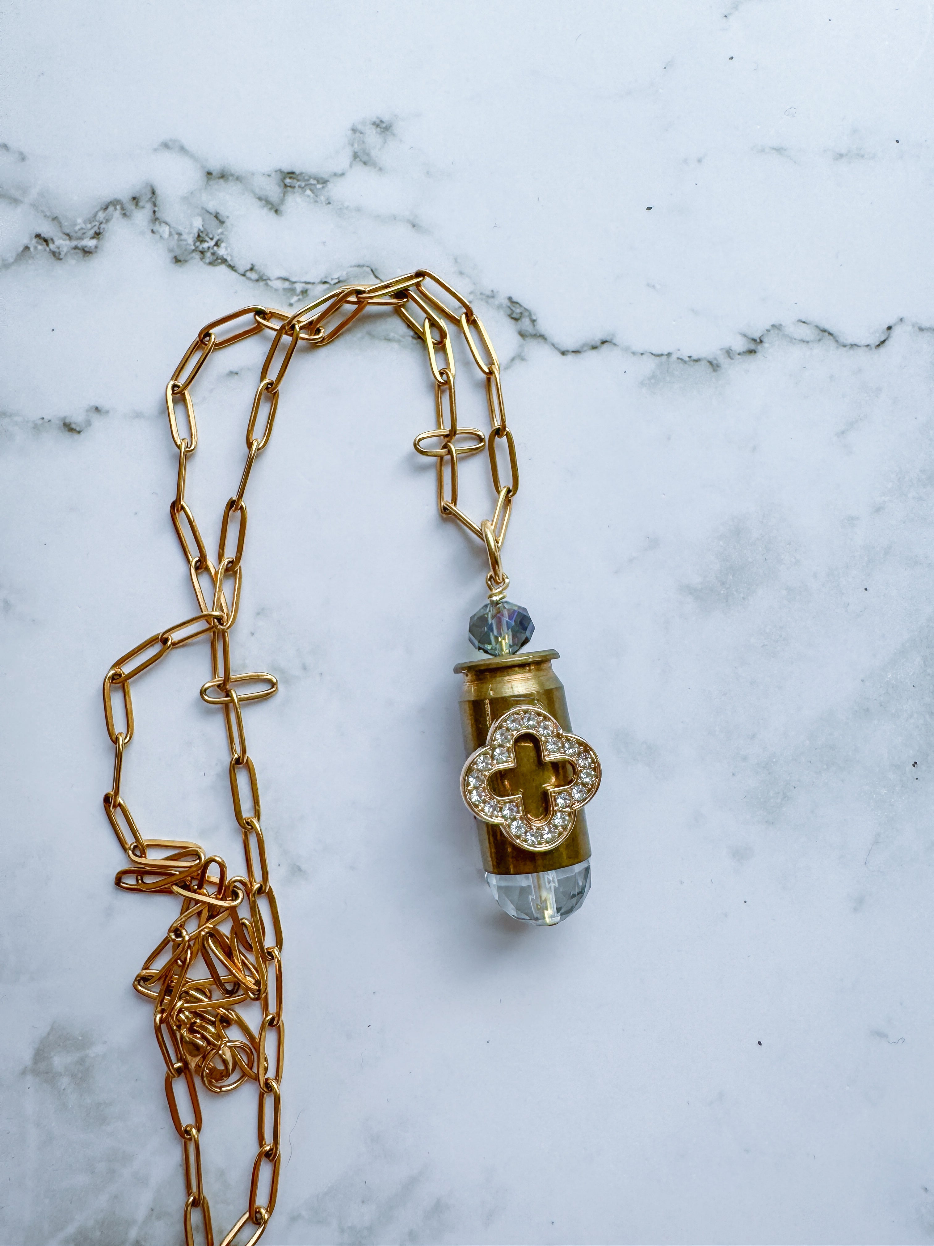 Repurposed Vintage ingredients: spent brass bullet casing embellished with a CZ clover. A vintage faceted crystal nestles in the end of the bullet and the top. Pendant dangles 1.5” from adjustable 19”s 18kt gf waterproof chain.