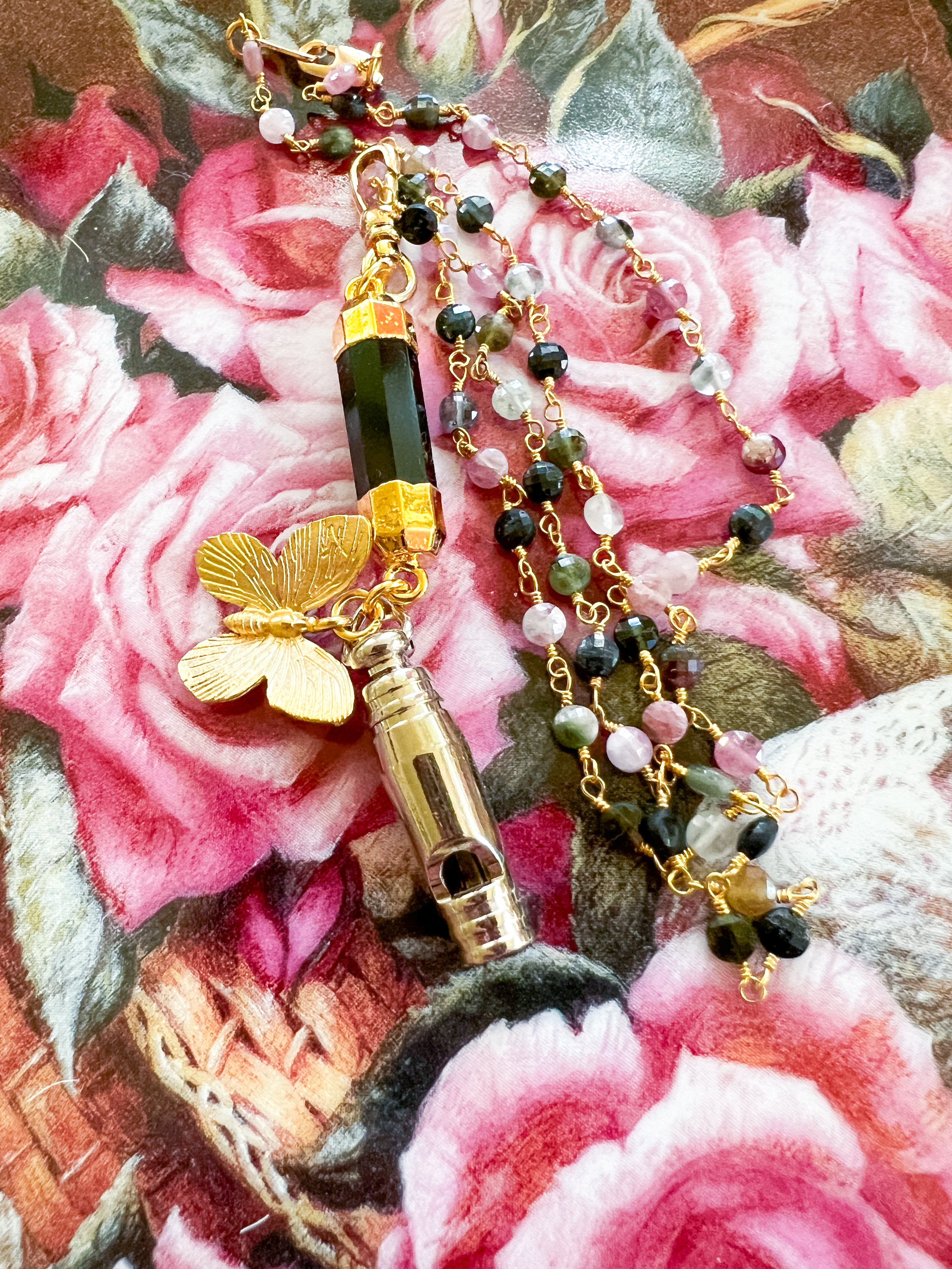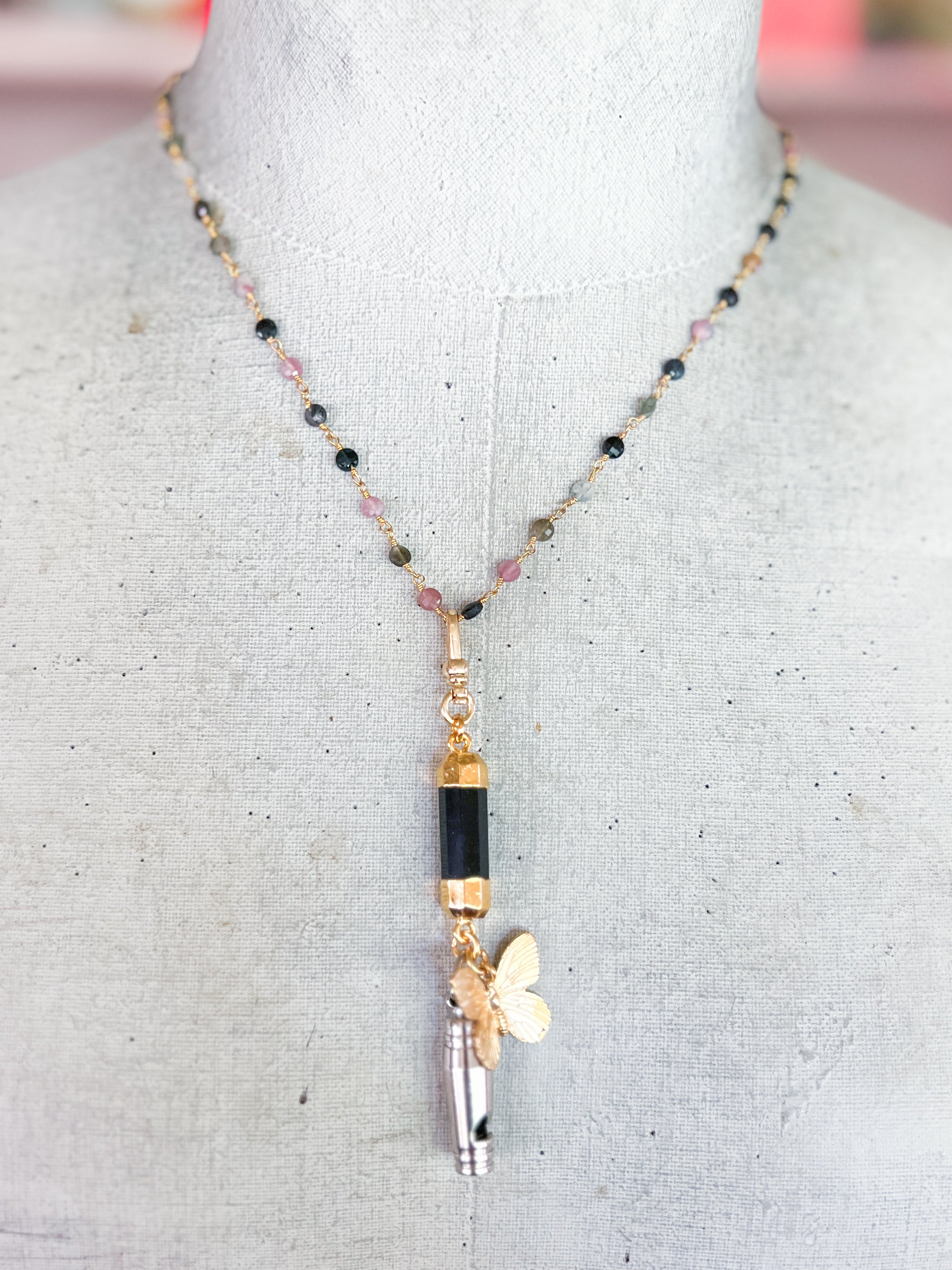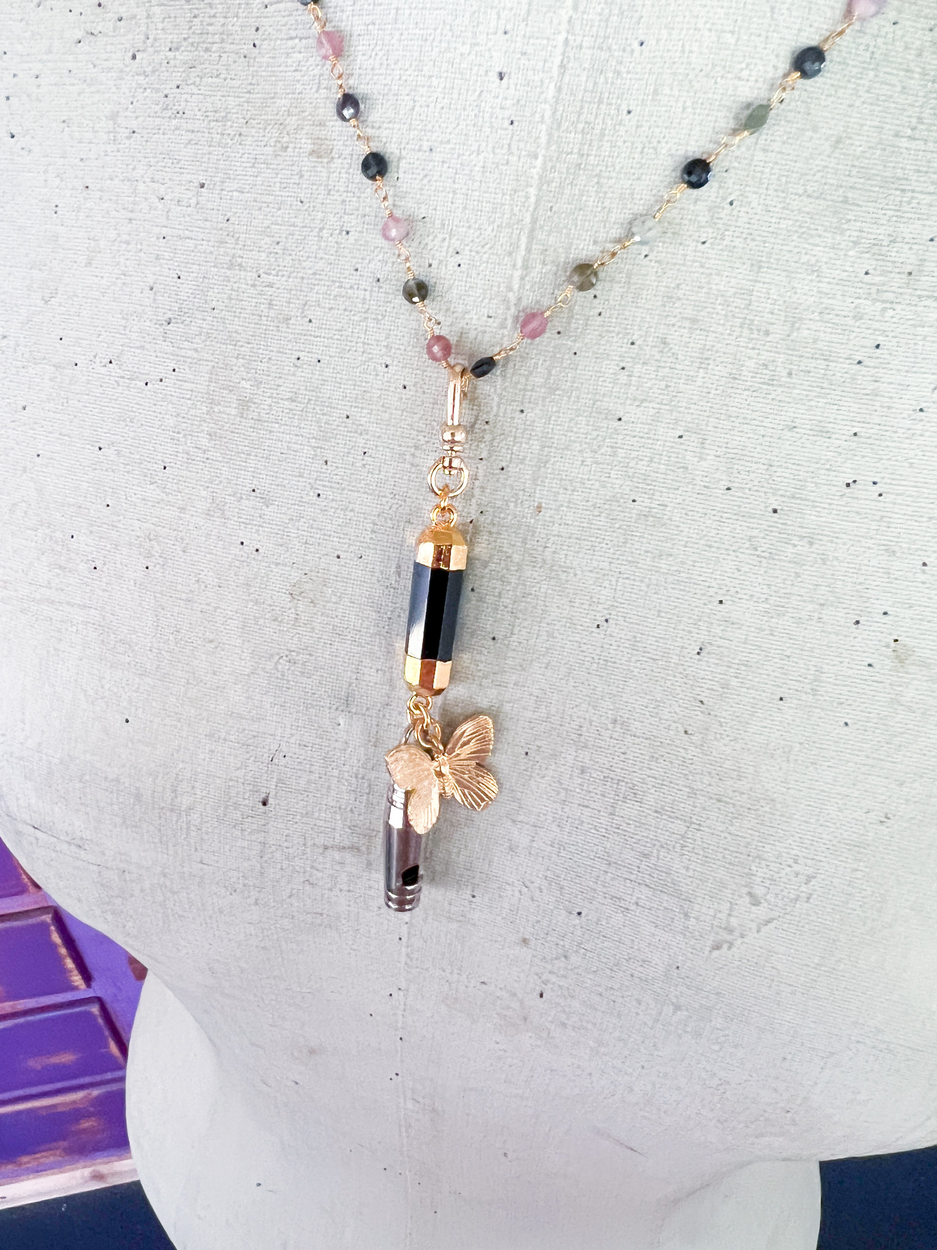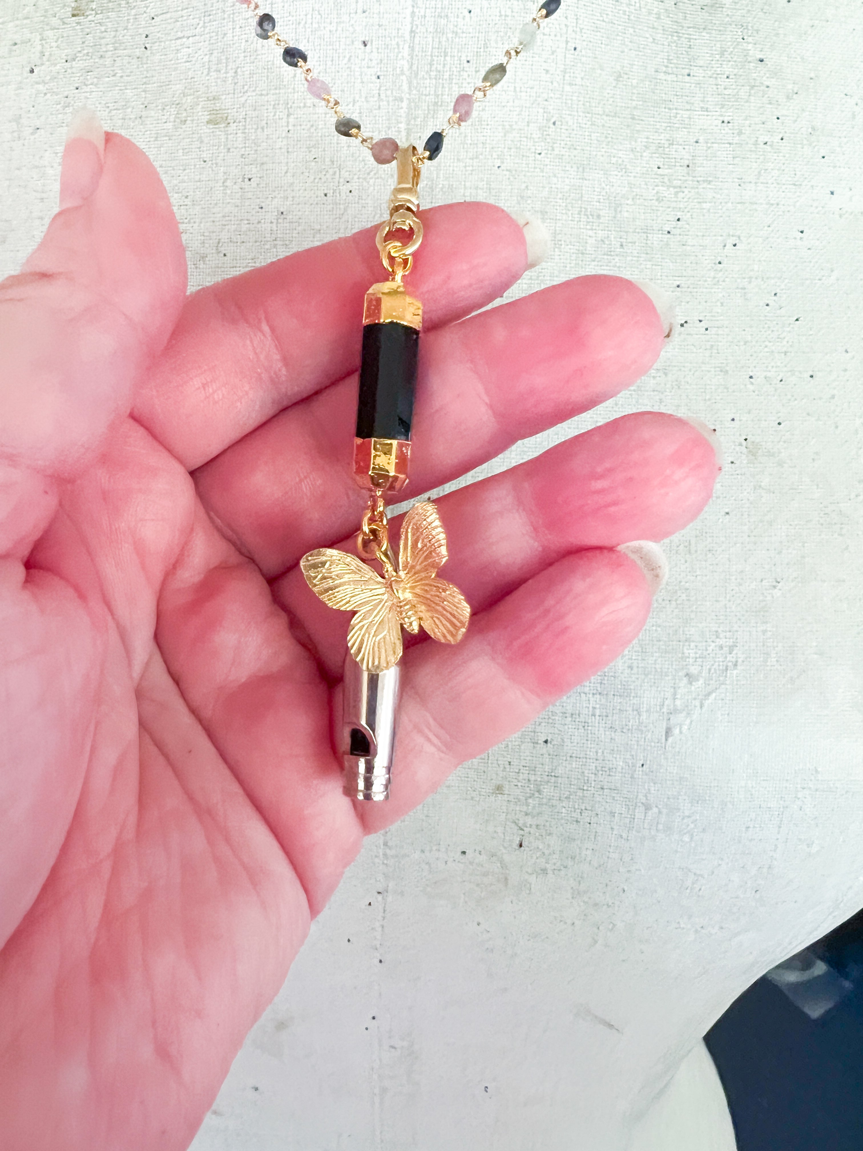 A vintage whistle has been paired with an onyx gemstone and a 22kt gf butterfly to form a charm. The charm dangles on delicate beaded watermelon tourmaline gemstone chain.Necklace is 18”s and the charm is easily removable to add to other necklaces.