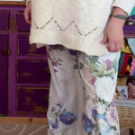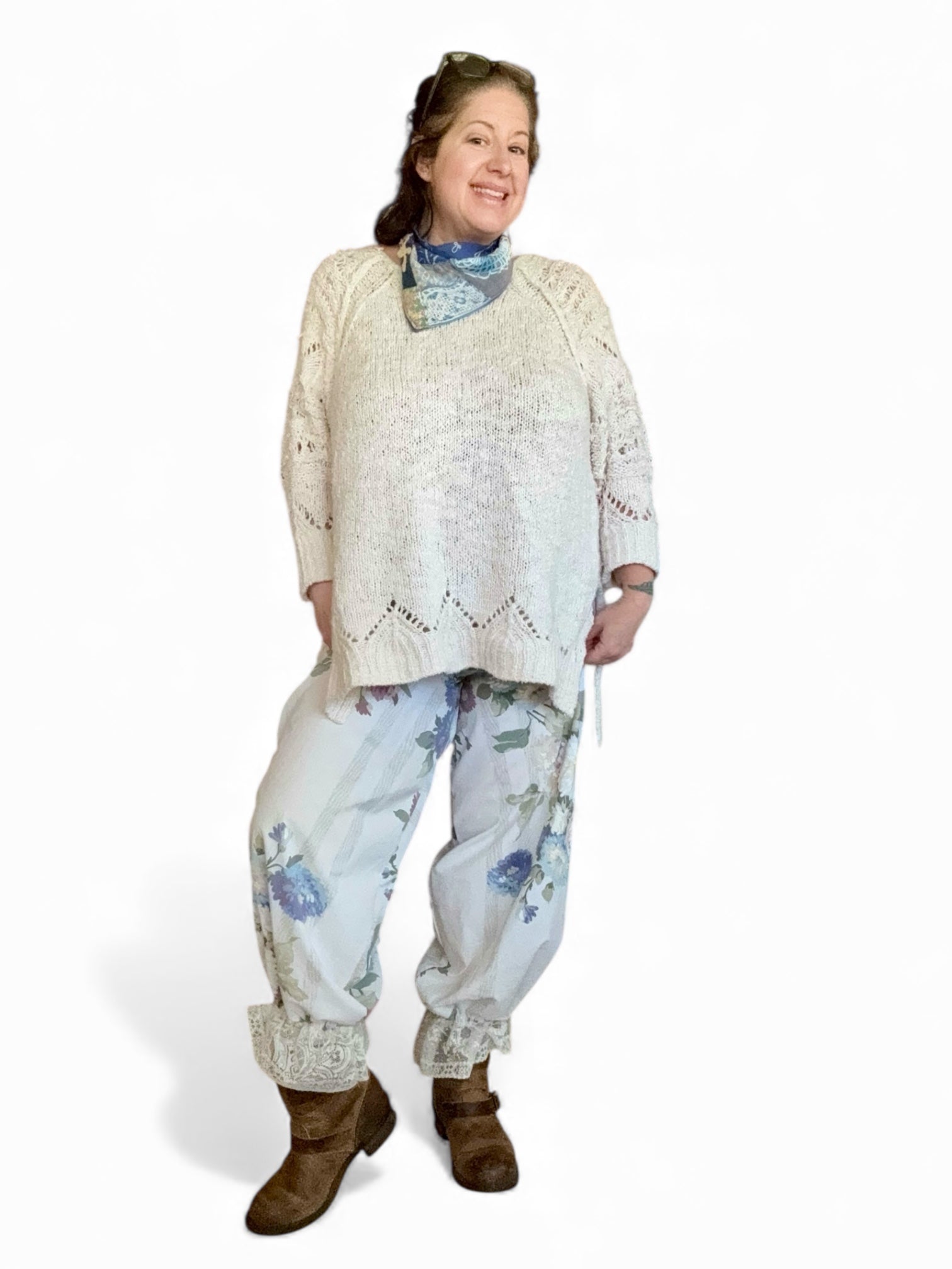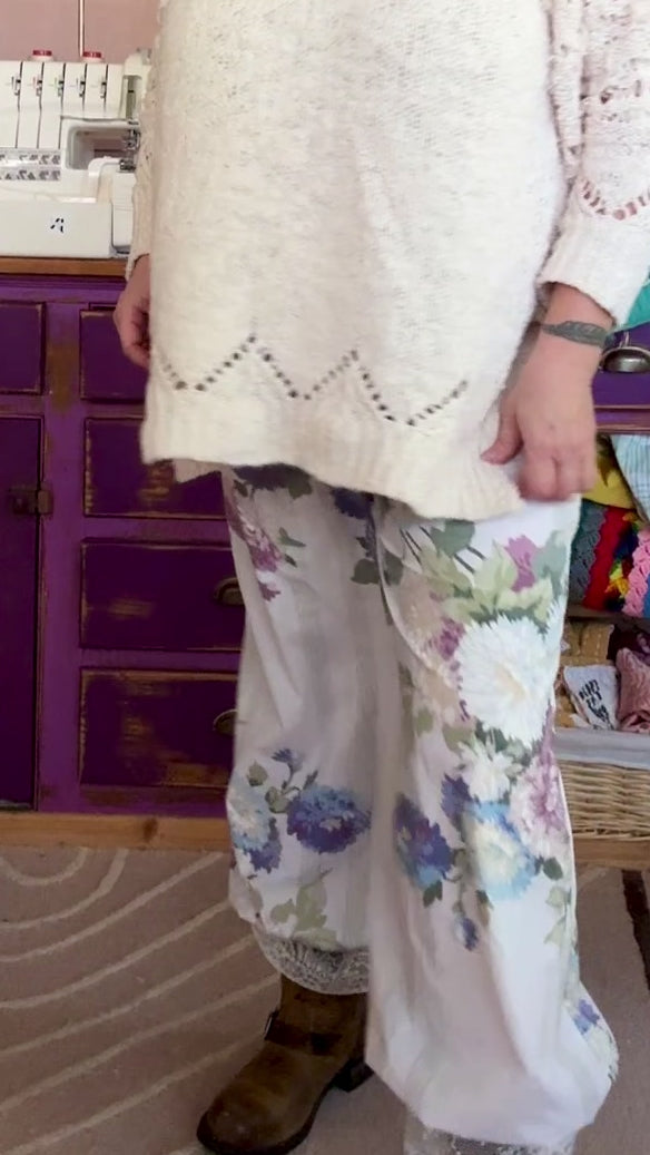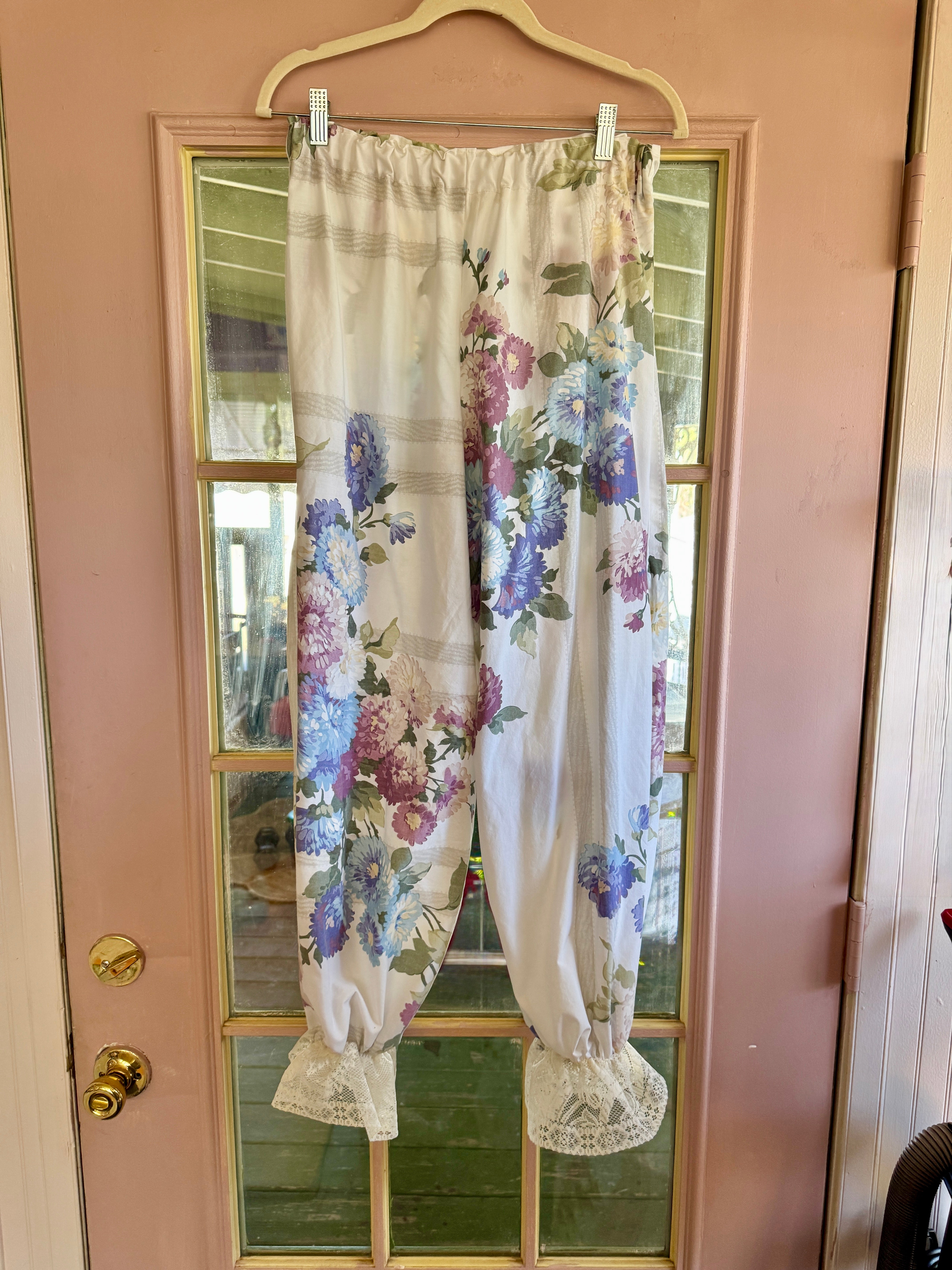 Vintage sheets transformed into one of a kind bloomer lounge pants. She has an elastic waste to stretch for a loose fit and banded lace cuff. Mid rise