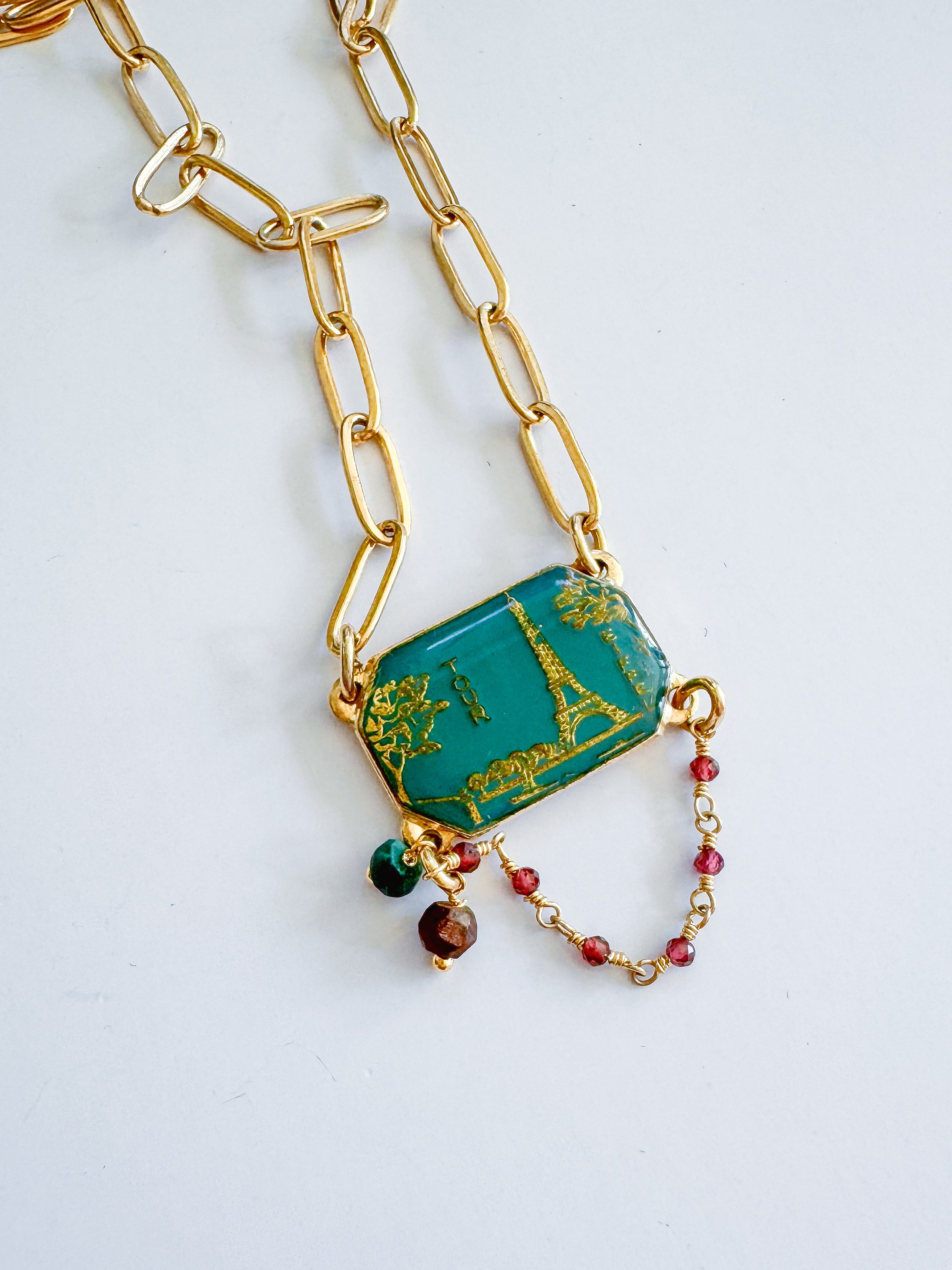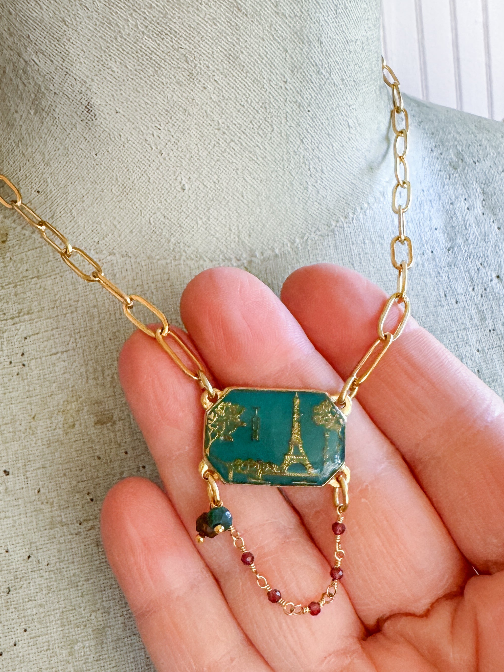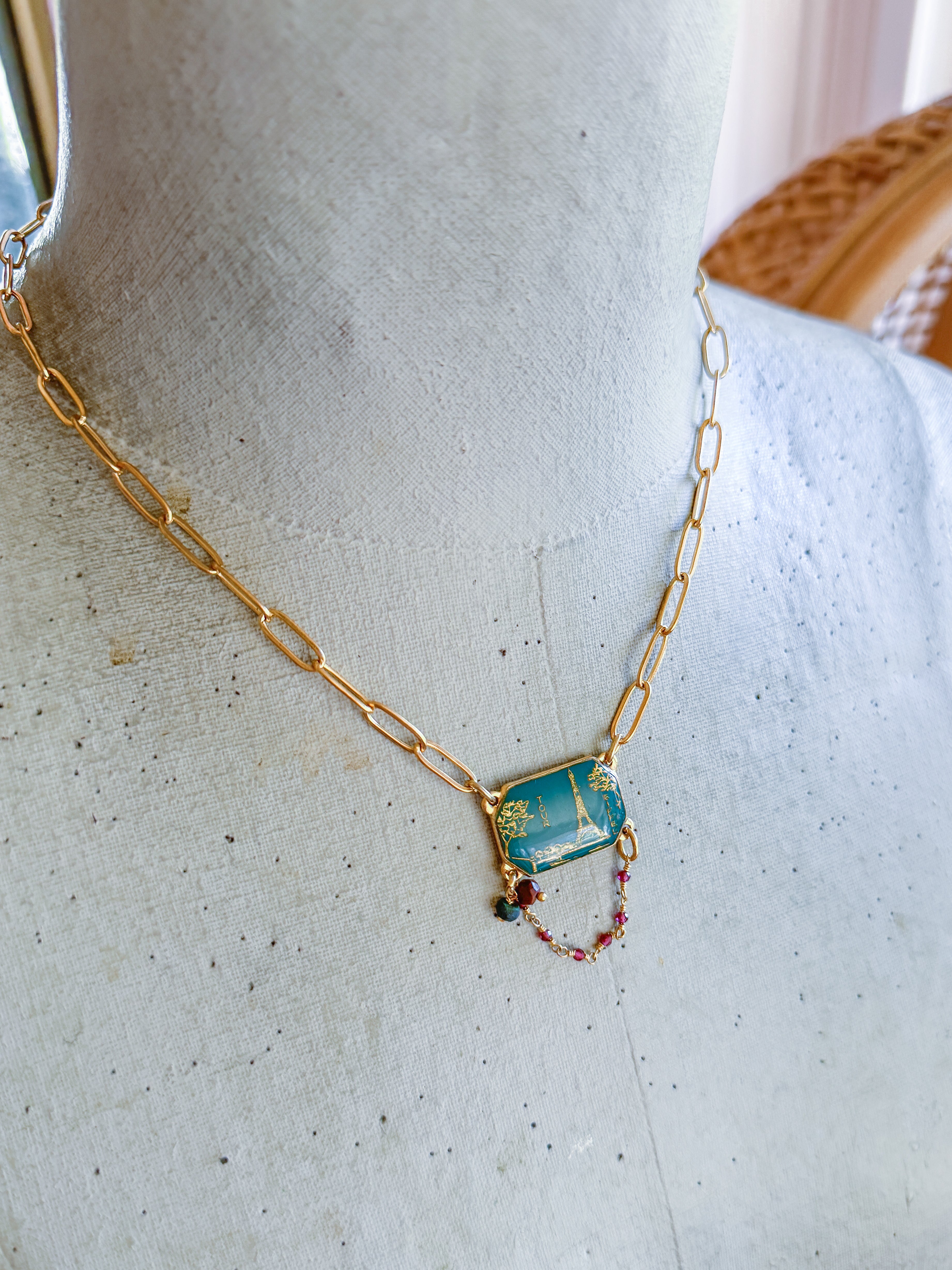 Vintage ingredients: Vintage teal enameled link from a French travel bracelet repurposed into a pendant and paired with ruby gemstone rosary chain and watermelon tourmaline gemstones. Chain is 18kt gf paperclip chain and is adjustable to 18”s