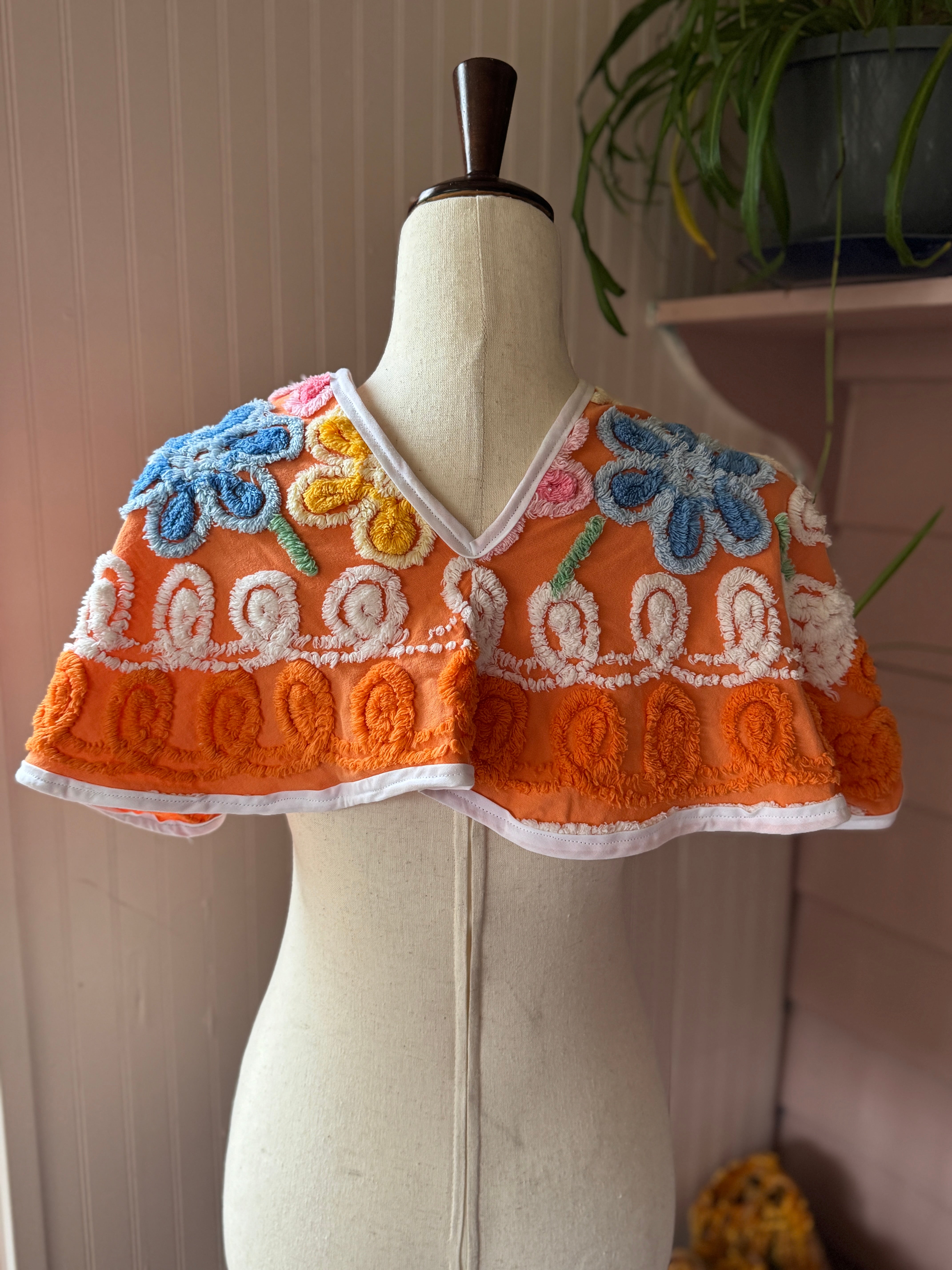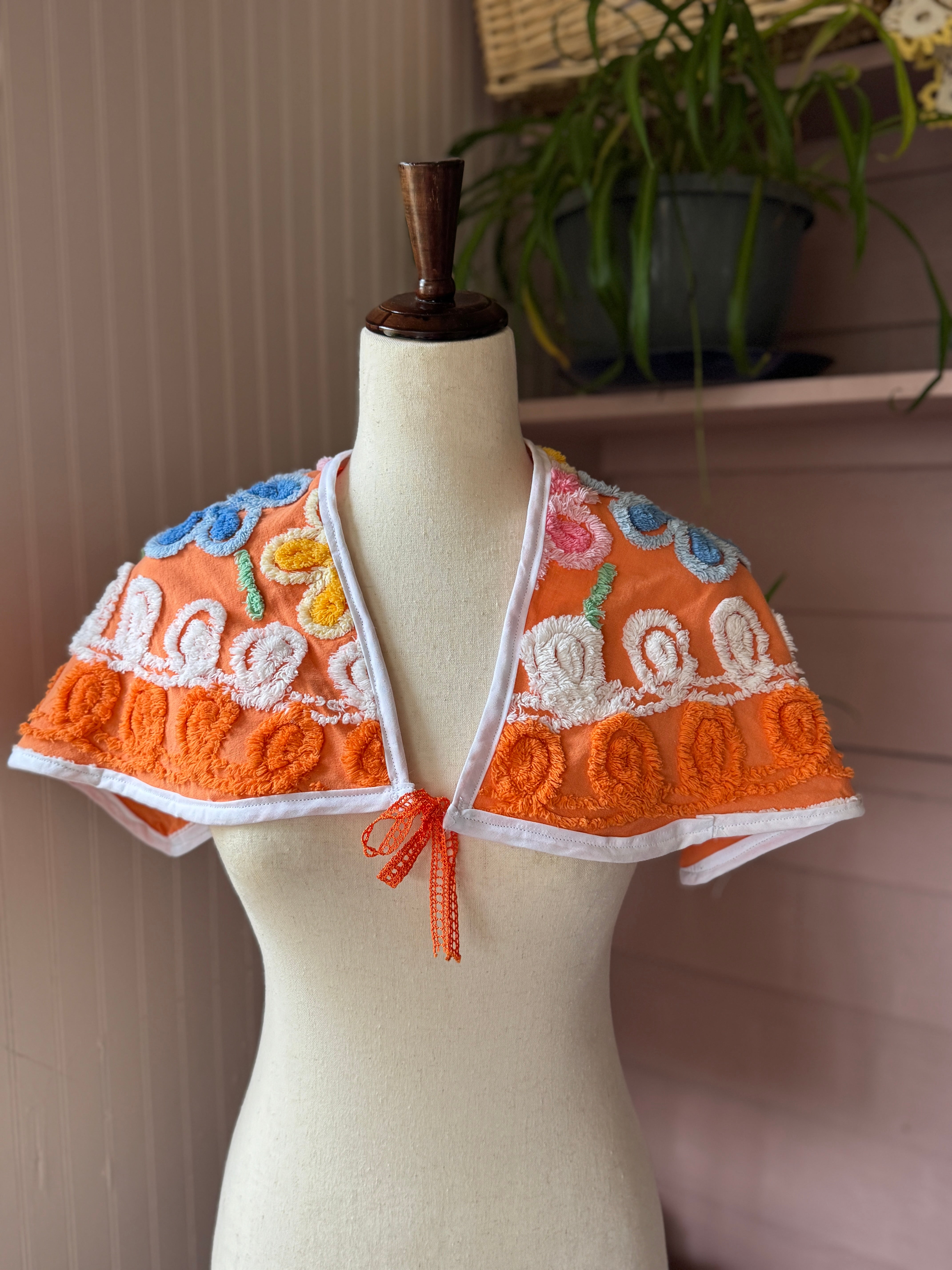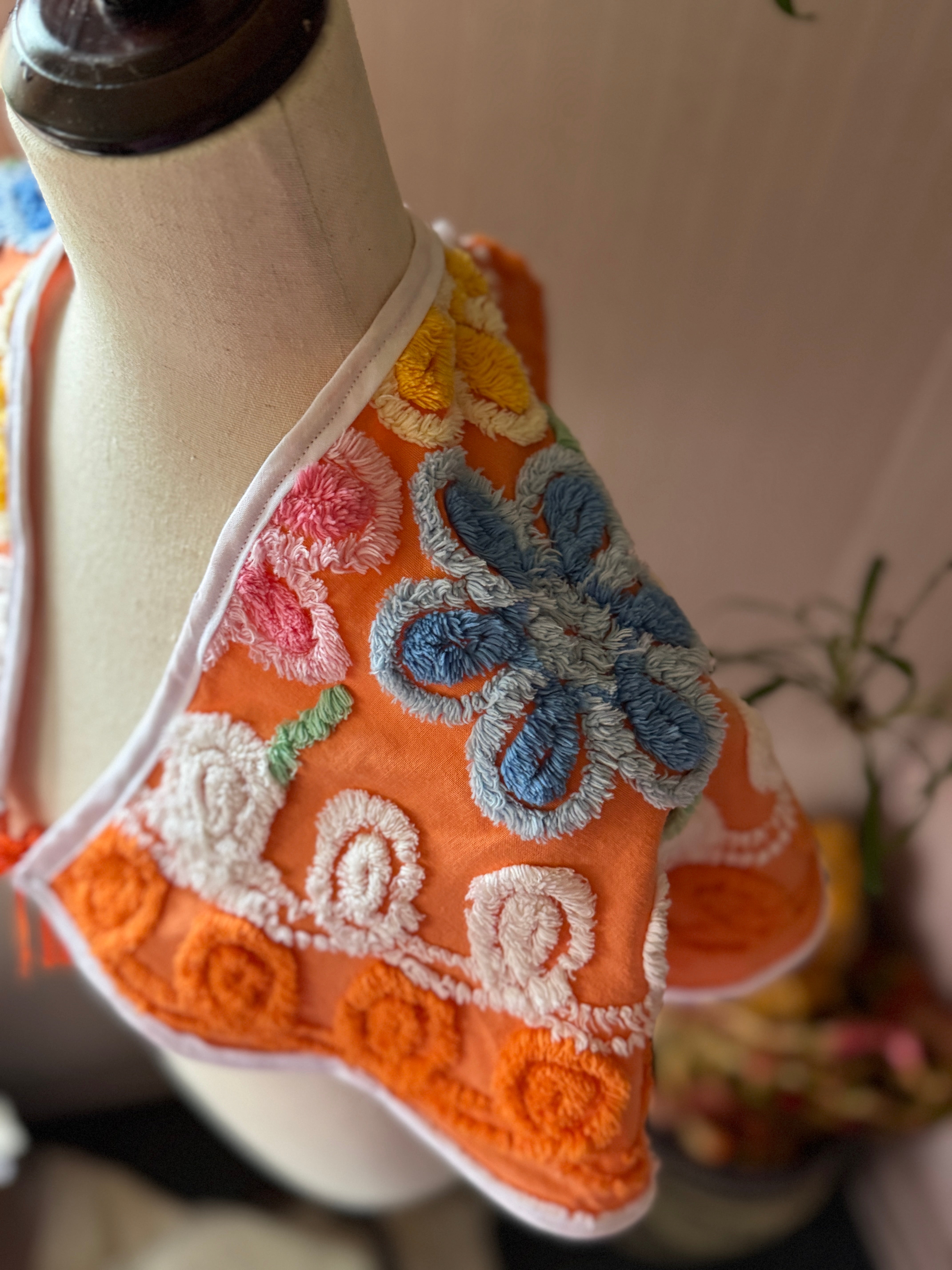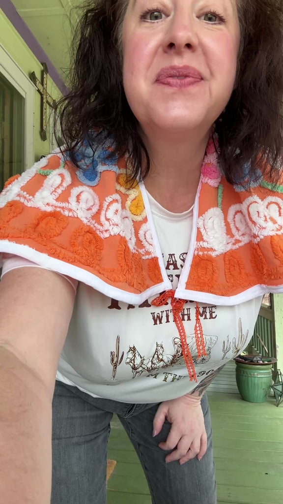 Vintage rare orange chenille bedspread remnant repurposed into a colorful detachable collar. Carefully crafted to showcase the original floral tufted design. The perfect pop of color to transform a boring T-shirt or sweater!