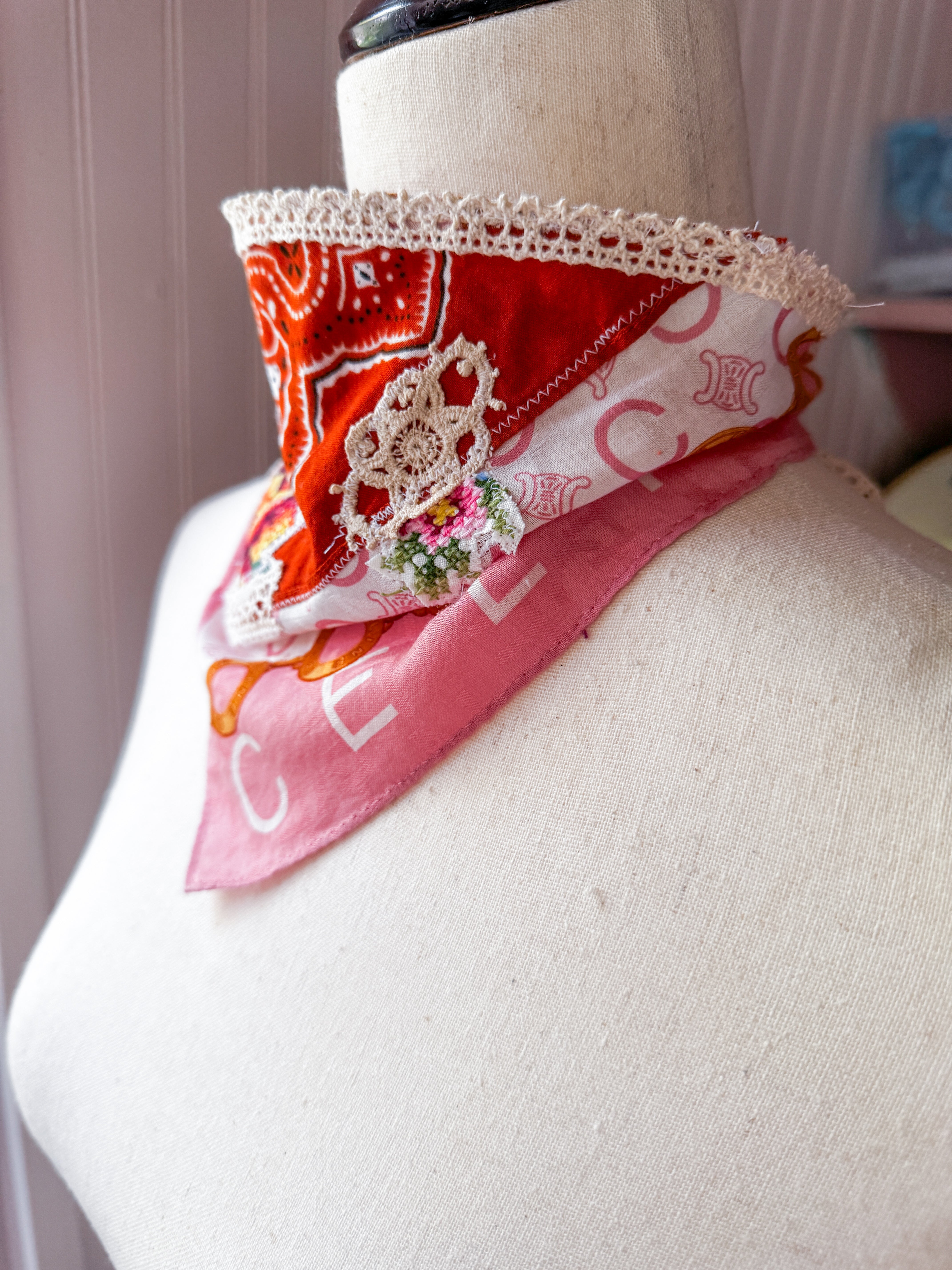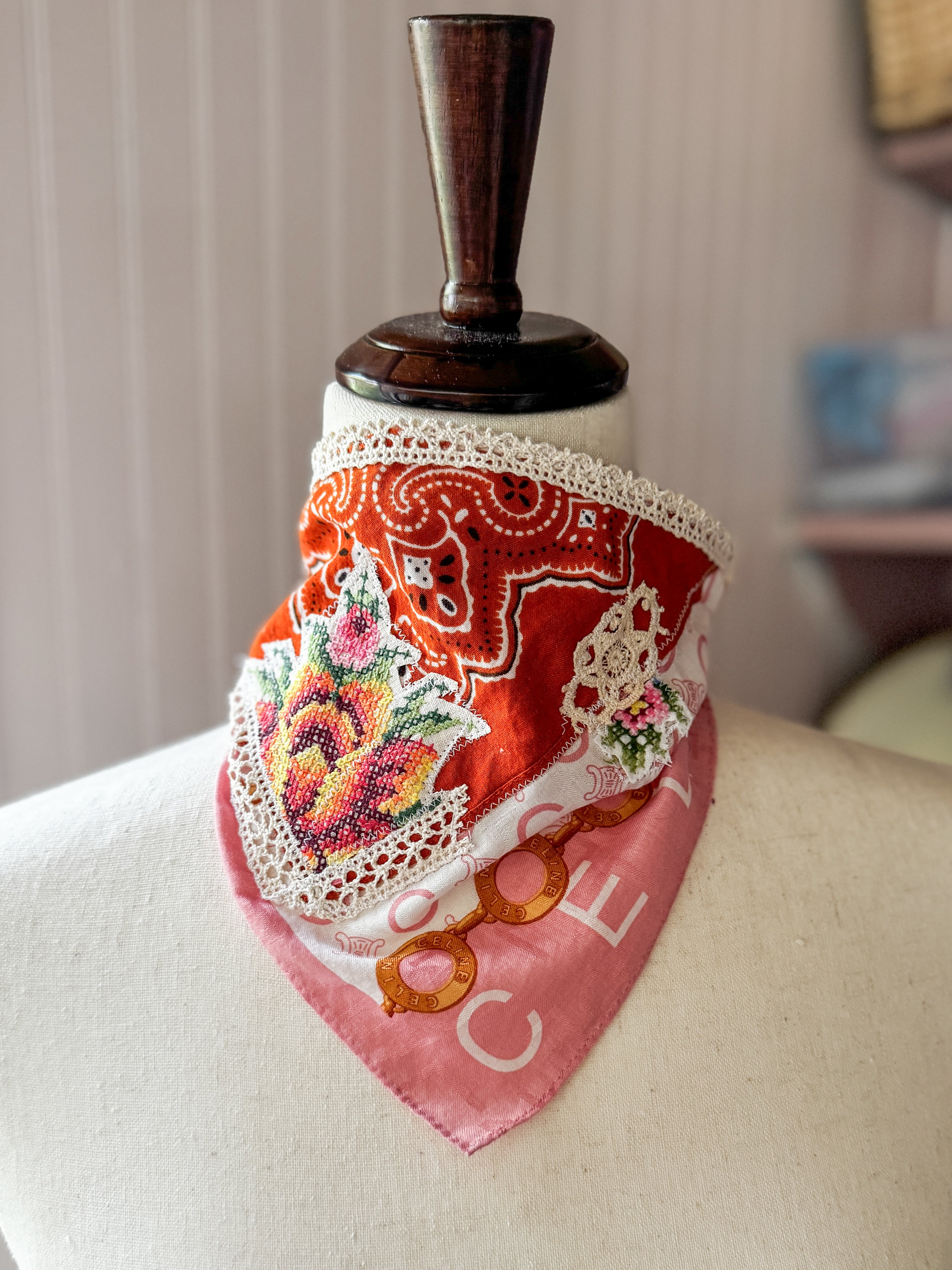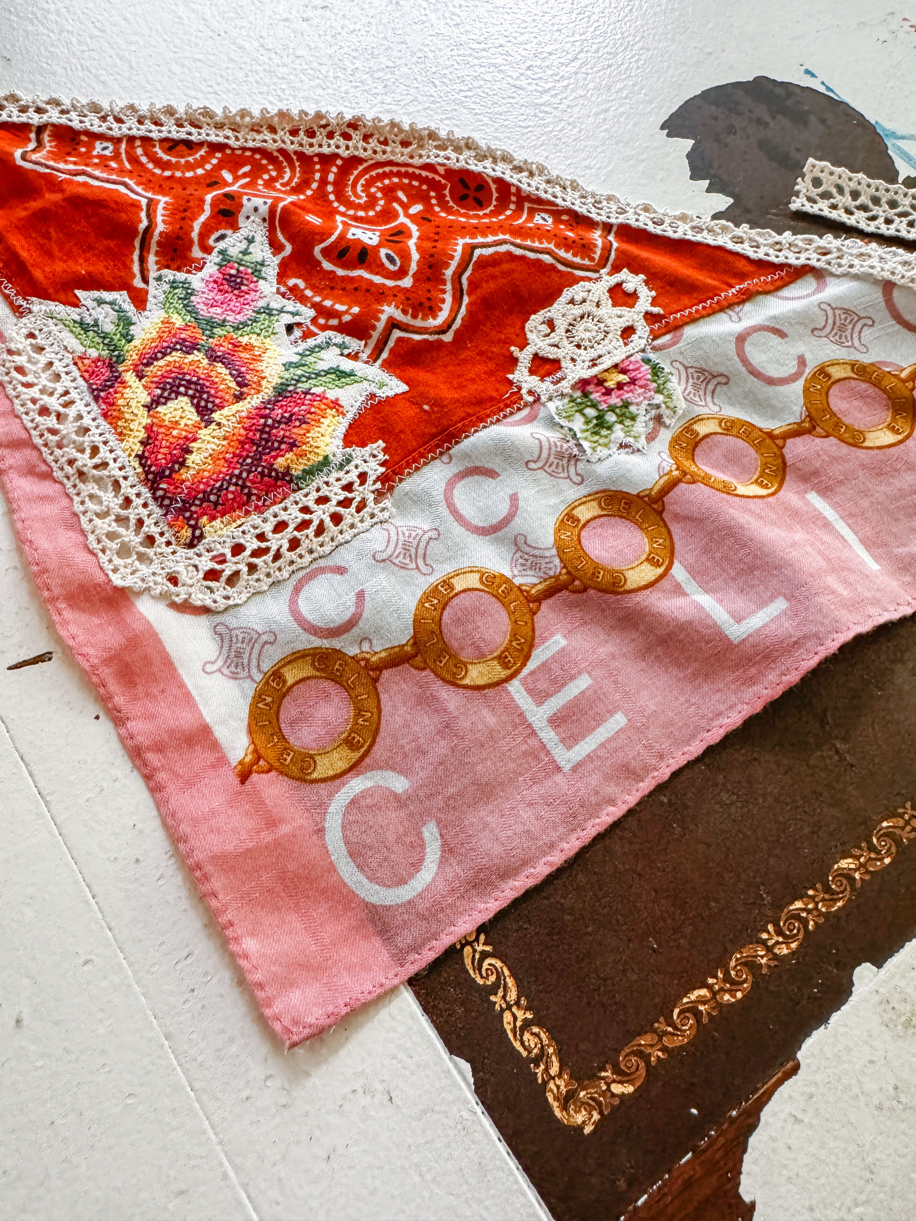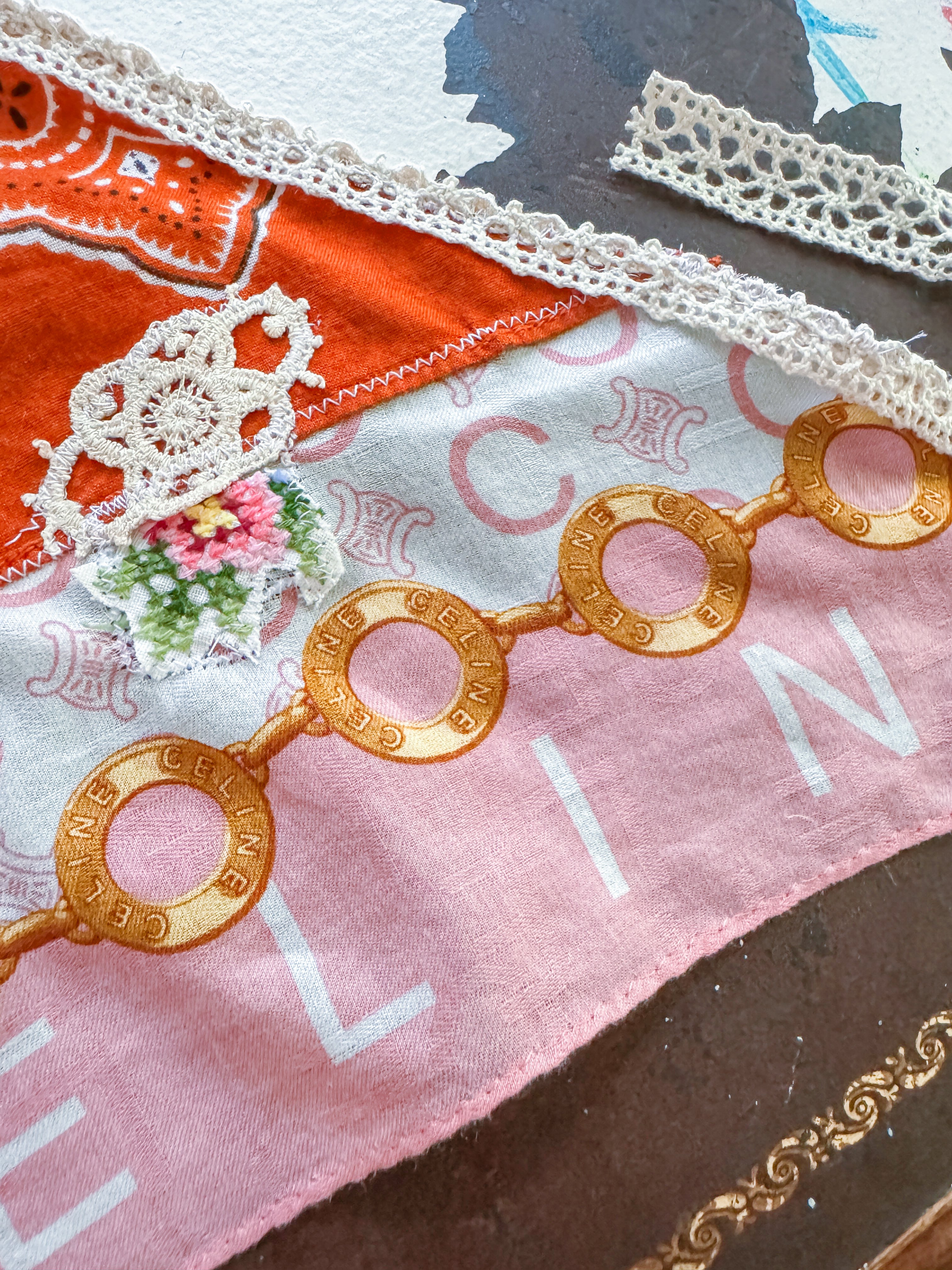 Vintage Celine scarf remnant repurposed into a head scarf/ bandana. Scarf was embellished with hand embroidered flowers from vintage table linens, antique tatted lace and vintage cotton bandana remnants. Lace trim finishes her off. Easily ties around head or neck.