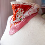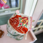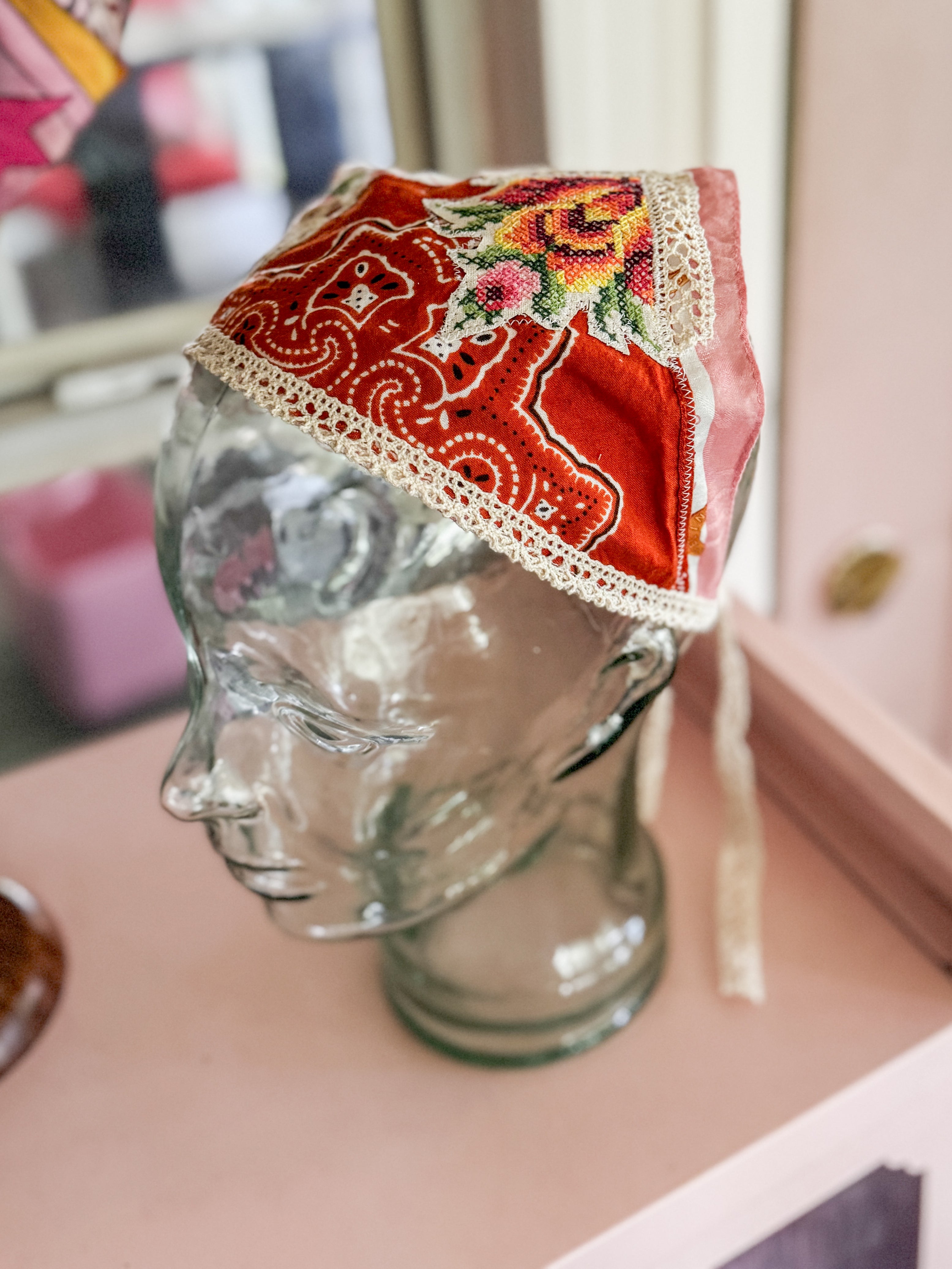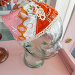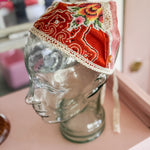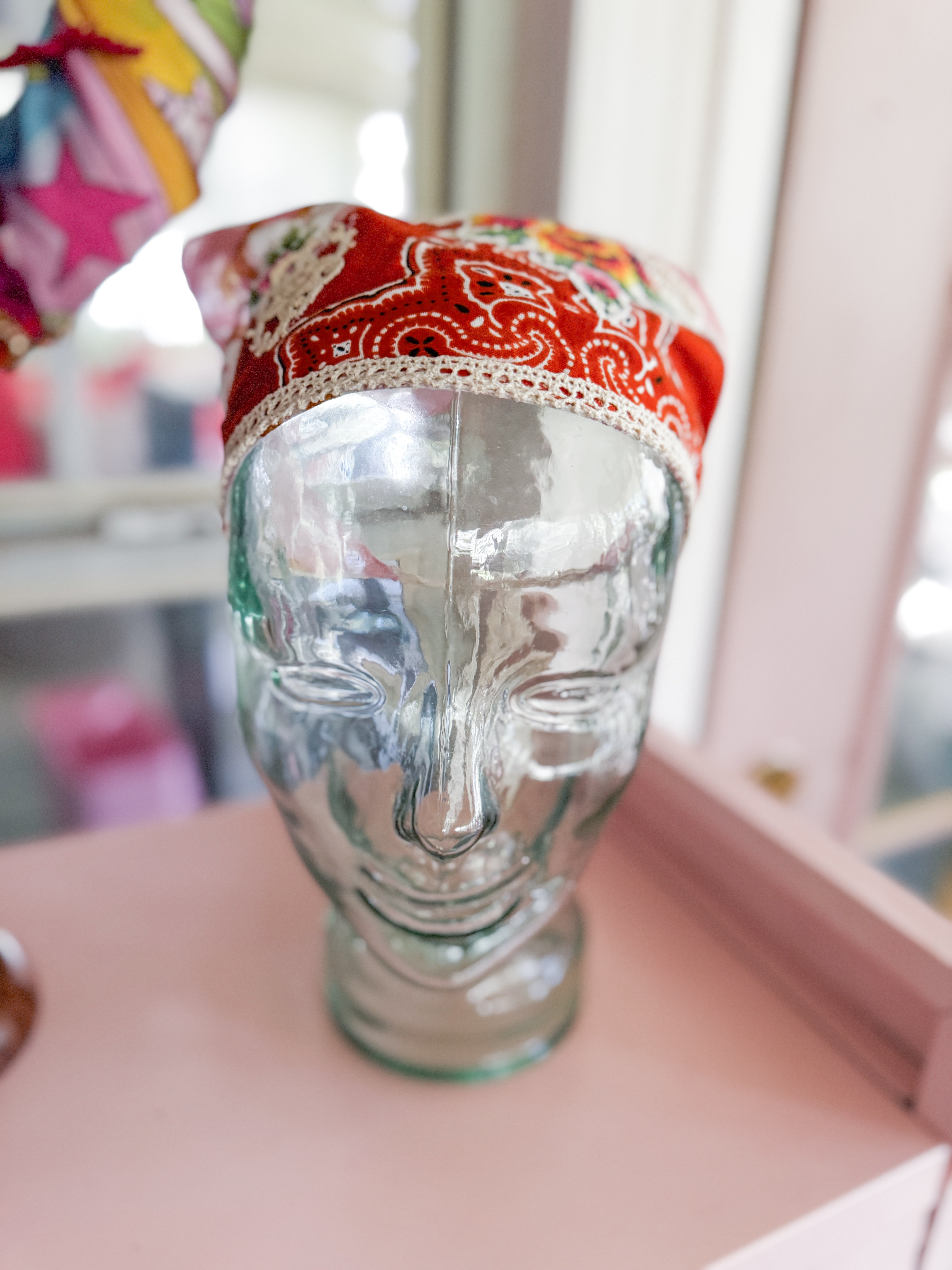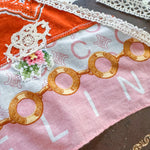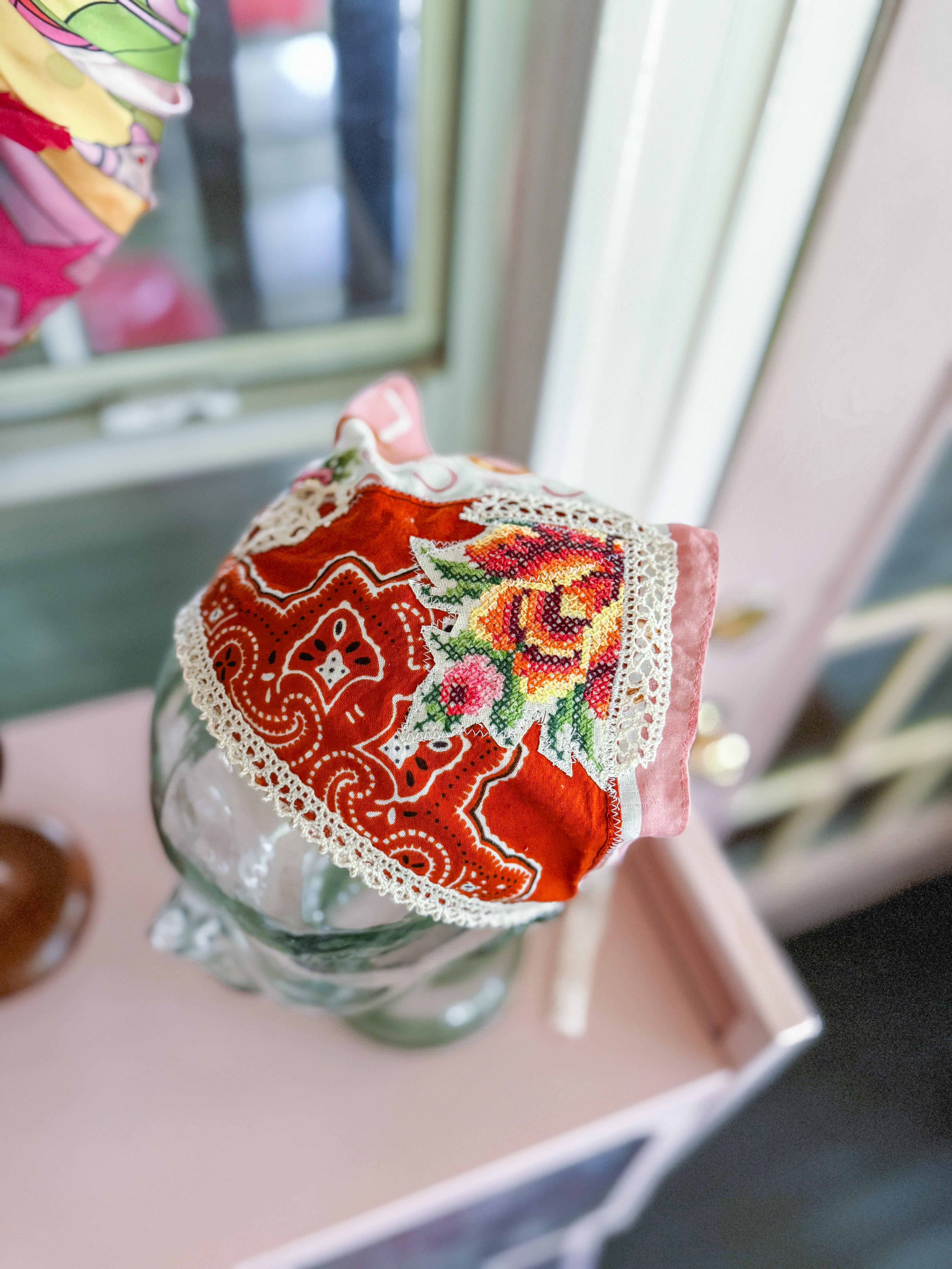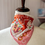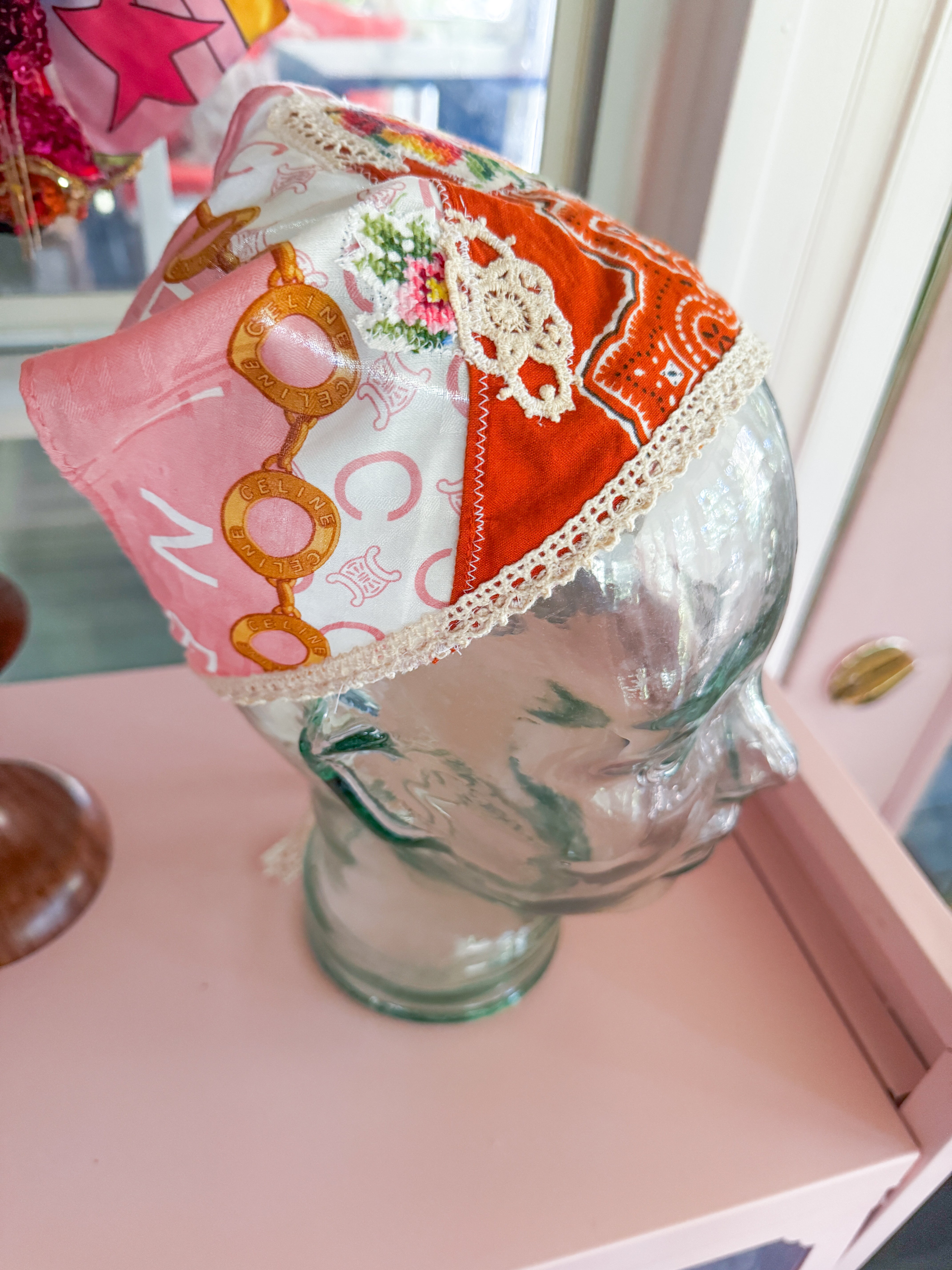 Vintage Celine scarf remnant repurposed into a head scarf/ bandana. Scarf was embellished with hand embroidered flowers from vintage table linens, antique tatted lace and vintage cotton bandana remnants. Lace trim finishes her off. Easily ties around head or neck.