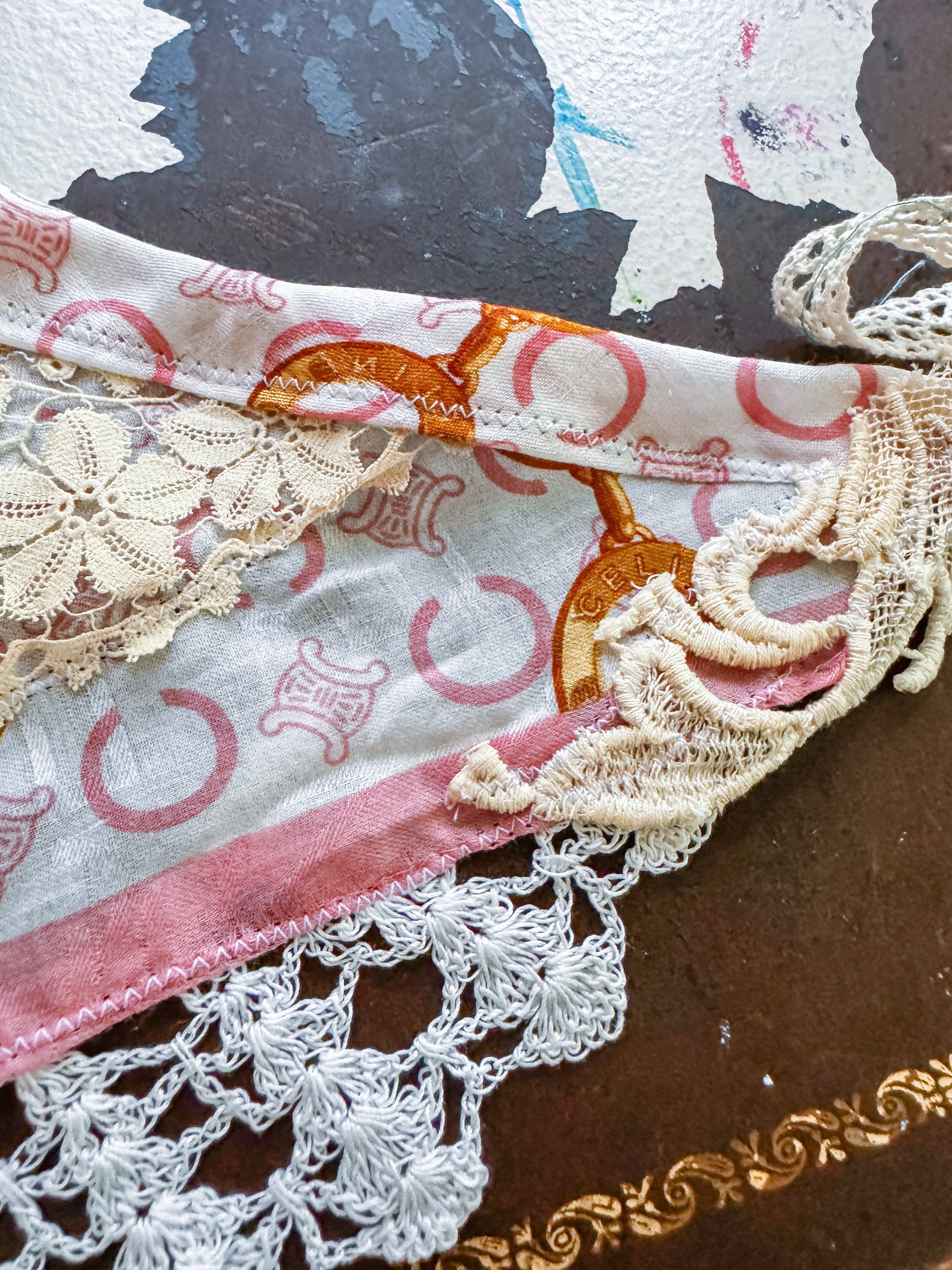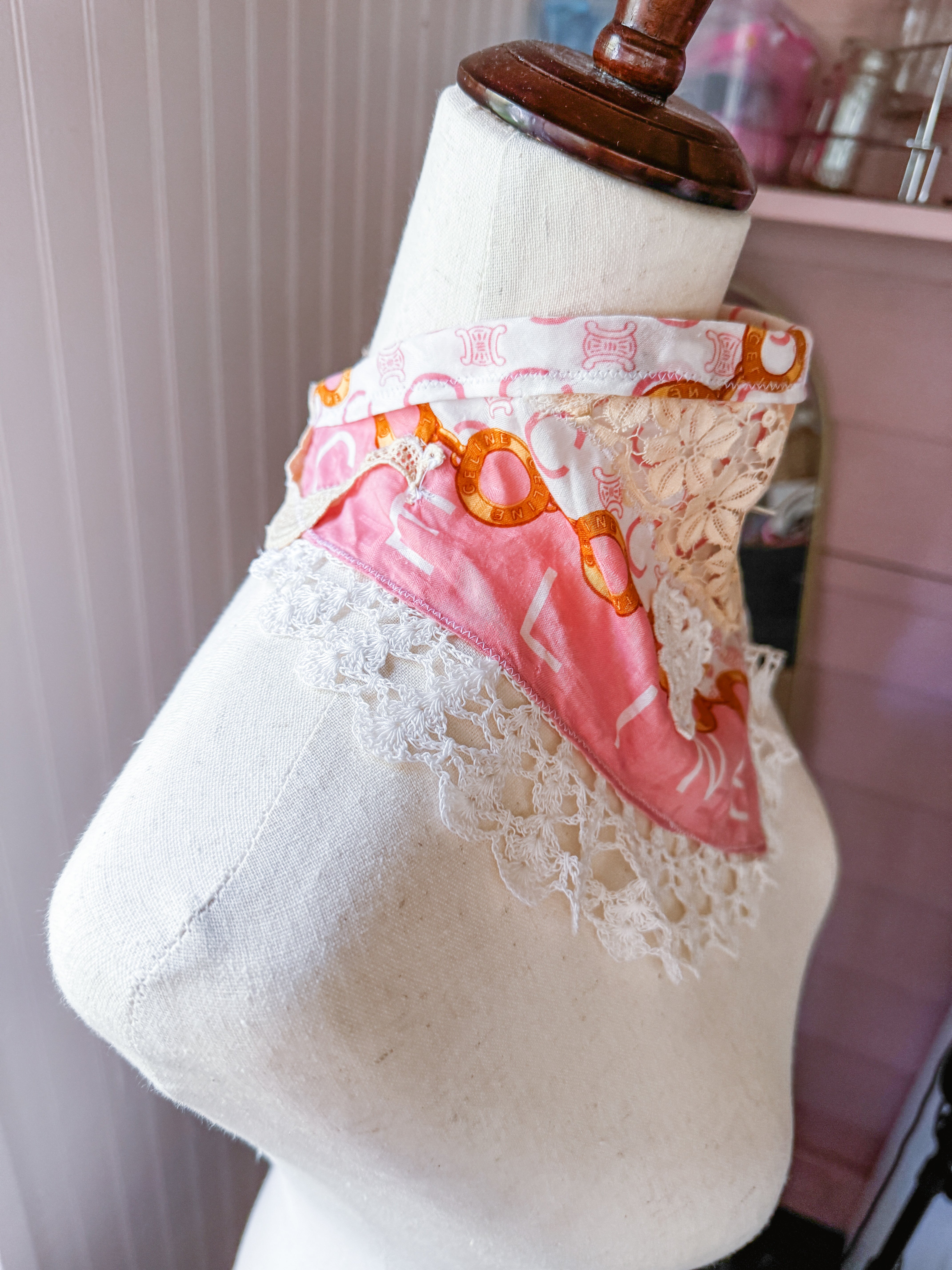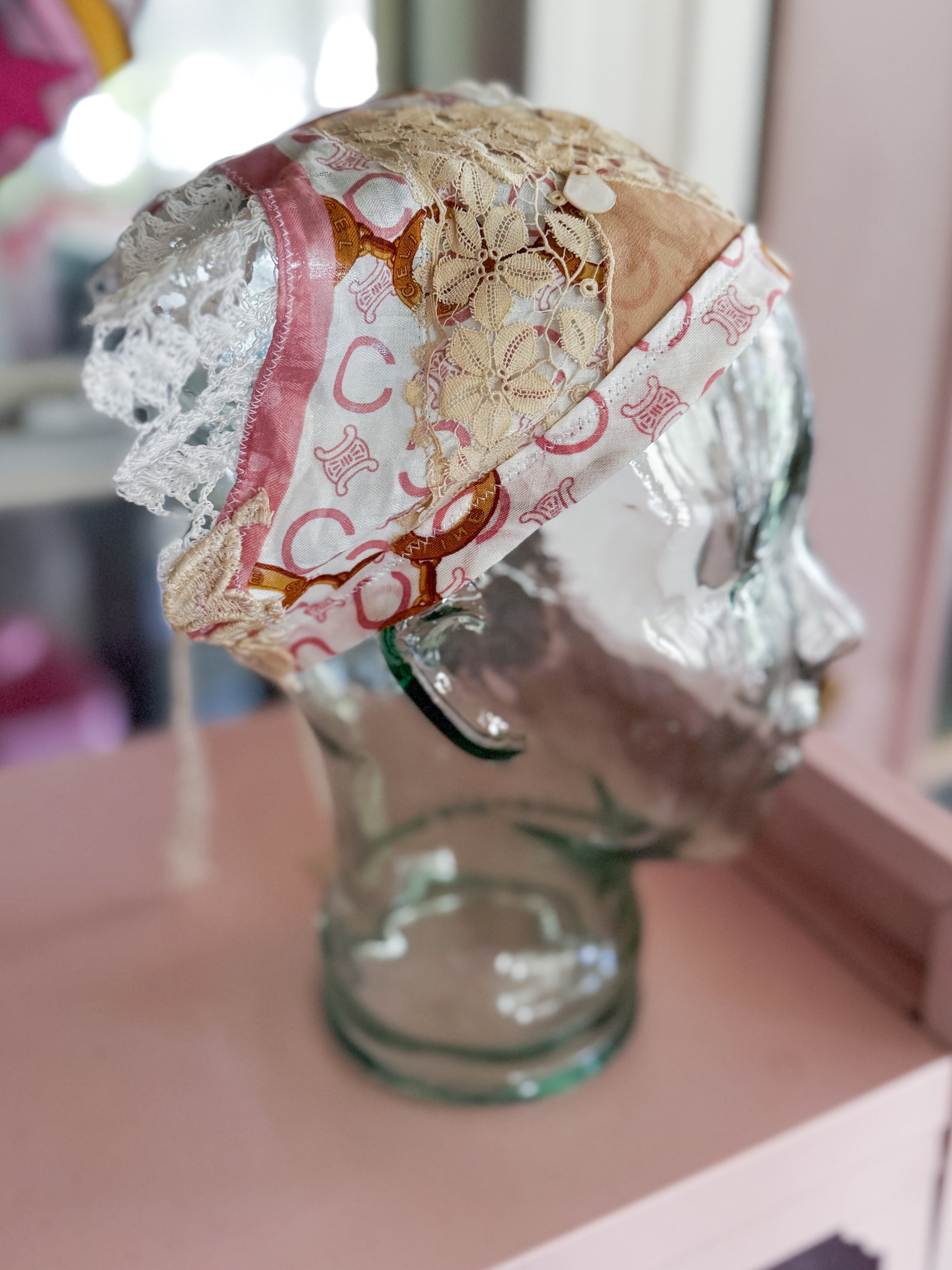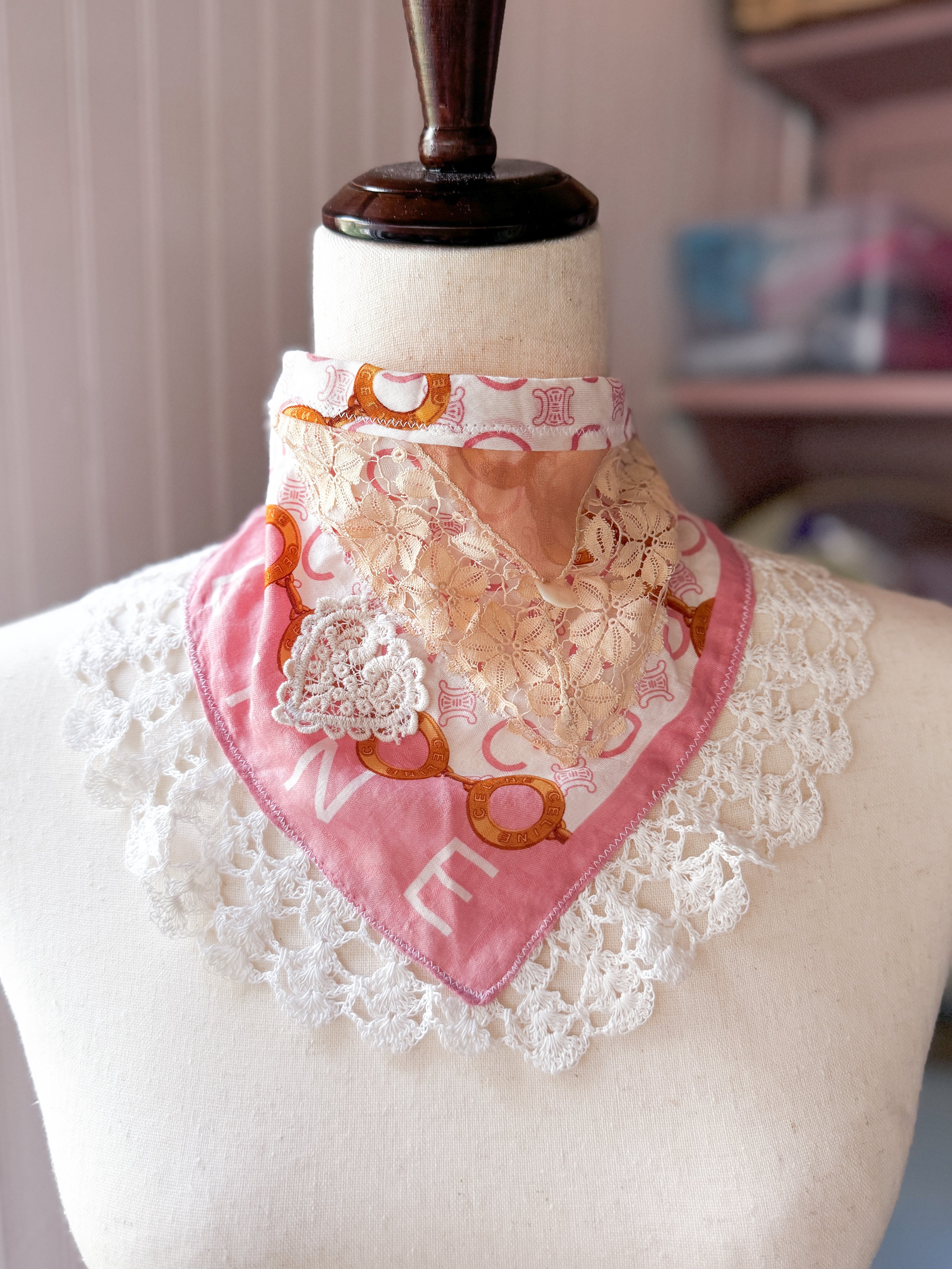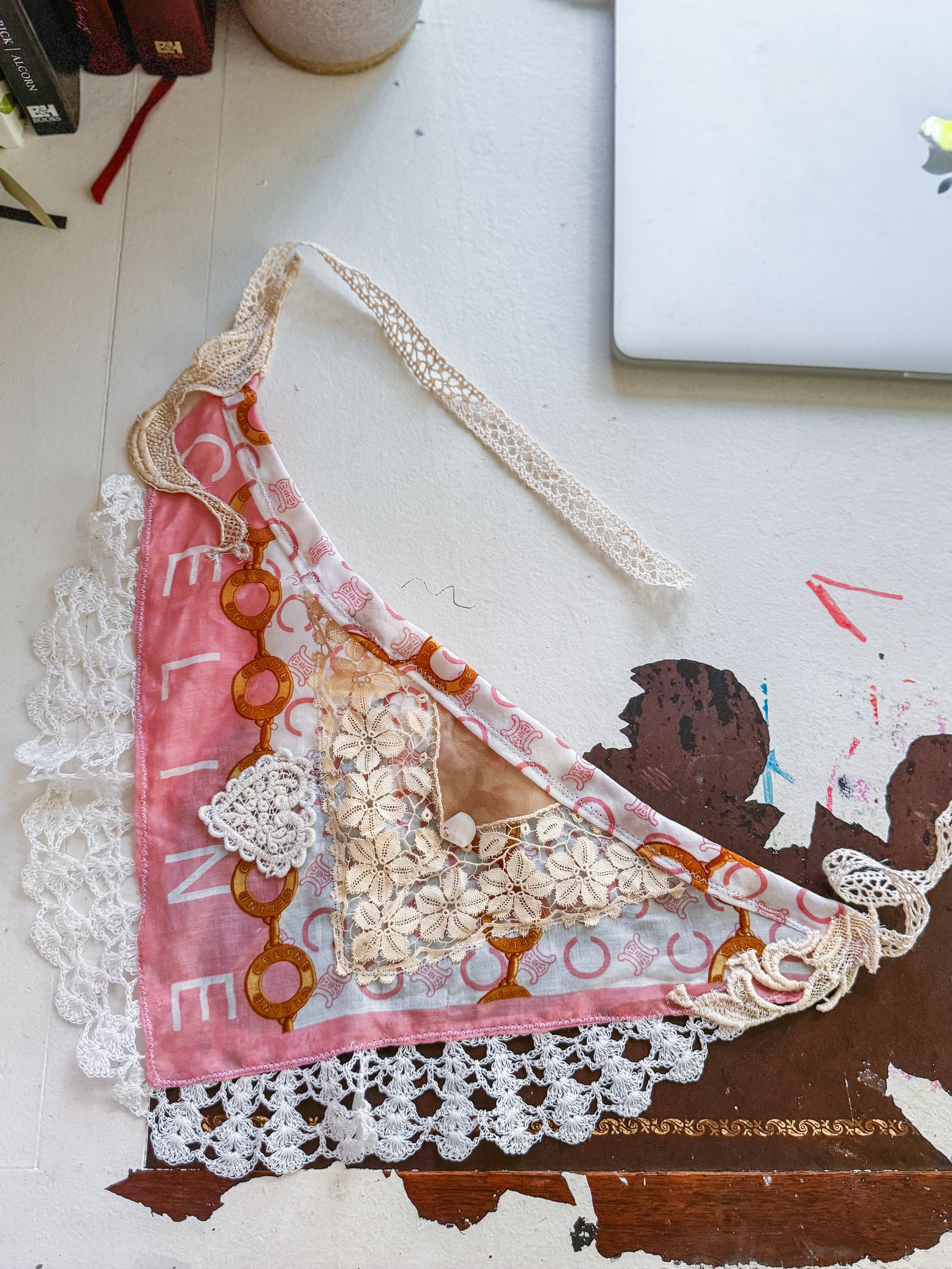 Vintage Celine scarf remnant repurposed into a head scarf/ bandana. Scarf is embellished with an antique lace collar, tatted lace heart appliqué and an antique lace cuff. Lace trim finishes her off. Easily ties around head or neck.