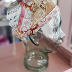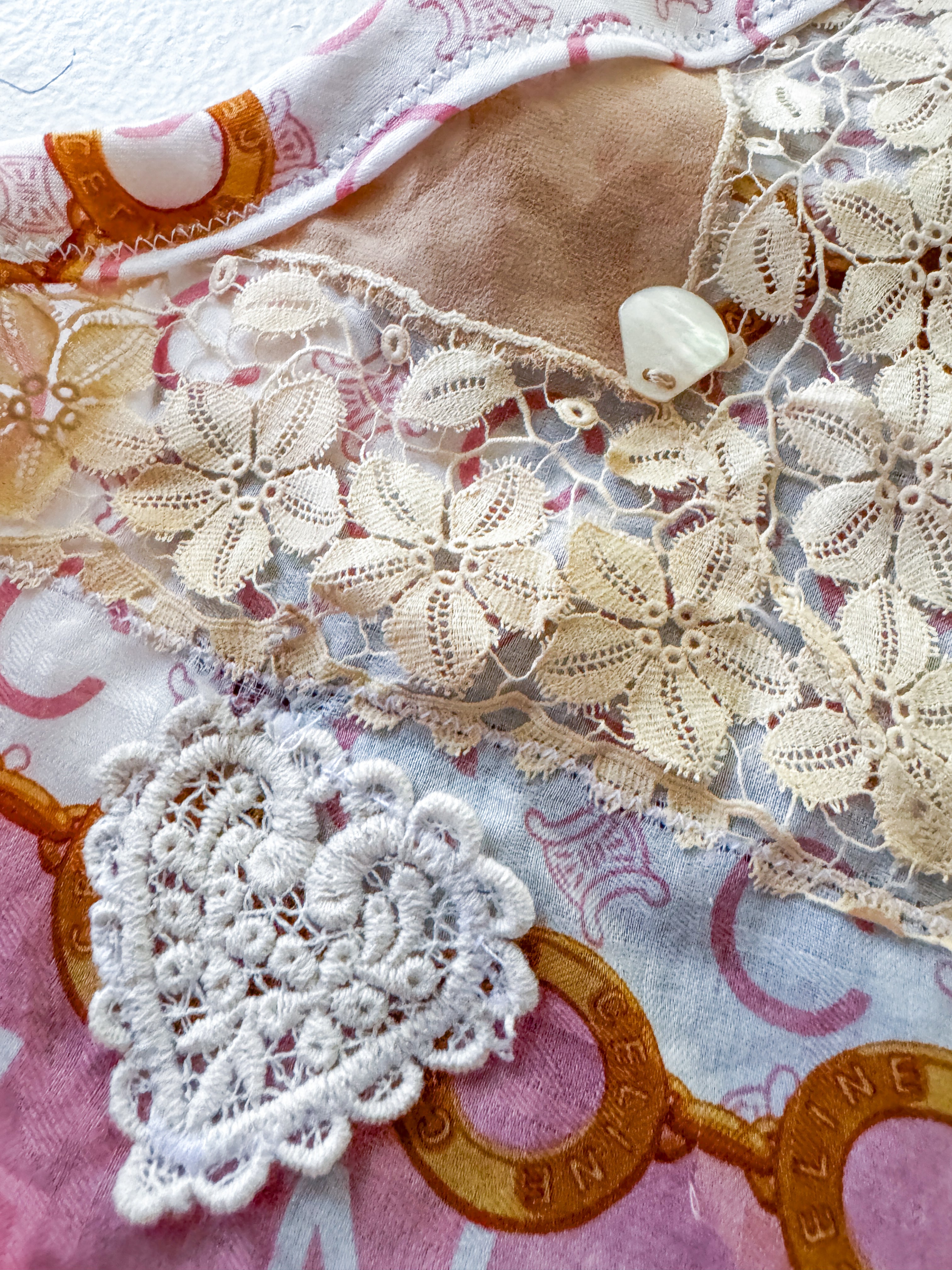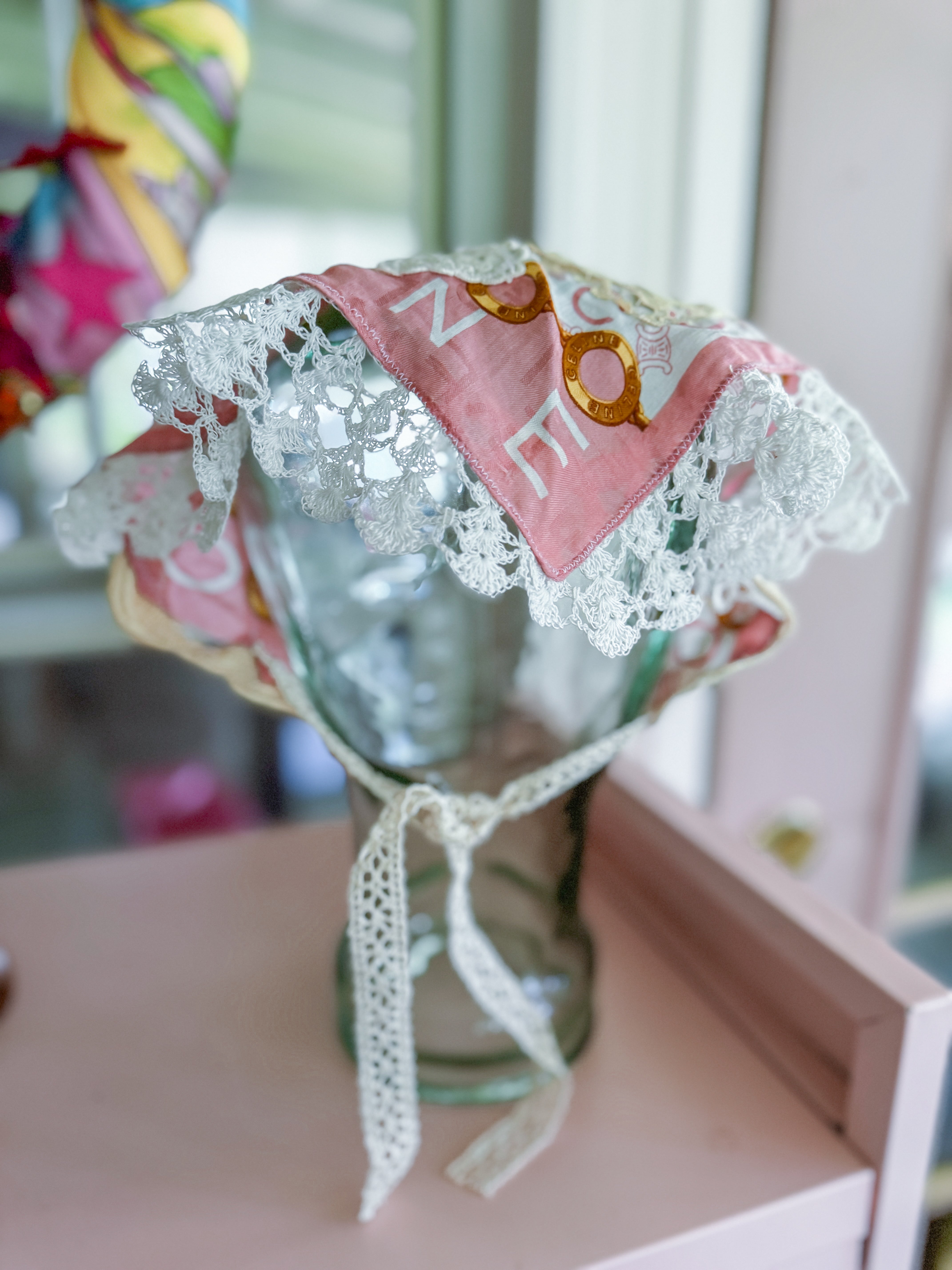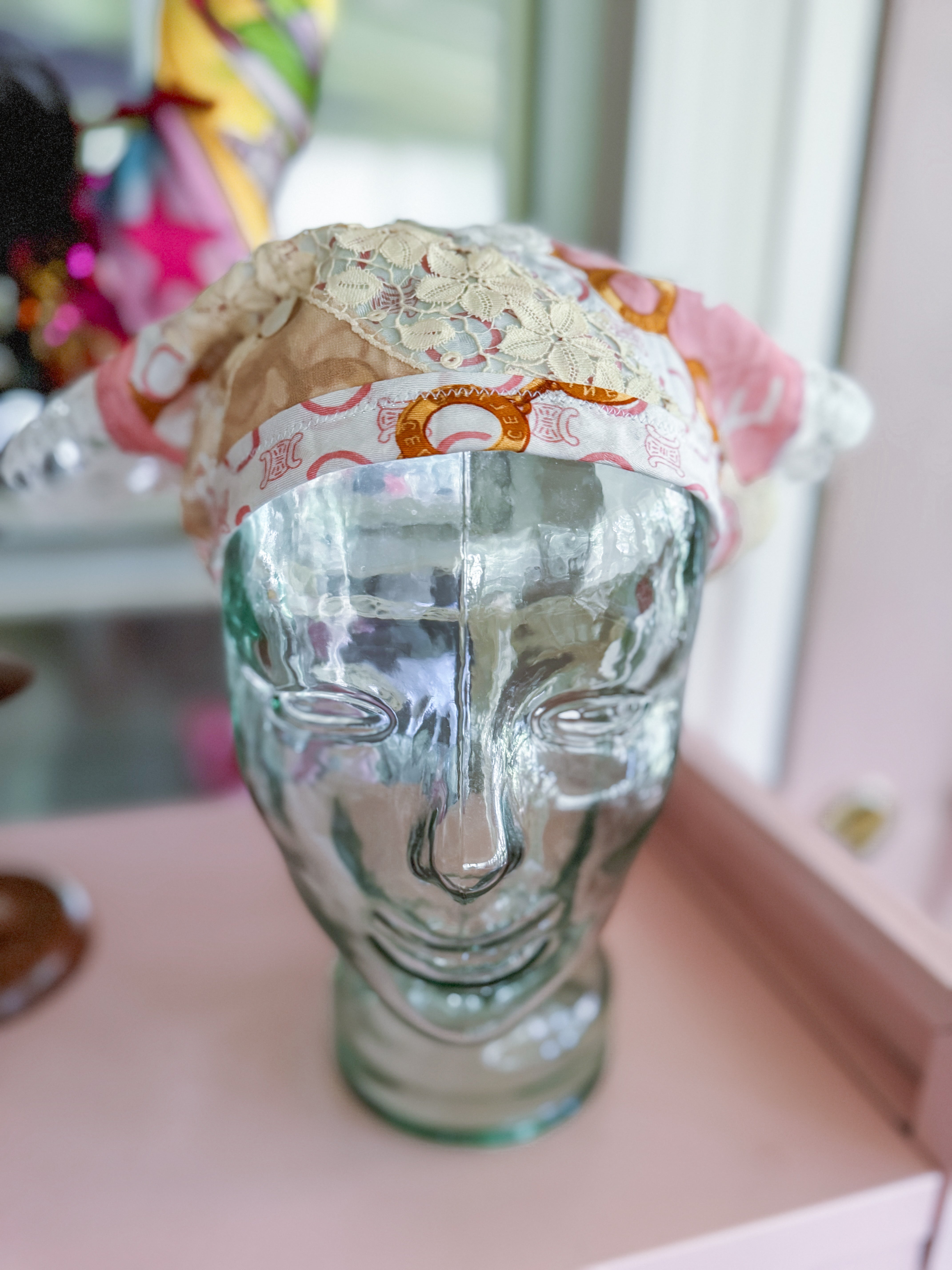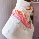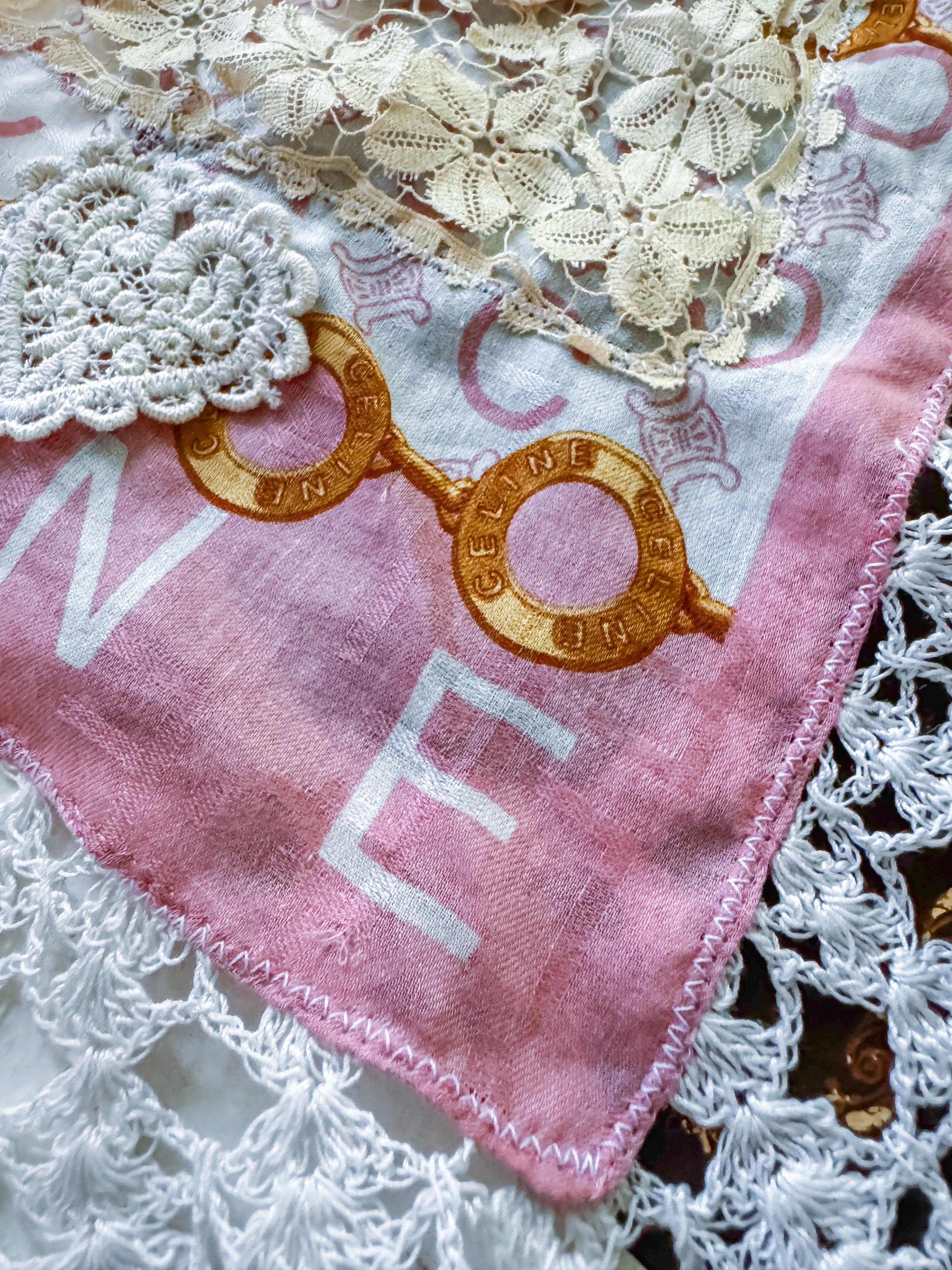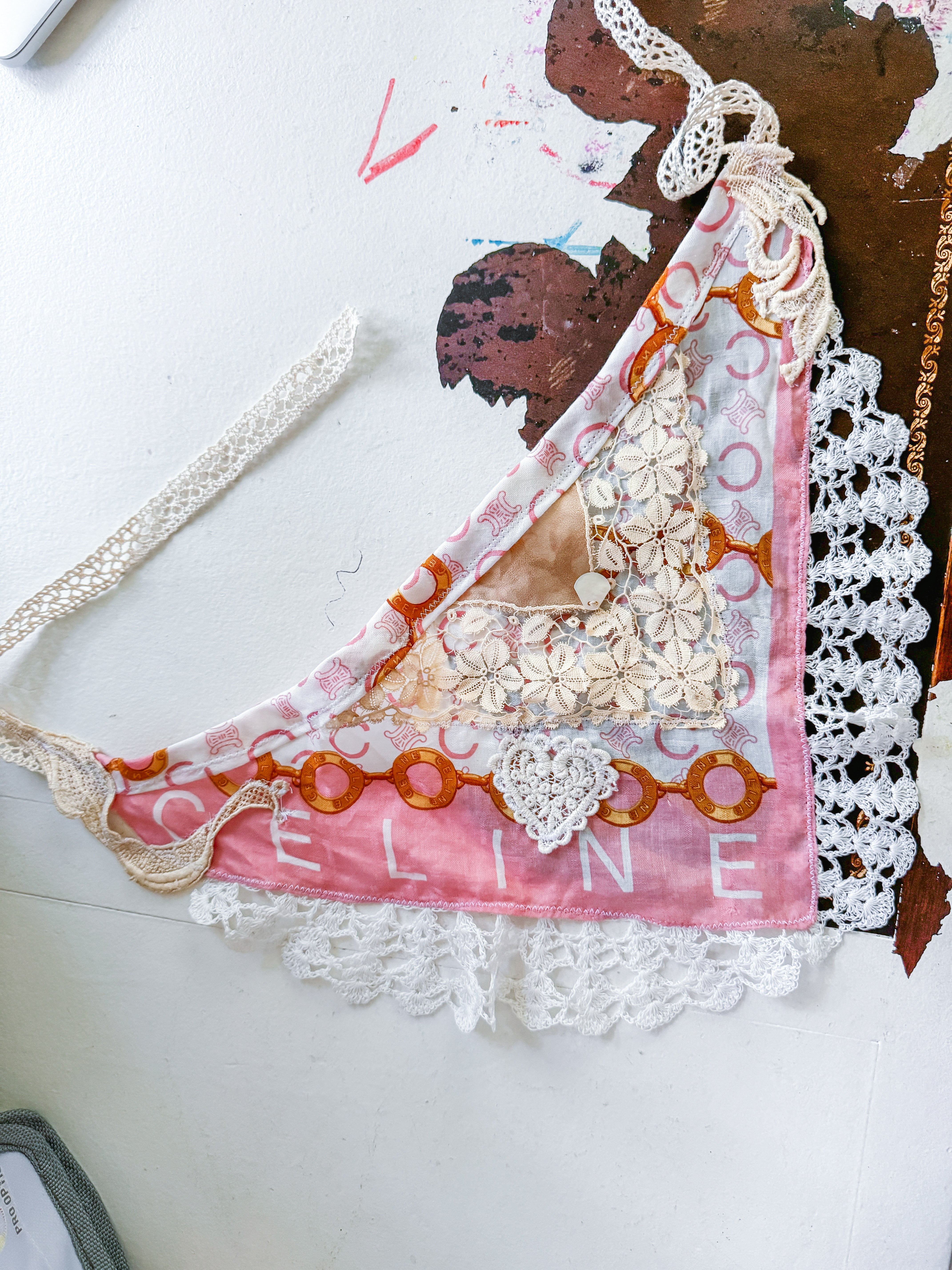 Vintage Celine scarf remnant repurposed into a head scarf/ bandana. Scarf is embellished with an antique lace collar, tatted lace heart appliqué and an antique lace cuff. Lace trim finishes her off. Easily ties around head or neck.