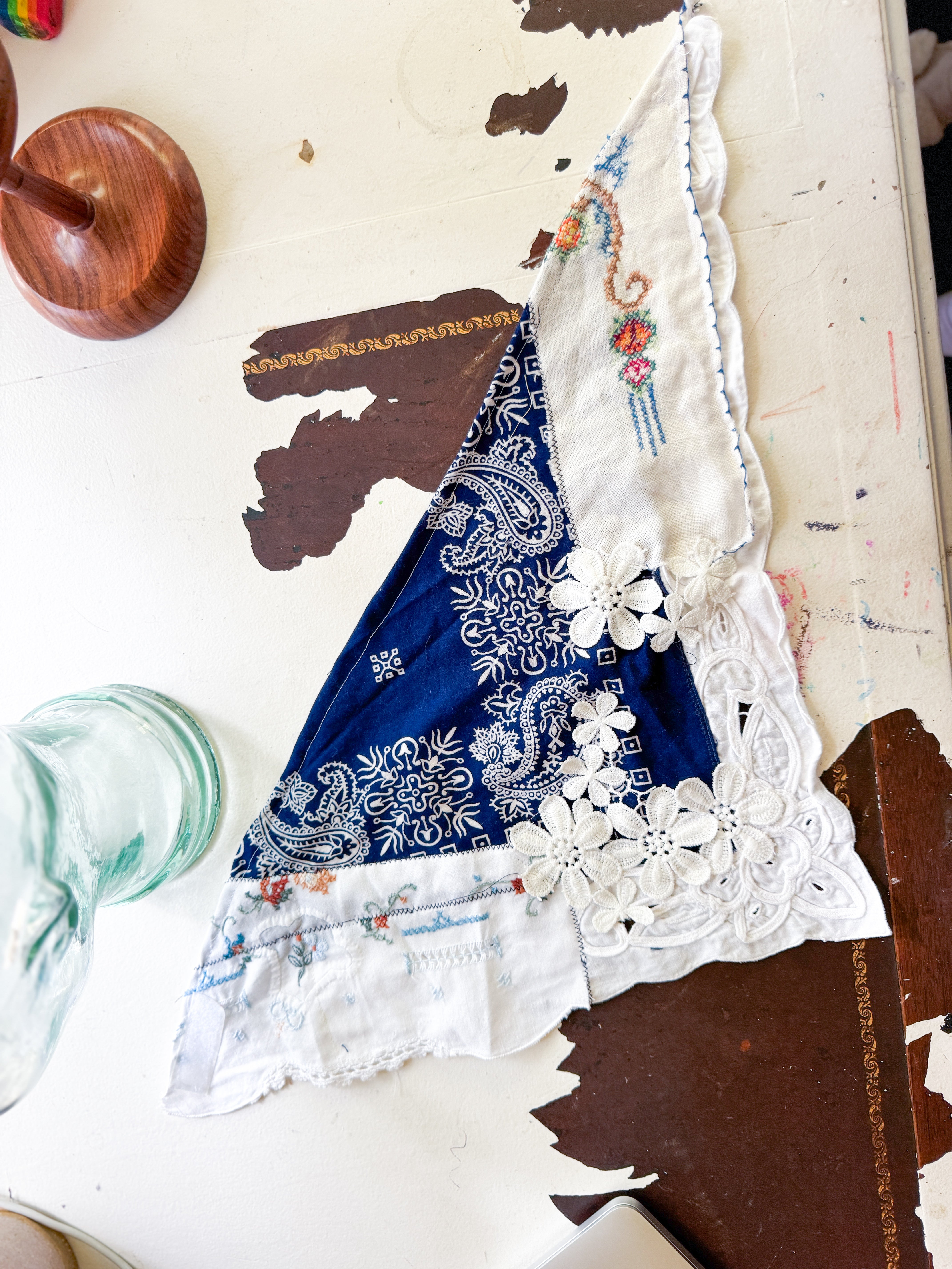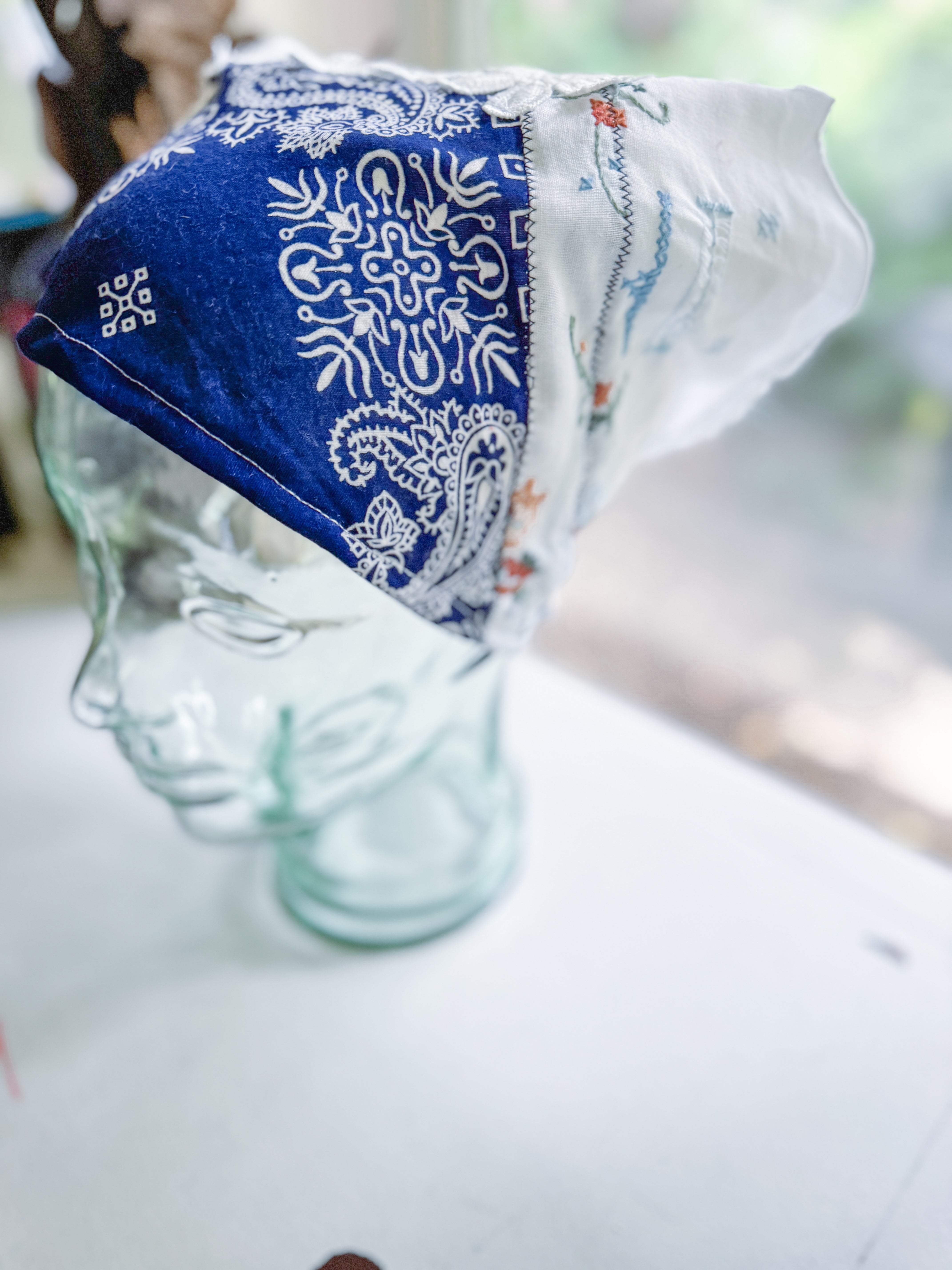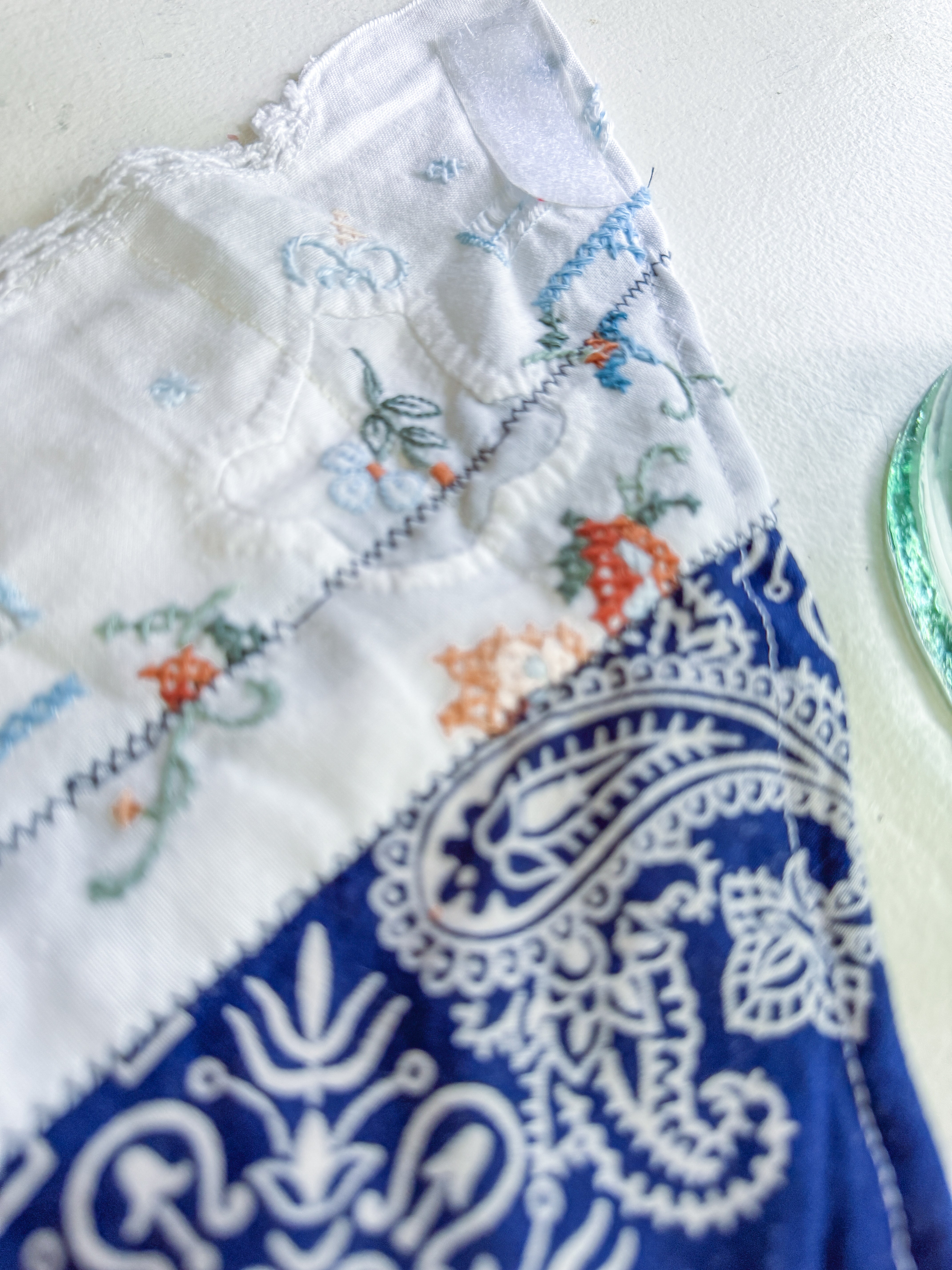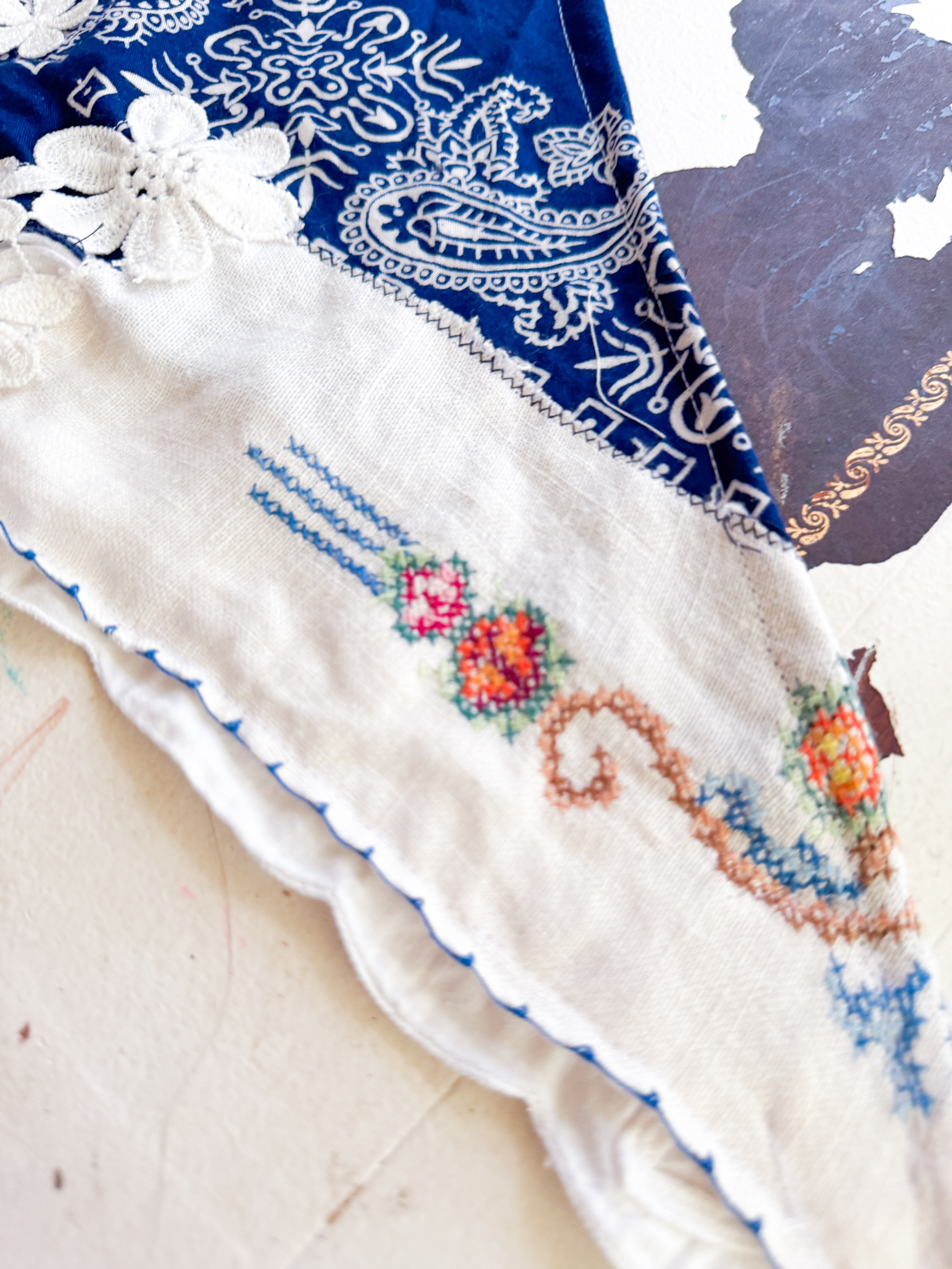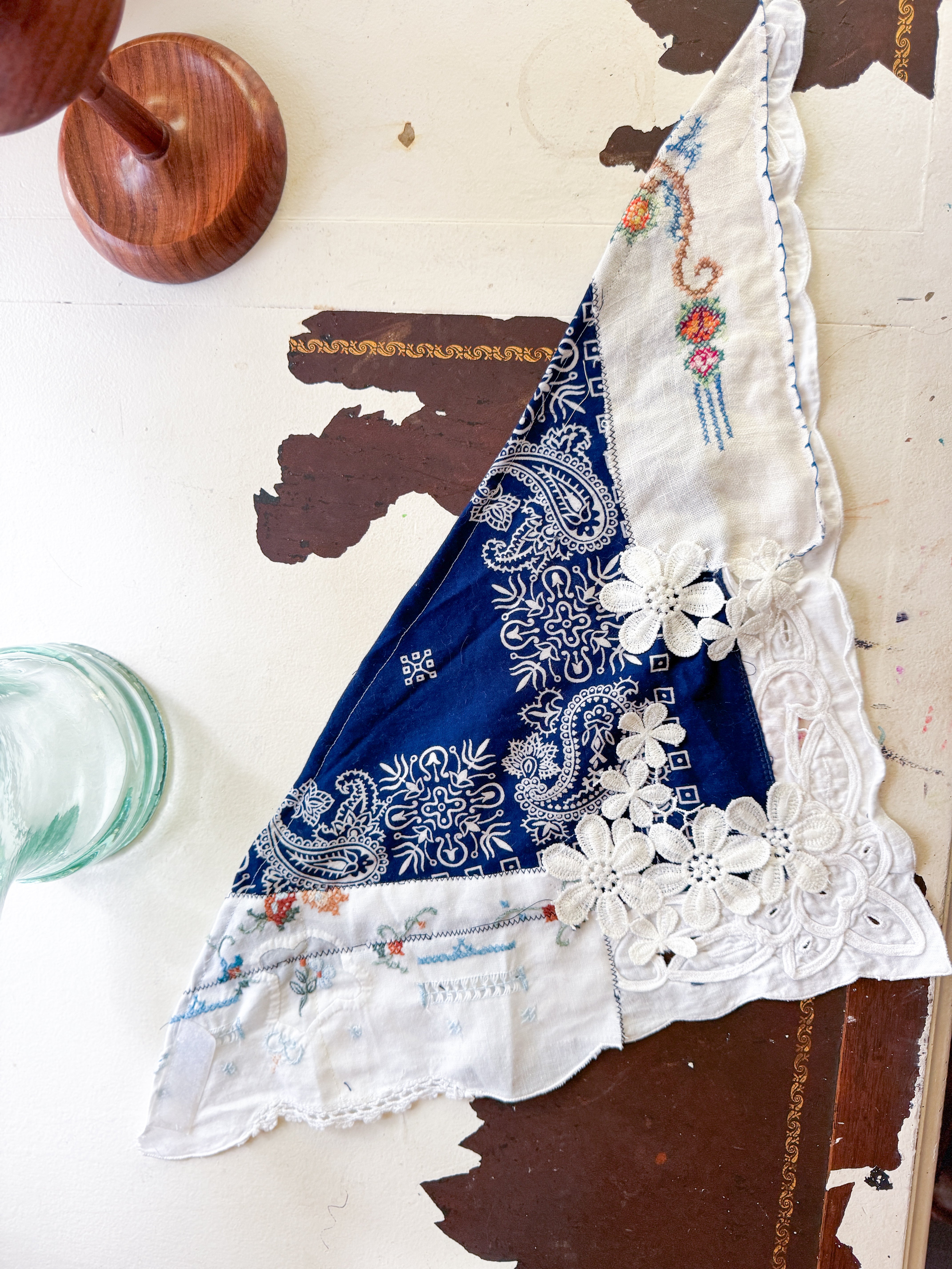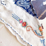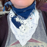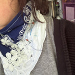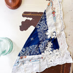 Vintage bandana scarf remnant repurposed into a shabby chic head scarf/ bandana. Embellished with a vintage table runner remnant, vintage hand embroidered table linens and floral trim appliqué. Easily closes in back with velcro. Absolutely One of a Kind 💫
