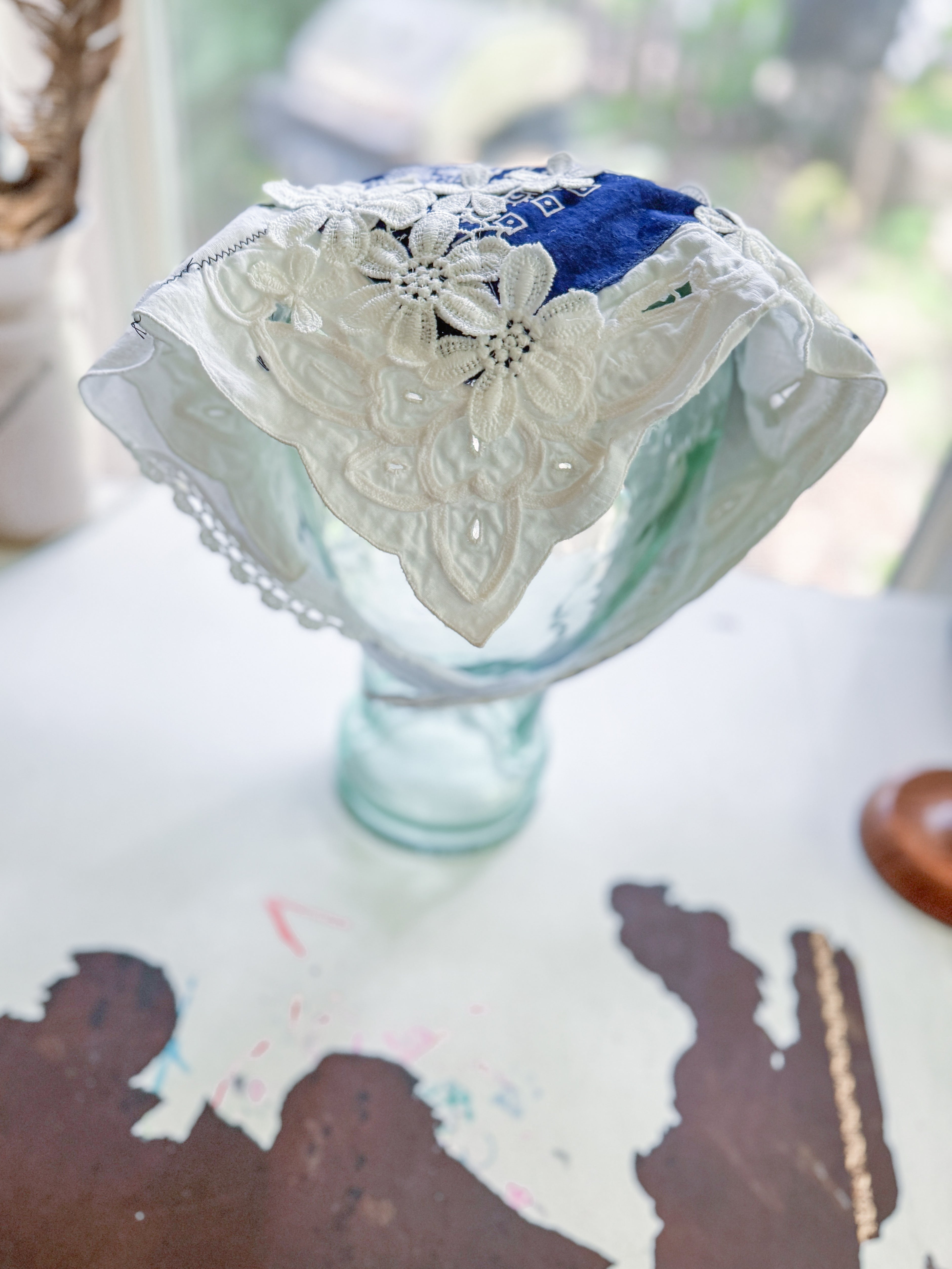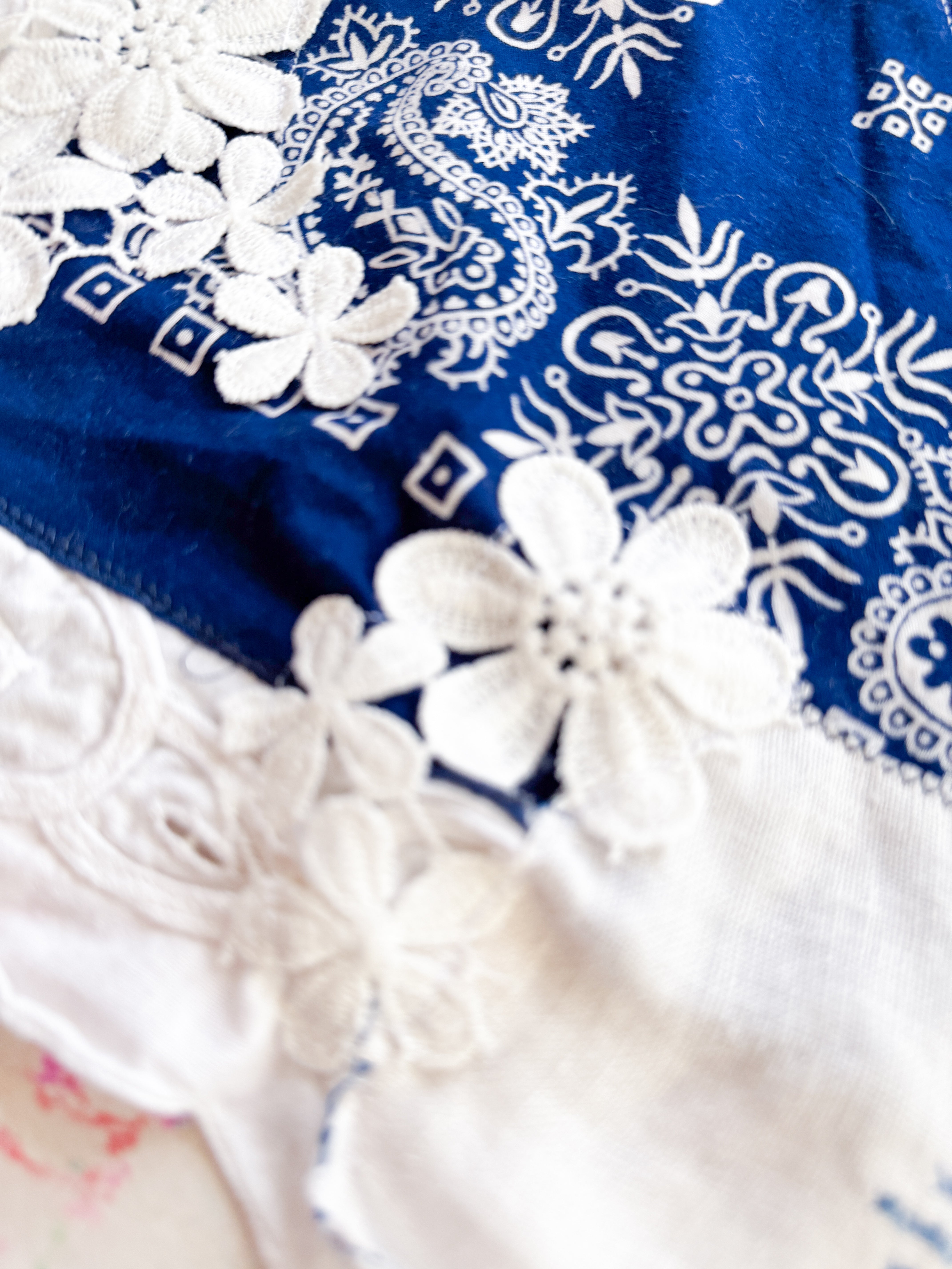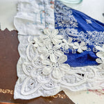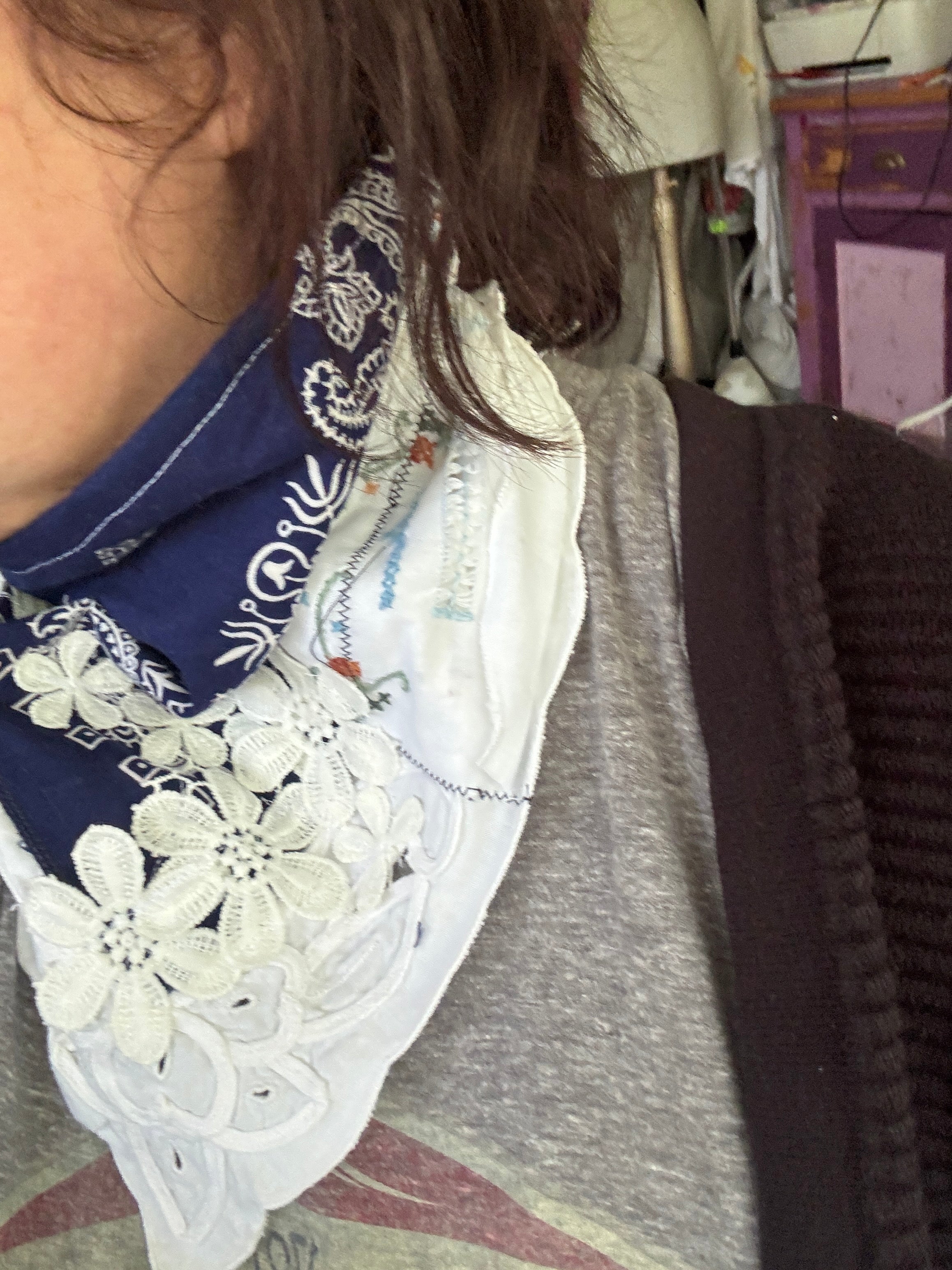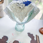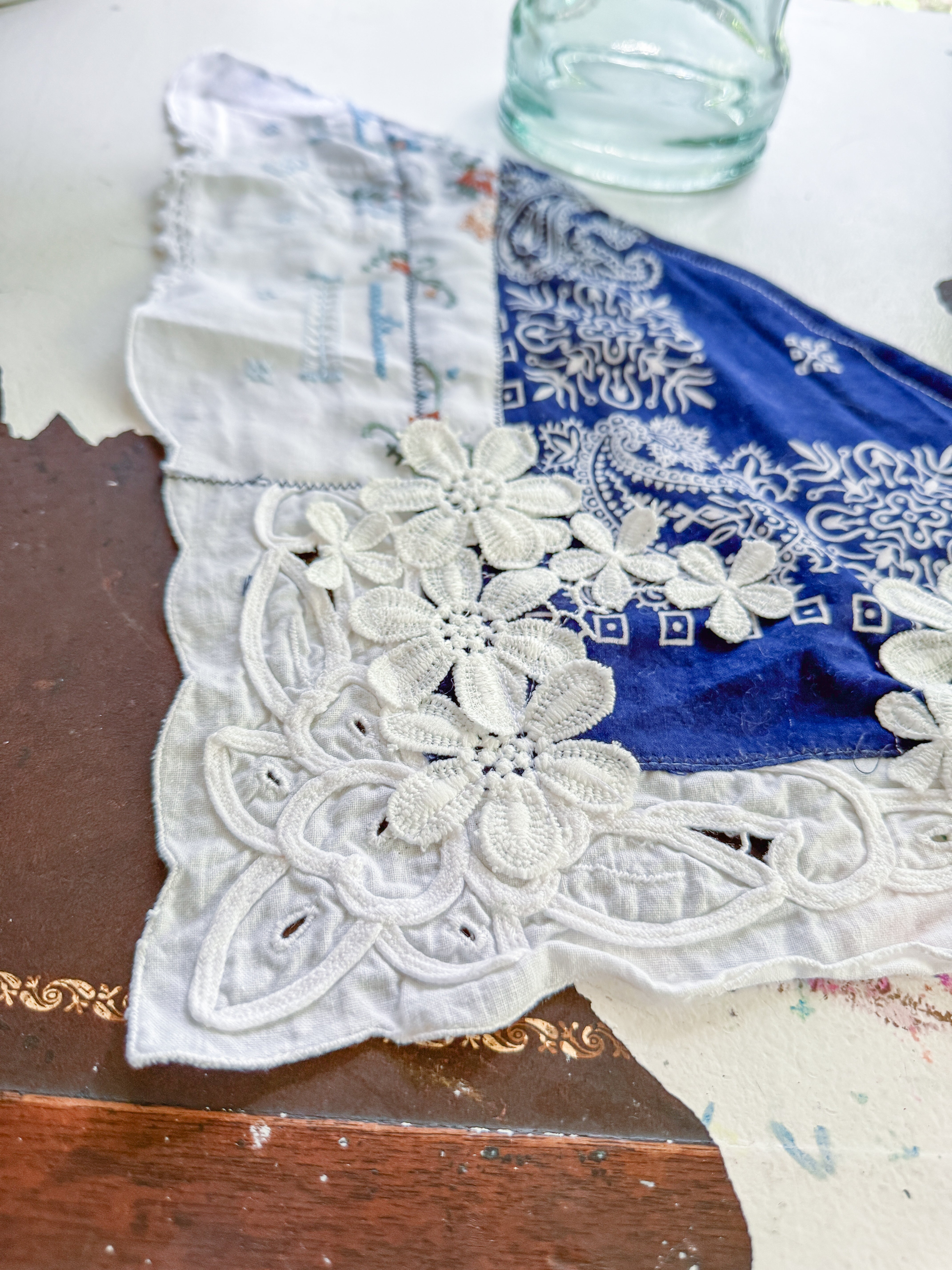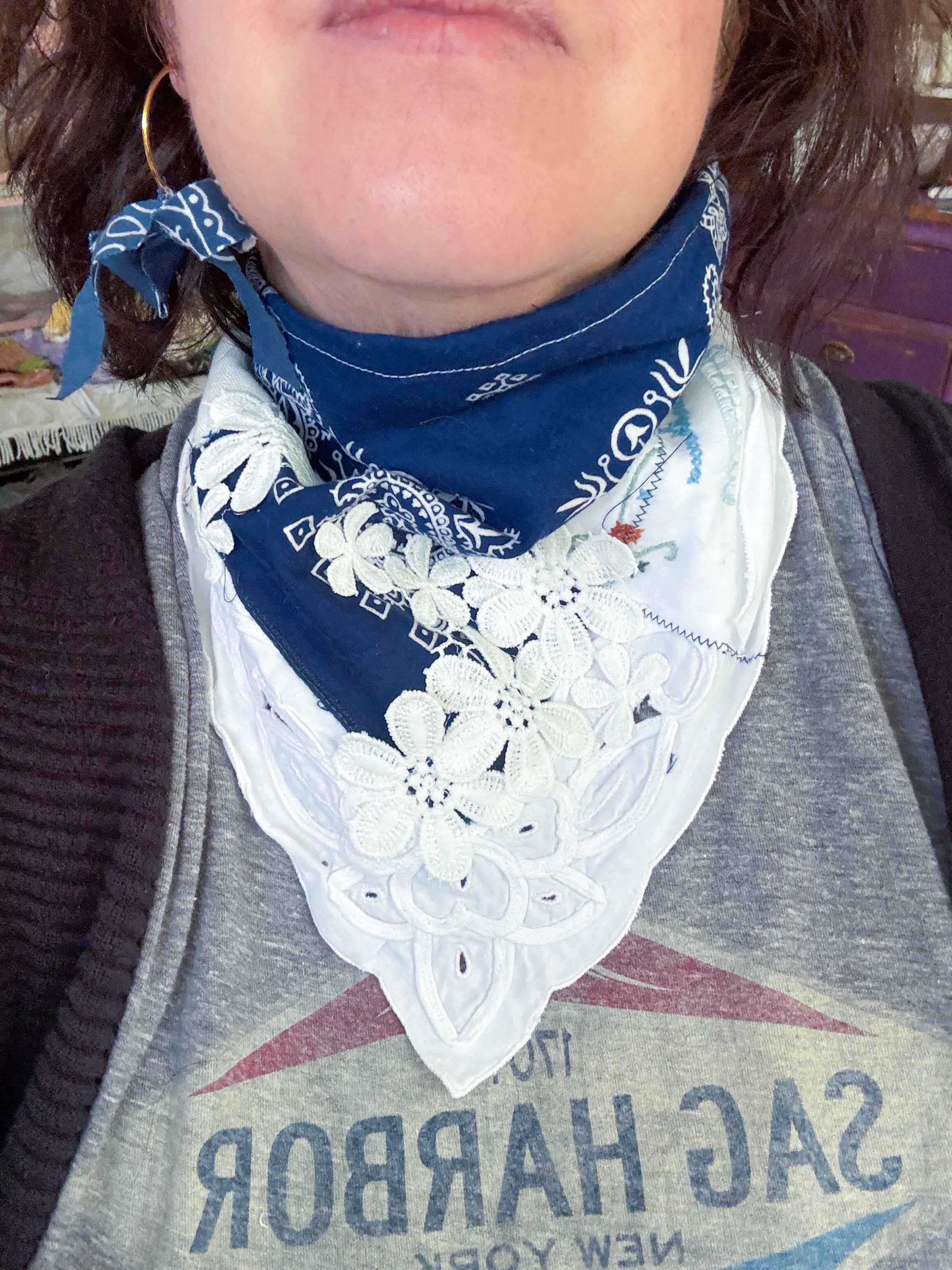 Vintage bandana scarf remnant repurposed into a shabby chic head scarf/ bandana. Embellished with a vintage table runner remnant, vintage hand embroidered table linens and floral trim appliqué. Easily closes in back with velcro. Absolutely One of a Kind 💫