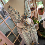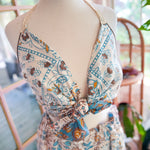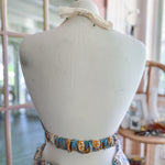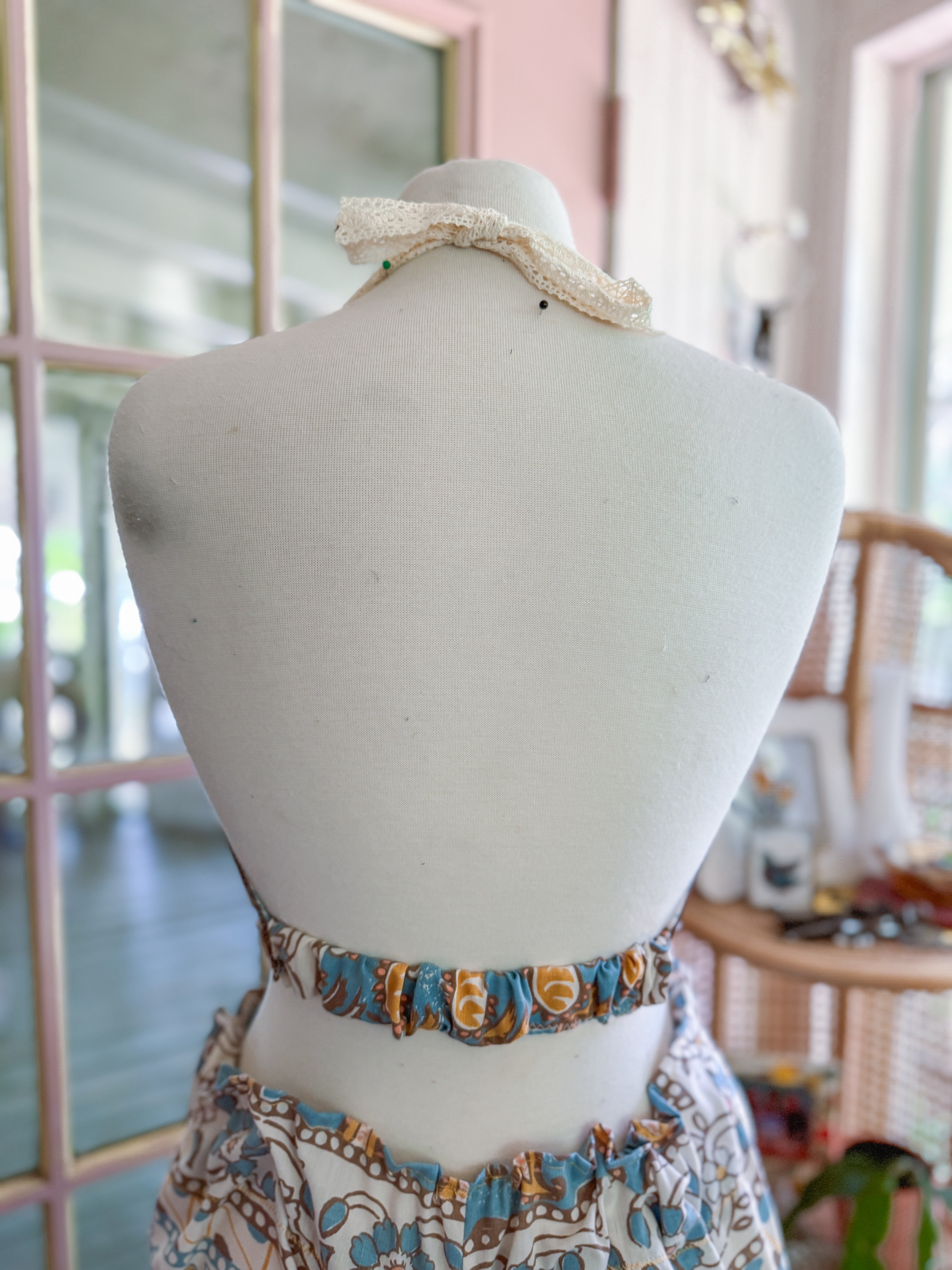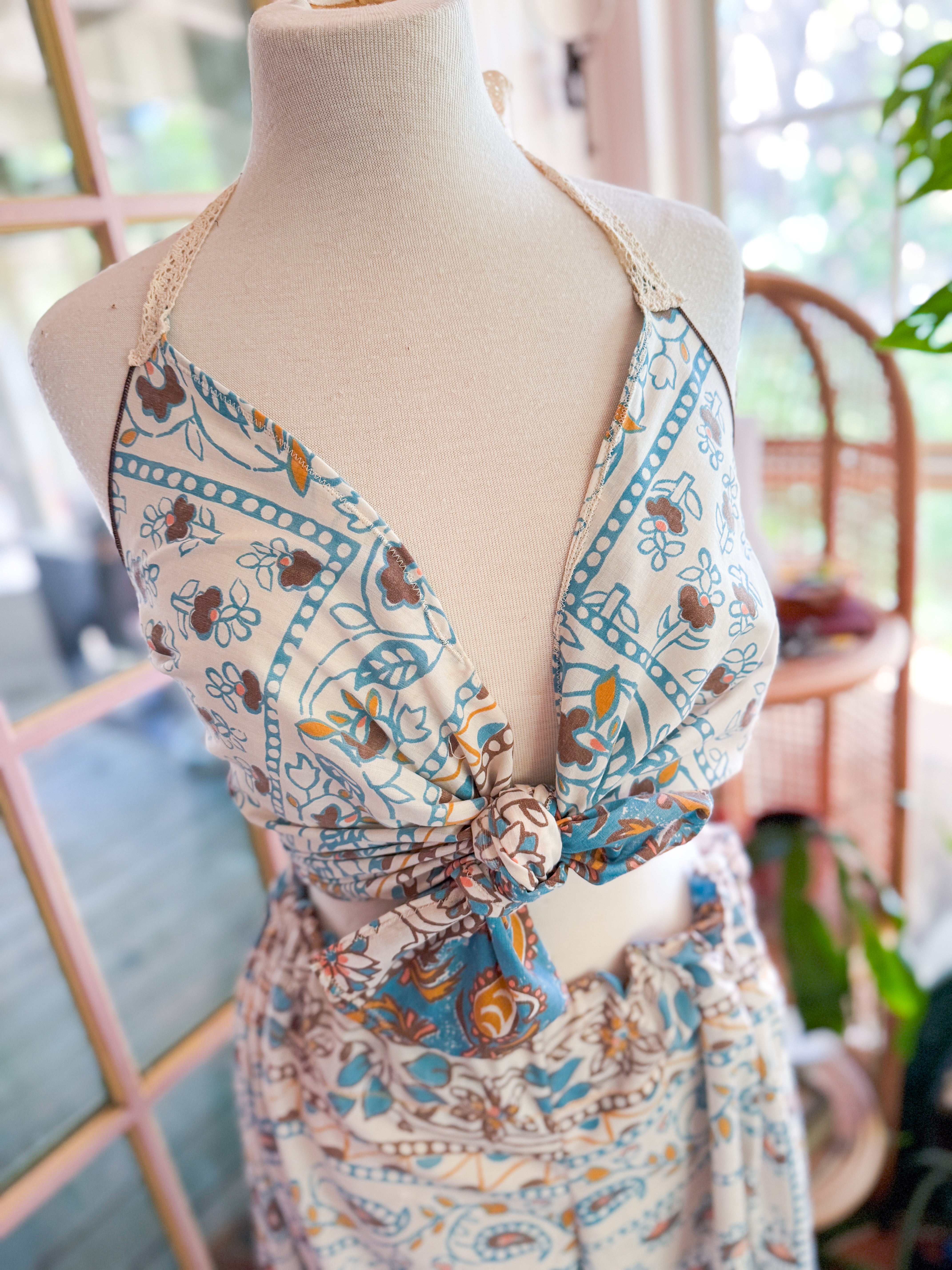 1970's cotton table linen is magically transformed into a halter top with matching shawl/hip scarf) Adjustable bust that ties in front, lace neck ties and elastic in back. Pair her with the matching pants and shawl (both sold separately) for the perfect lounge set! Equally cute paired with a high waisted flared jeans!