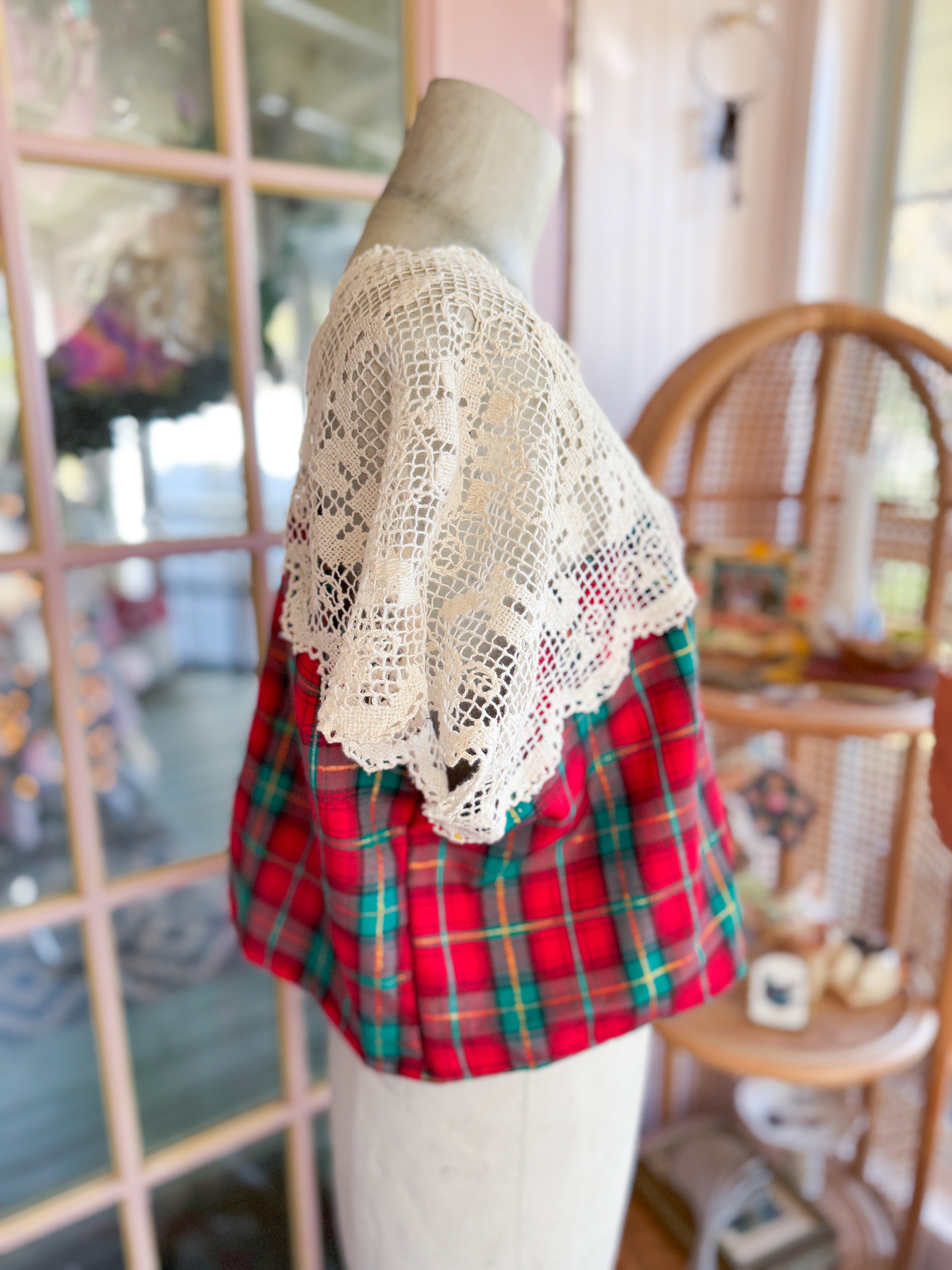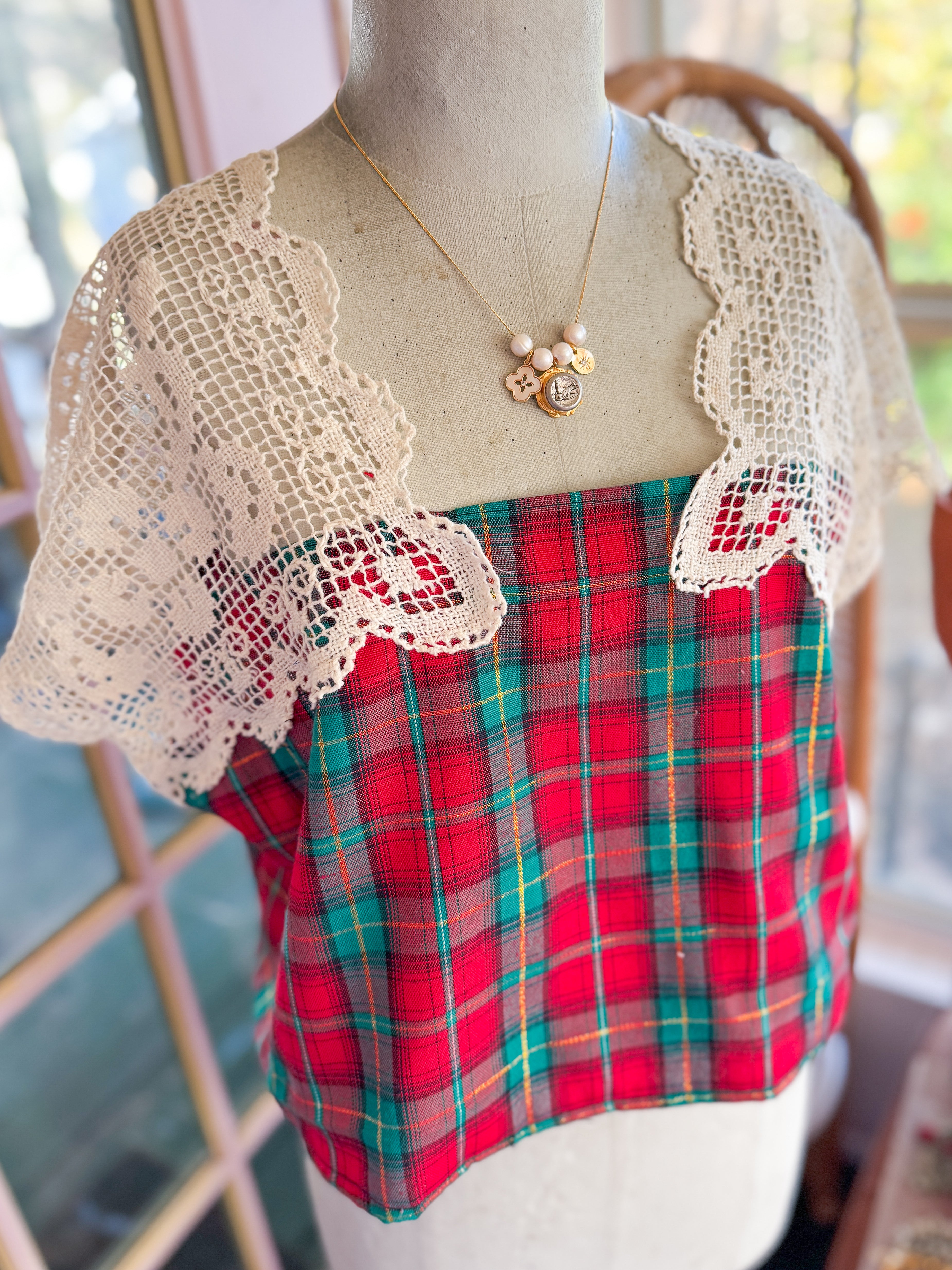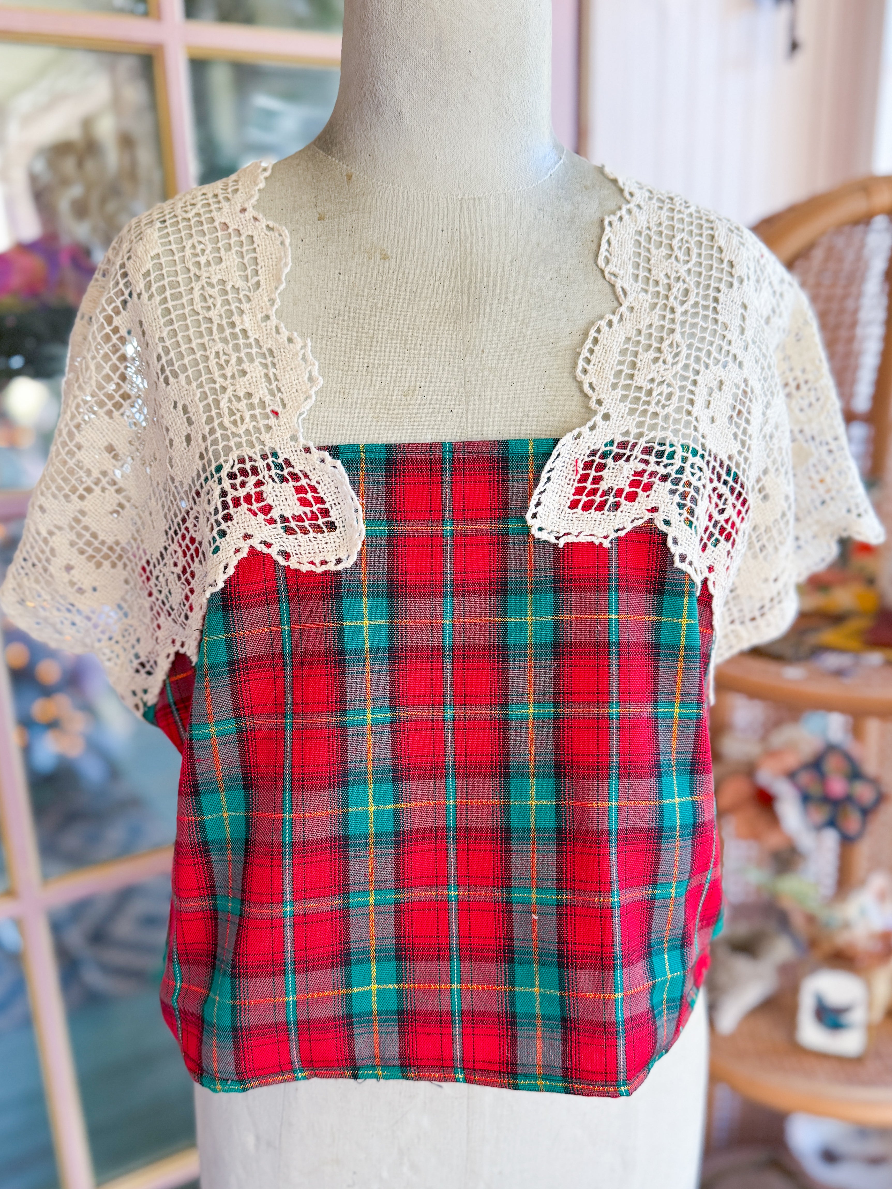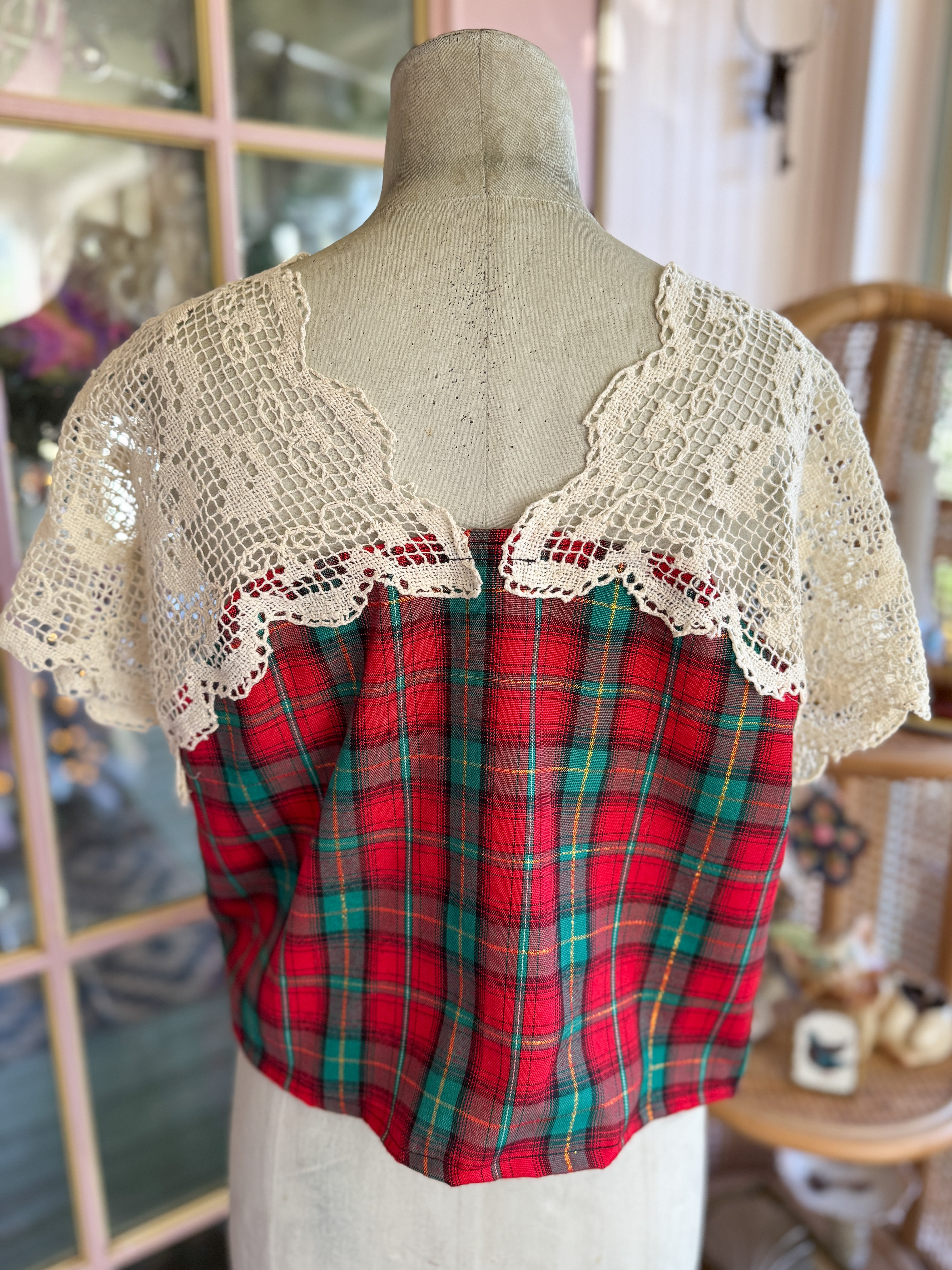 Vintage plaid table linens given new life when transformed into a boxy cropped top with vintage Italian lace table runners as sleeves! One of a kind! One size fits most. She fits Xs- M best. Mannequin is a 4/6.