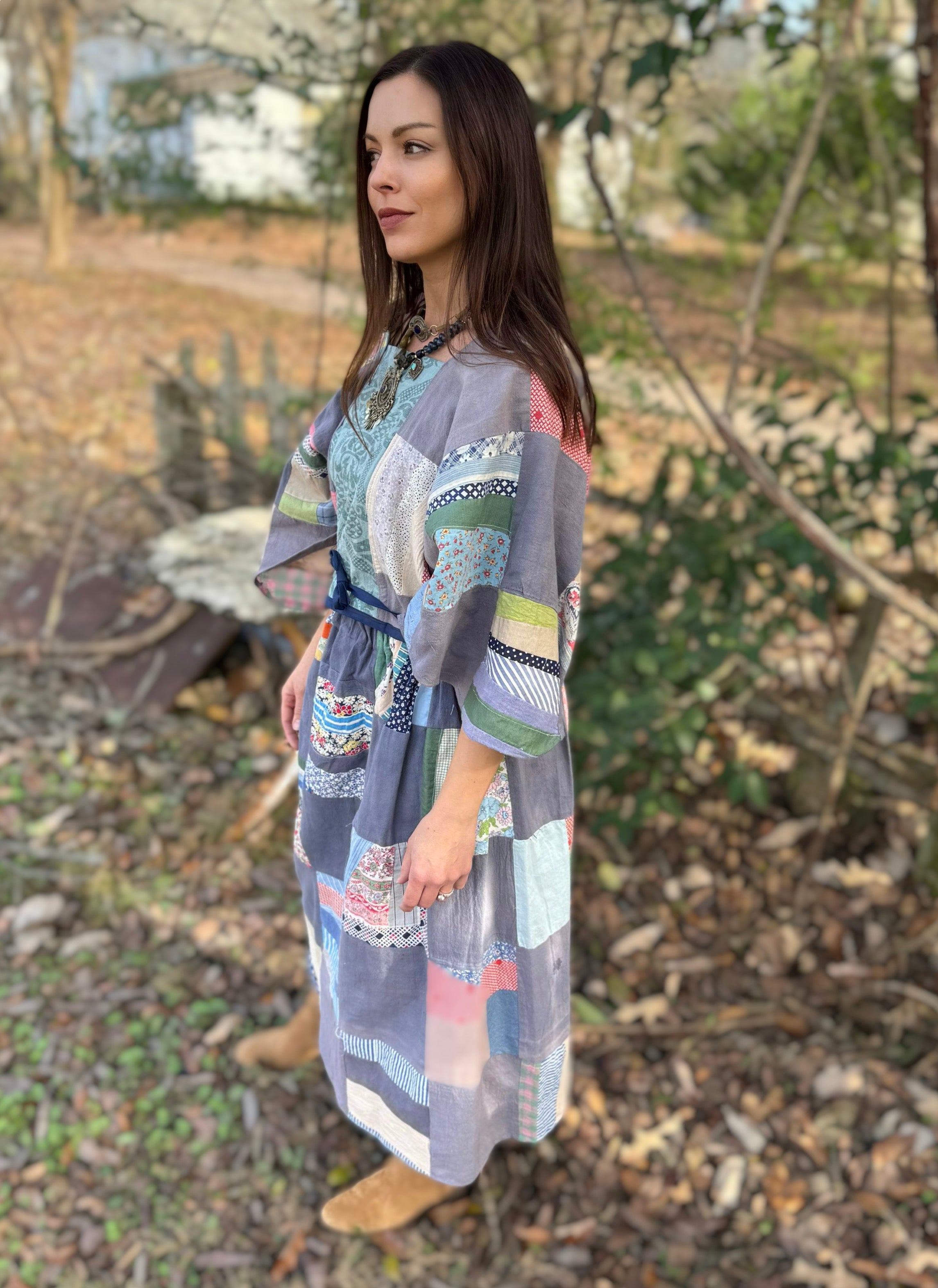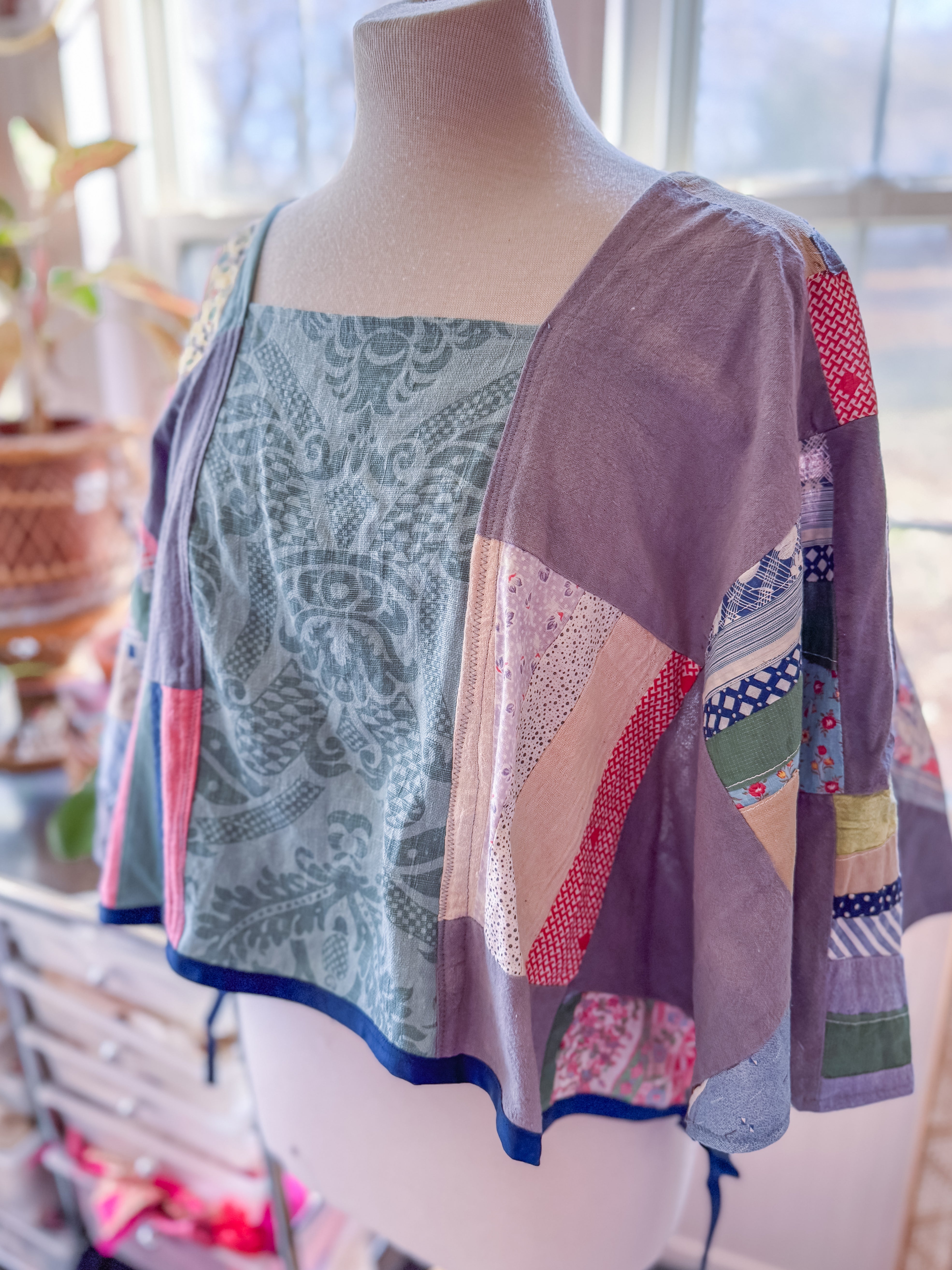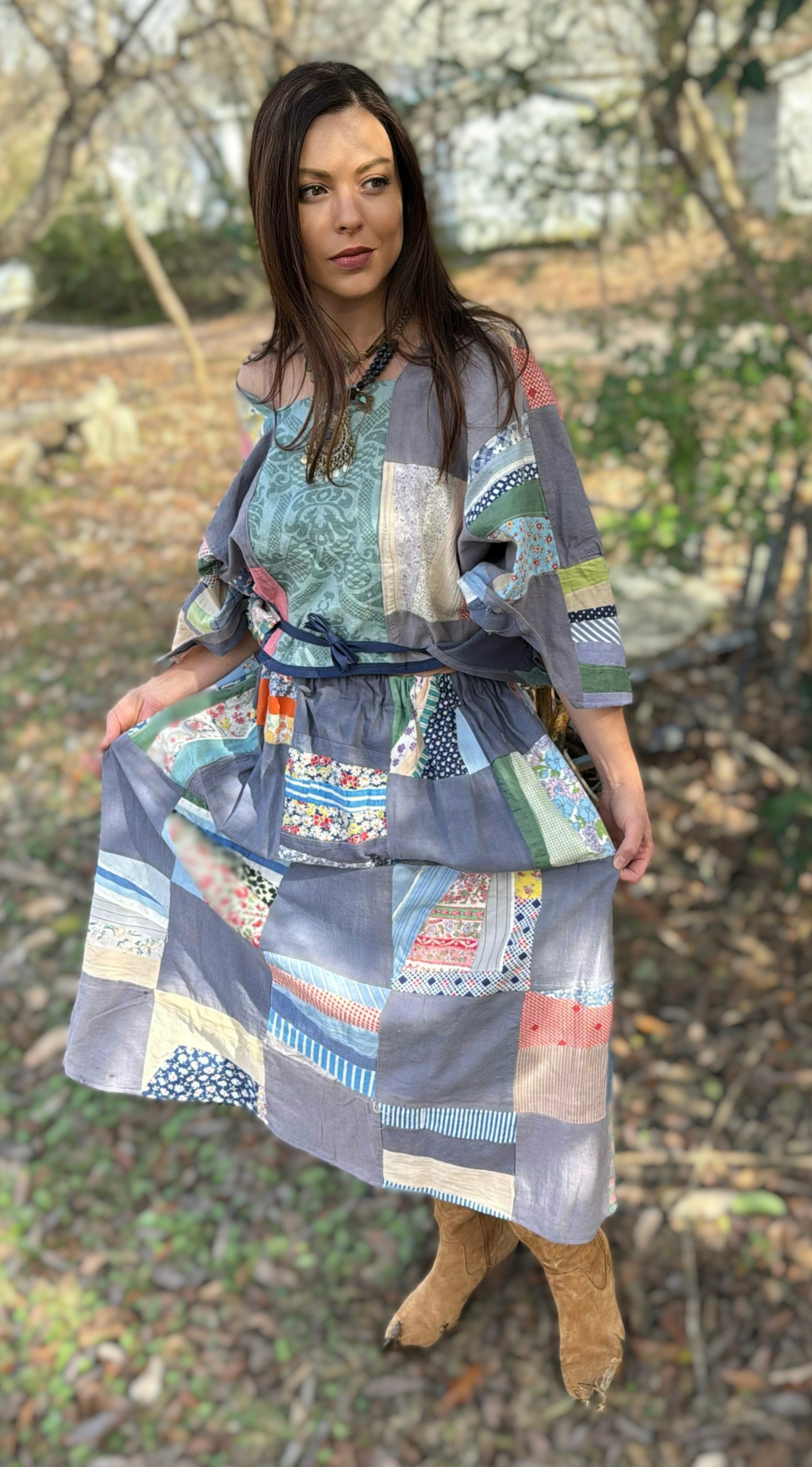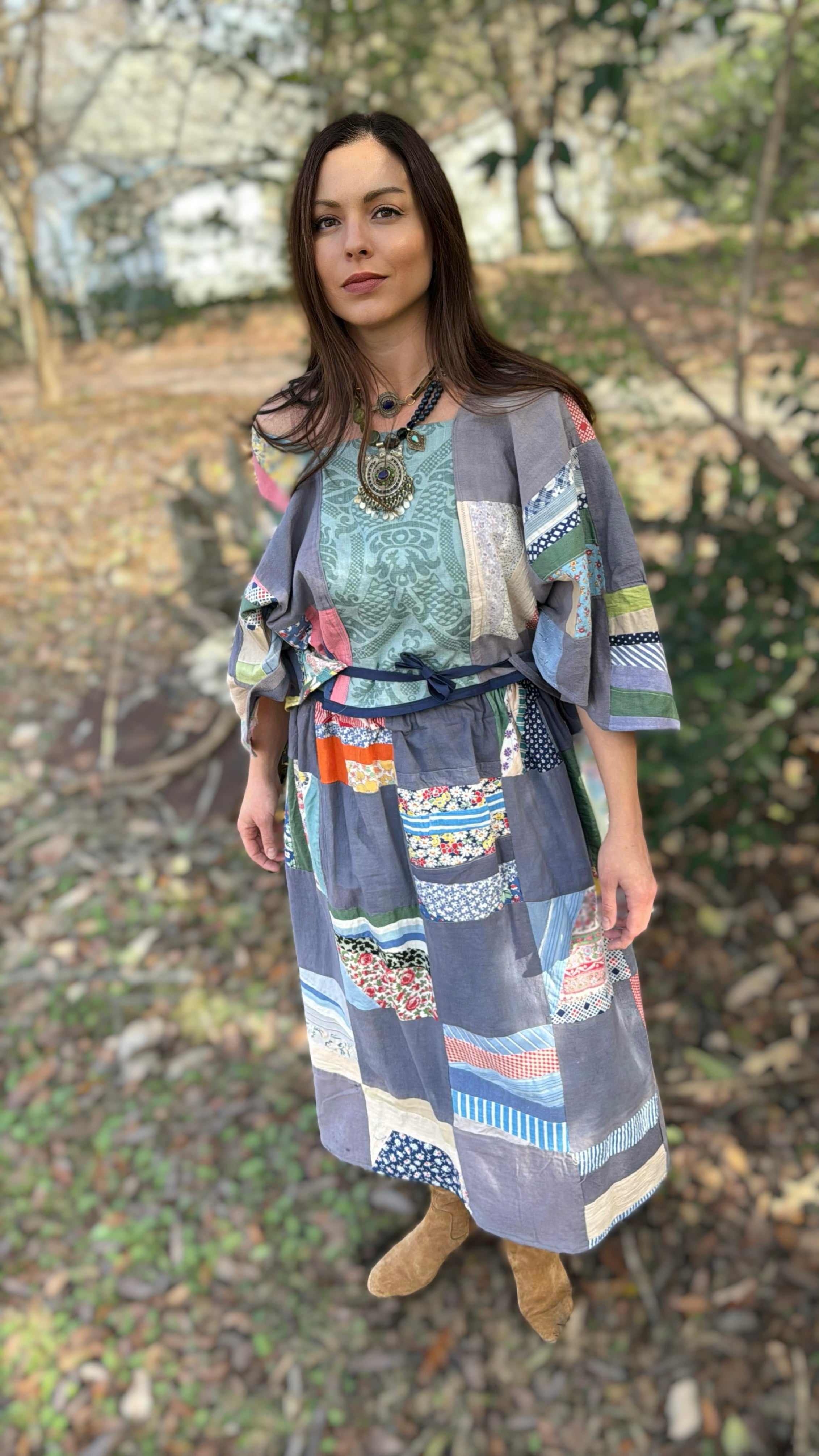 Early 1900’s quilt topper is paired with vintage linen fabric and transformed into to a ‘70’s style wrap top. Anna plays the guitar and loves a bonfire.