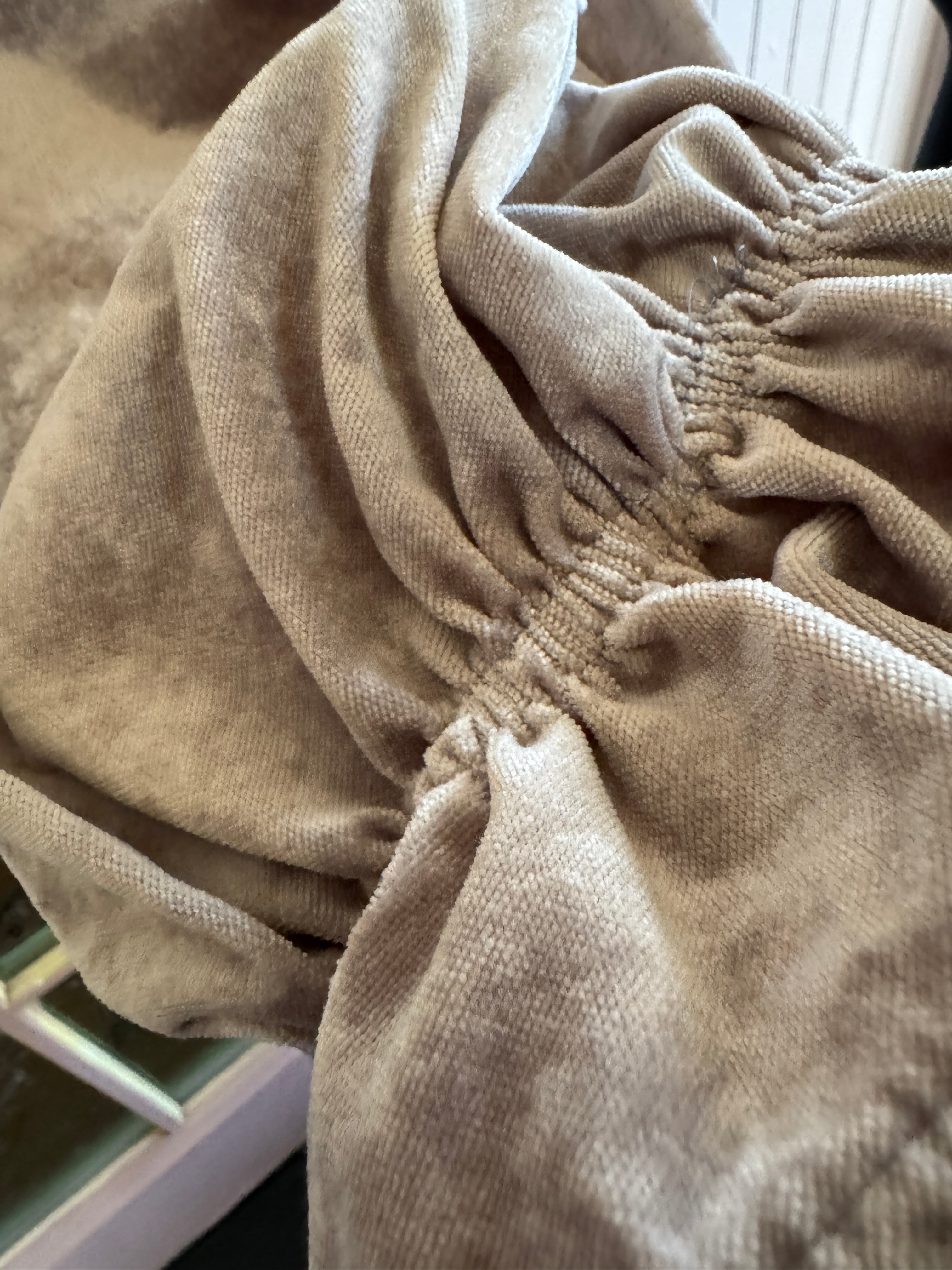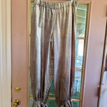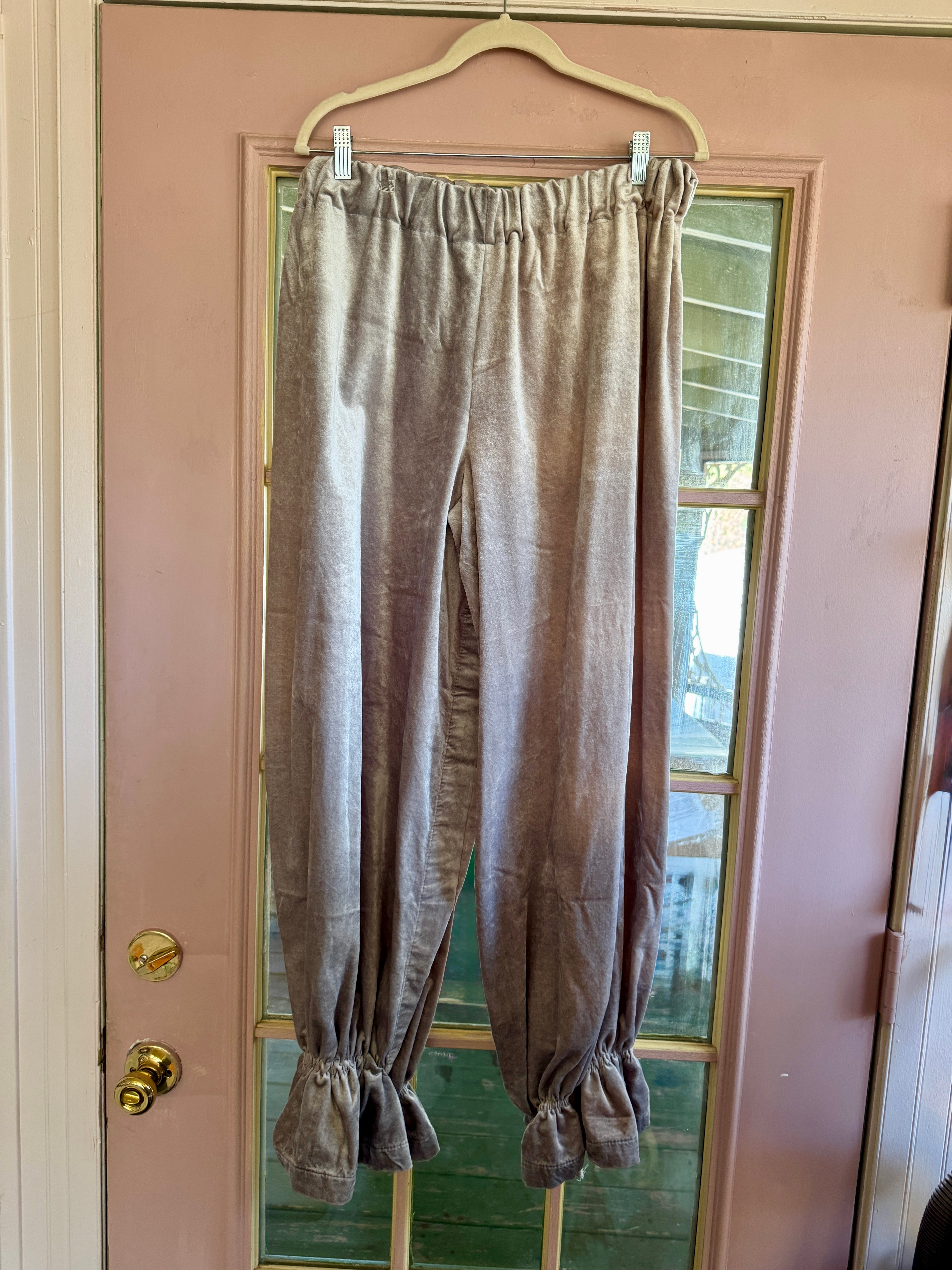 Vintage velvet curtains transformed into one of a kind bloomer lounge pants. She has an elastic waste to stretch for a loose fit and banded ruffle cuff. Mid rise. This pair is a bit more oversized with a wider leg.