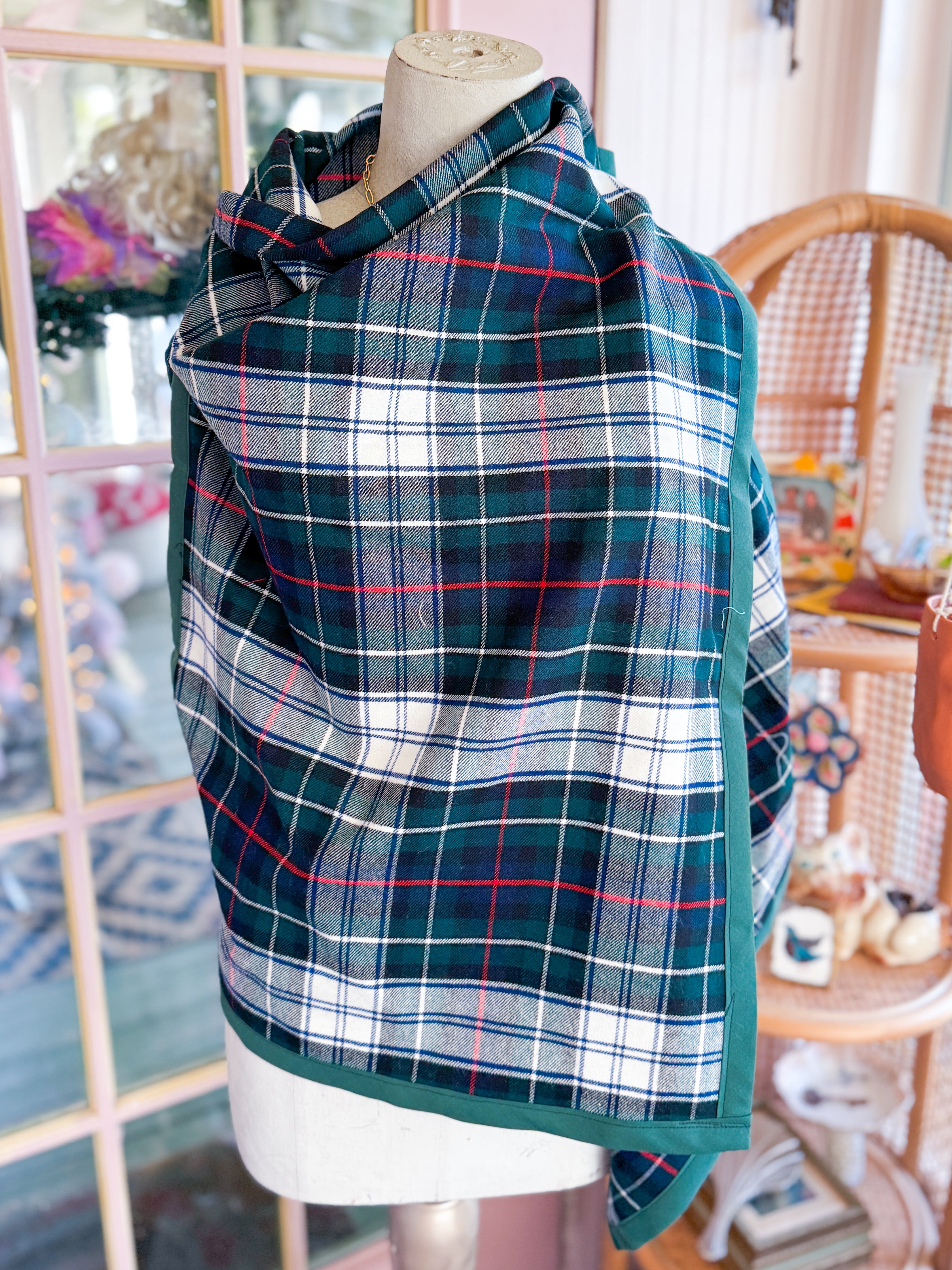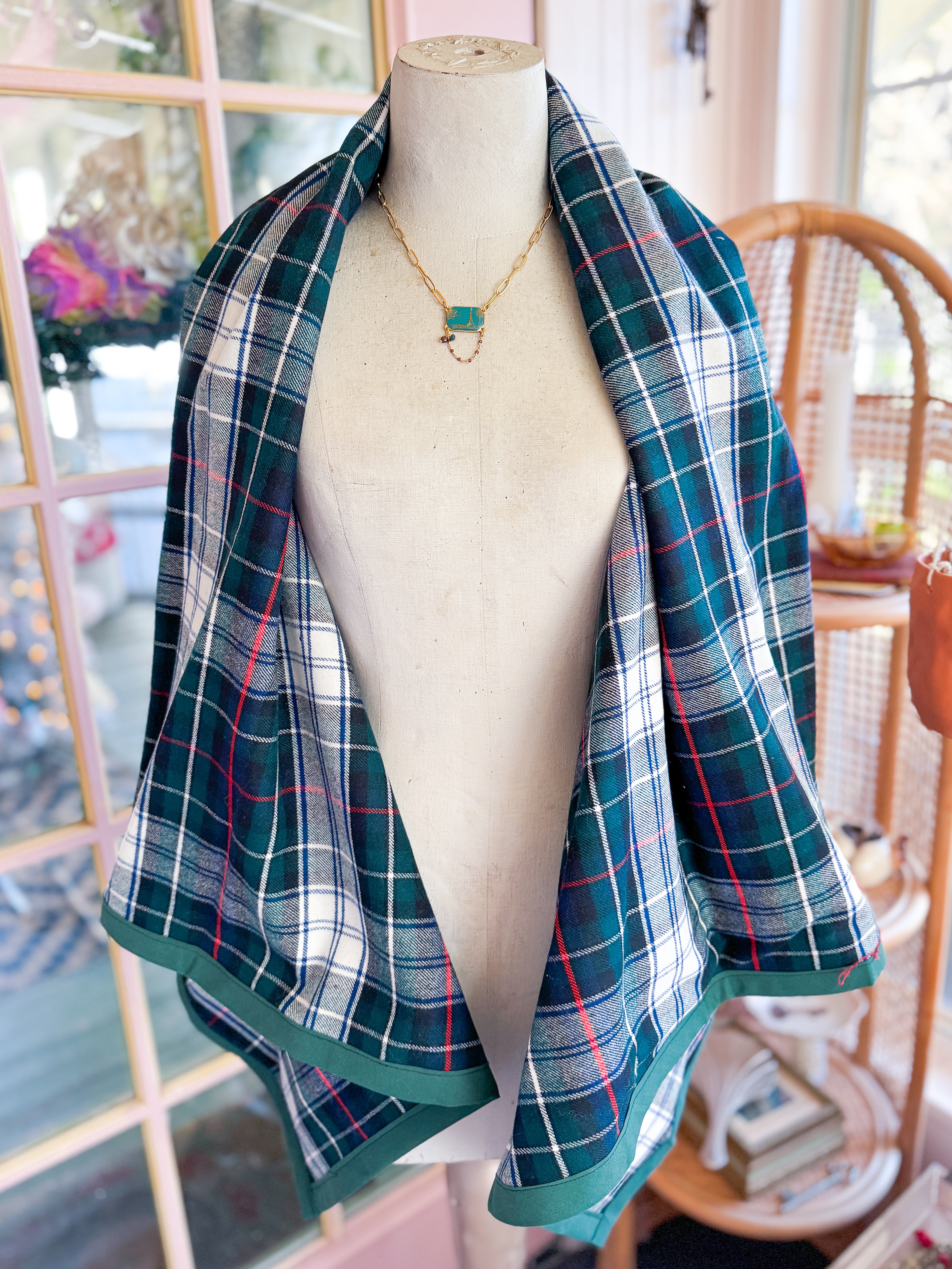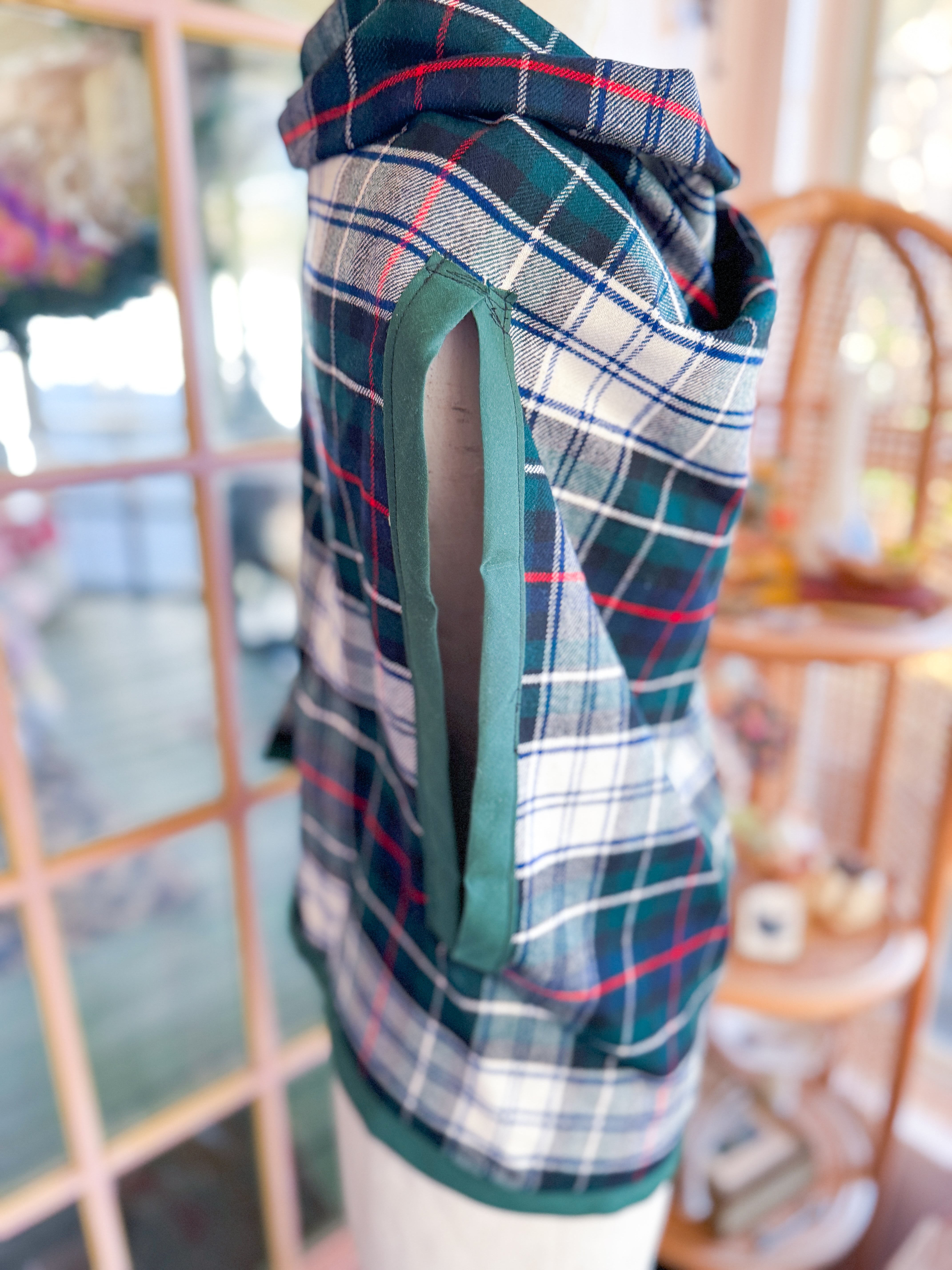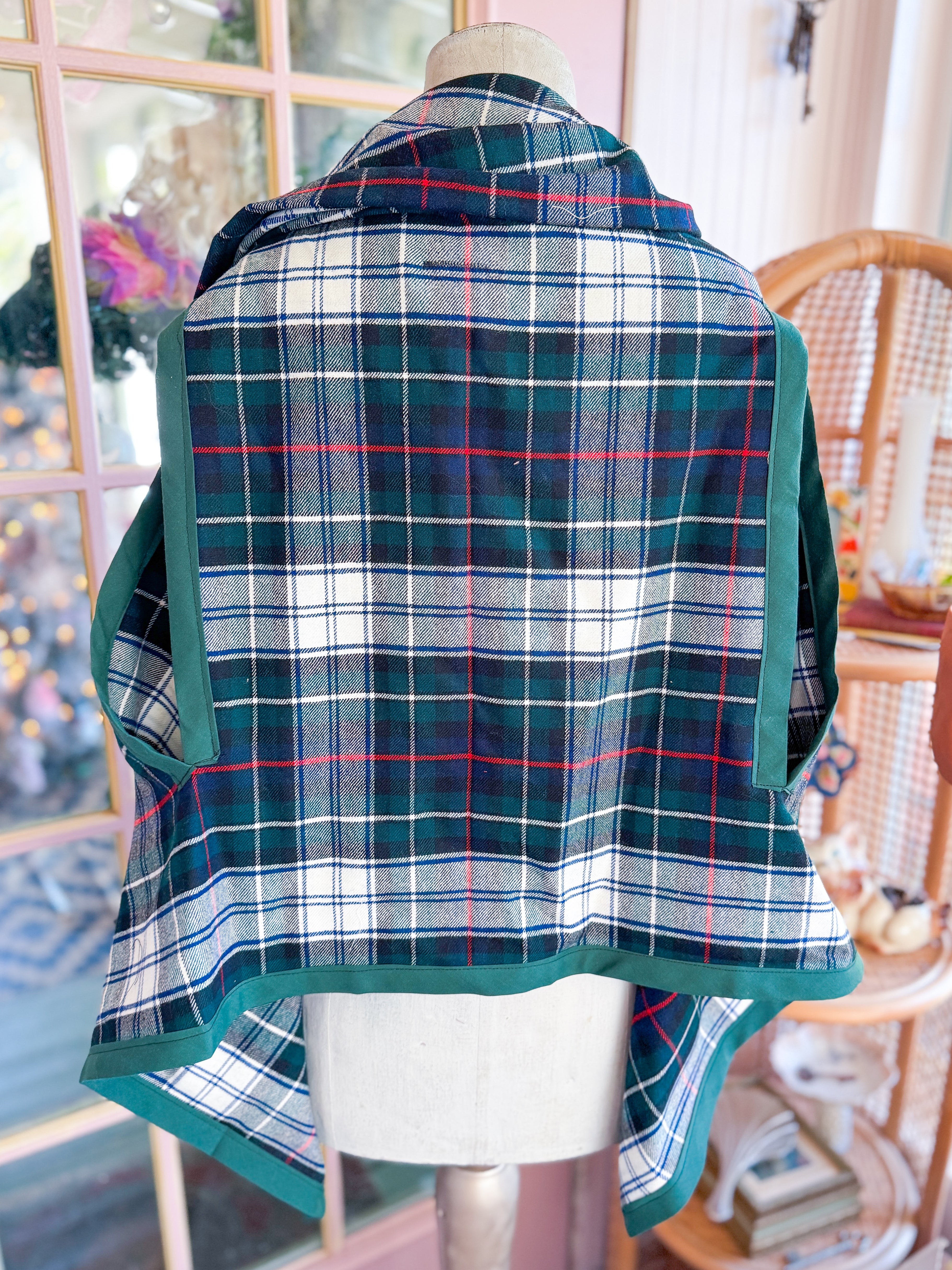 Vintage plaid wool table linens given new life when transformed into a open front vest. Lose fit, fold down collar. One of a kind! One size fits most. She fits XS- L best. Mannequin is a 4/6.