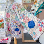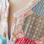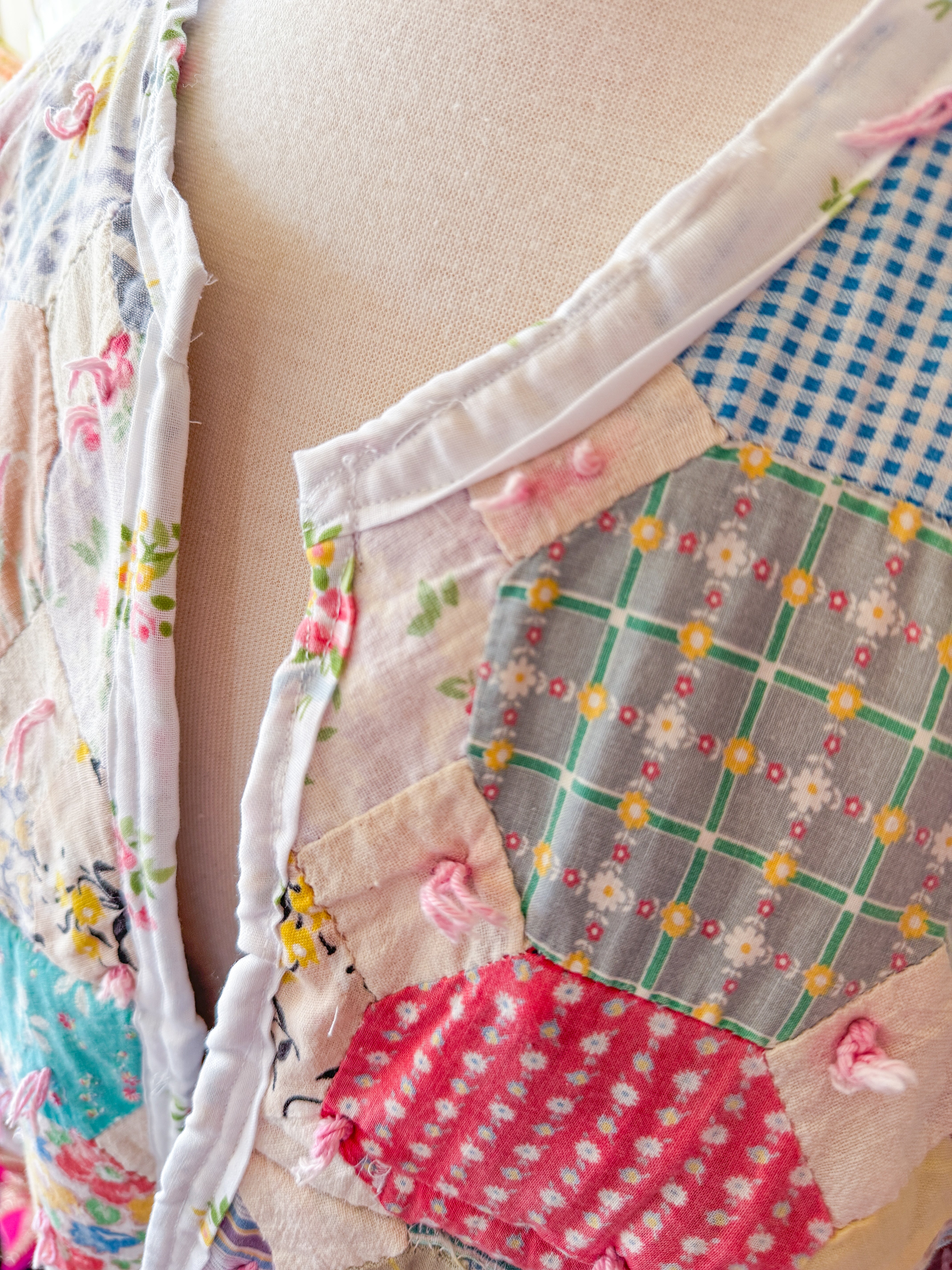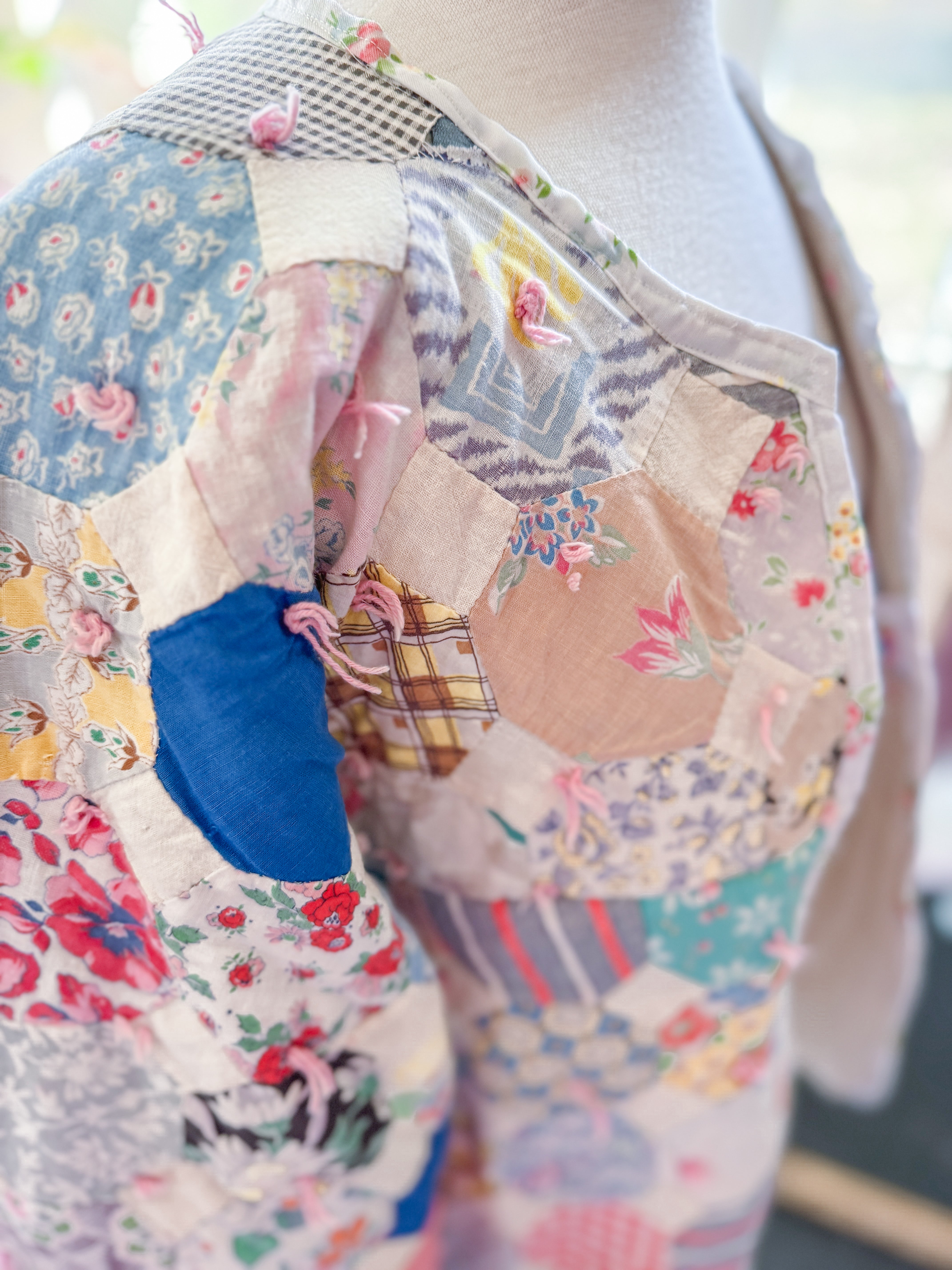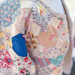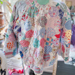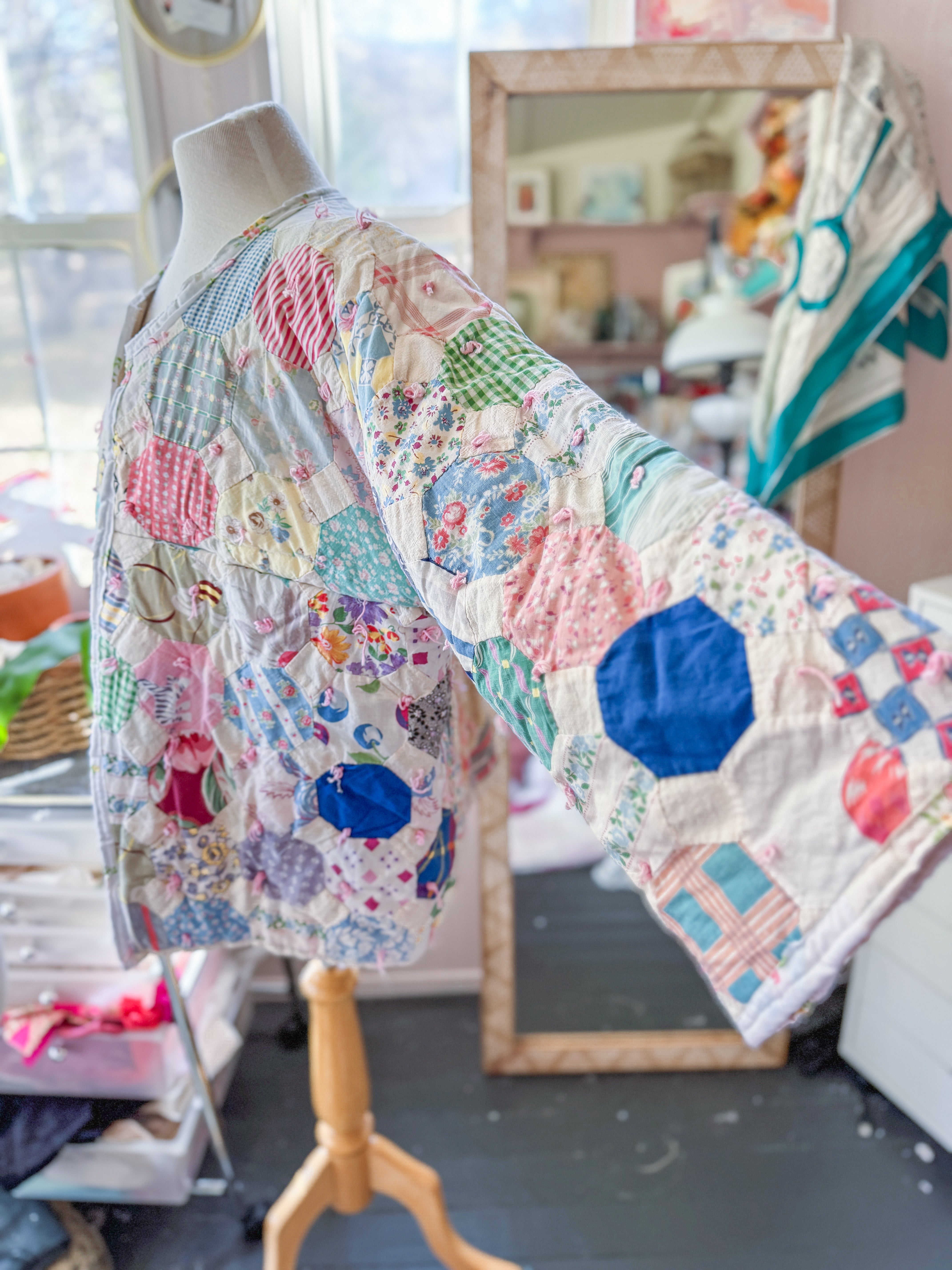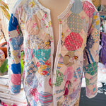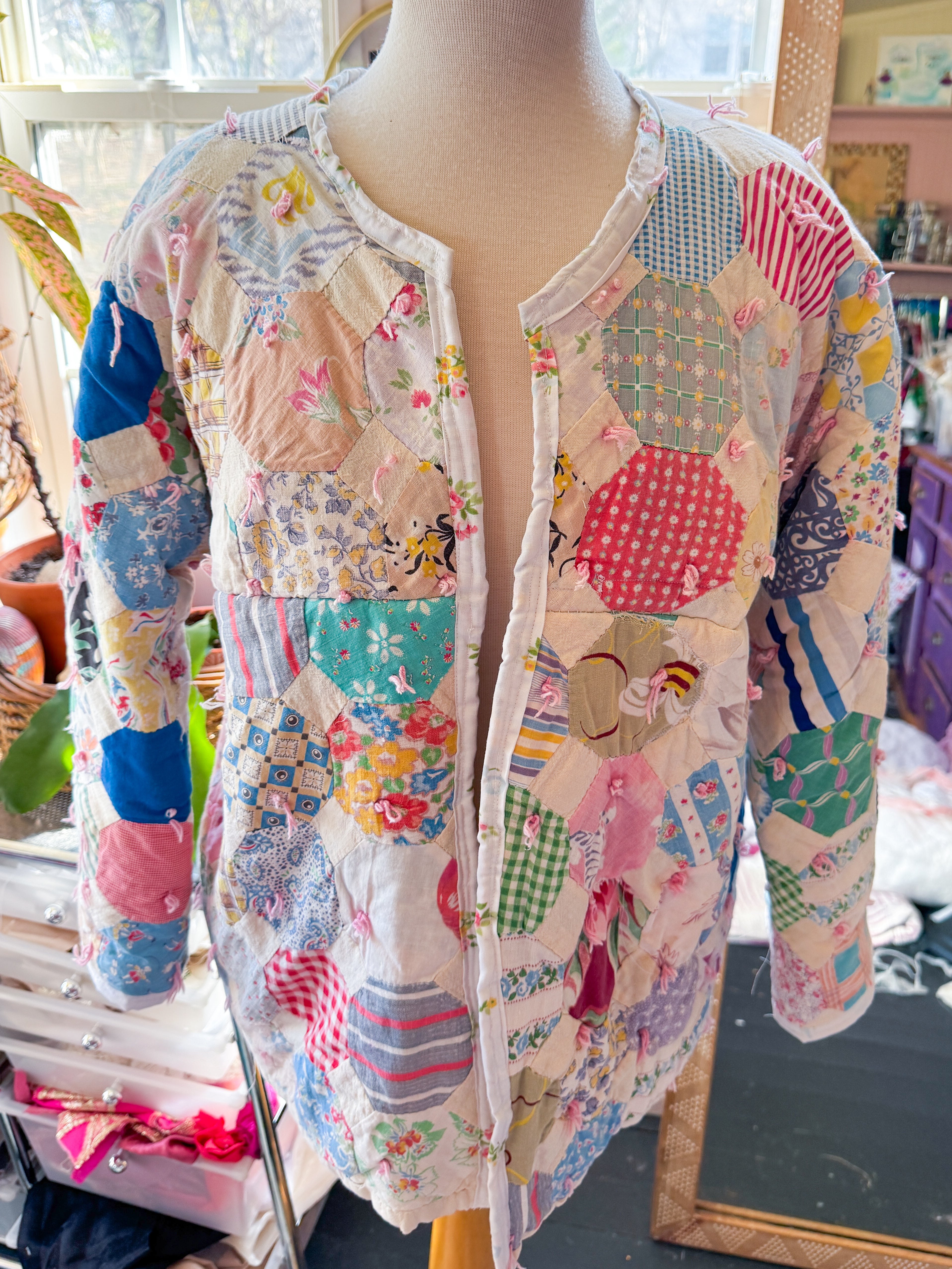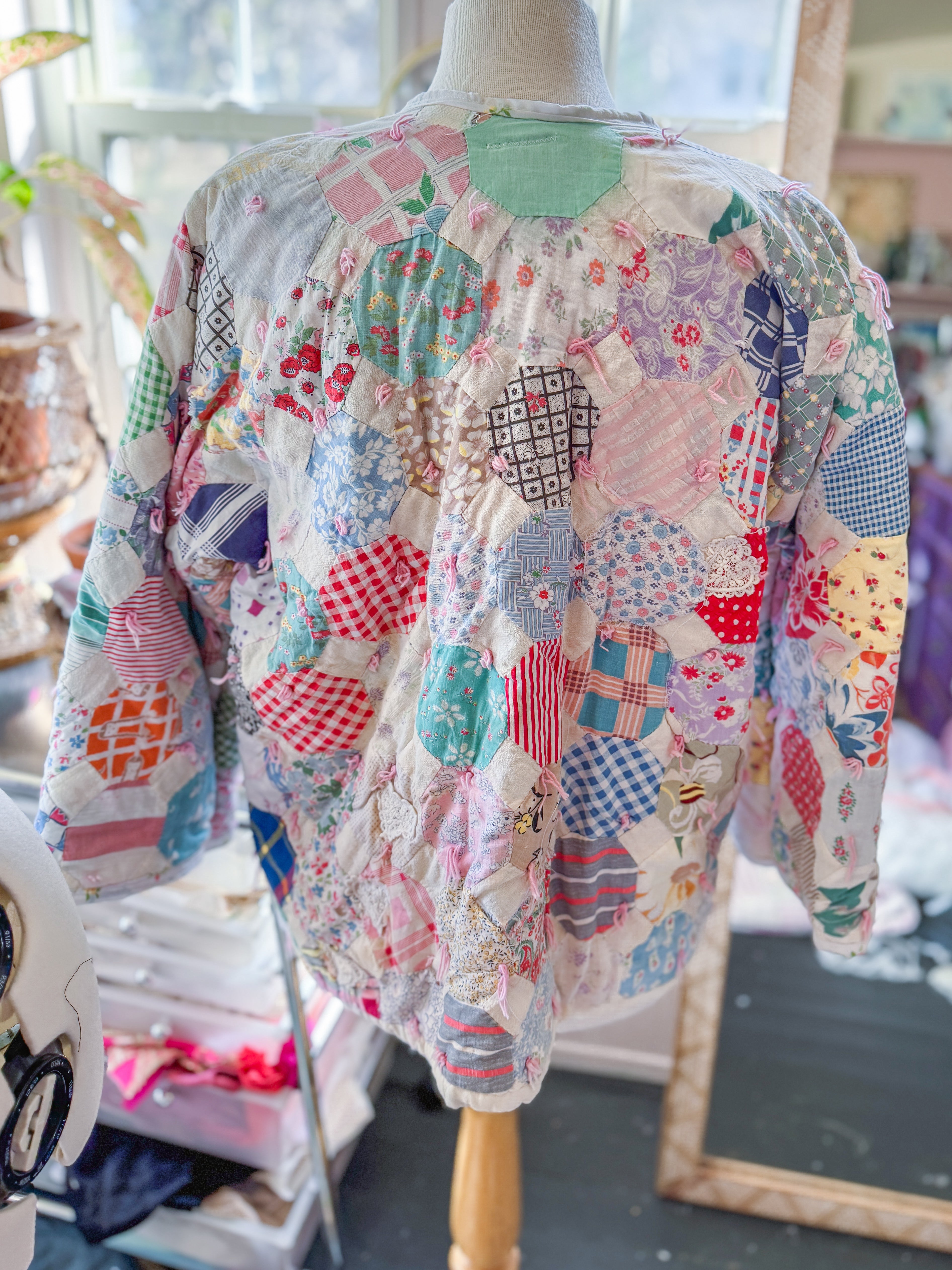 1960's patchwork quilt transformed into a coat. She’s open front and has the sweetest contrasting trim from a '80's floral bedsheet. One size fits most. Mannequin is sz 4/6. One size fits most. Fits a S-XL best.