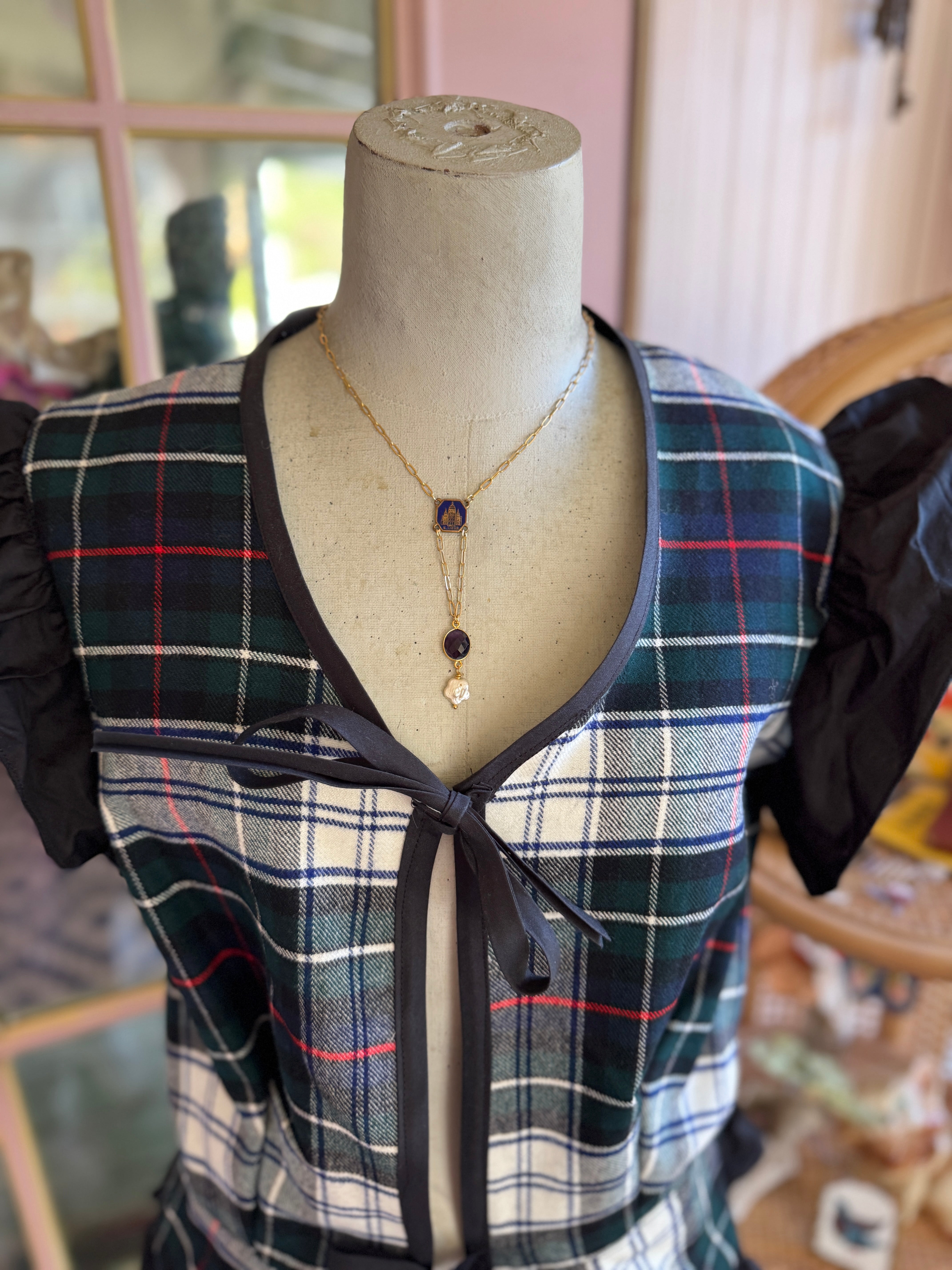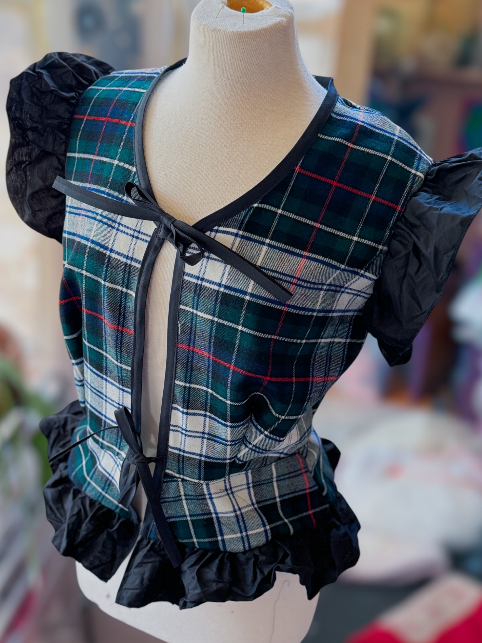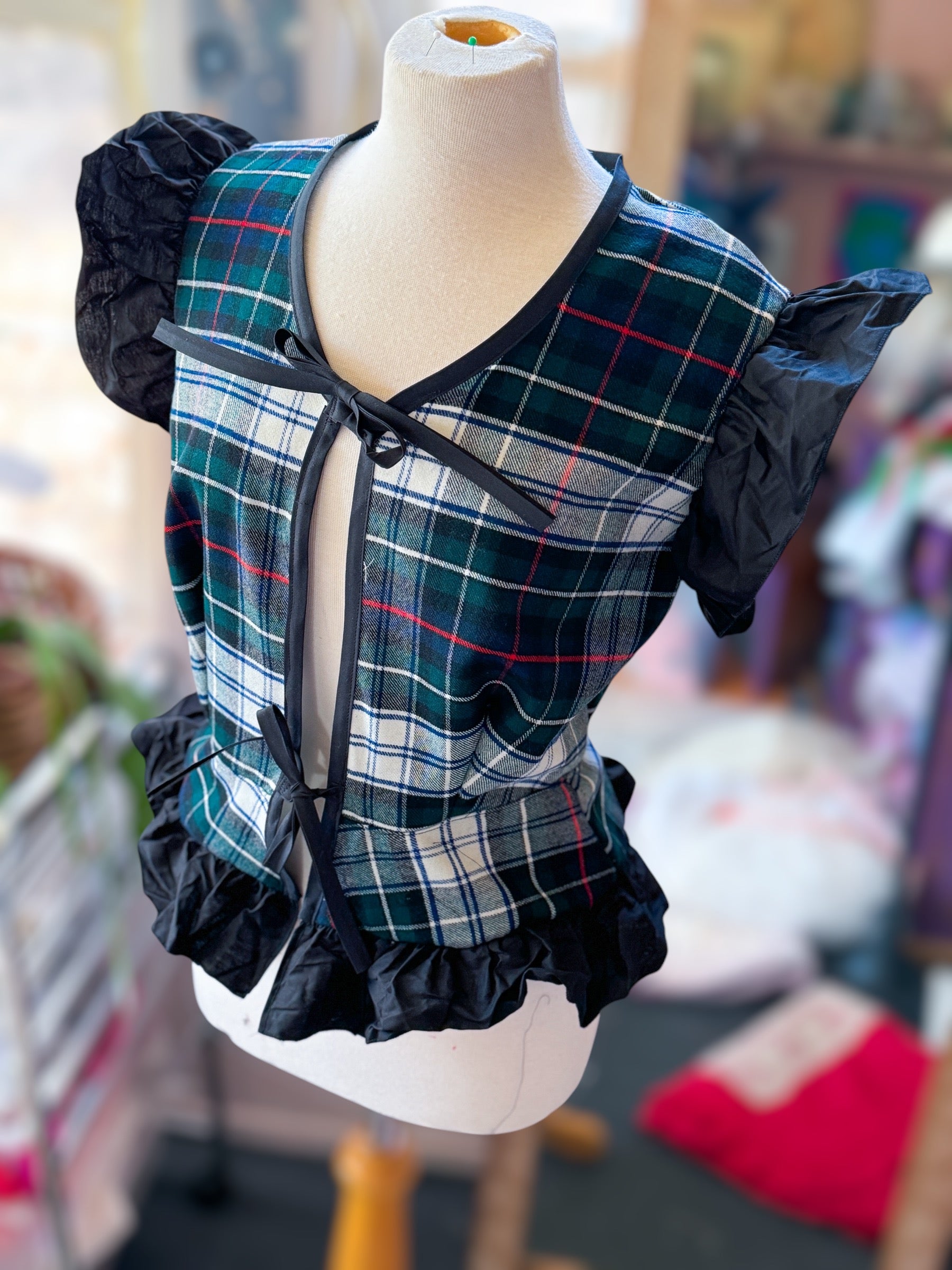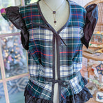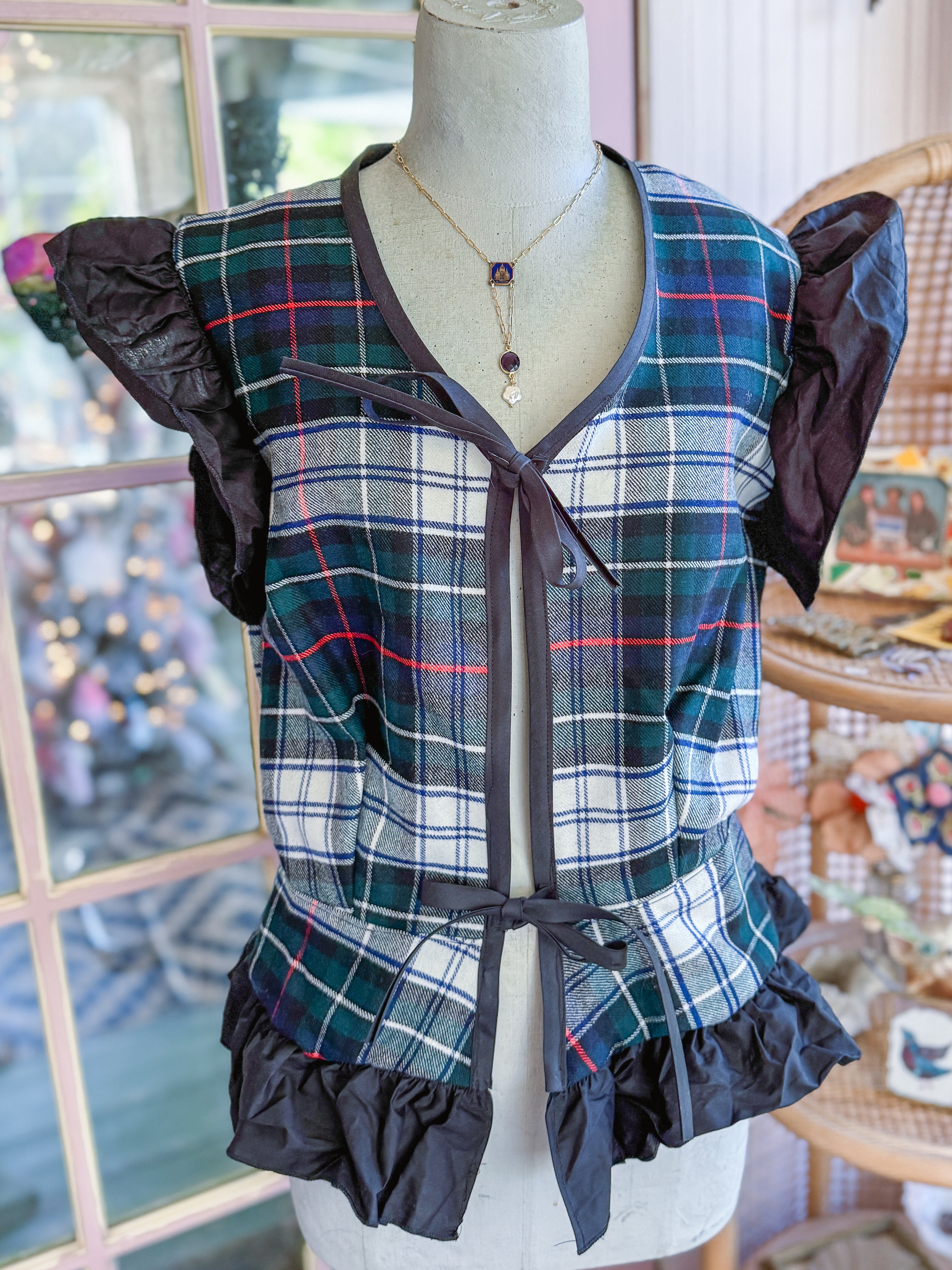 Vintage plaid table linens given new life when transformed into a ruffle trim vest. Tie front with ruffle cap sleeves and peplum waist with ruffle trim. One of a kind! One size fits most. She fits S- L best. Mannequin is a 4/6.