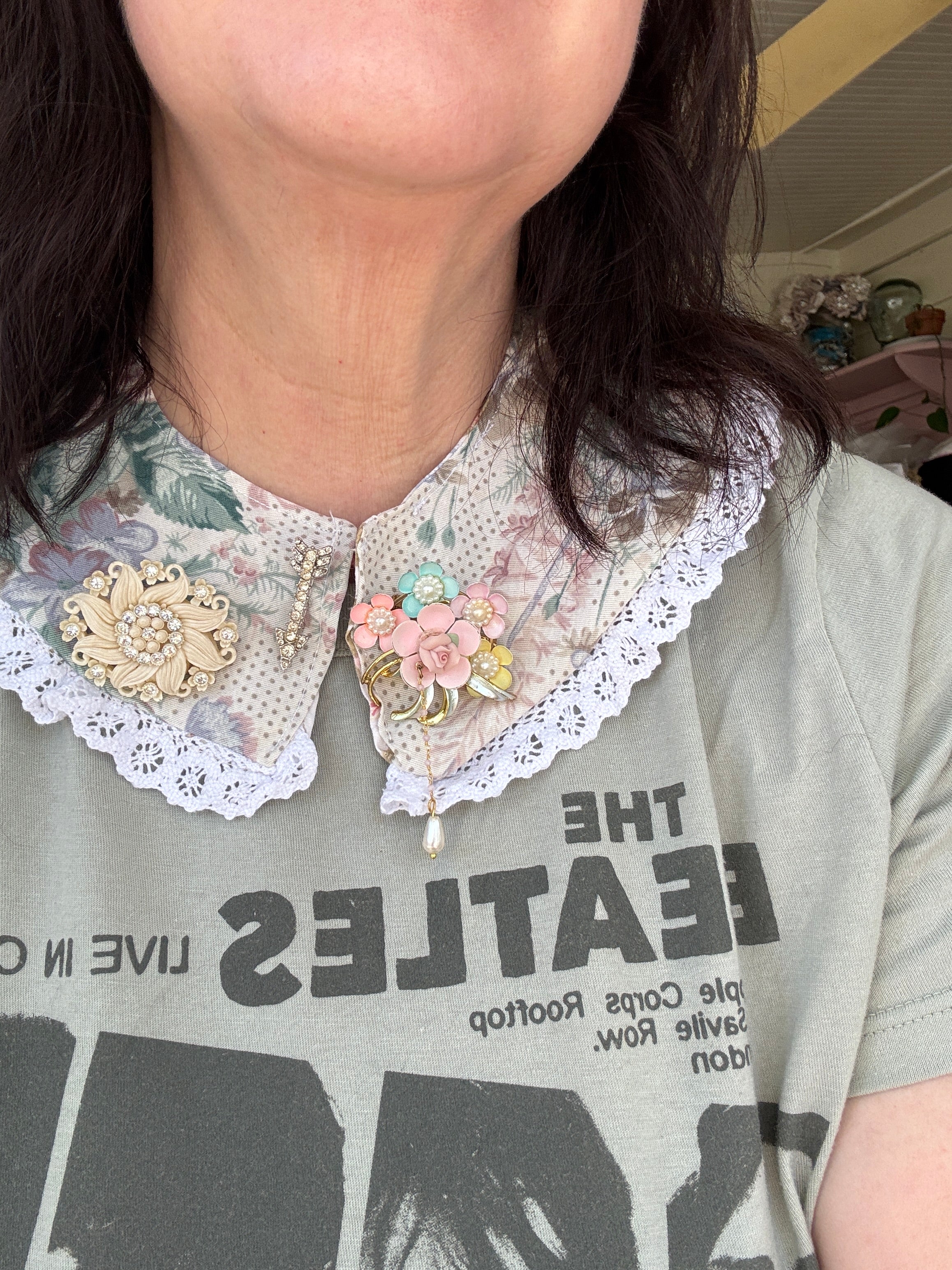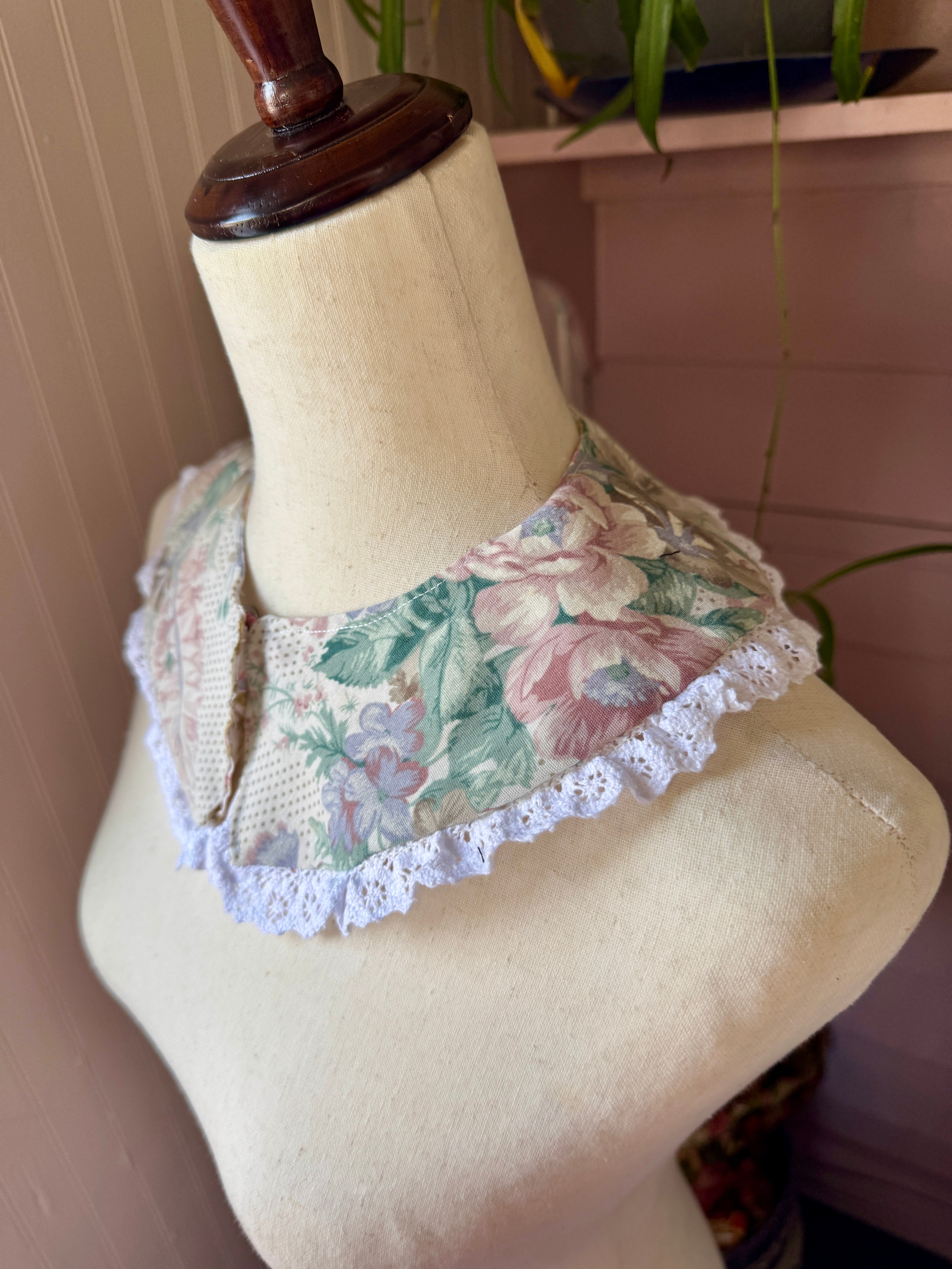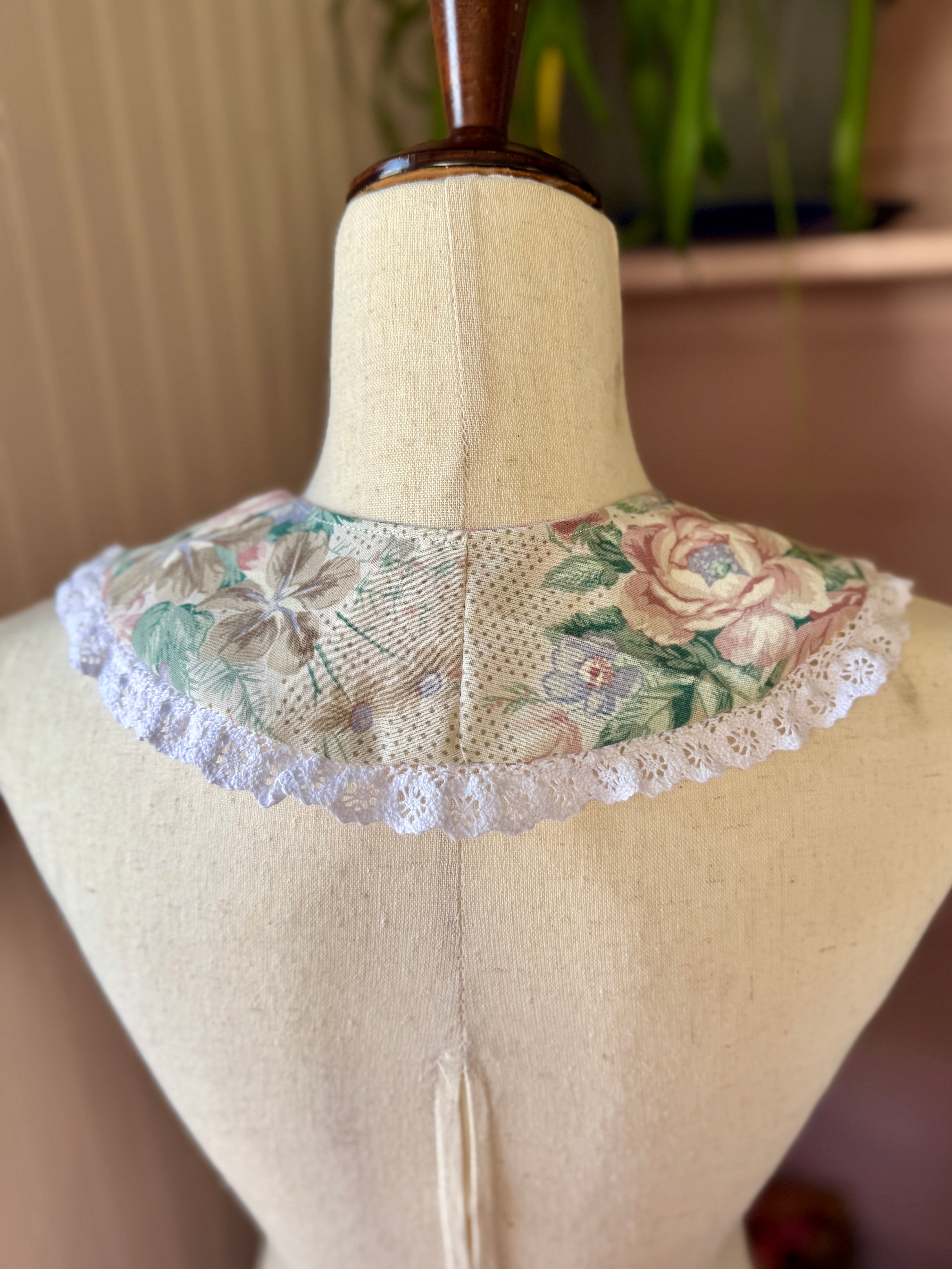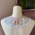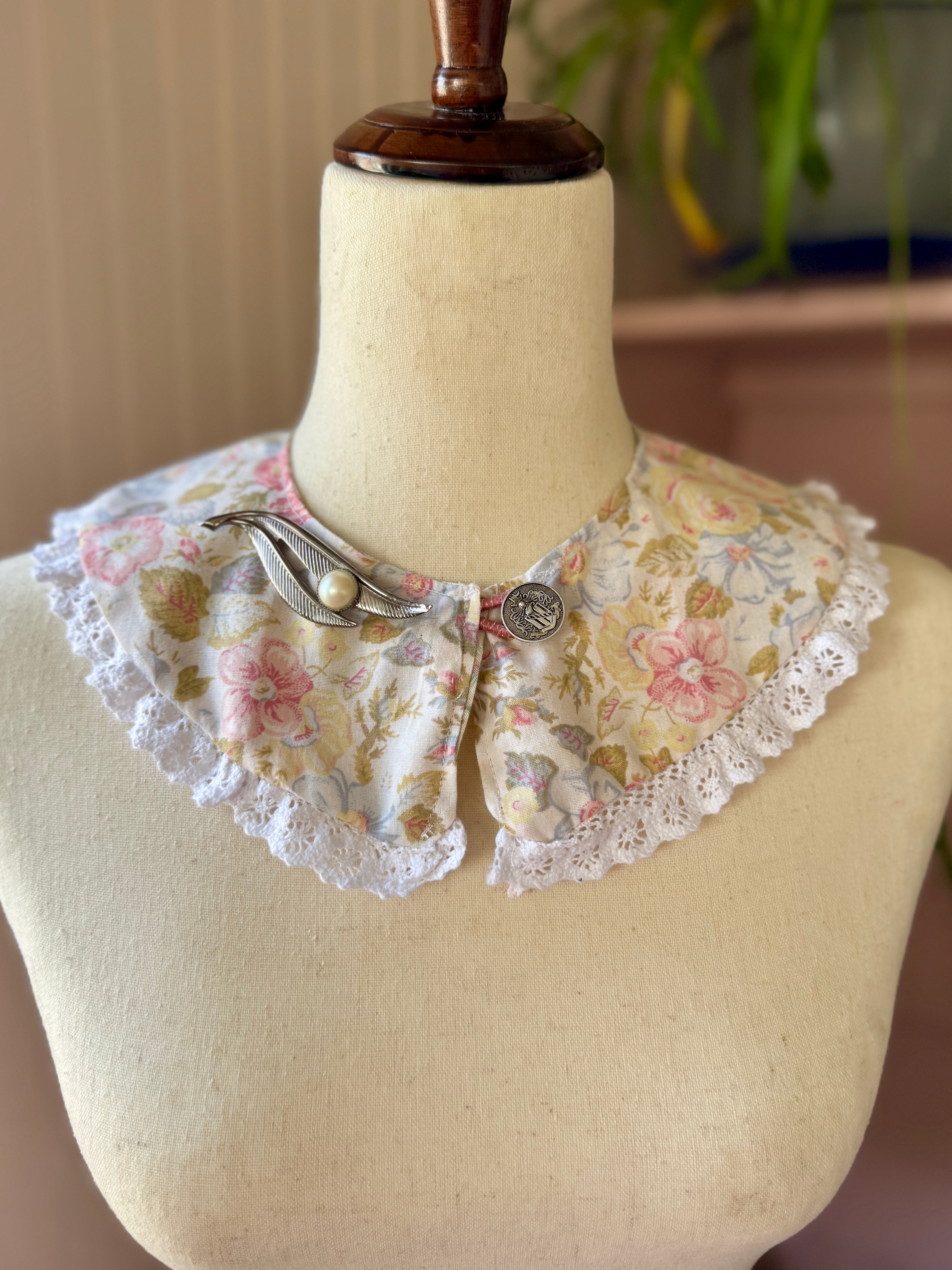 Vintage 1980's curtain remnants repurposed into a the sweetest removable collar. She is reversible and has crochet lace trim and hooks with an elastic band and vintage silver button. Pair her with a summery dress or throw her over your favorite band T or sweater and jeans for a completely different look! Wanna change the vibe some more? Add a bunch of scatter pins! (Brooches sold separately.)