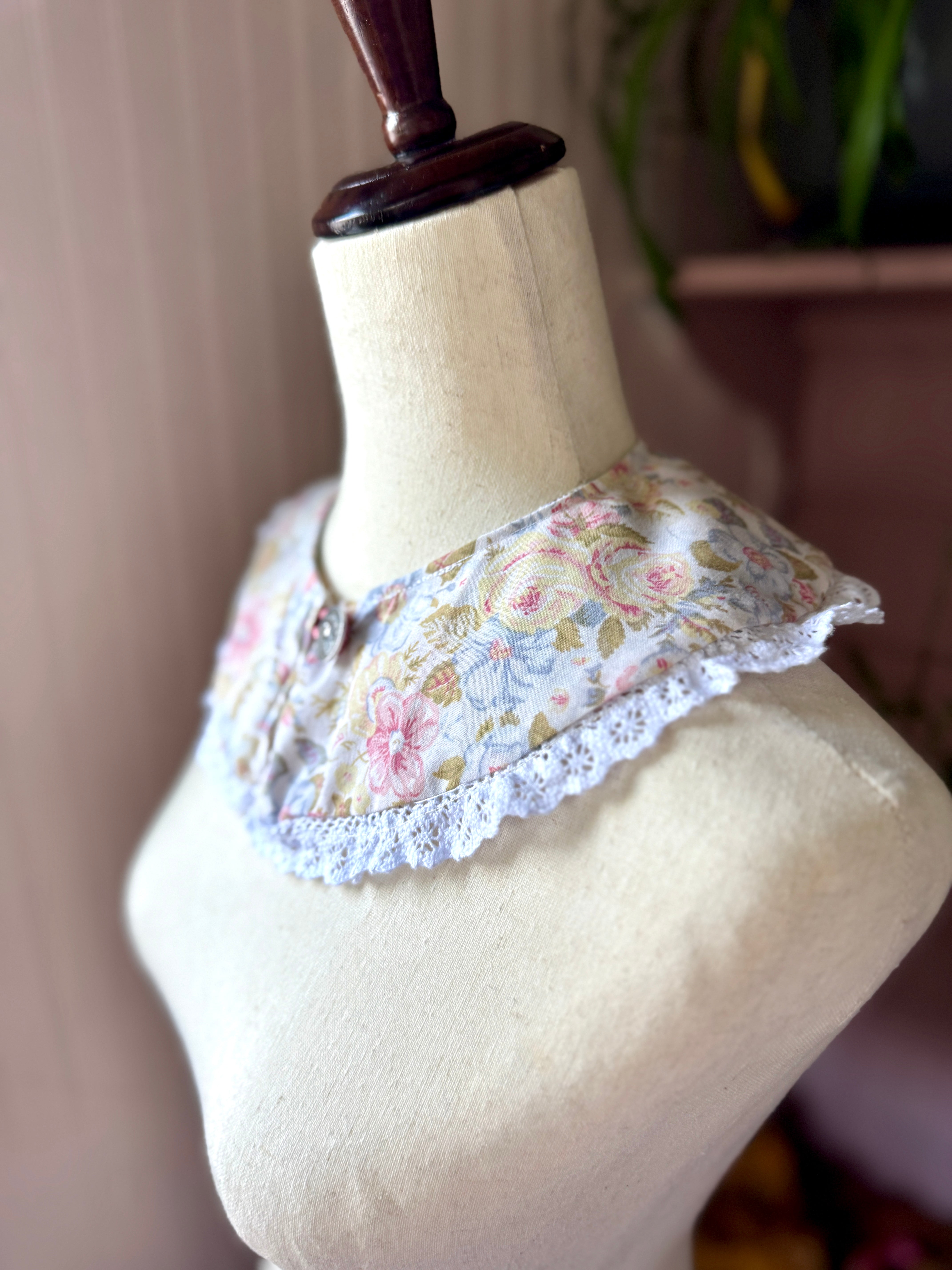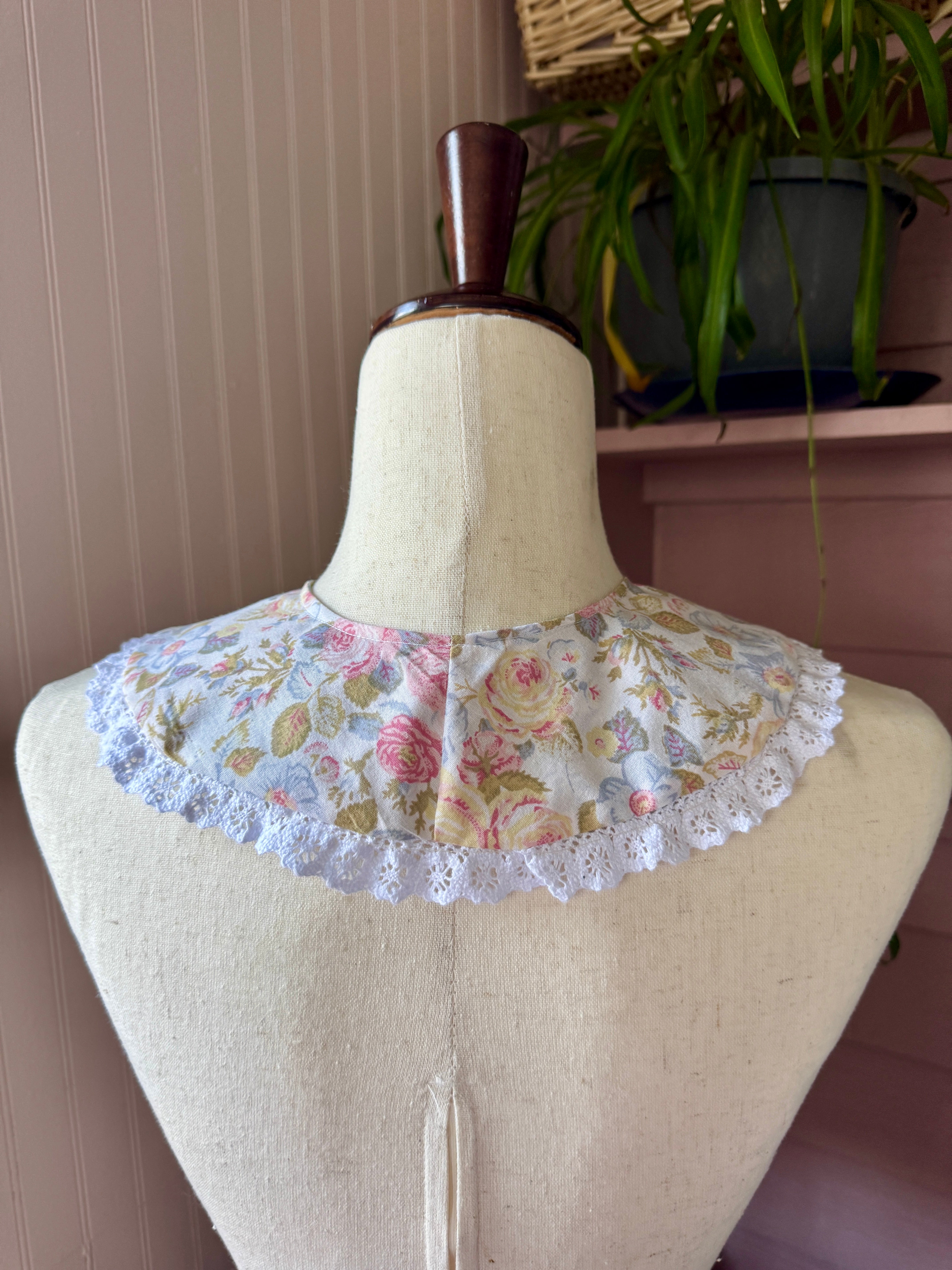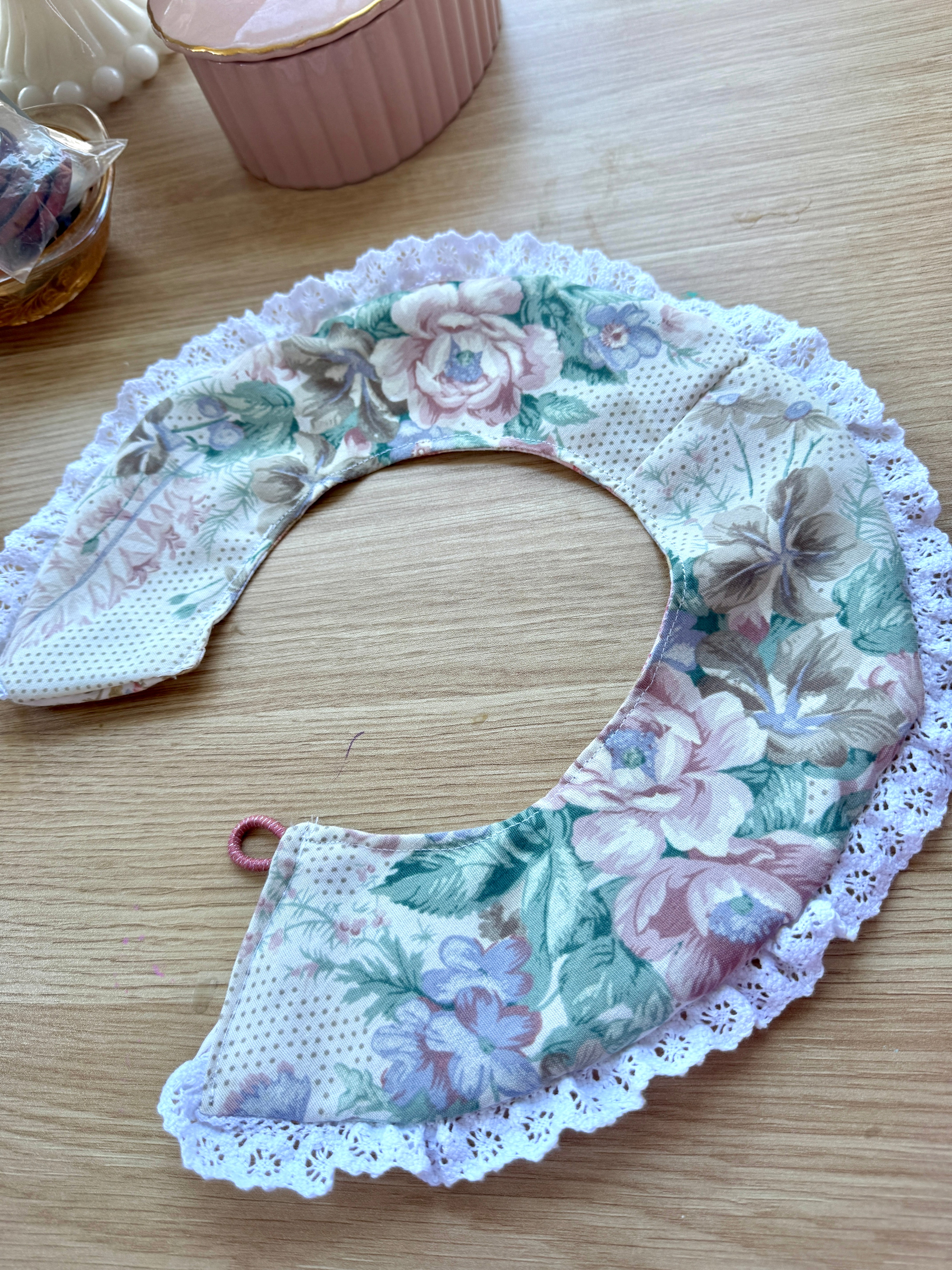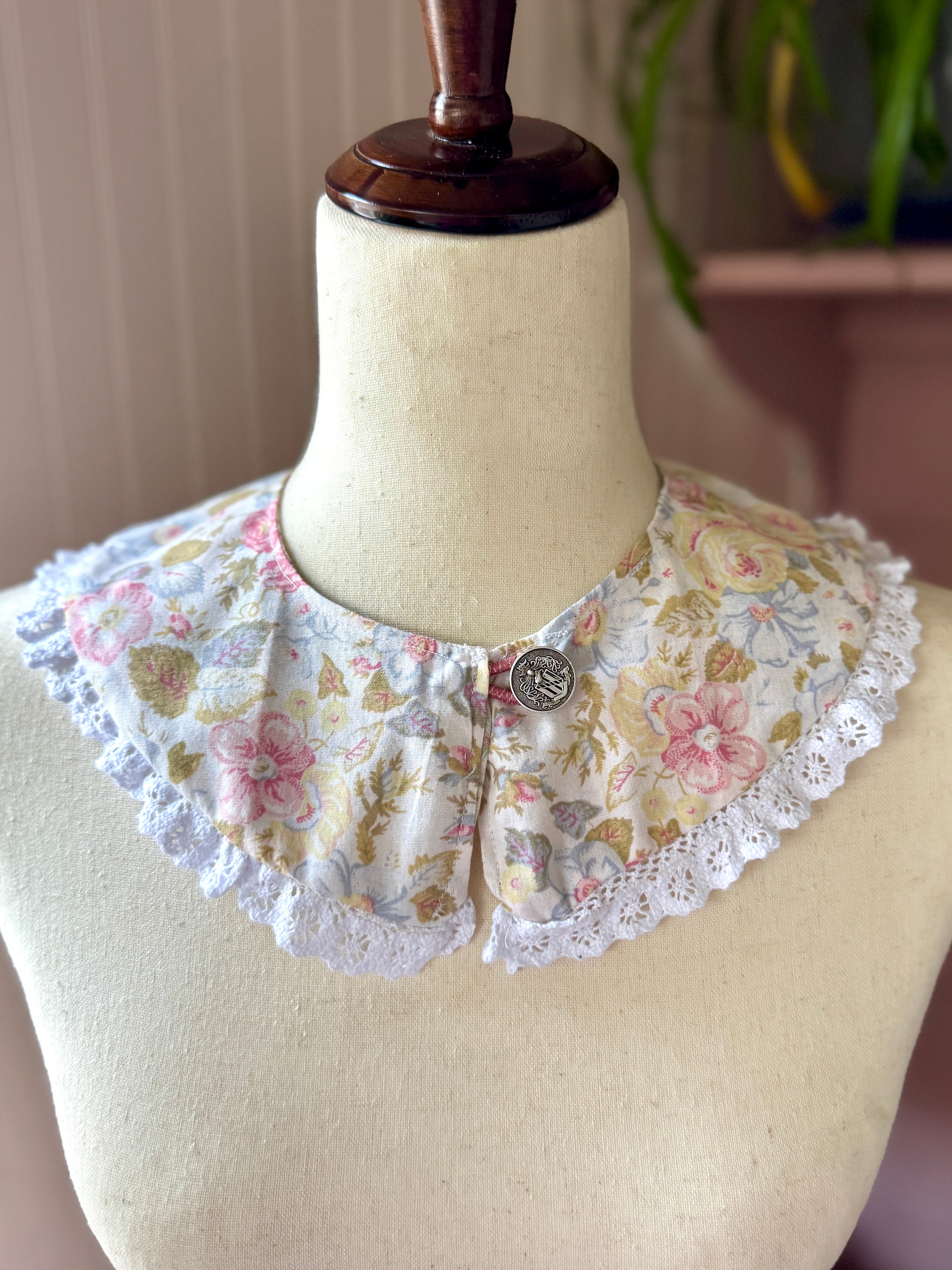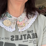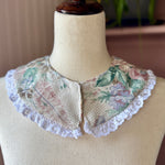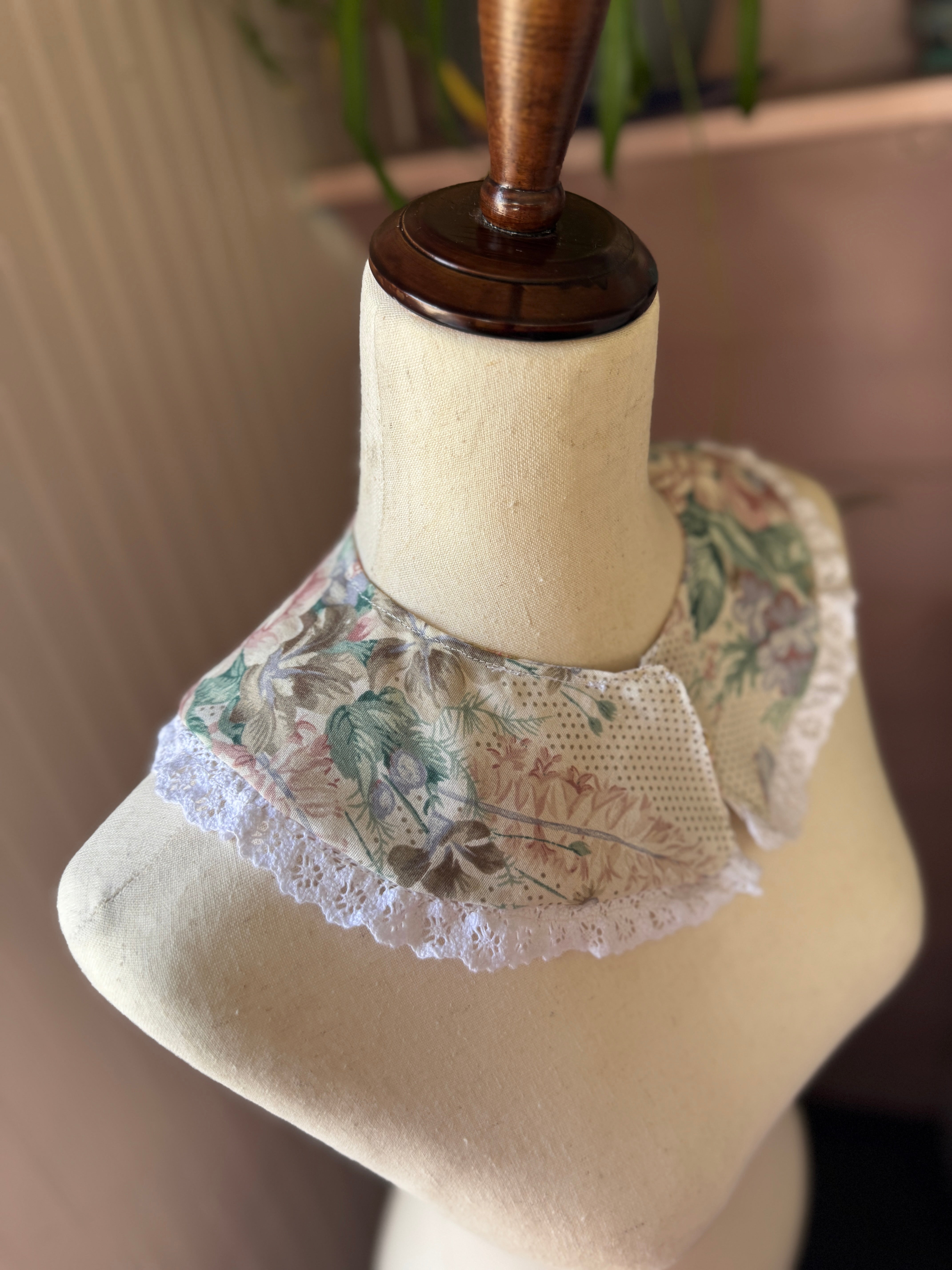 Vintage 1980's curtain remnants repurposed into a the sweetest removable collar. She is reversible and has crochet lace trim and hooks with an elastic band and vintage silver button. Pair her with a summery dress or throw her over your favorite band T or sweater and jeans for a completely different look! Wanna change the vibe some more? Add a bunch of scatter pins! (Brooches sold separately.)