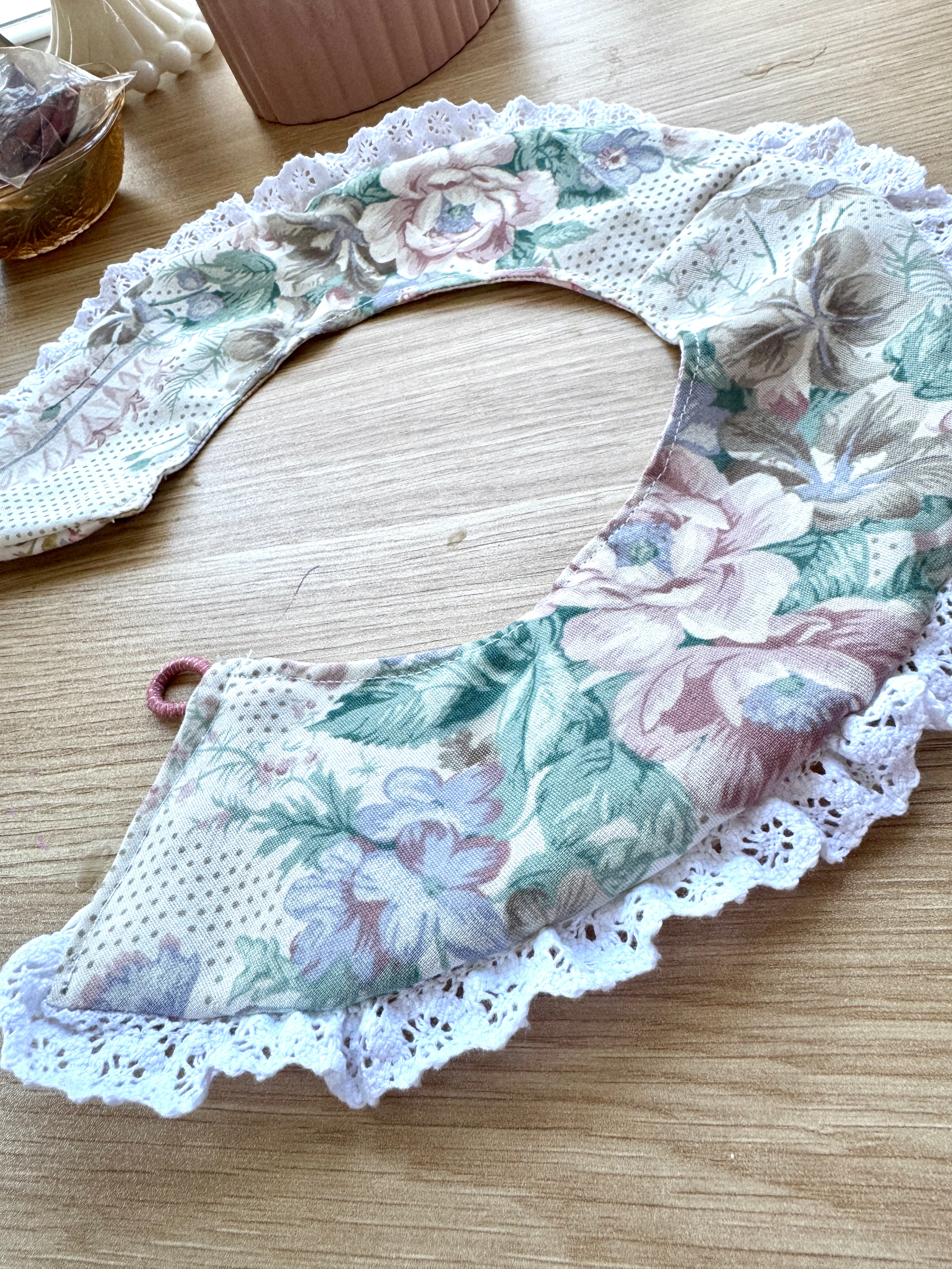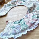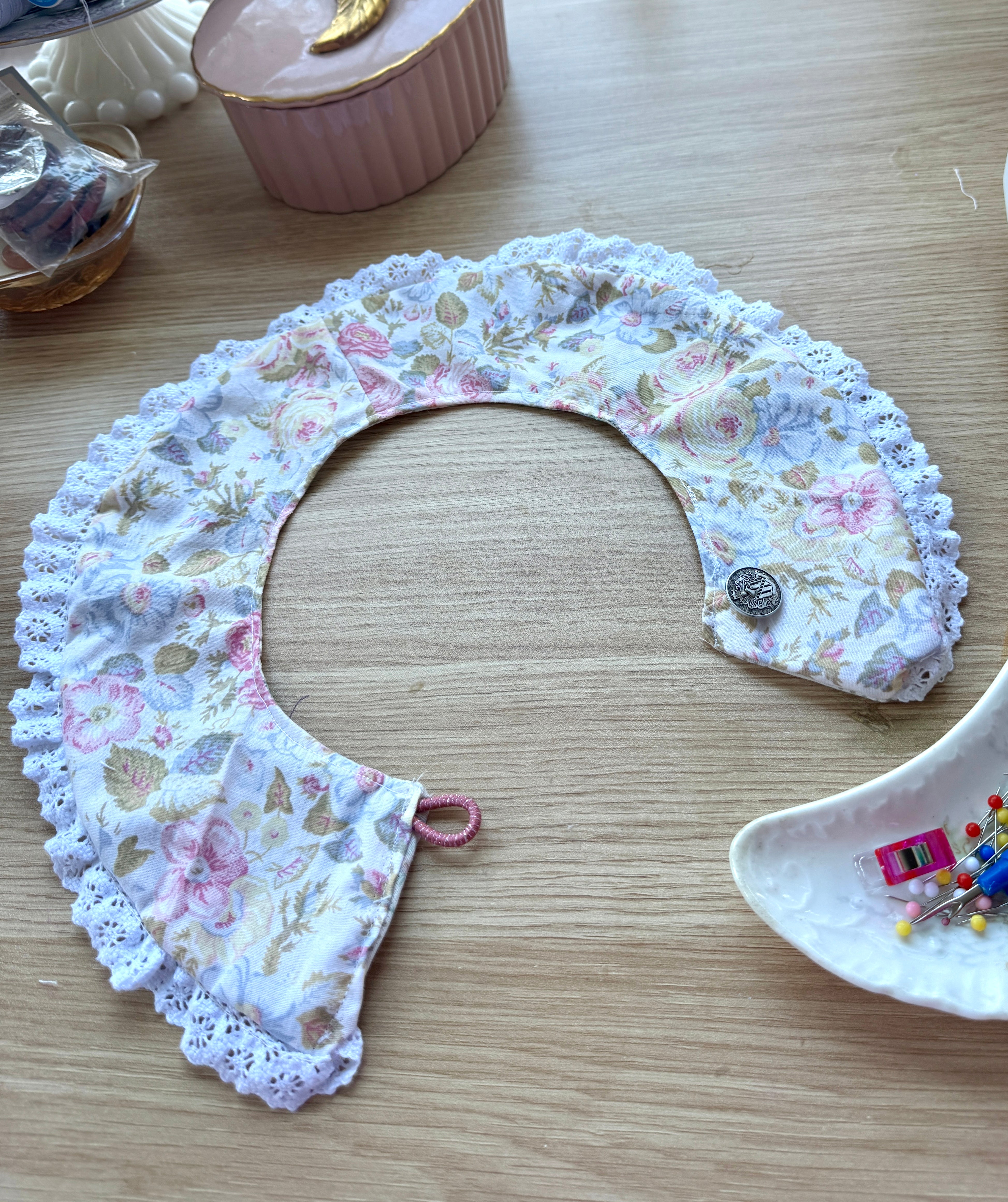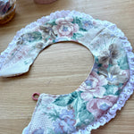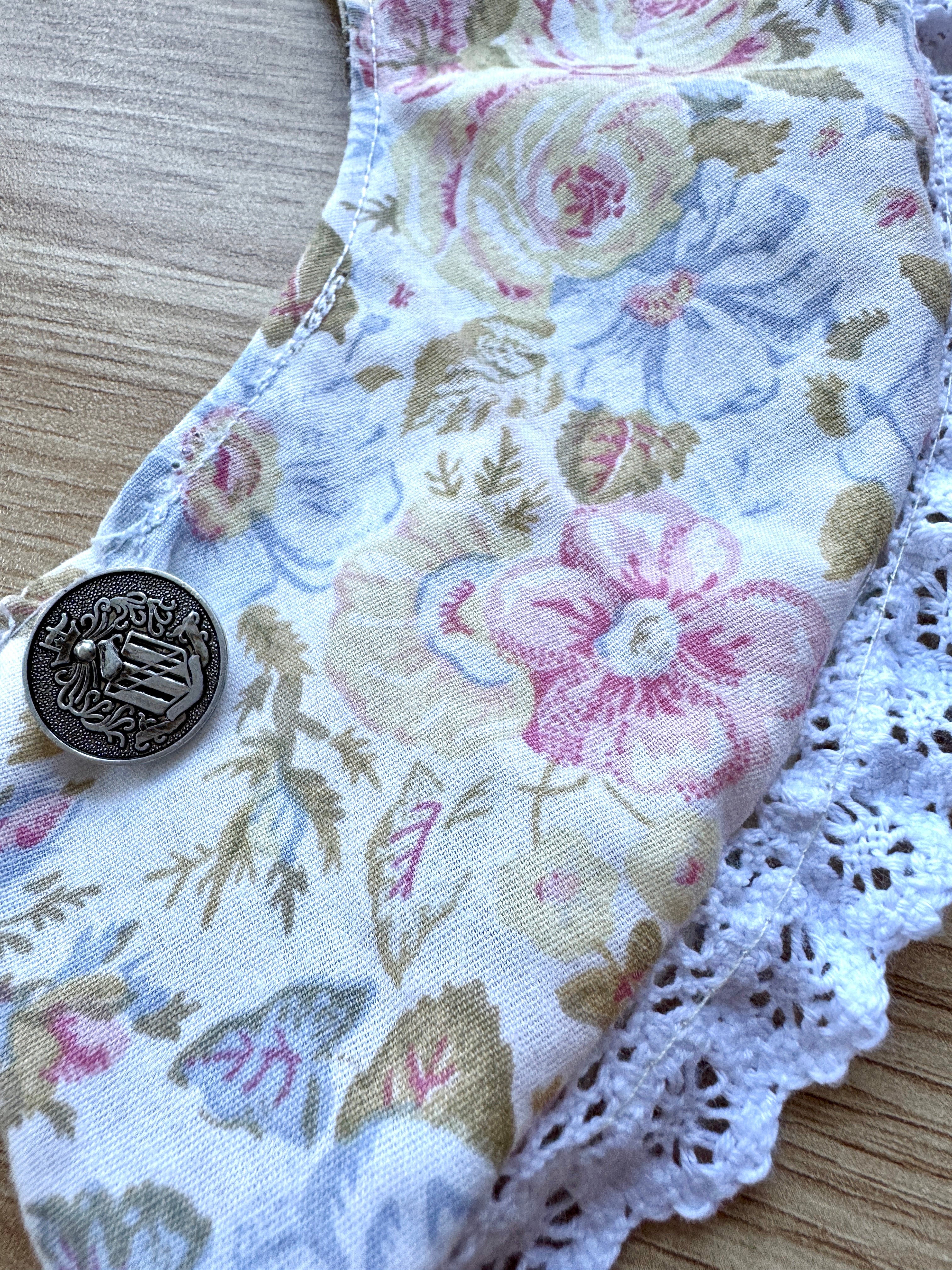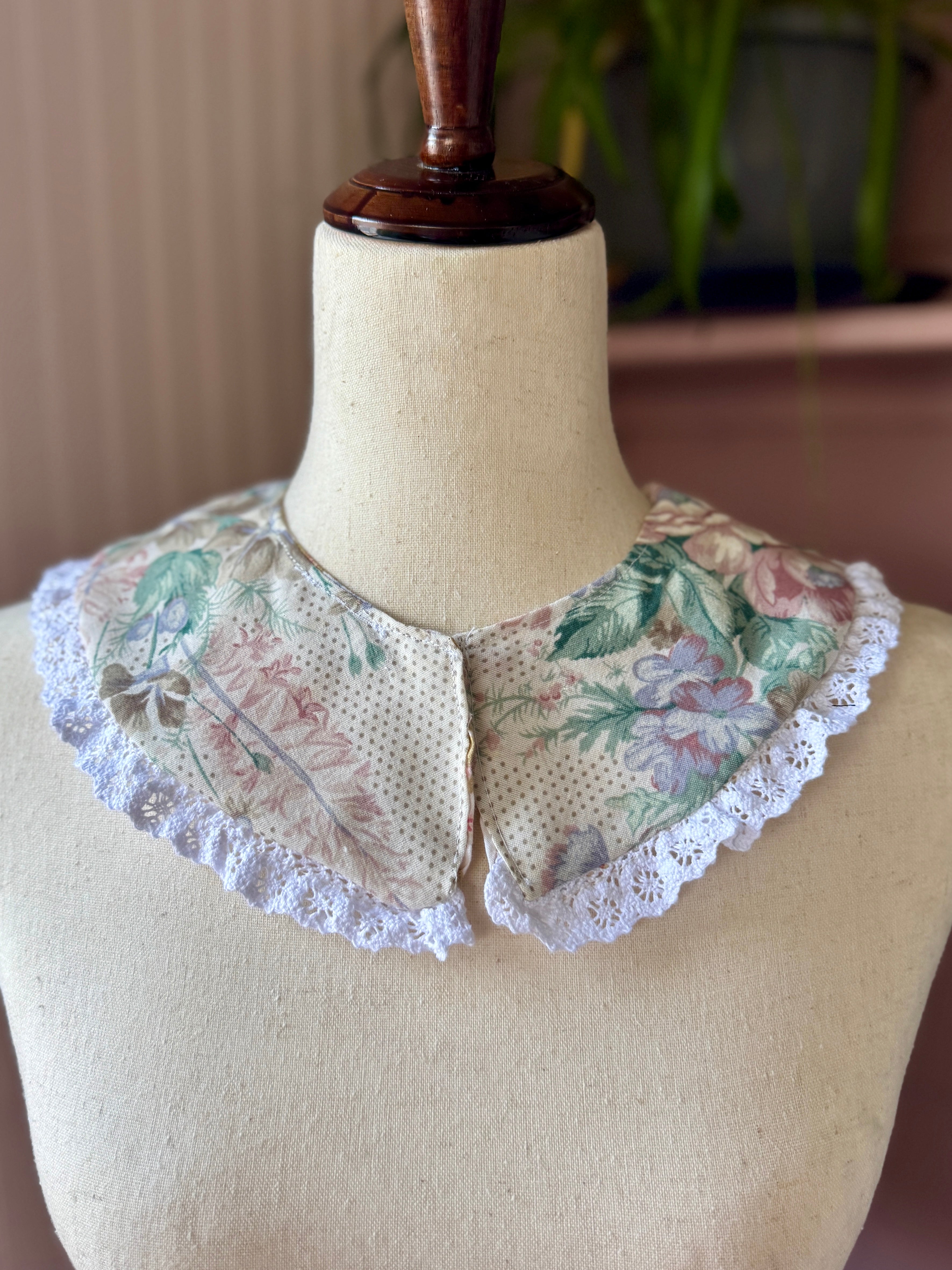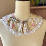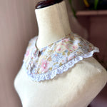 Vintage 1980's curtain remnants repurposed into a the sweetest removable collar. She is reversible and has crochet lace trim and hooks with an elastic band and vintage silver button. Pair her with a summery dress or throw her over your favorite band T or sweater and jeans for a completely different look! Wanna change the vibe some more? Add a bunch of scatter pins! (Brooches sold separately.)