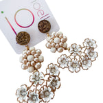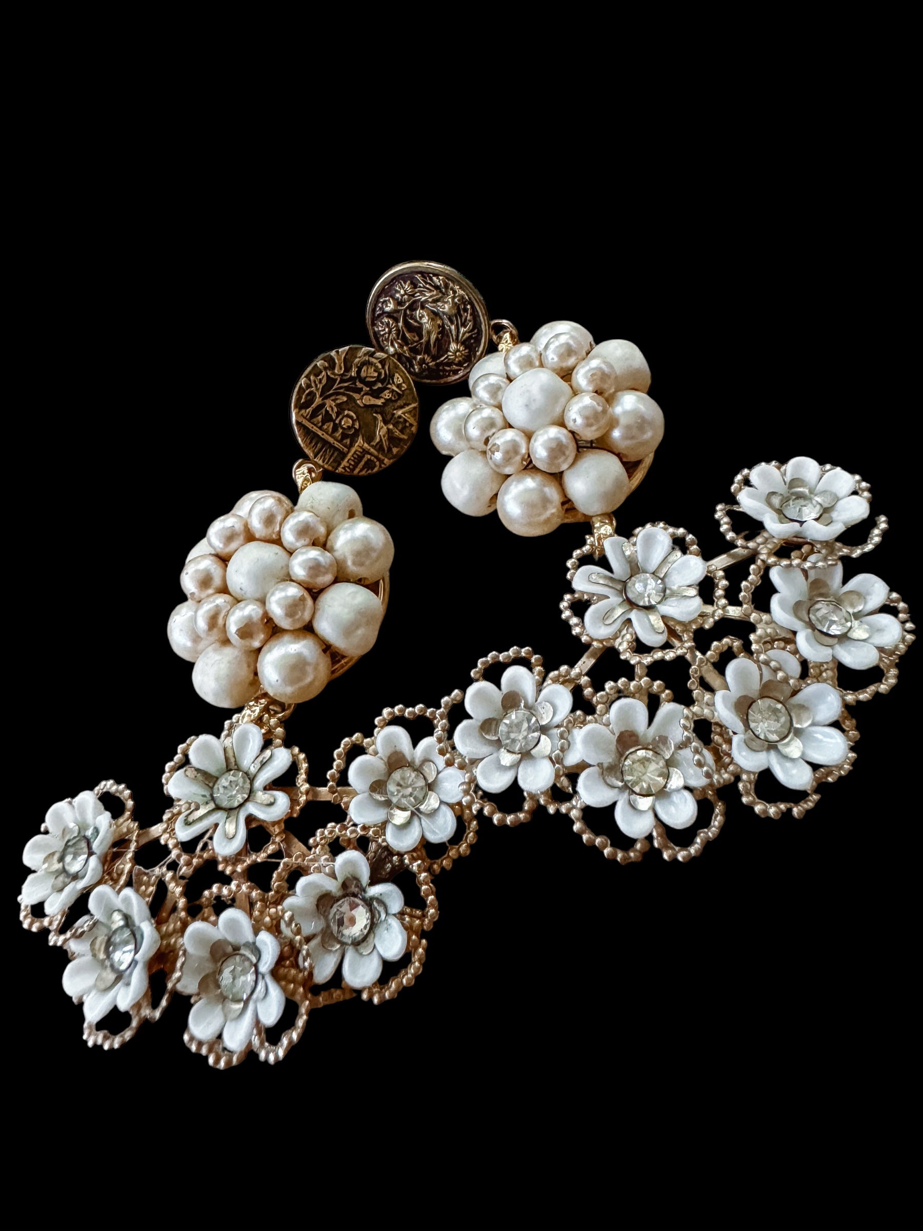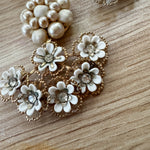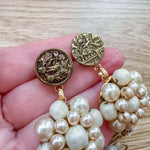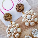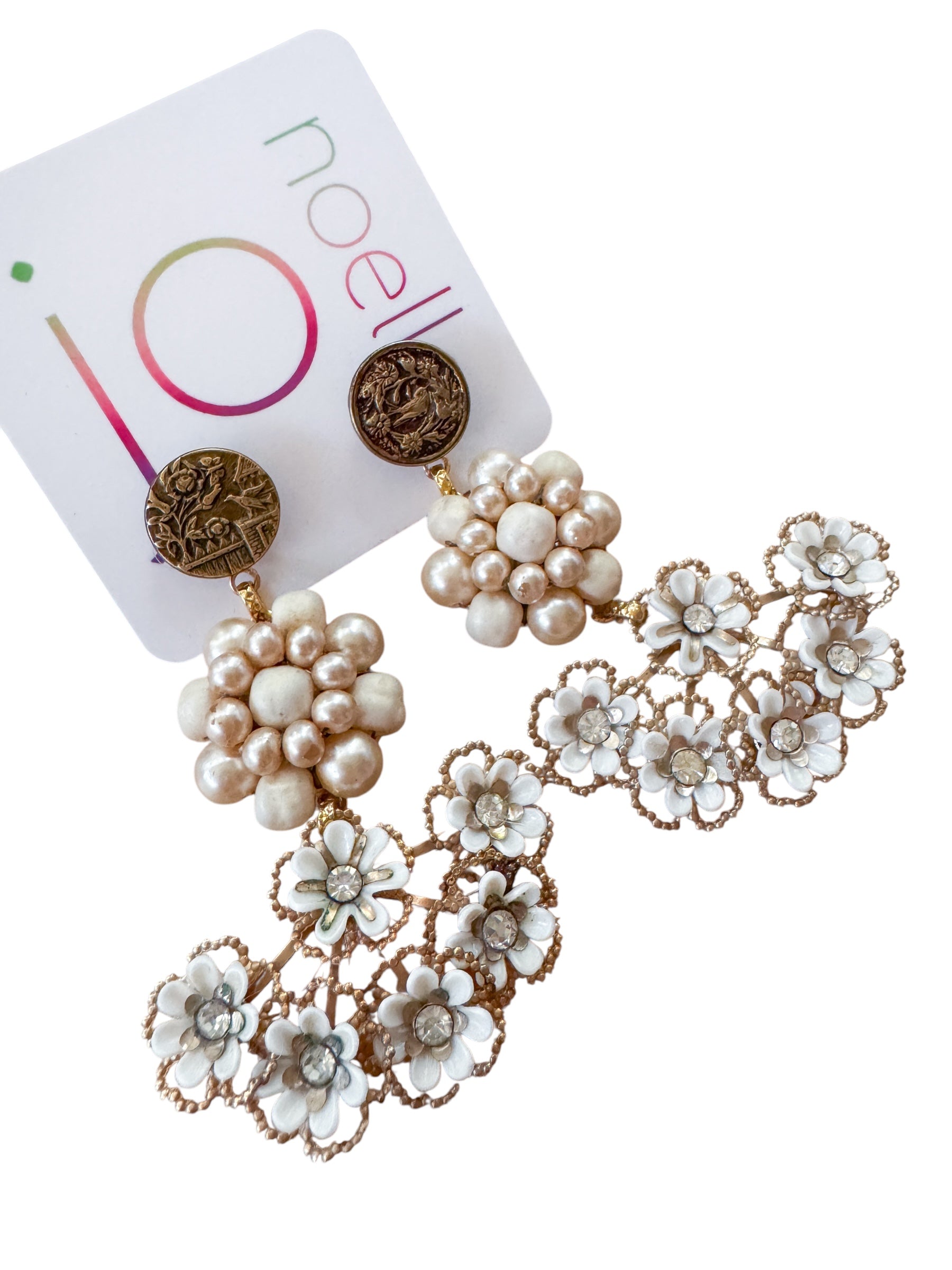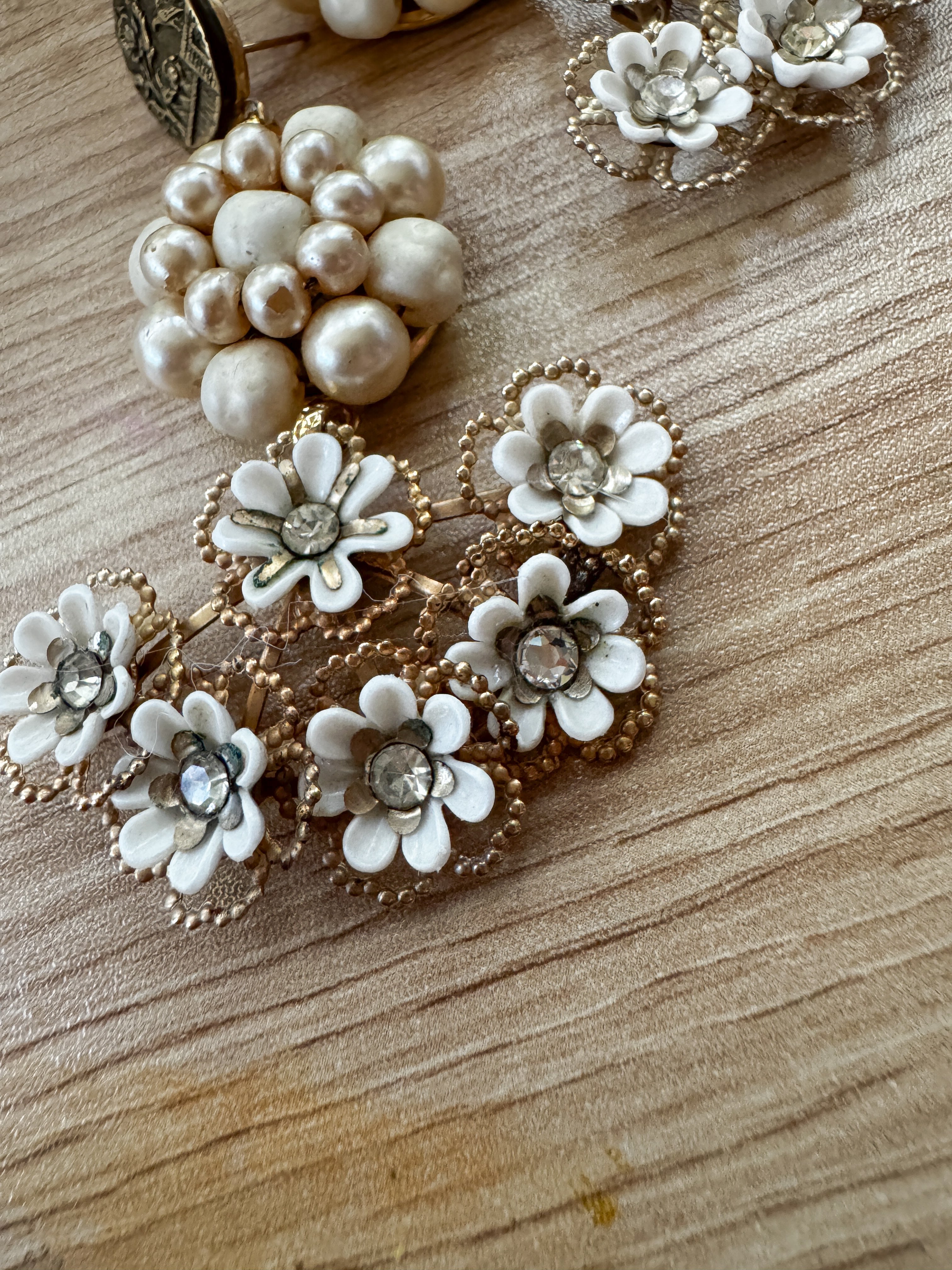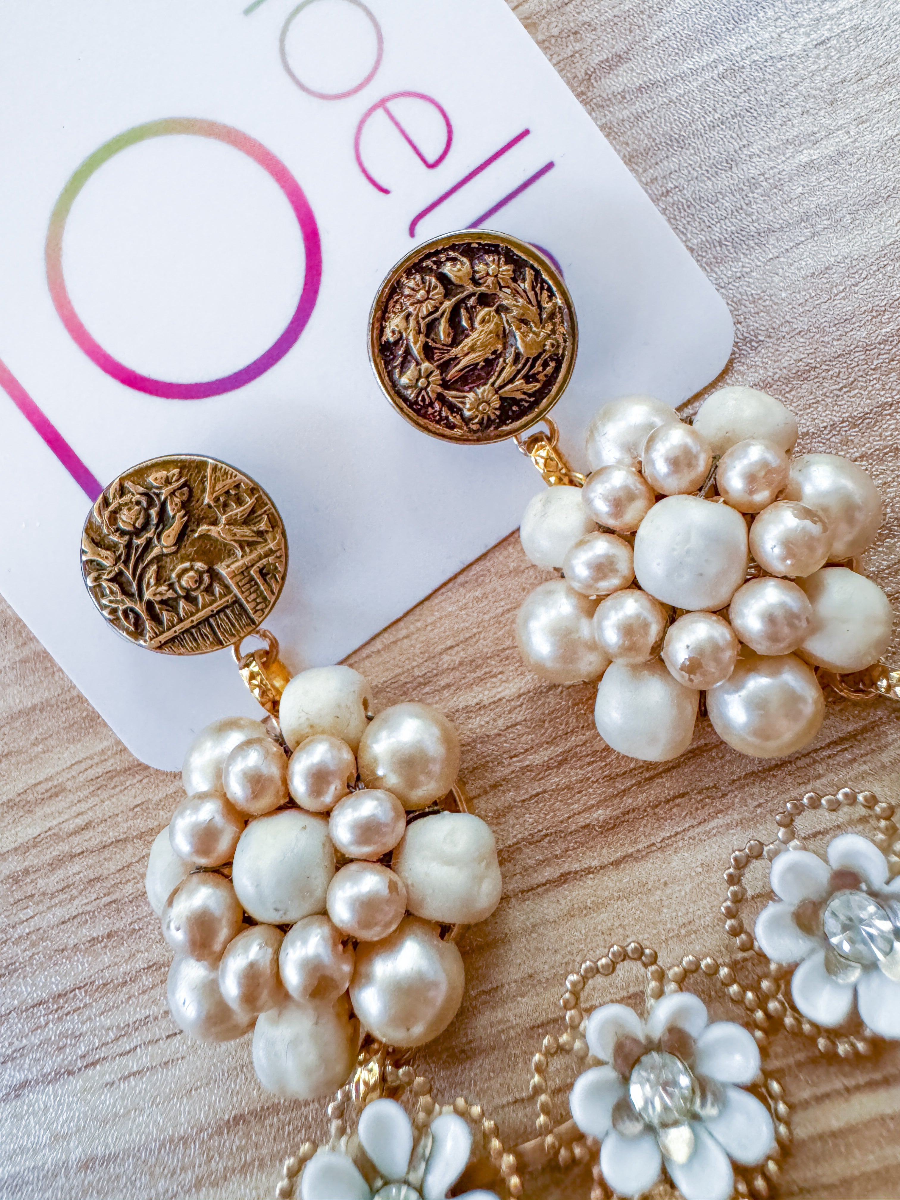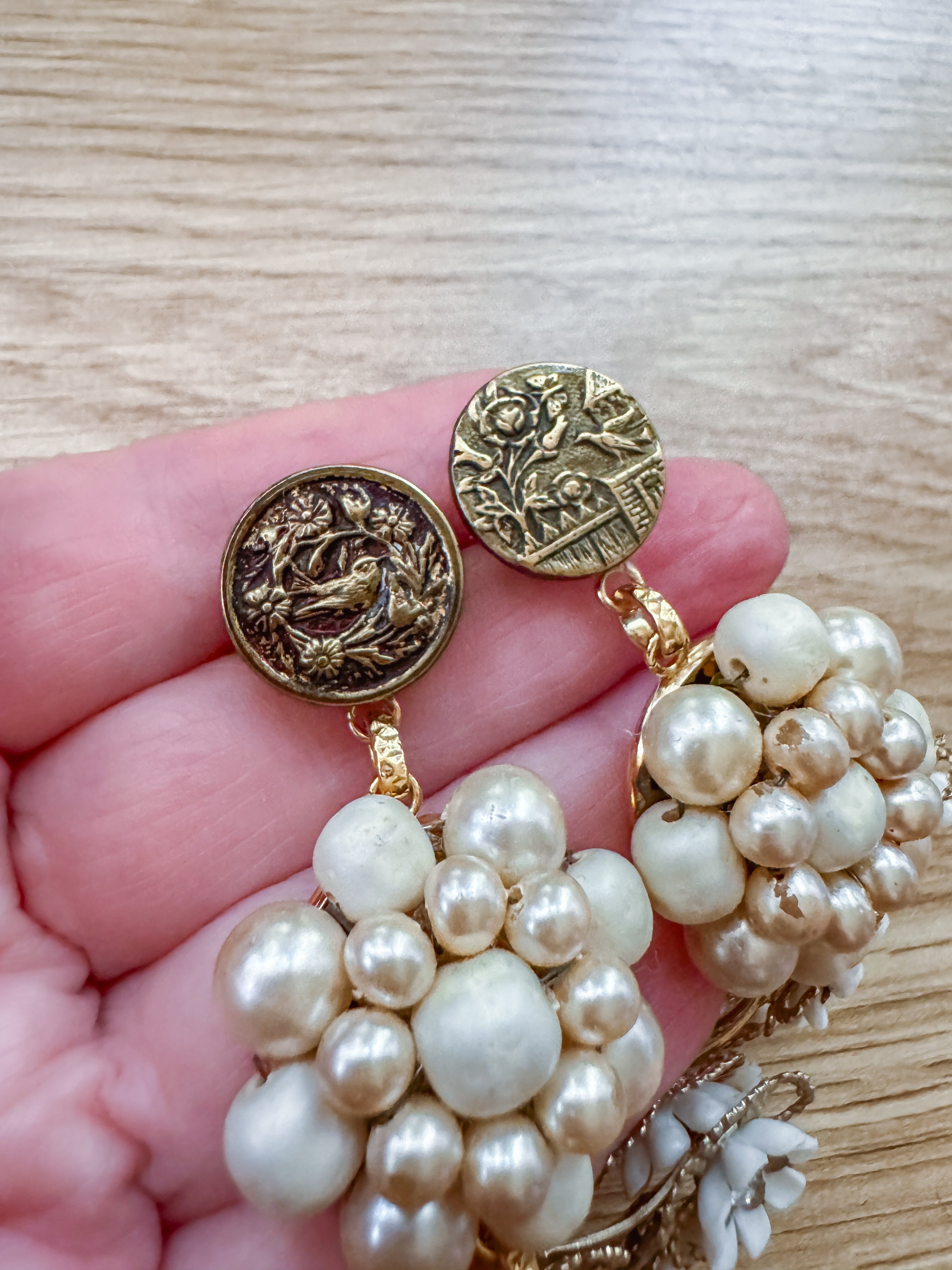 Vintage ingredients : antique brass bird buttons turned into post earrings and paired '50’s costume pearl beaded clip earrings and 50’s featherweight floral earrings. Earrings dangle about 3”s.