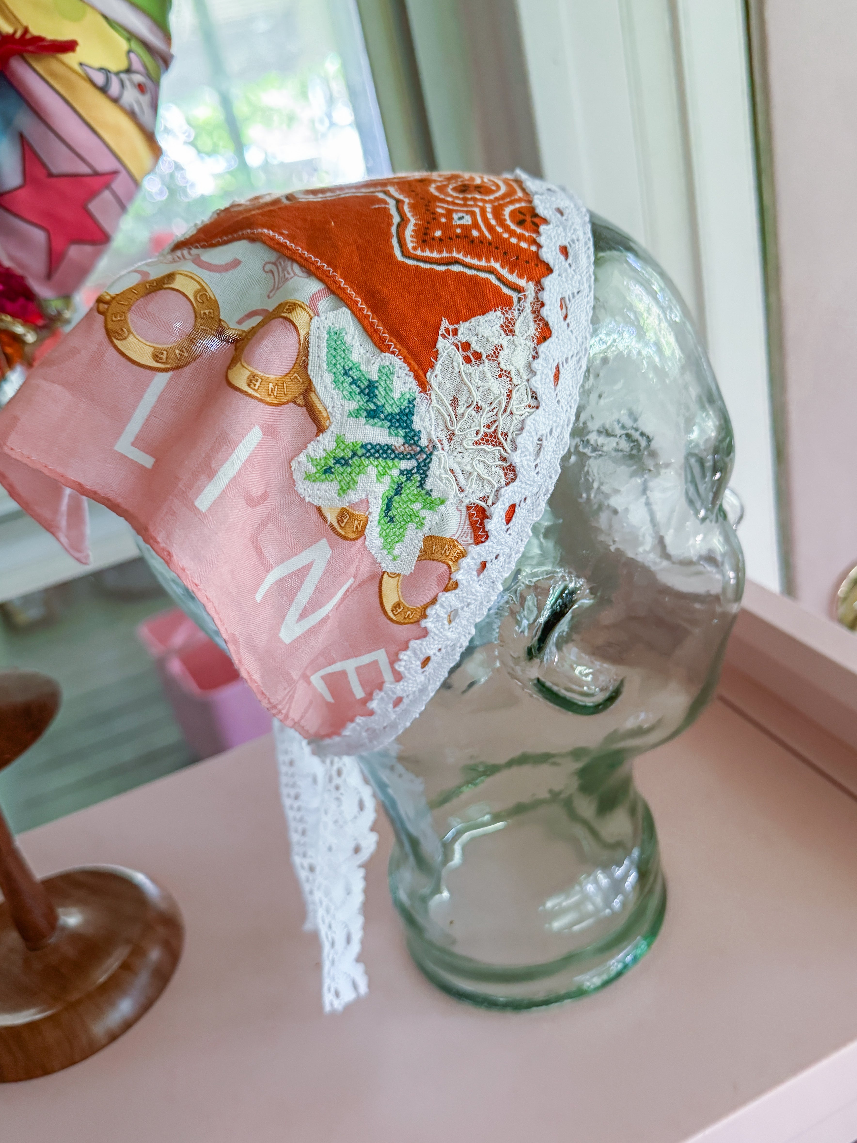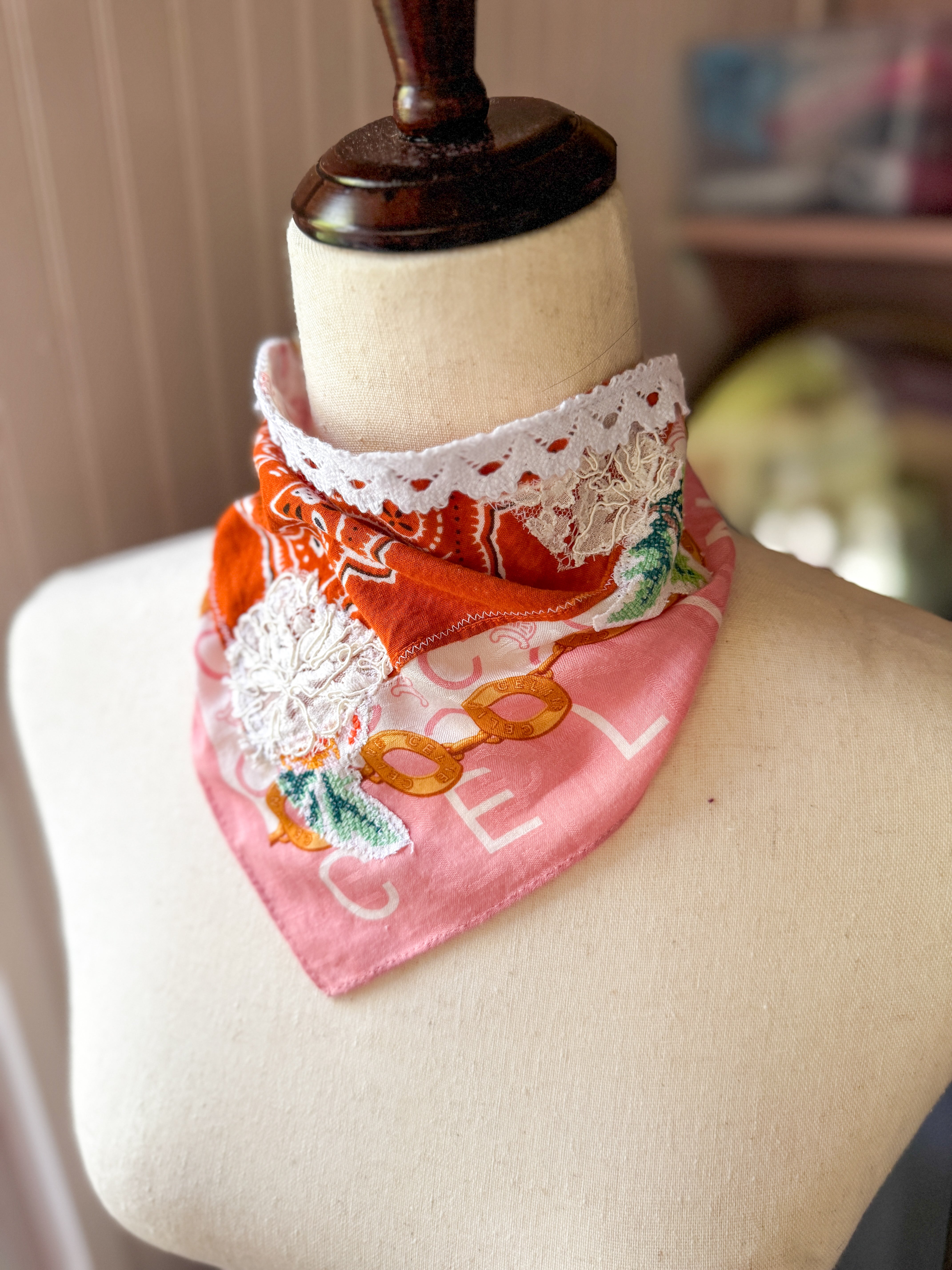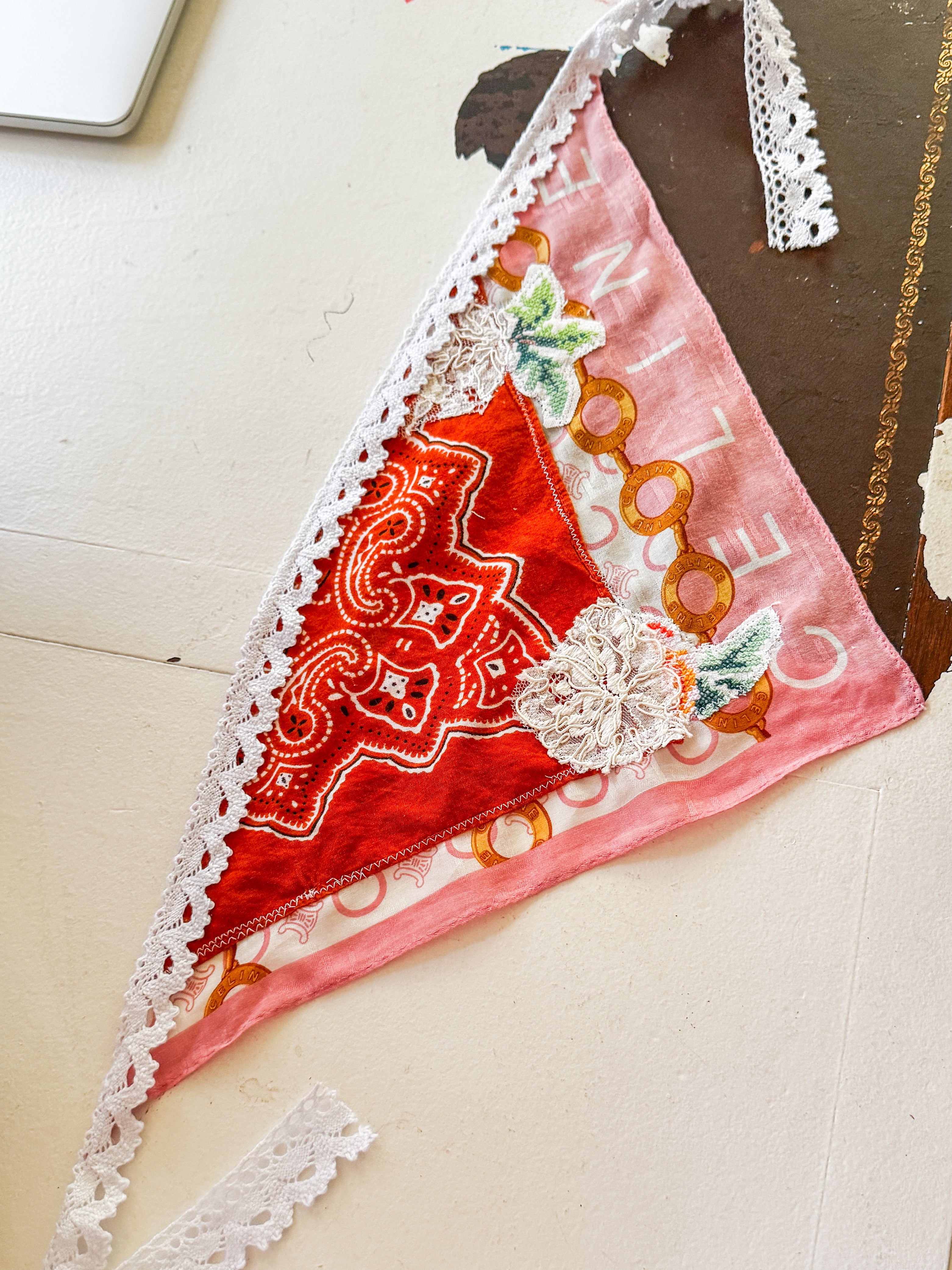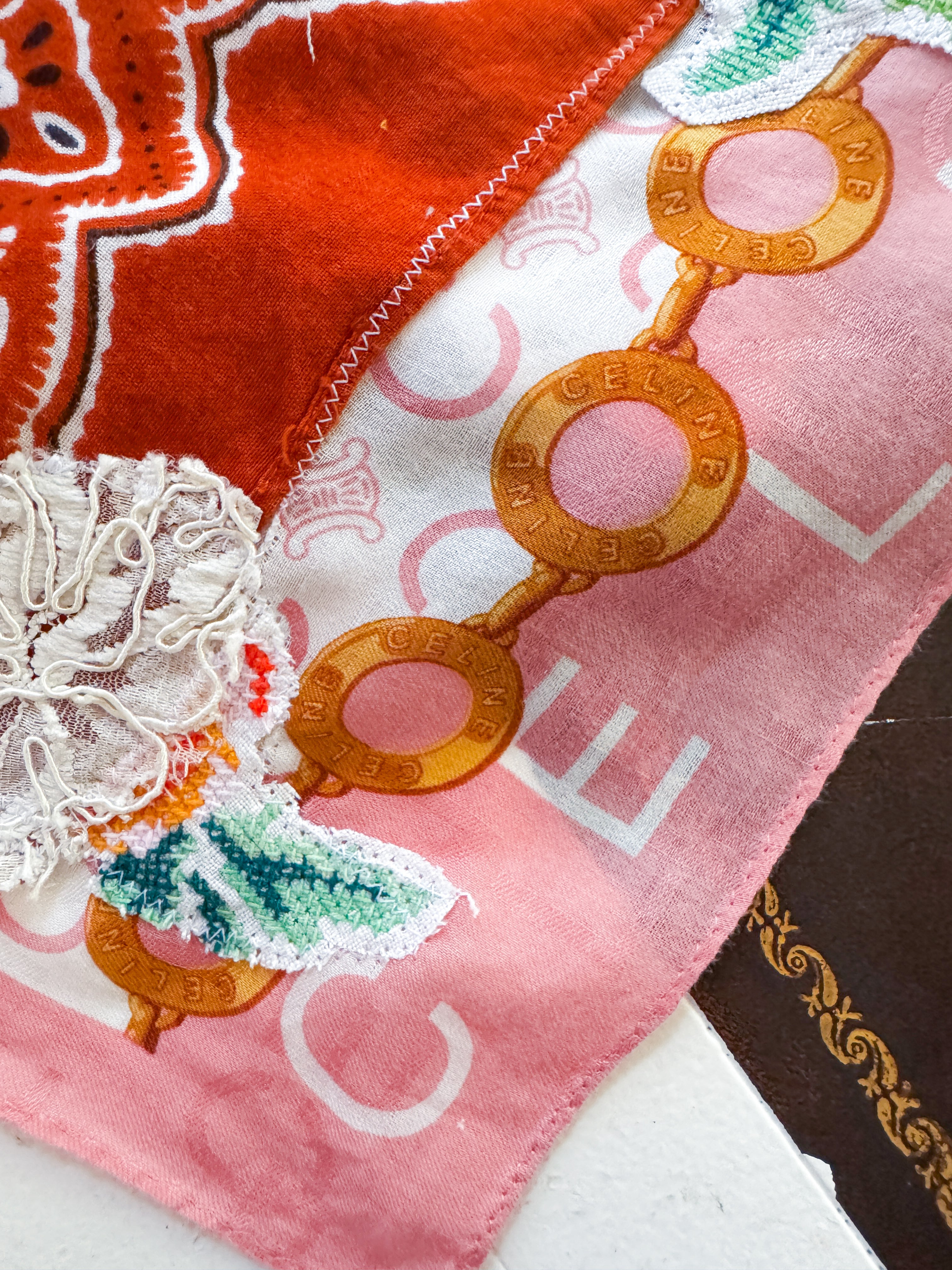 Vintage Celine scarf remnant repurposed into a head scarf/ bandana. Scarf was embellished with hand embroidered flowers from vintage table linens, vintage bridal  lace applique and vintage cotton bandana remnants. Lace trim finishes her off. Easily ties around head or neck.