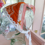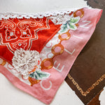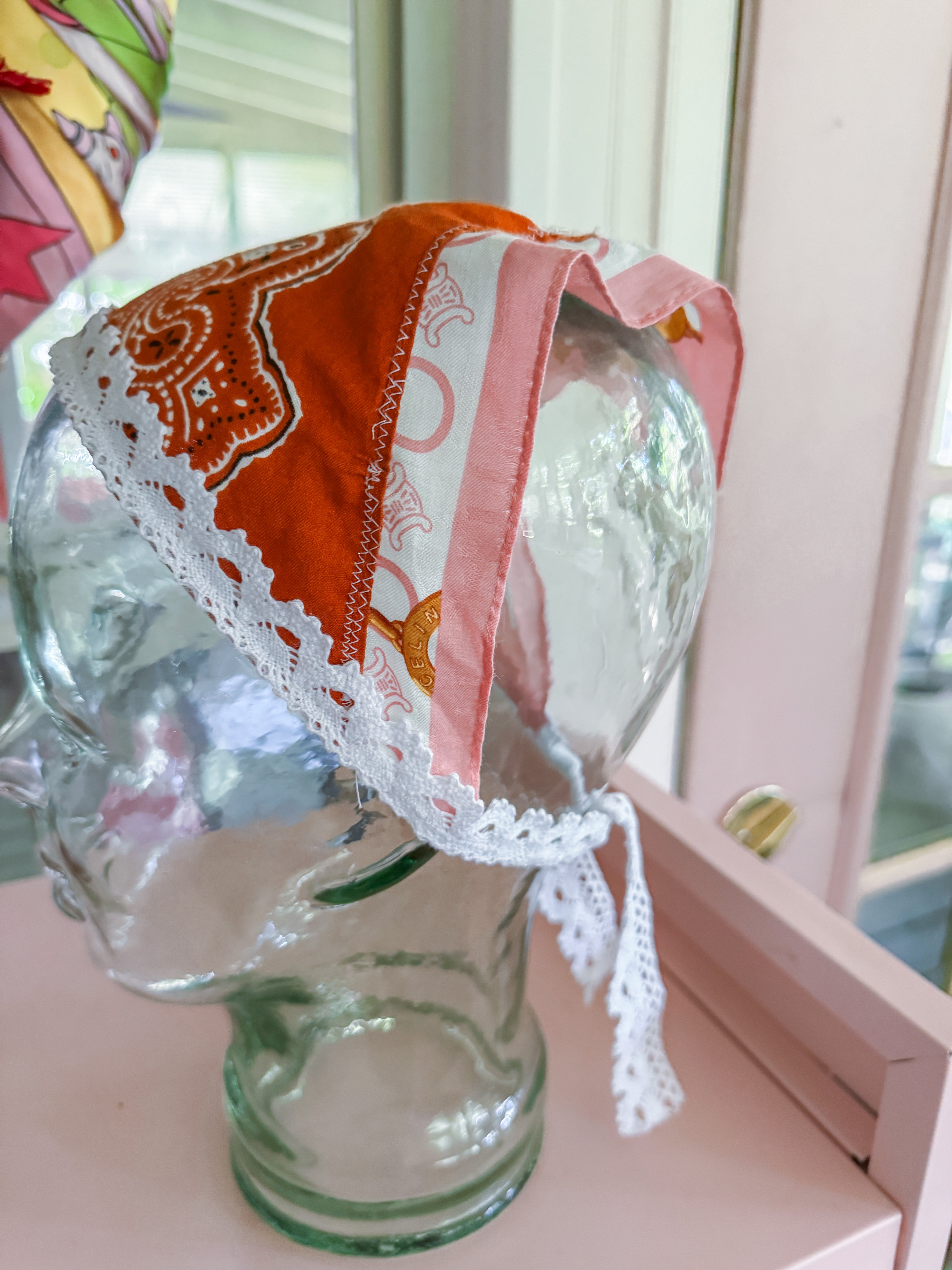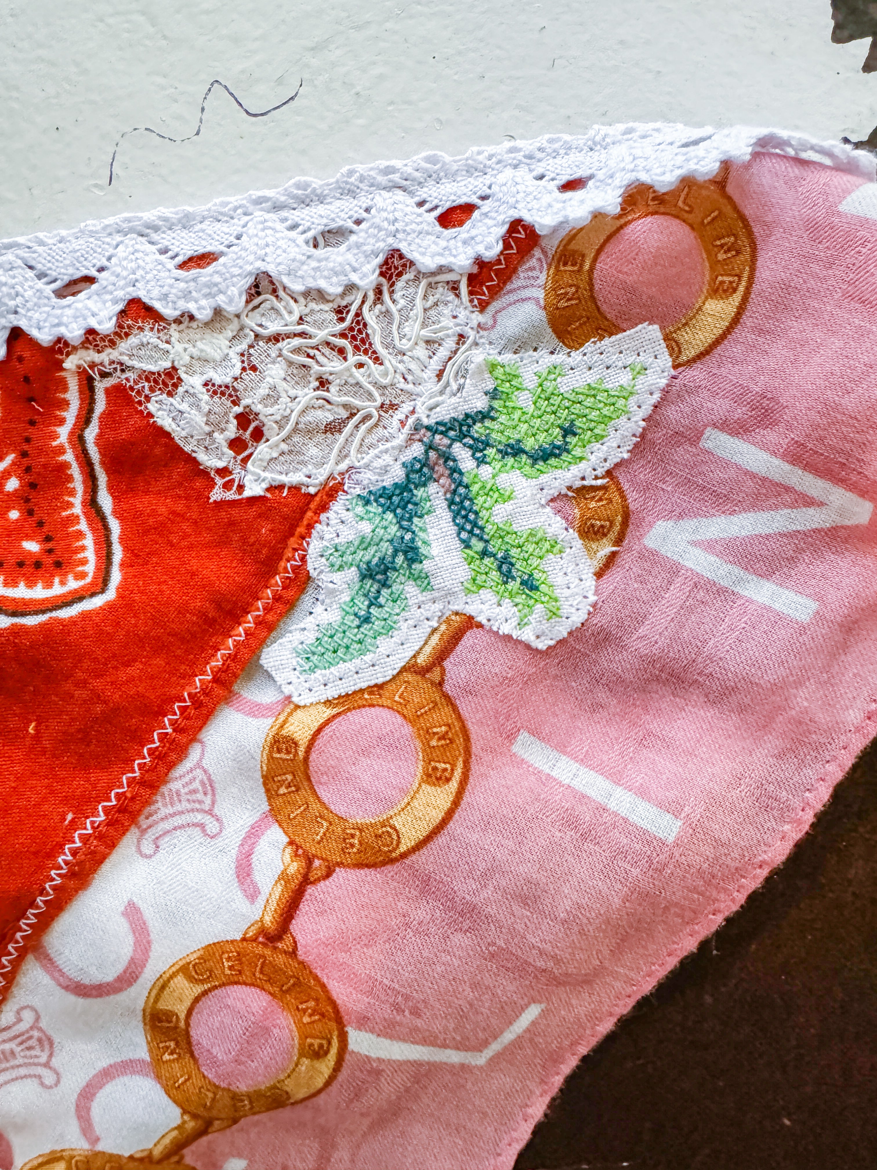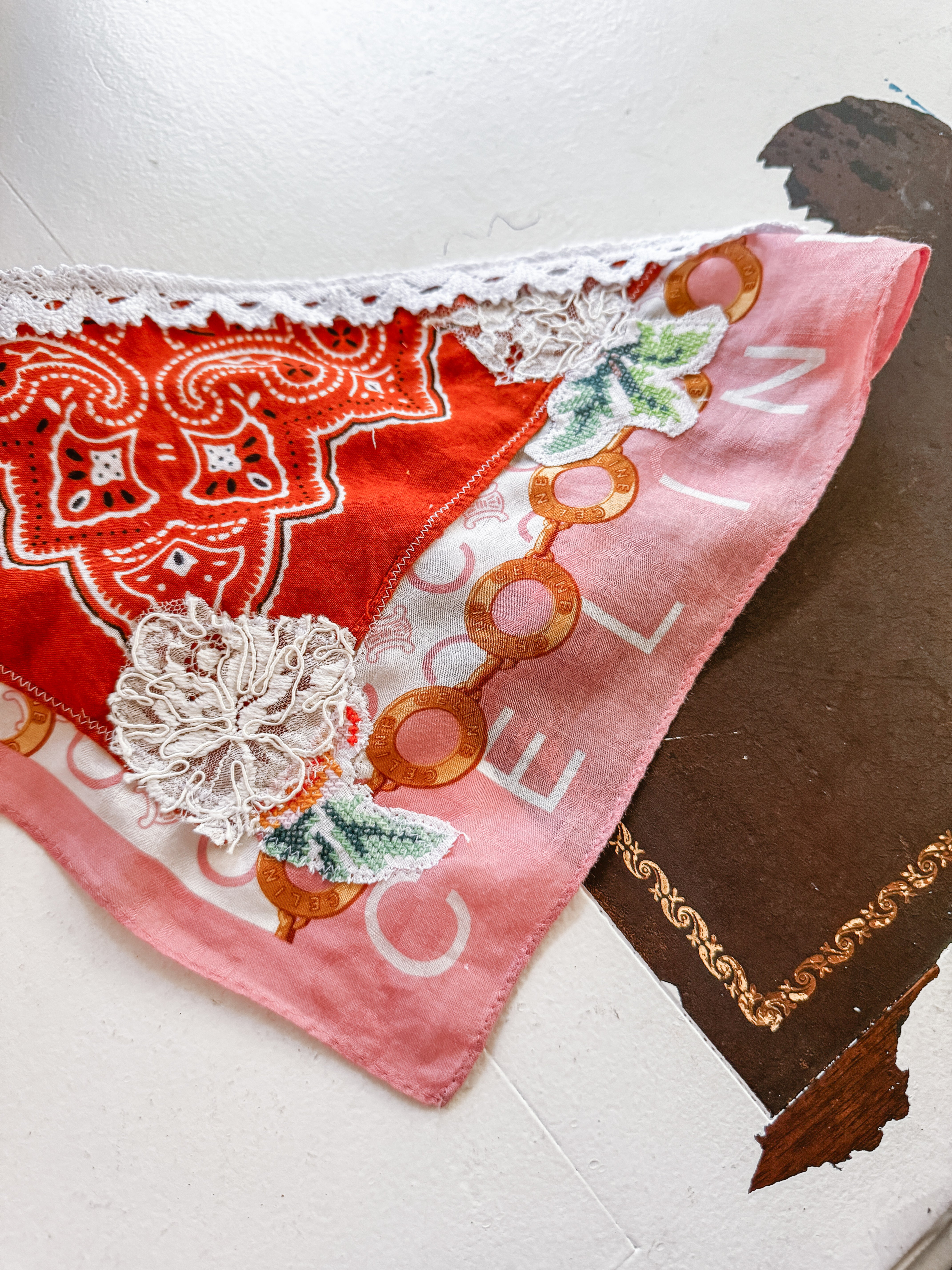 Vintage Celine scarf remnant repurposed into a head scarf/ bandana. Scarf was embellished with hand embroidered flowers from vintage table linens, vintage bridal  lace applique and vintage cotton bandana remnants. Lace trim finishes her off. Easily ties around head or neck.