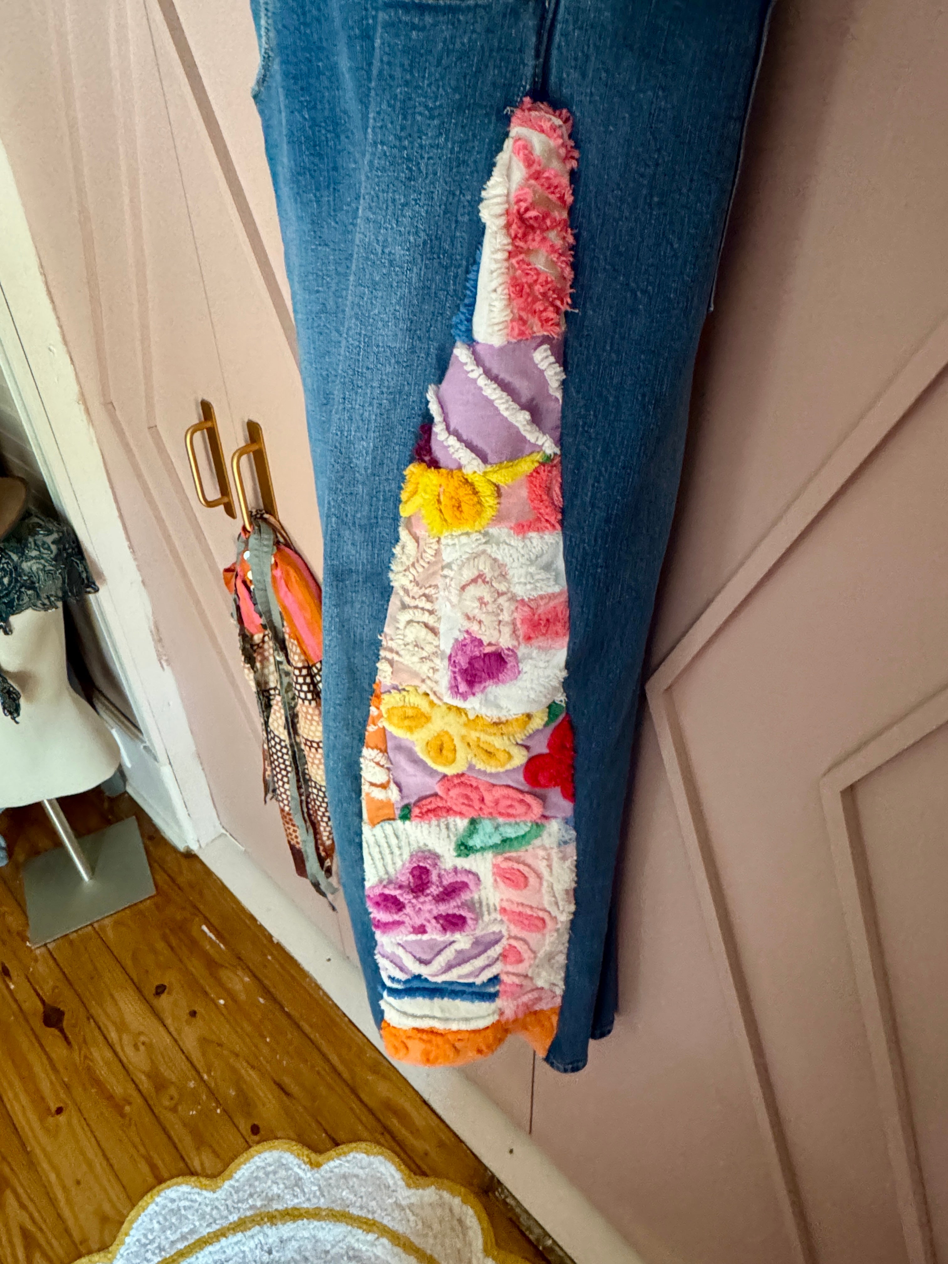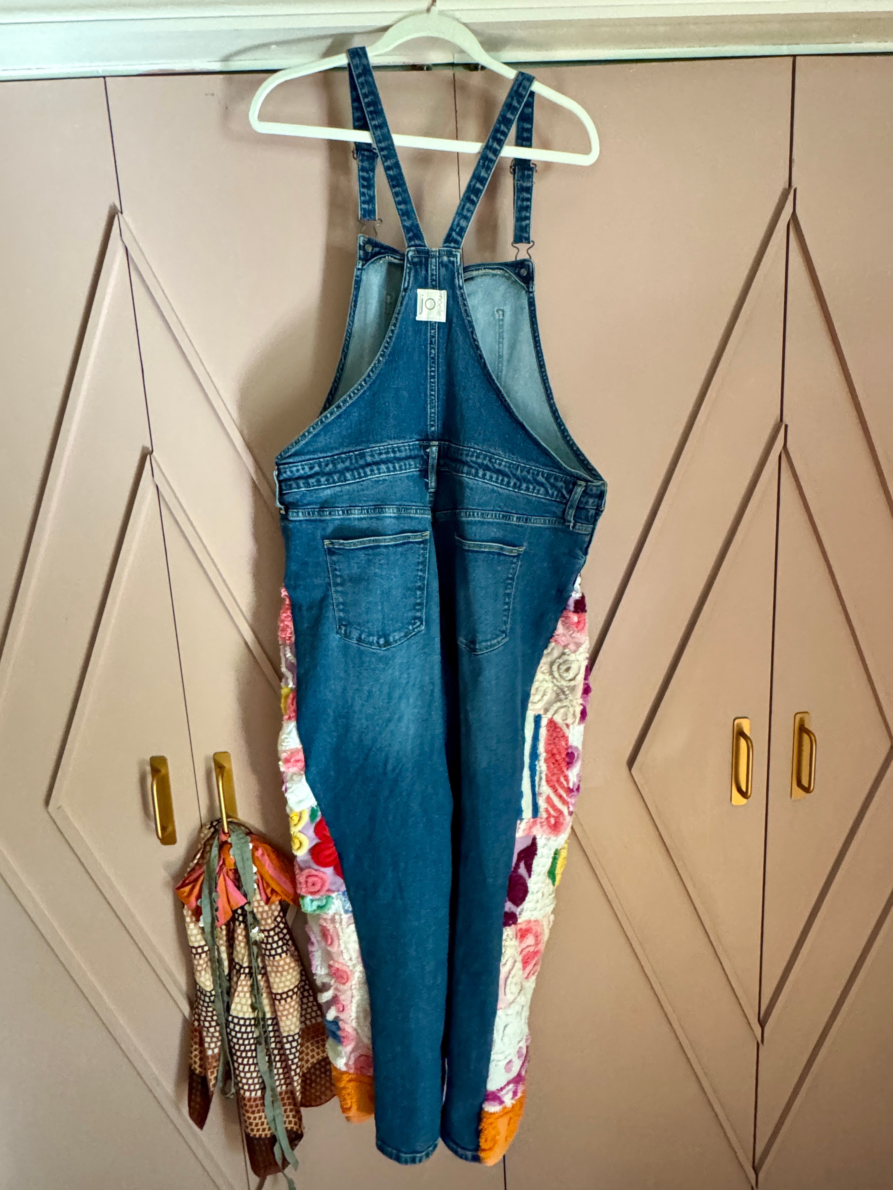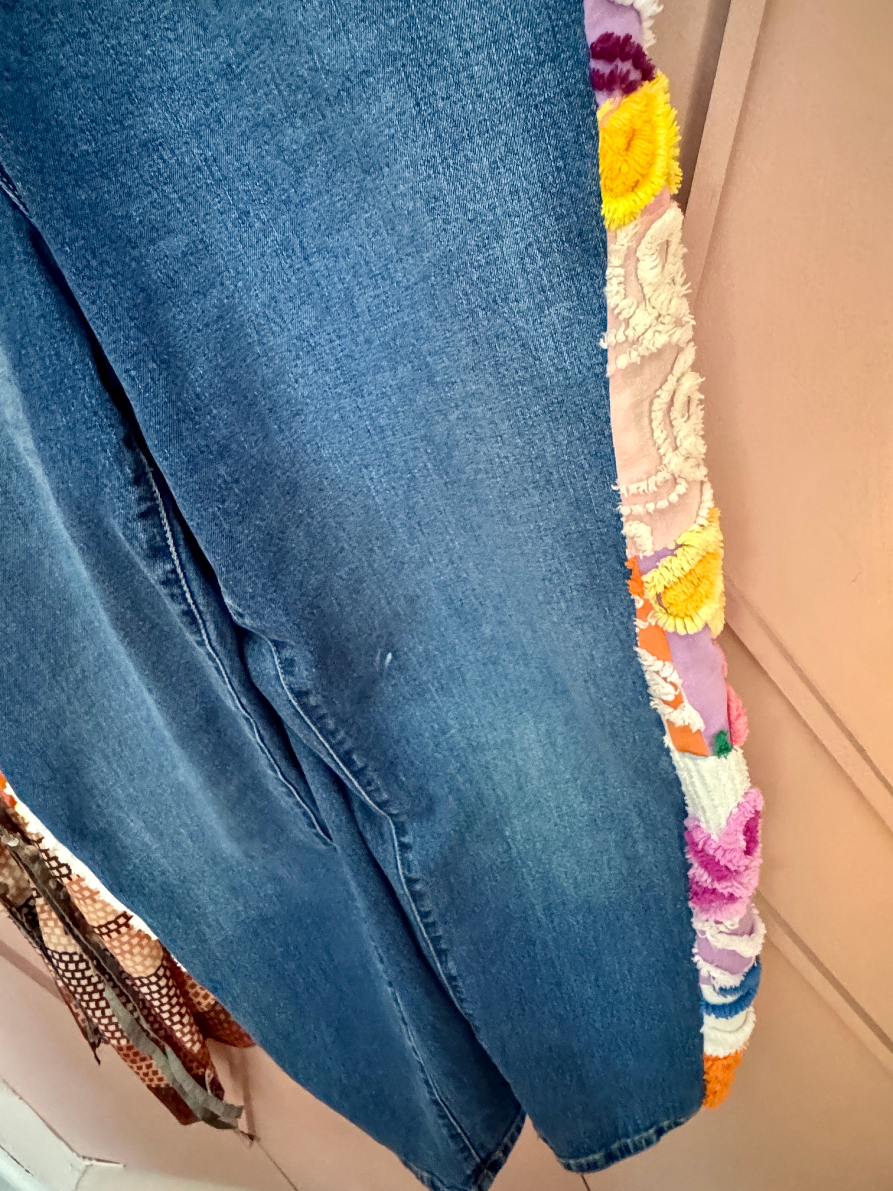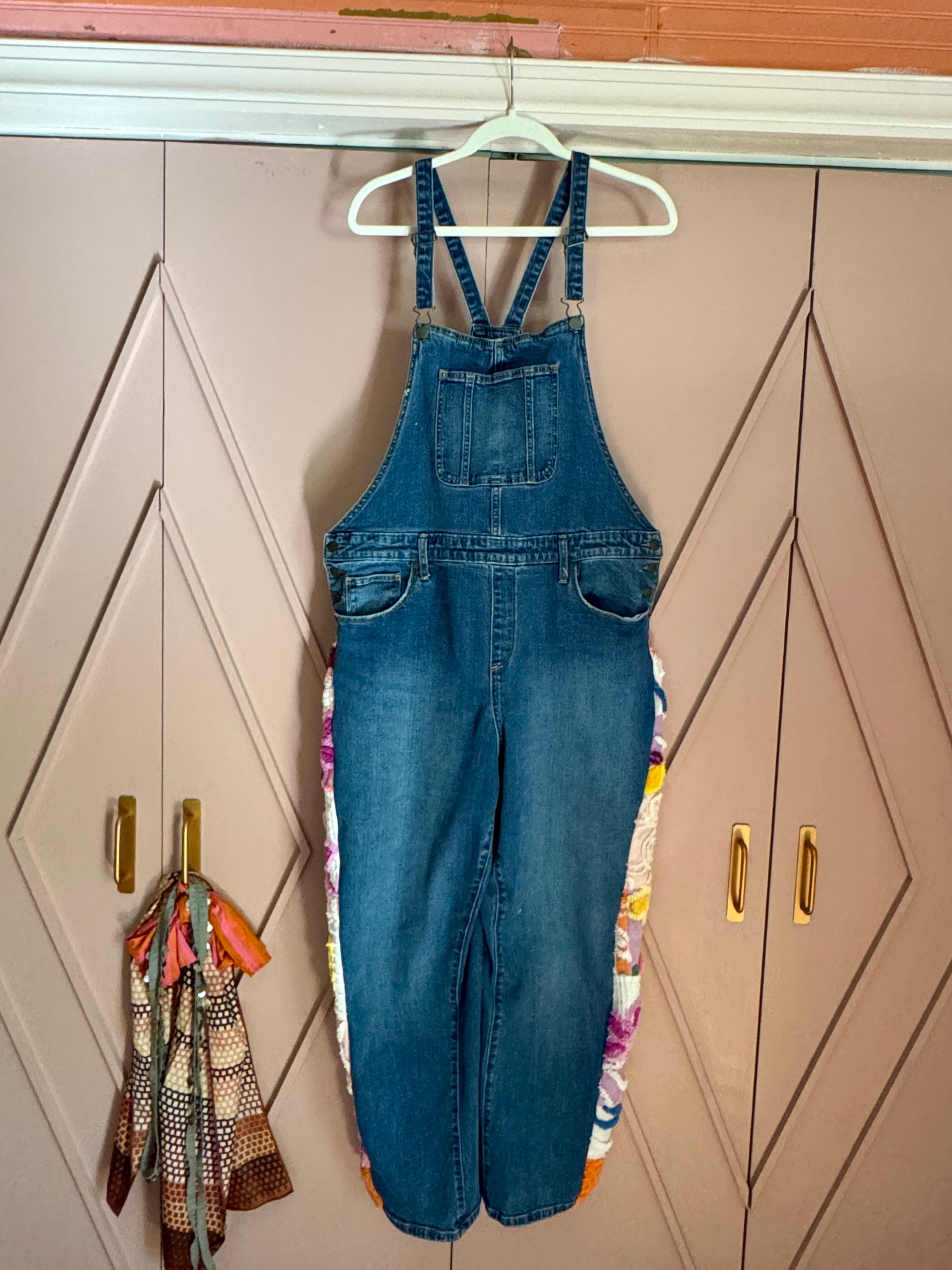 Up-cycled denim overalls with side panel flared legs created from Vintage chenille bedding patchworked together to form a rainbow of happiness🎉 Is a size 16 but would fit a size medium to extra large depending on how baggy wanted them!