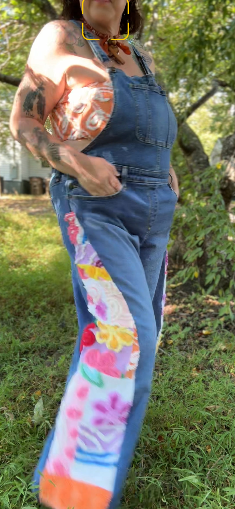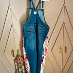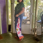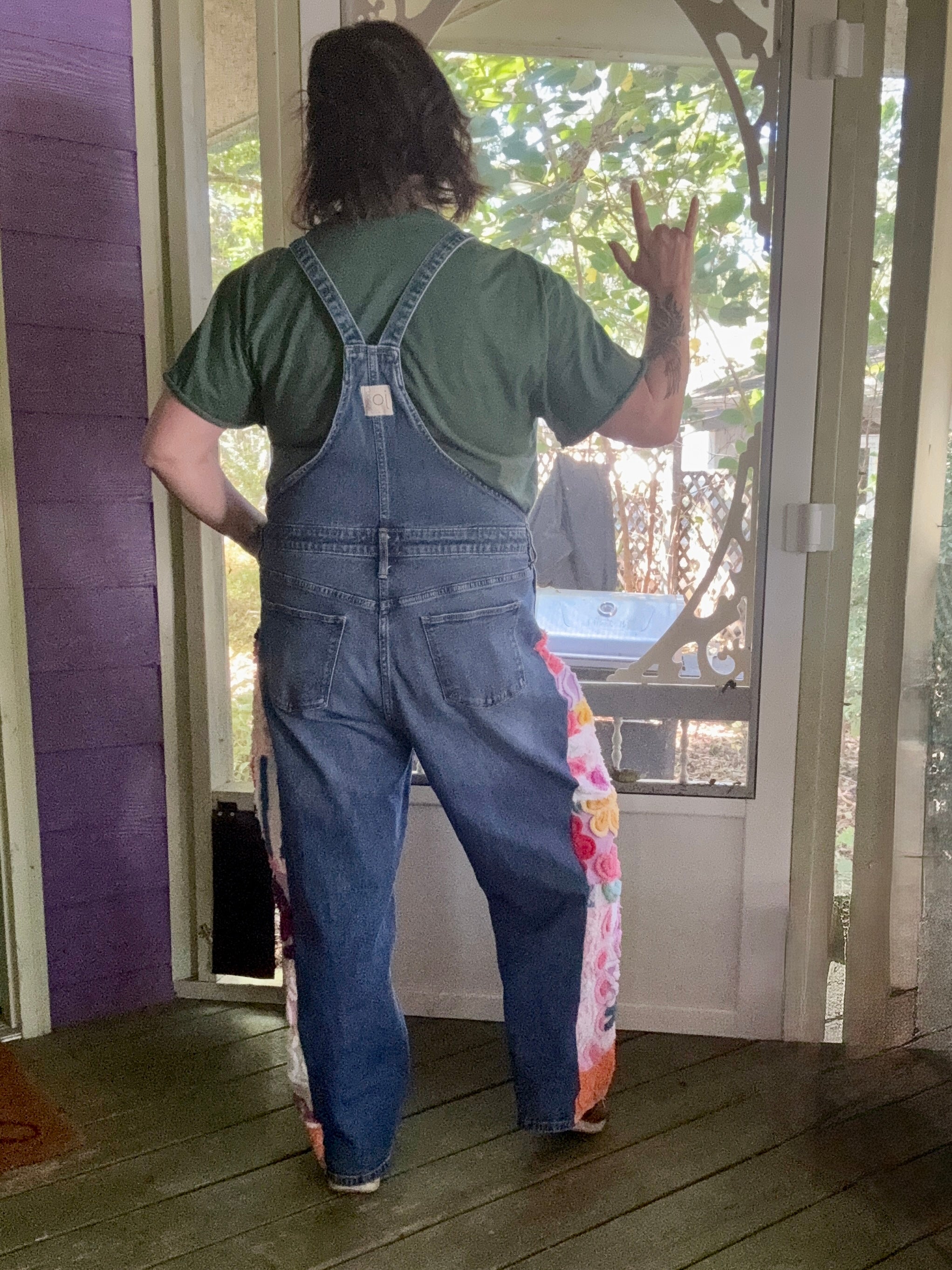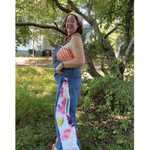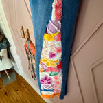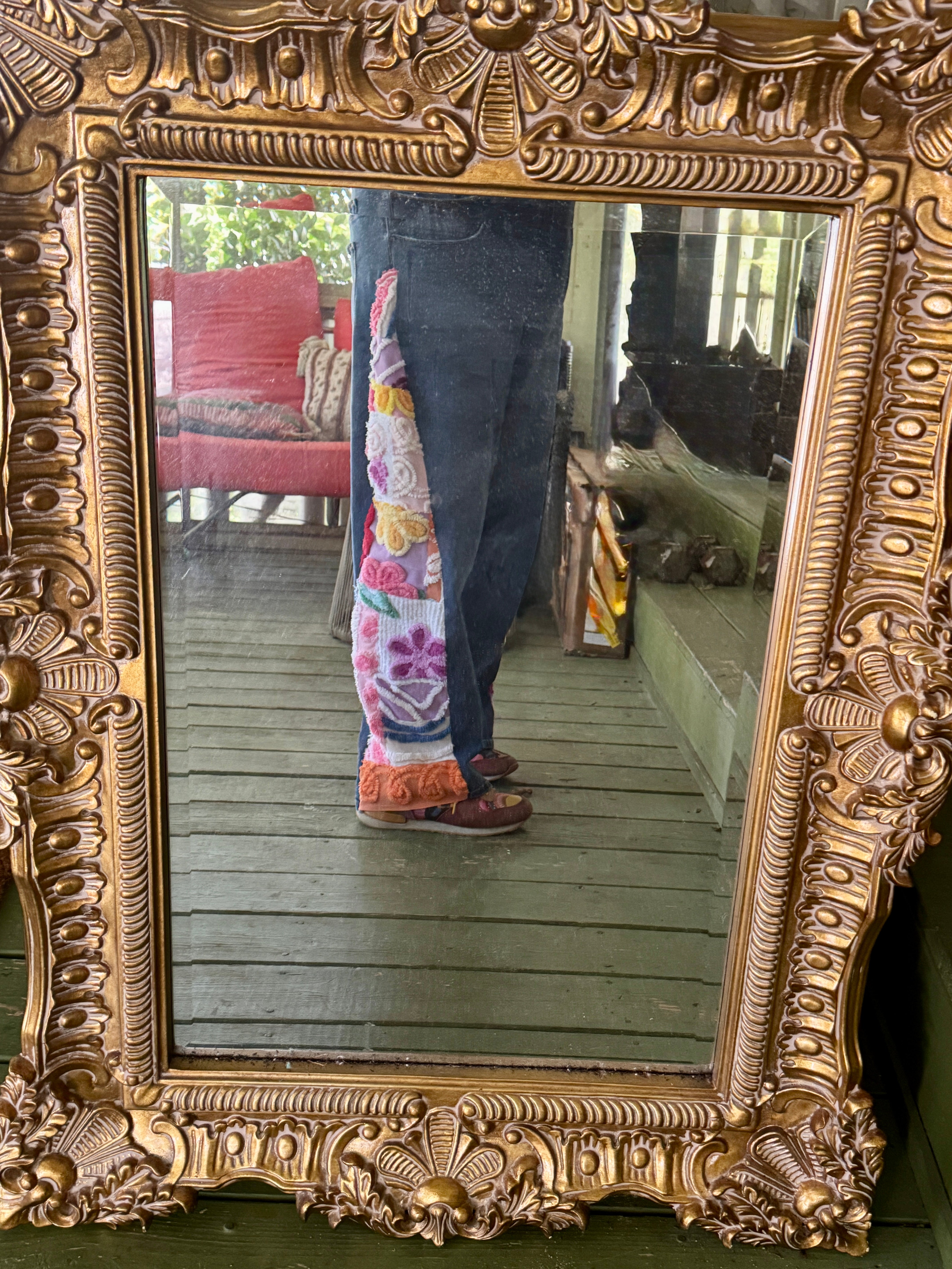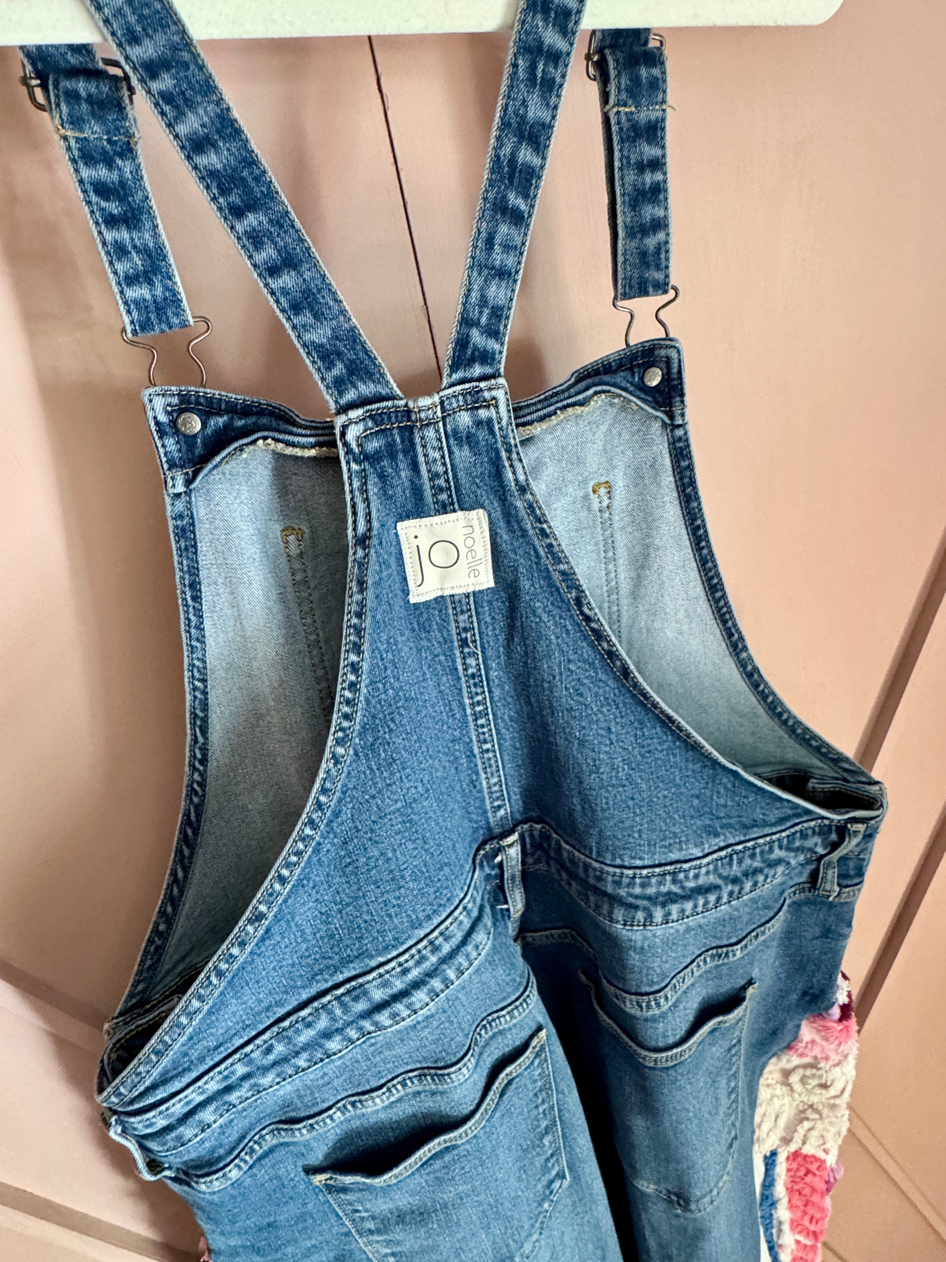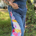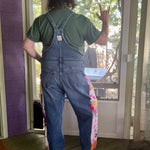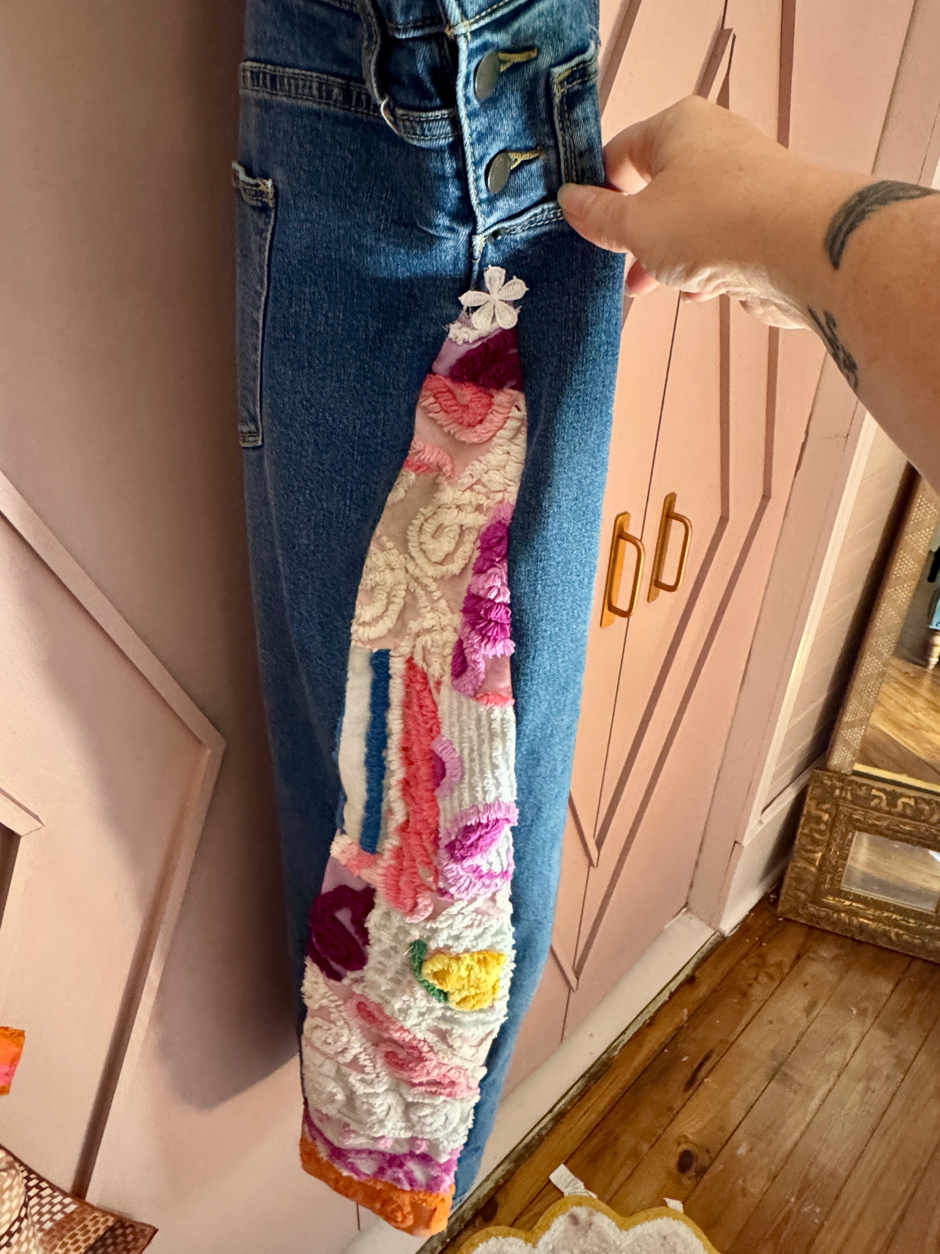 Up-cycled denim overalls with side panel flared legs created from Vintage chenille bedding patchworked together to form a rainbow of happiness🎉 Is a size 16 but would fit a size medium to extra large depending on how baggy wanted them!