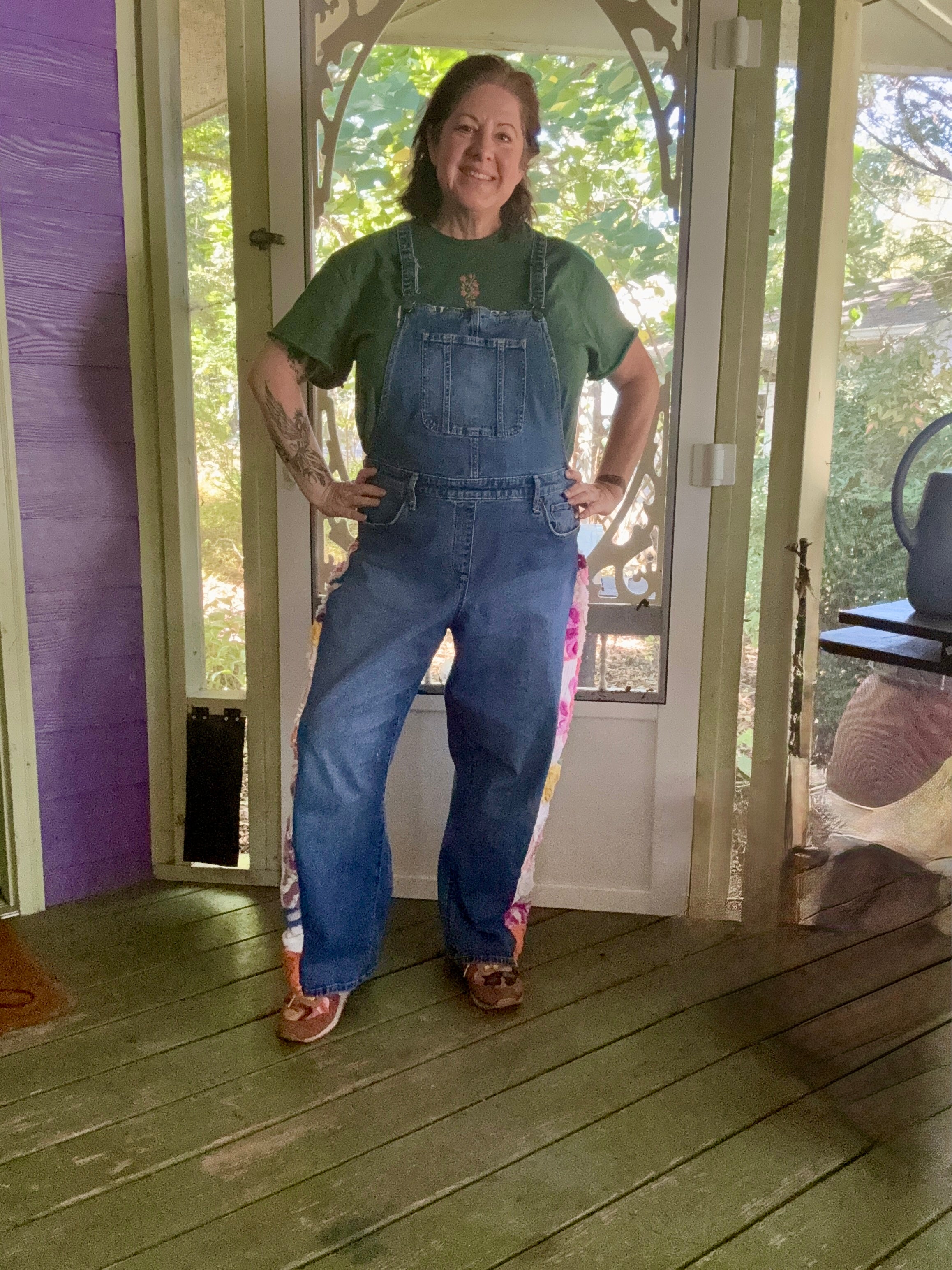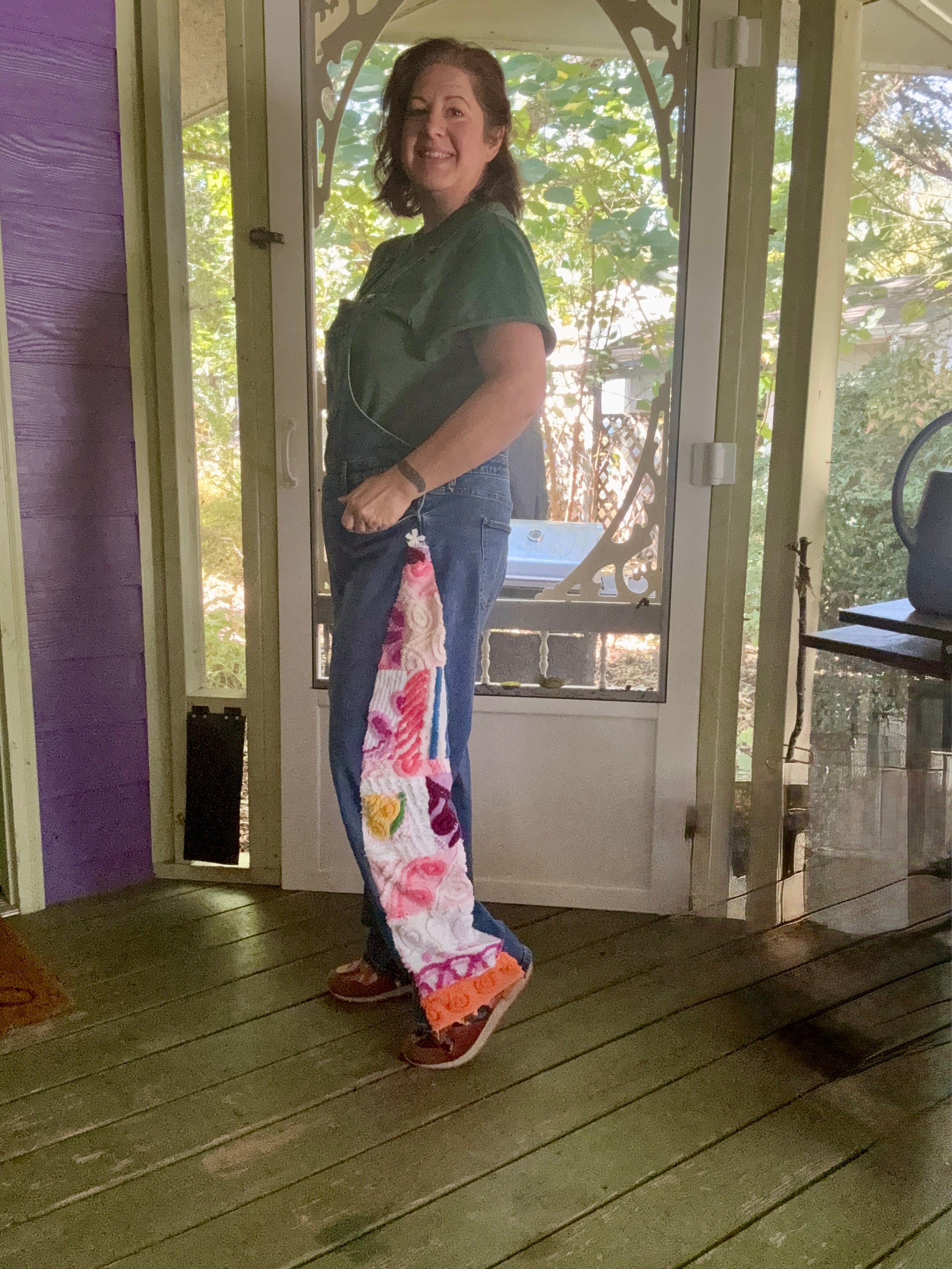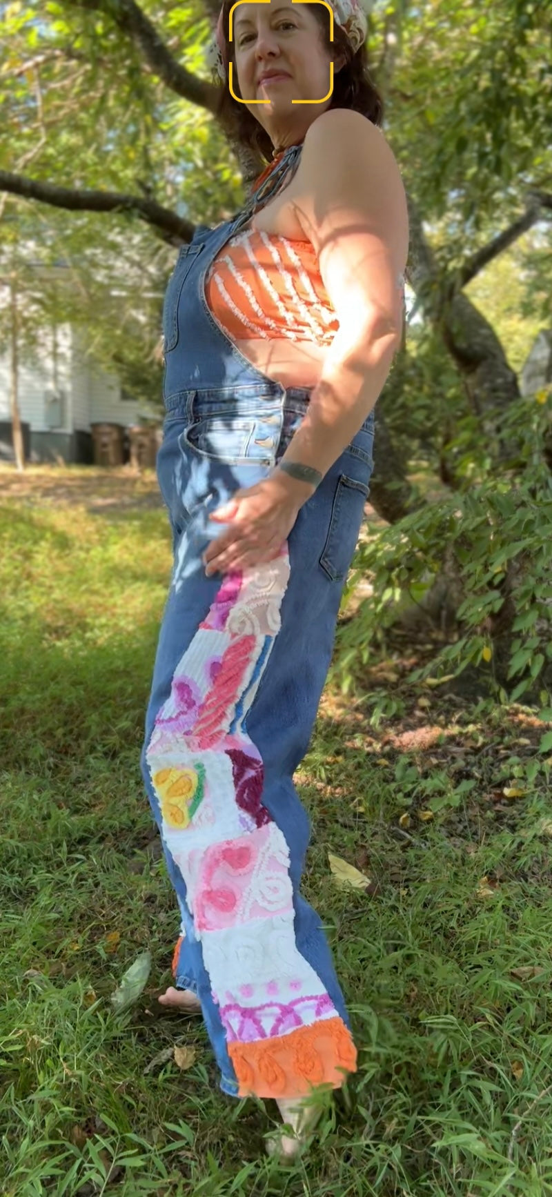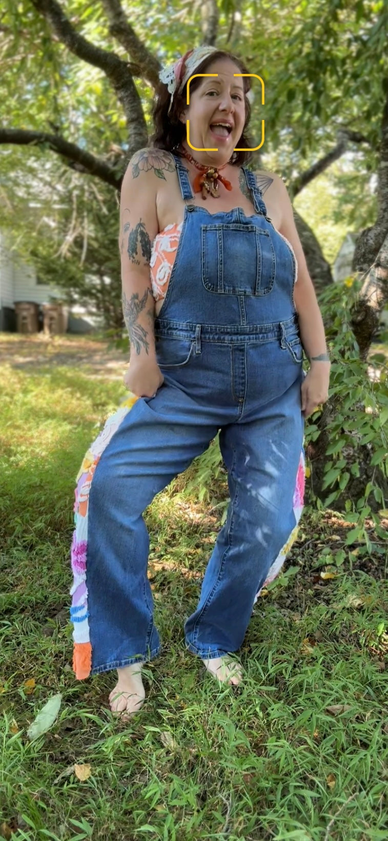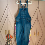 Up-cycled denim overalls with side panel flared legs created from Vintage chenille bedding patchworked together to form a rainbow of happiness🎉 Is a size 16 but would fit a size medium to extra large depending on how baggy wanted them!
